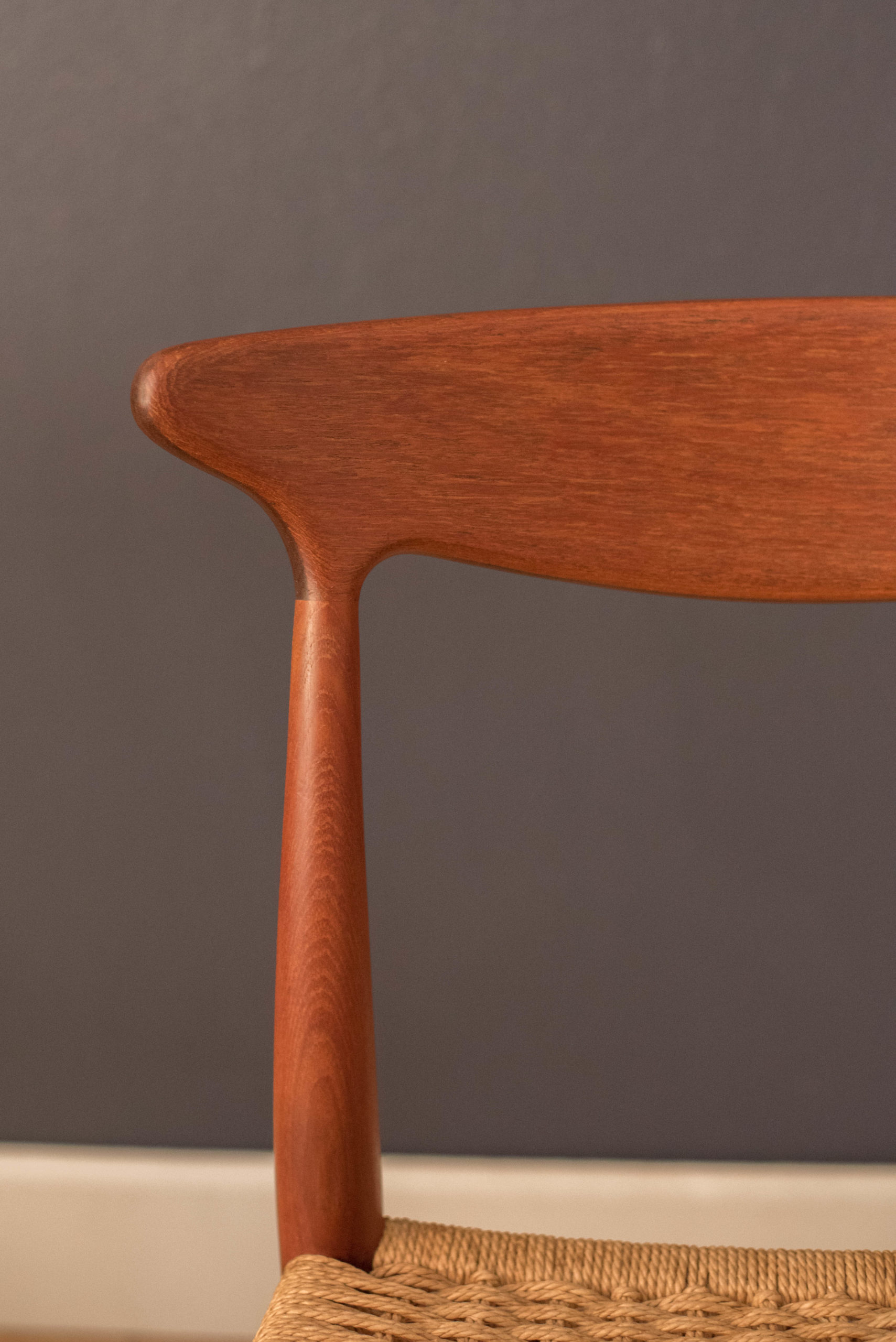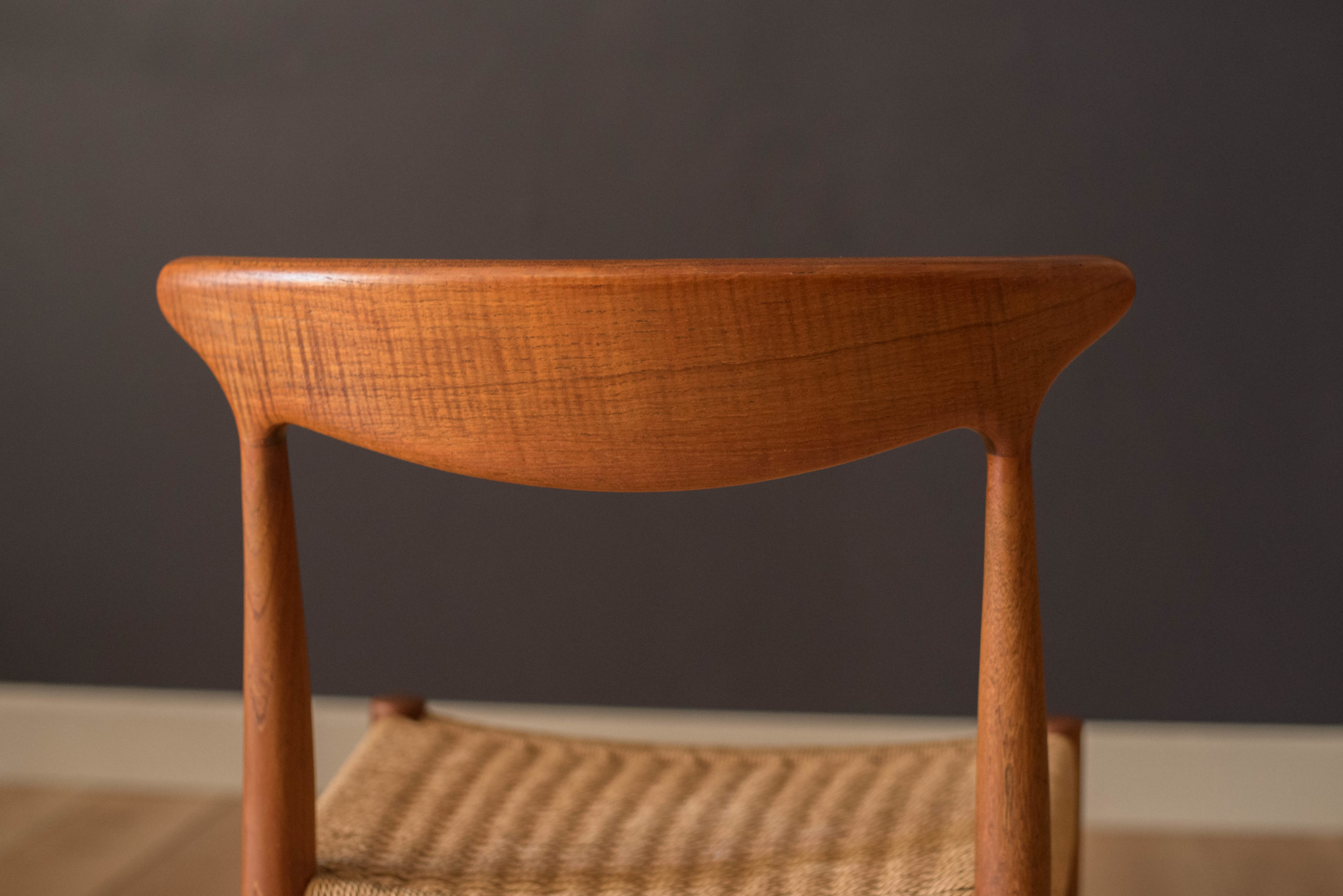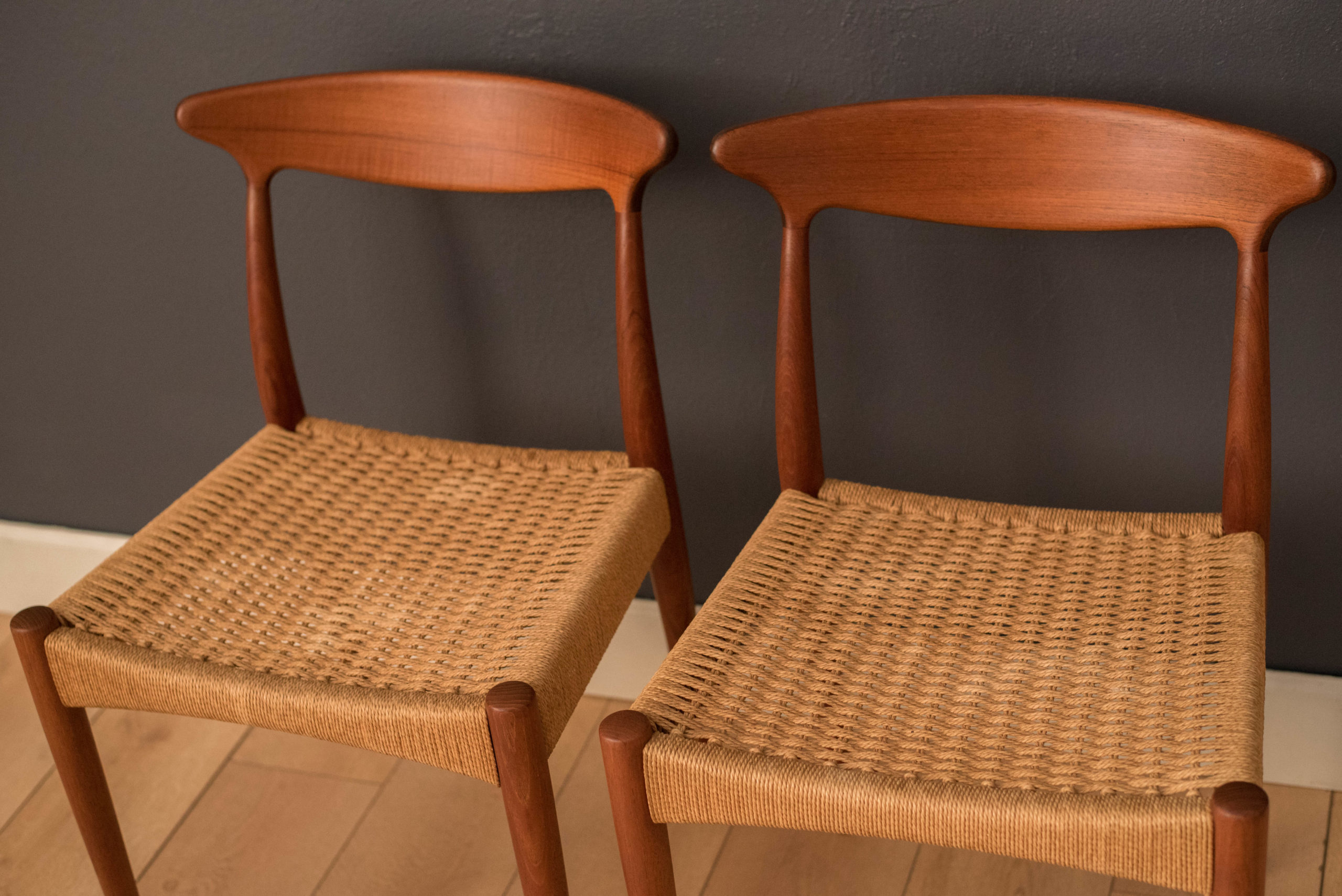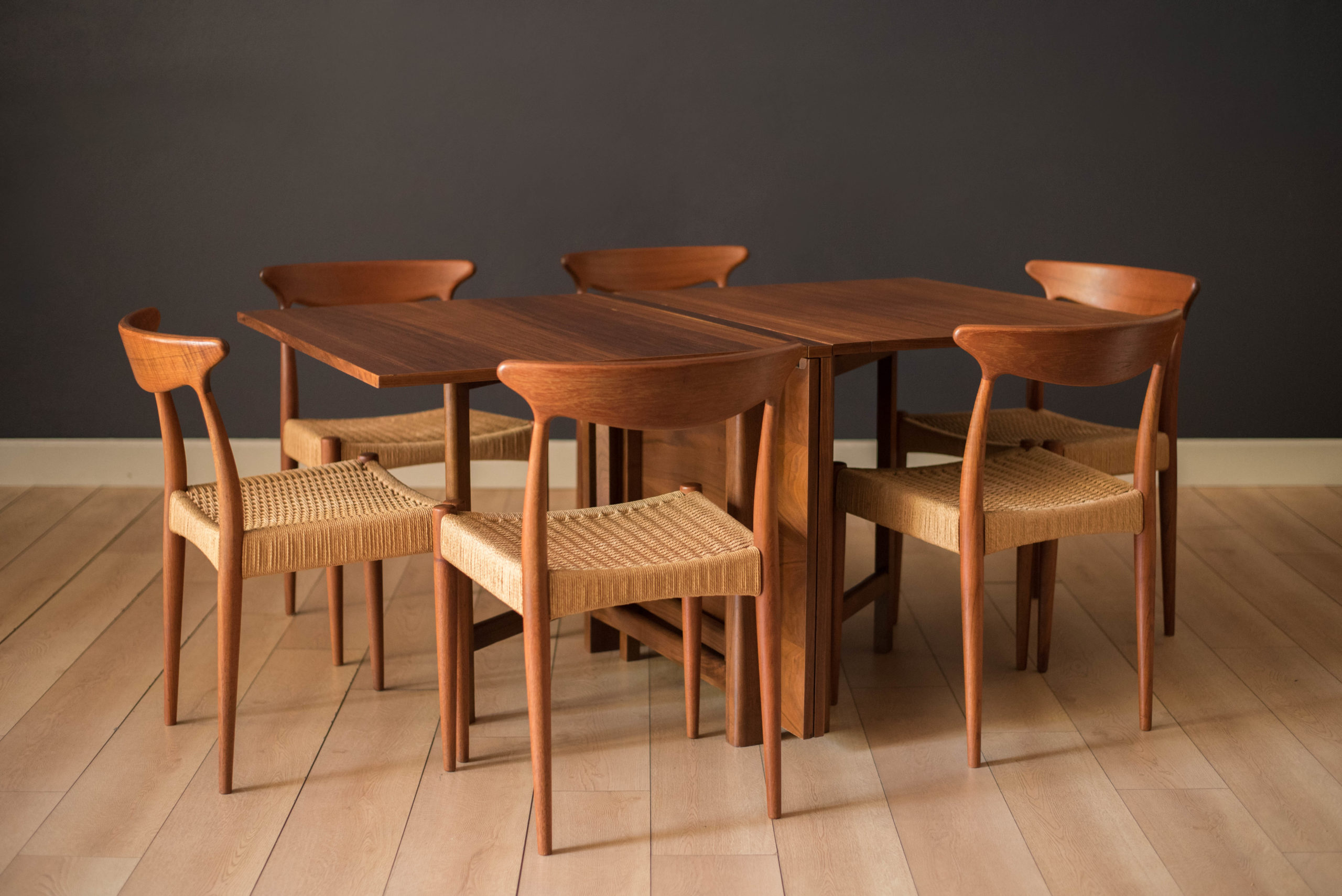 Mid-Century Modern set of six dining chairs in teak designed by Arne Hovmand-Olsen for Mogens Kold, circa 1950’s. Features sculptural teak frames with the original papercord seating all intact.