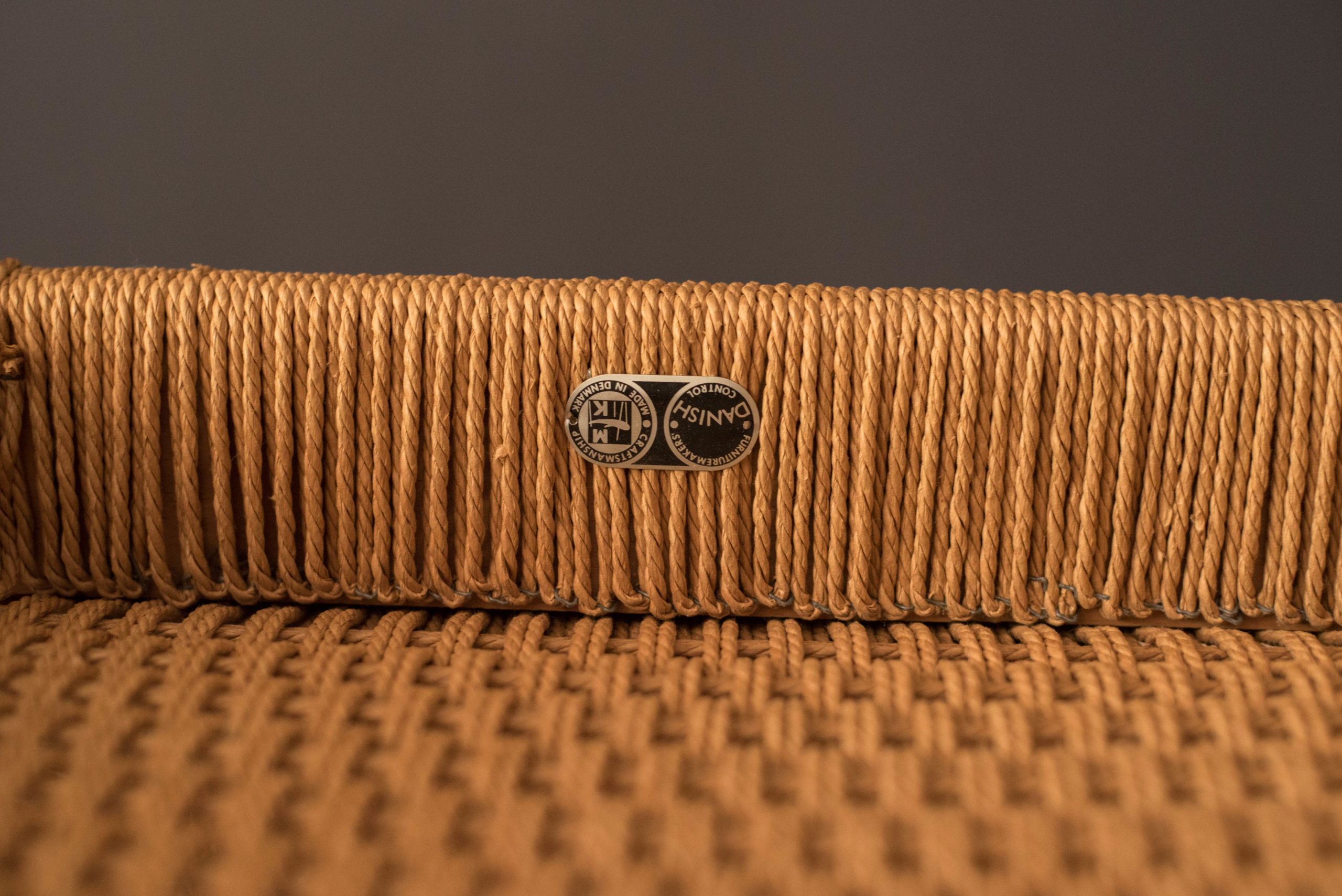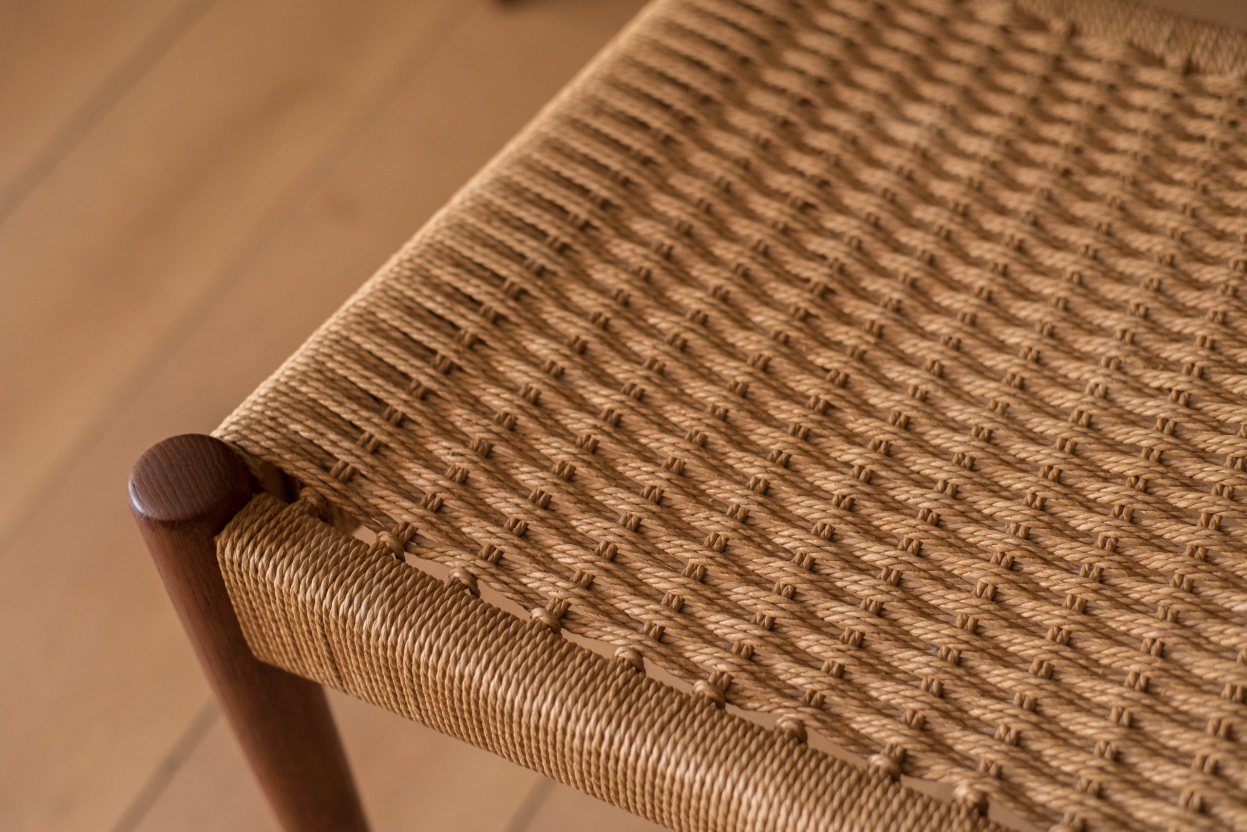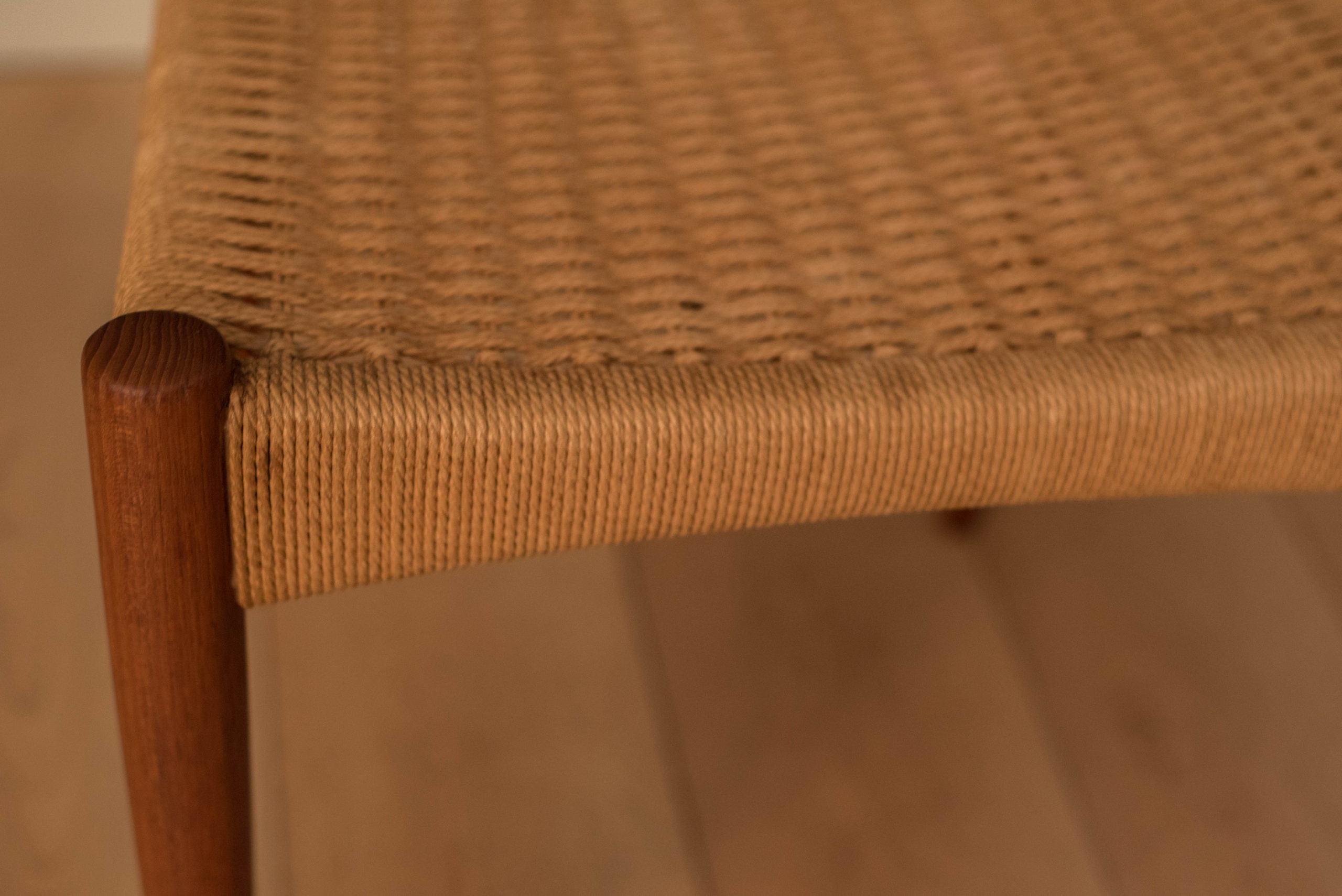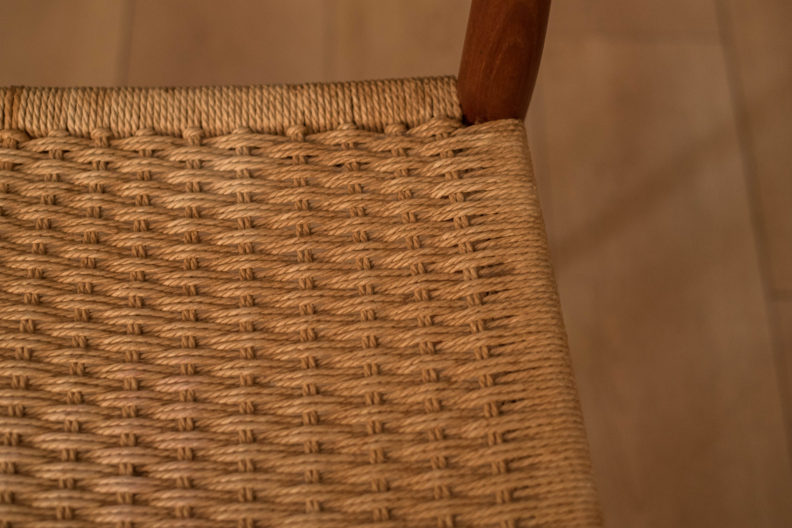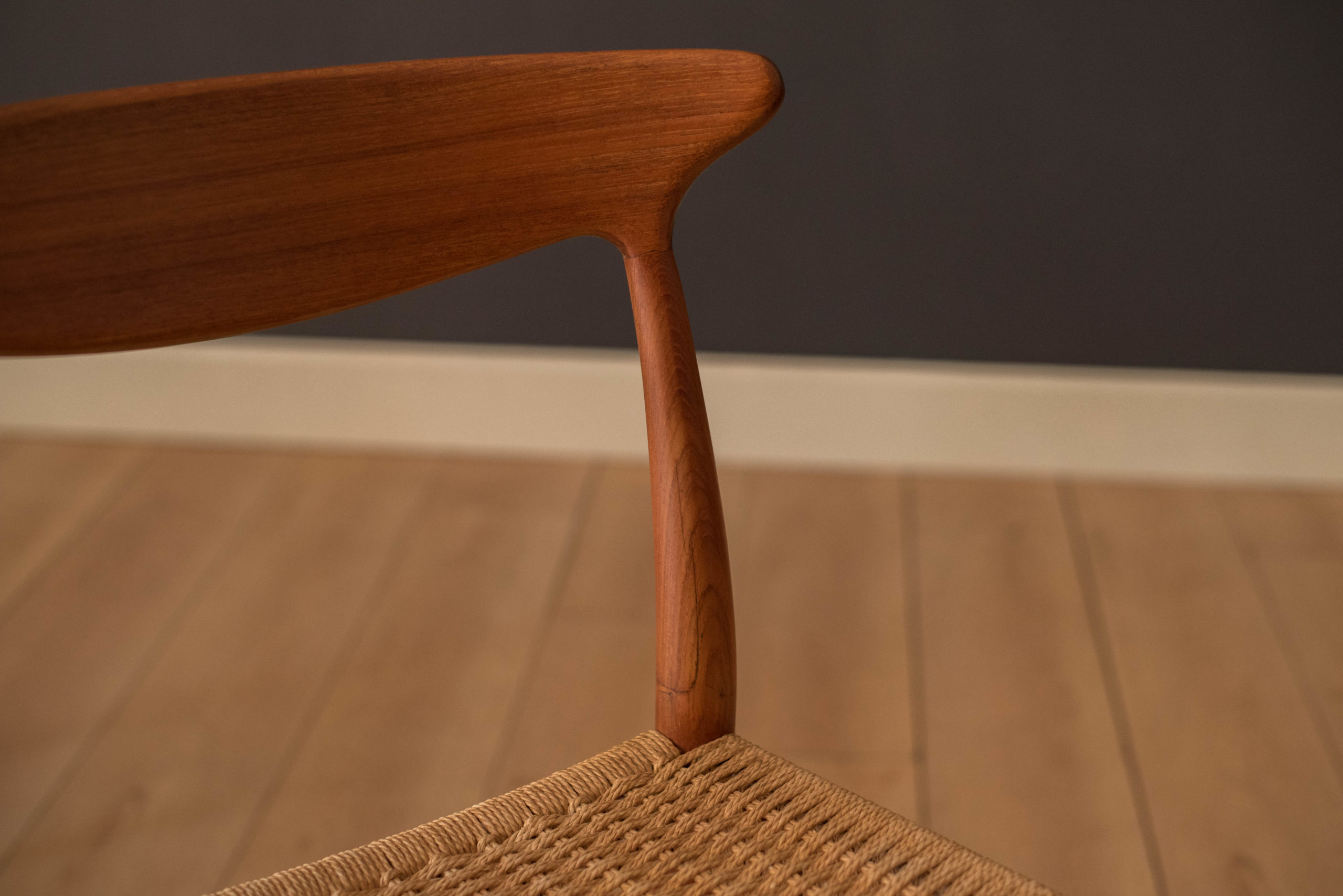 Mid-Century Modern set of six dining chairs in teak designed by Arne Hovmand-Olsen for Mogens Kold, circa 1950’s. Features sculptural teak frames with the original papercord seating all intact.