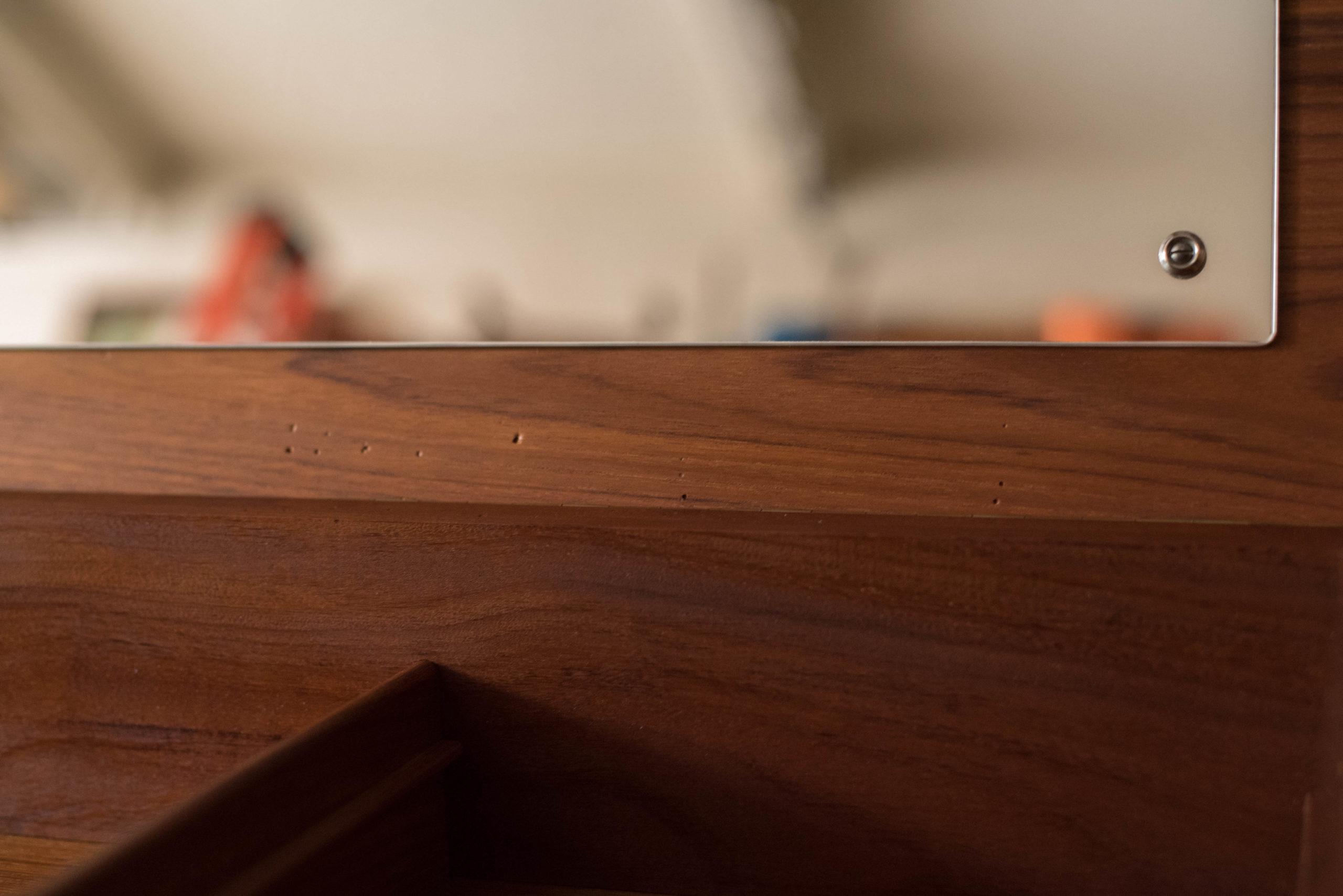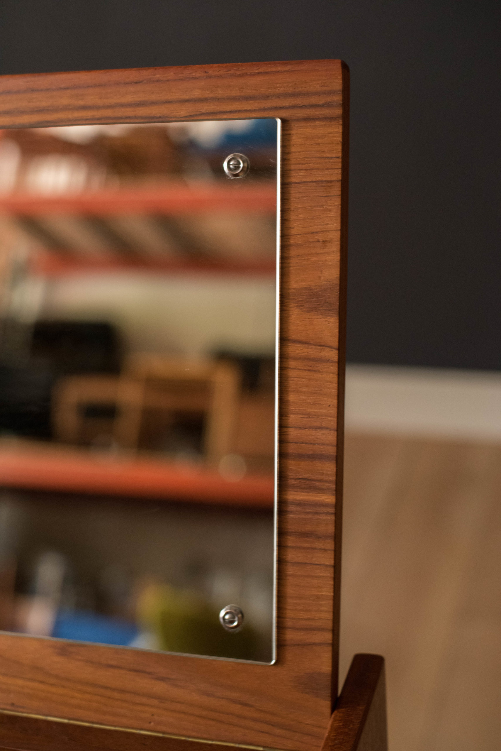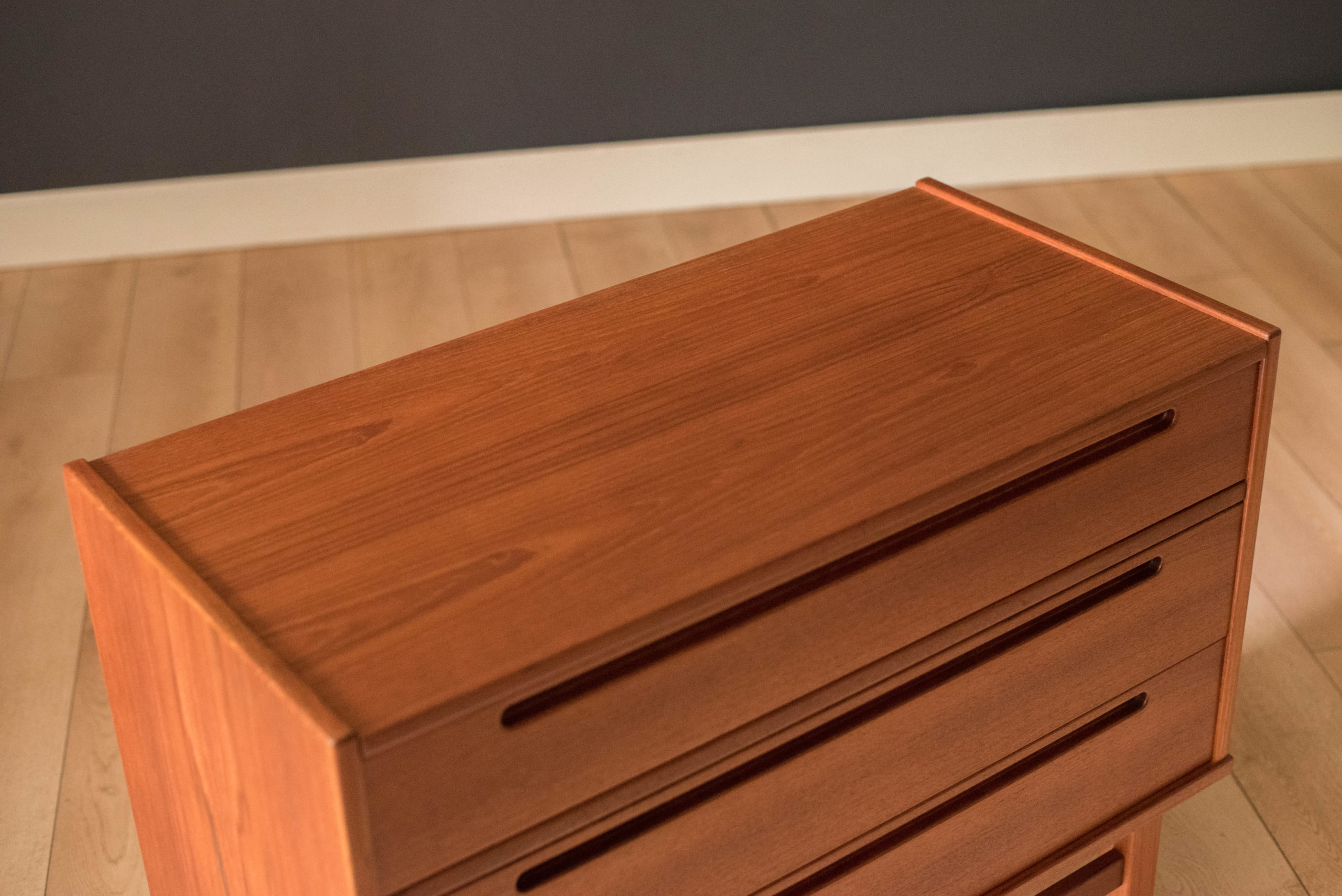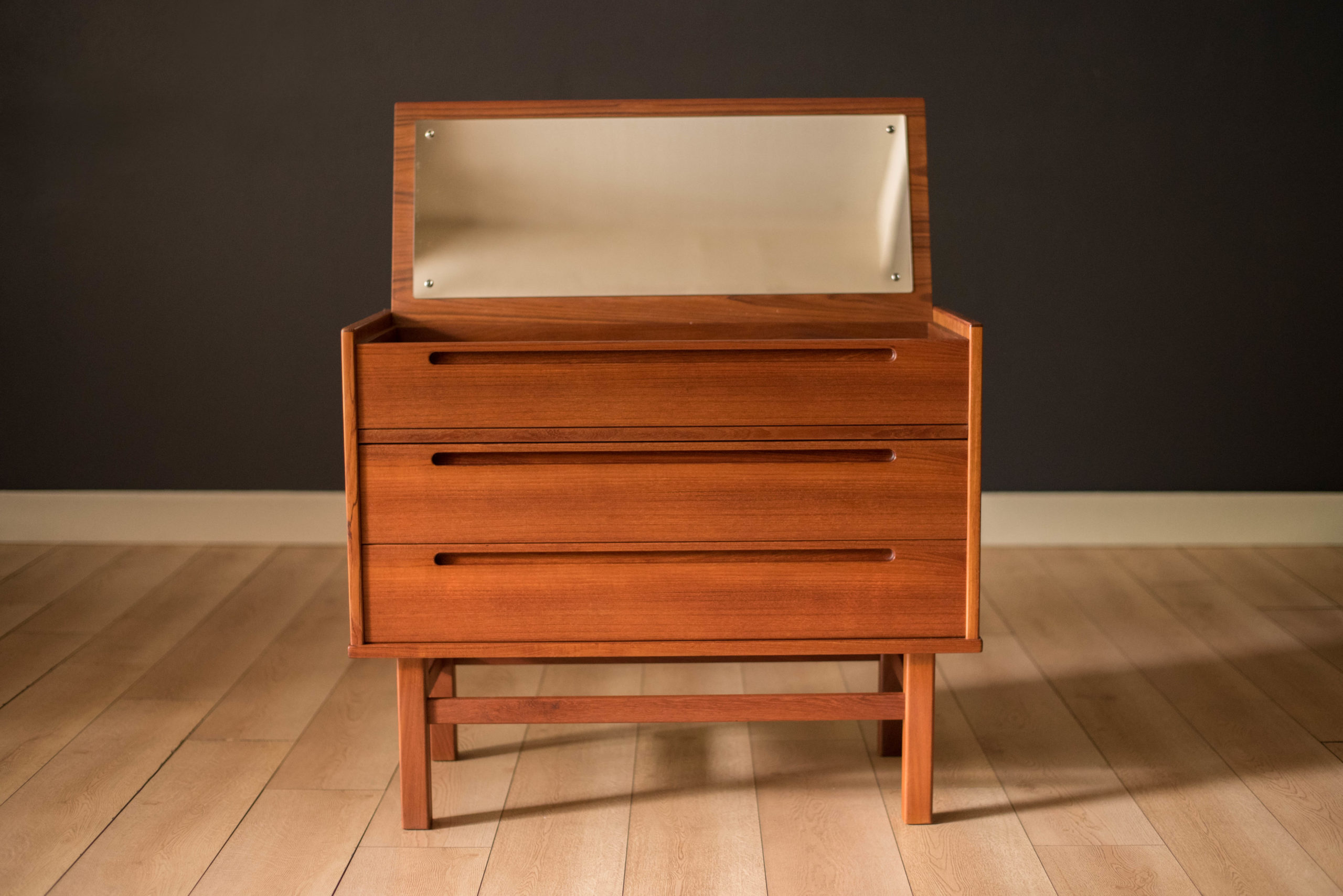Mid-Century Modern dresser chest in teak designed by Nils Jonsson circa 1960s. Equipped with three storage drawers accessorized with sculpted inset pulls and dovetail construction. Features a hidden mirror vanity and a finished teak interior drawer with organizing compartments for small belongings. In good condition with scratches and nicks. Patina on the mirror.
