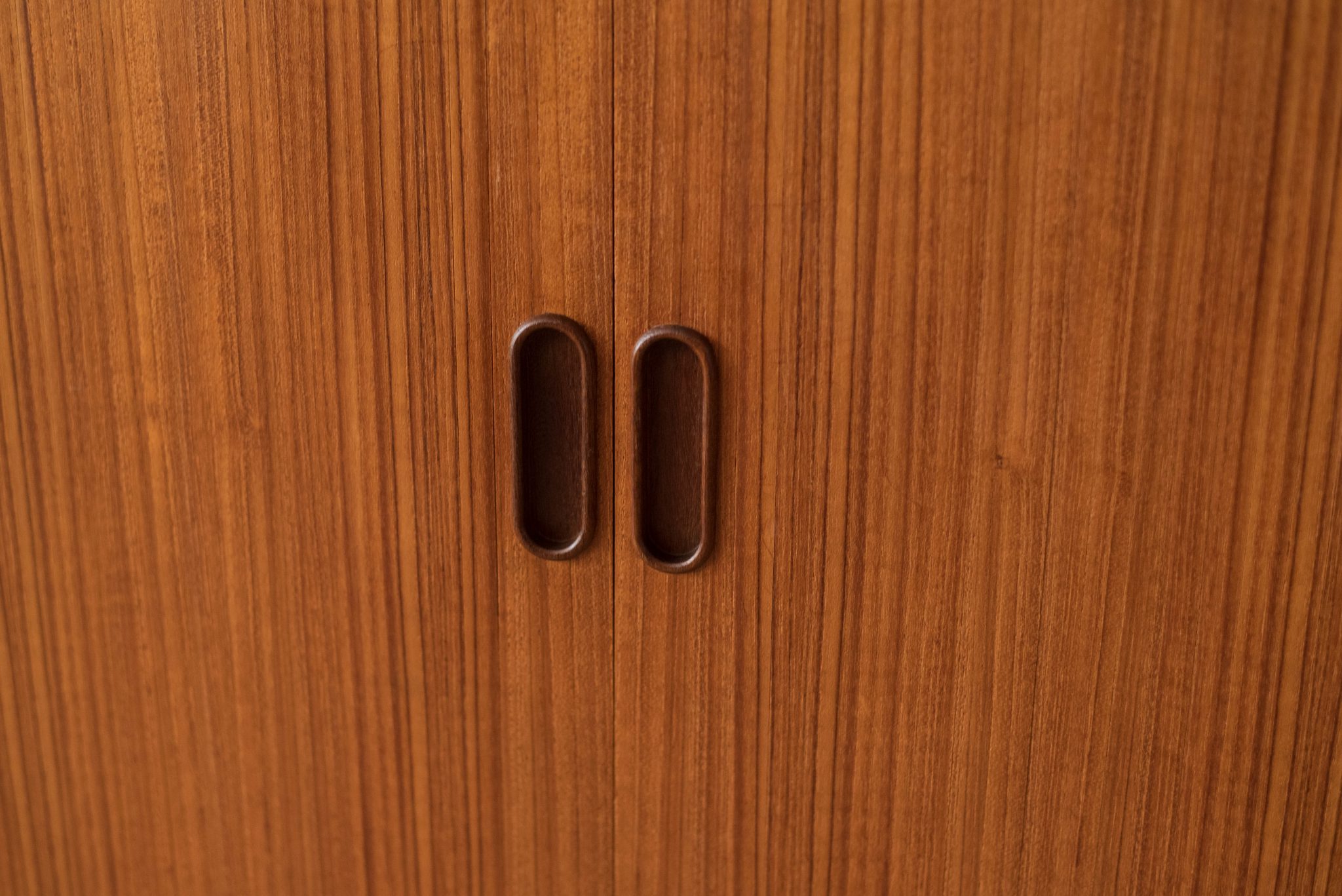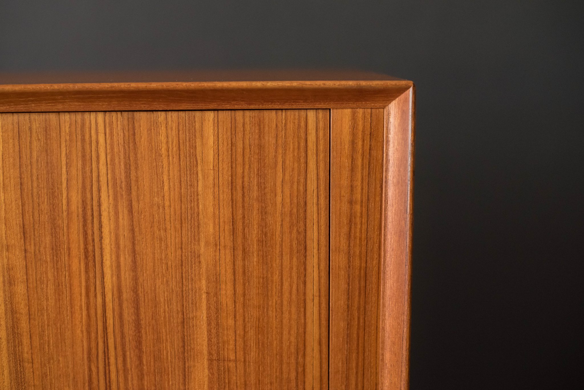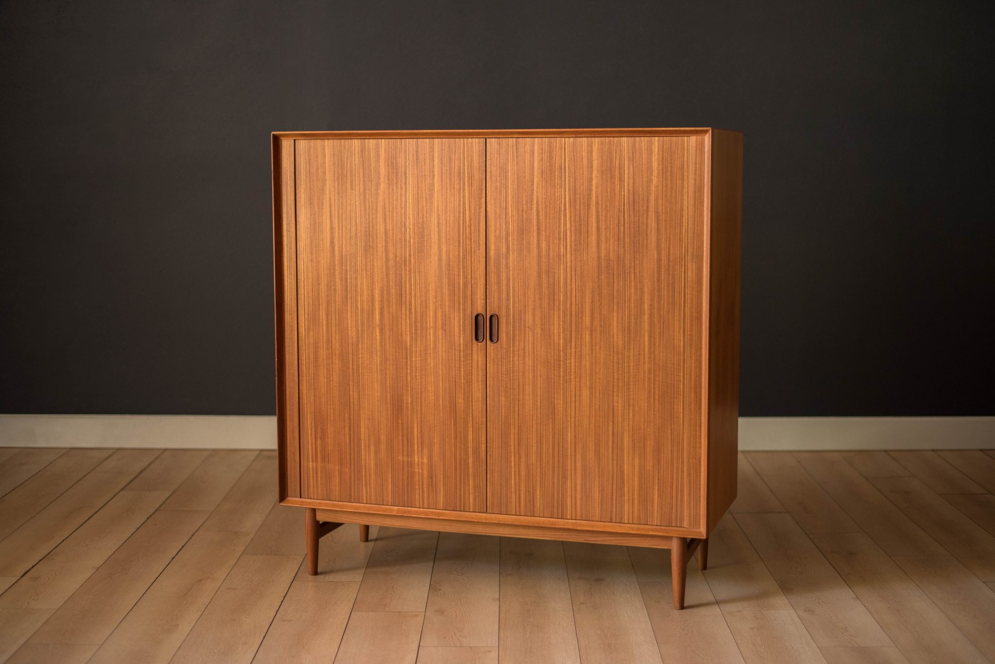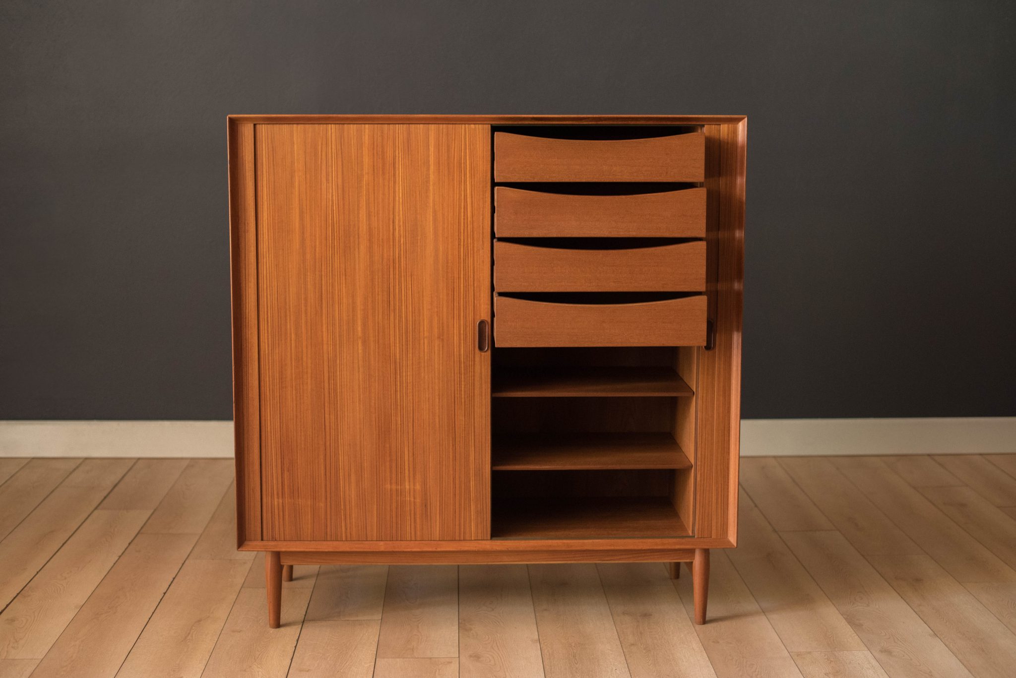 Mid-Century Modern tall wardrobe dresser chest designed by Arne Vodder for Sibast Møbler, circa 1960s, Denmark. Features a stunning and functional tambour sliding door that reveals plenty of organized storage space. Complete with eight slide out shelves, four dovetailed drawers, and two additional adjustable shelves.
