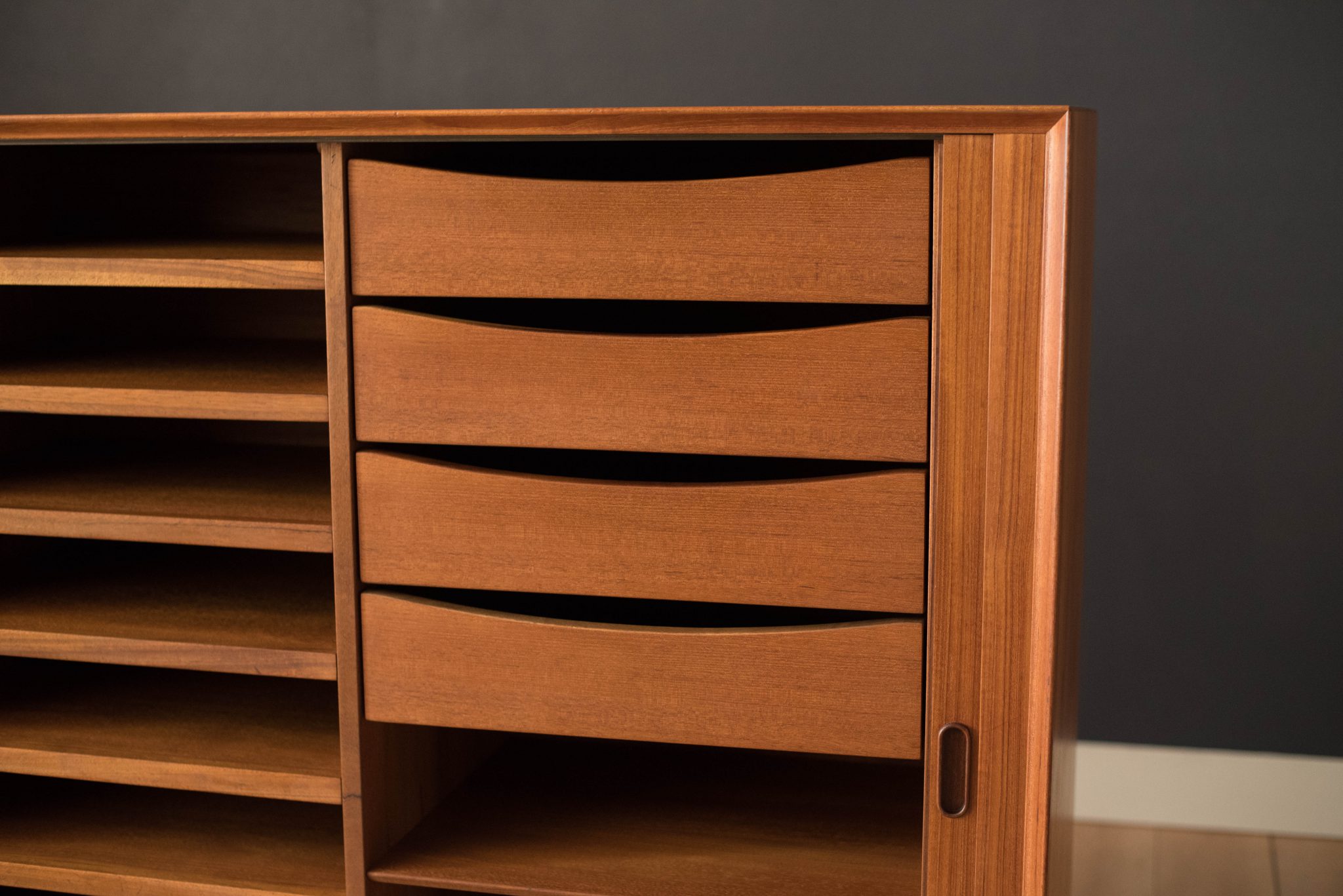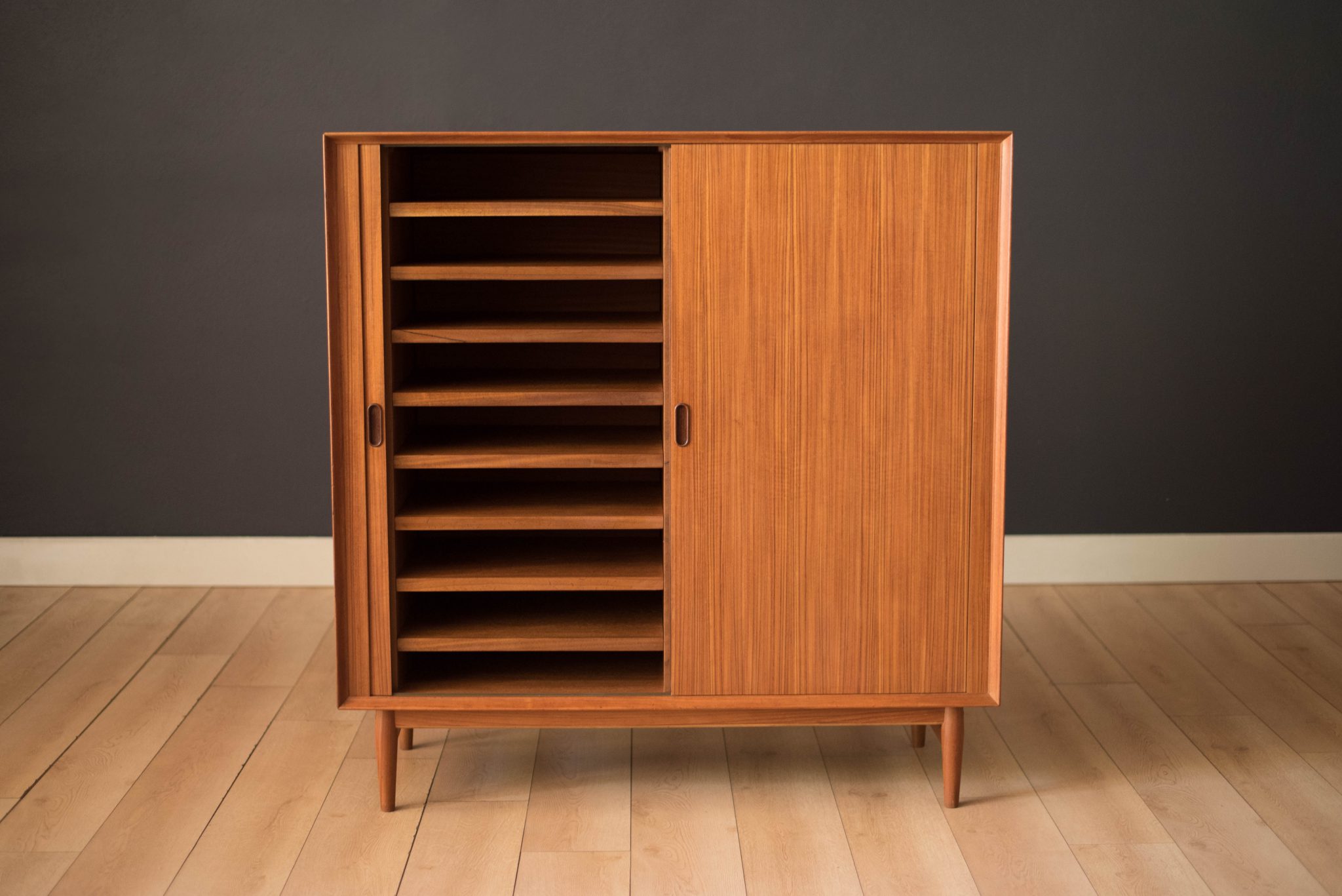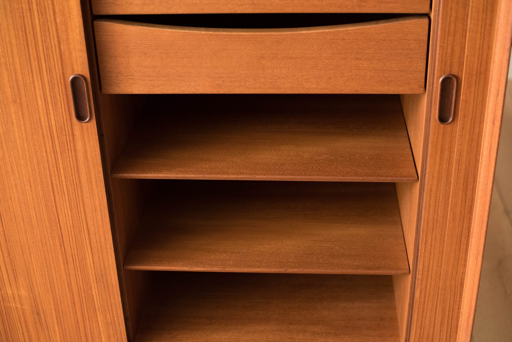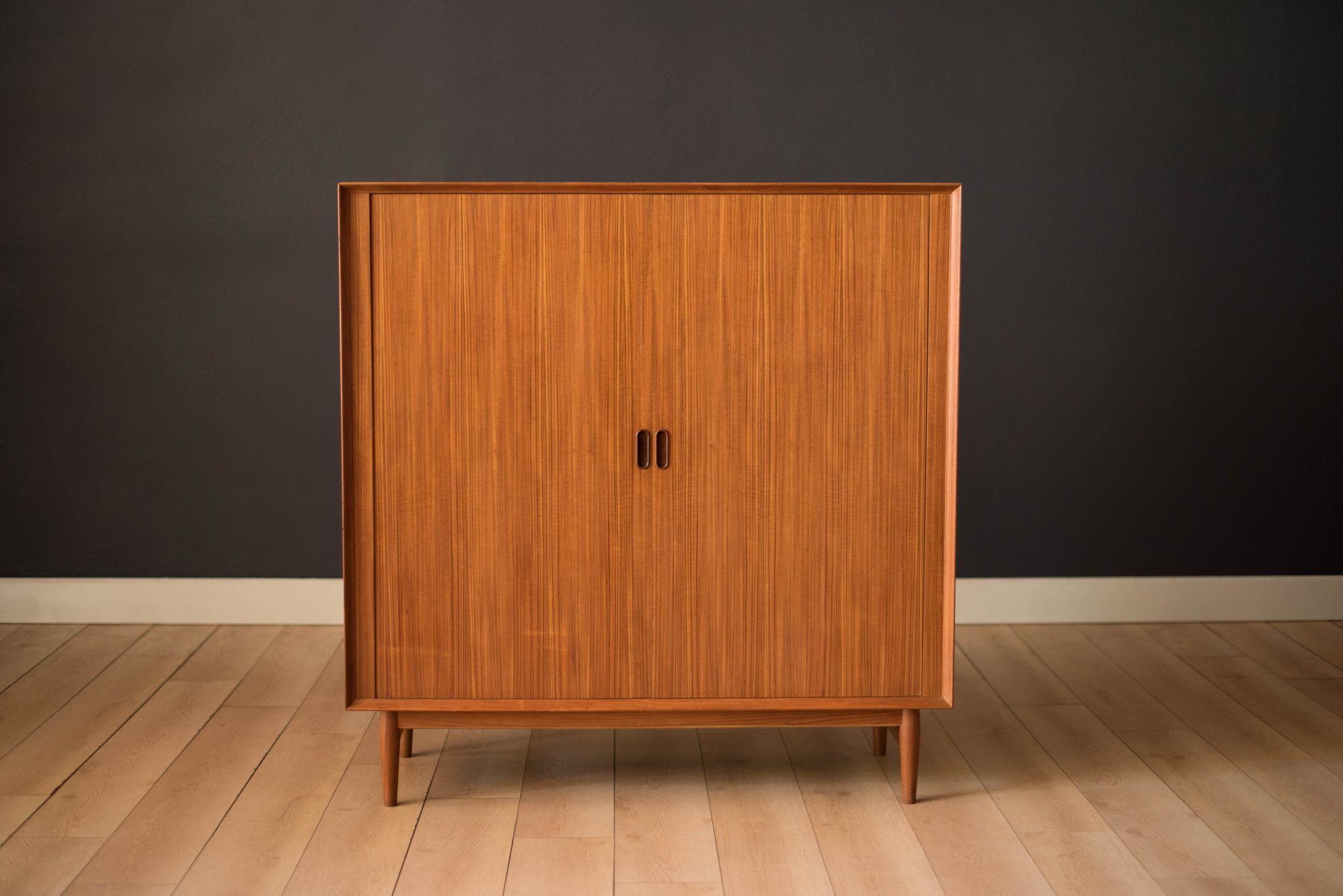 Mid-Century Modern tall wardrobe dresser chest designed by Arne Vodder for Sibast Møbler, circa 1960s, Denmark. Features a stunning and functional tambour sliding door that reveals plenty of organized storage space. Complete with eight slide out shelves, four dovetailed drawers, and two additional adjustable shelves.