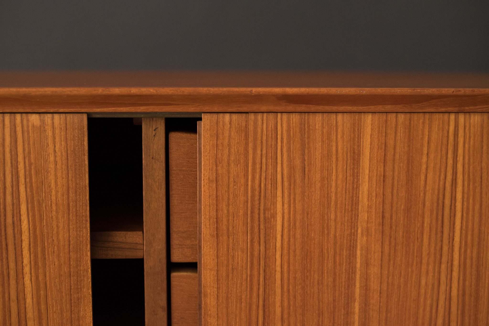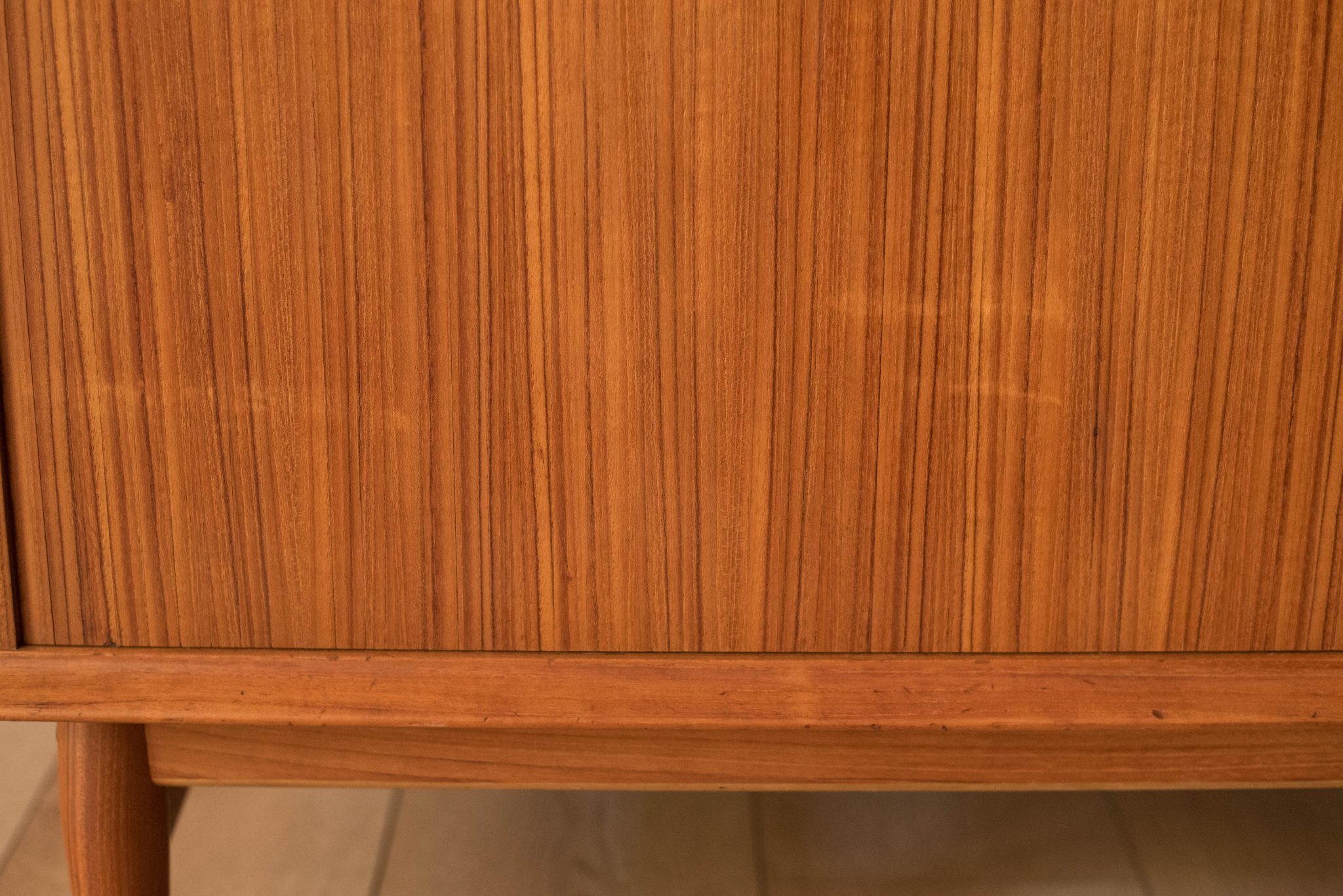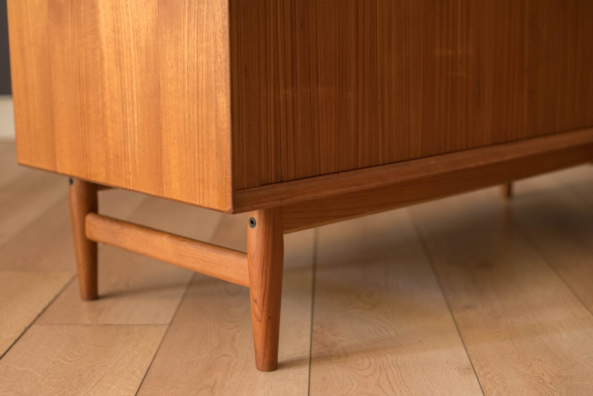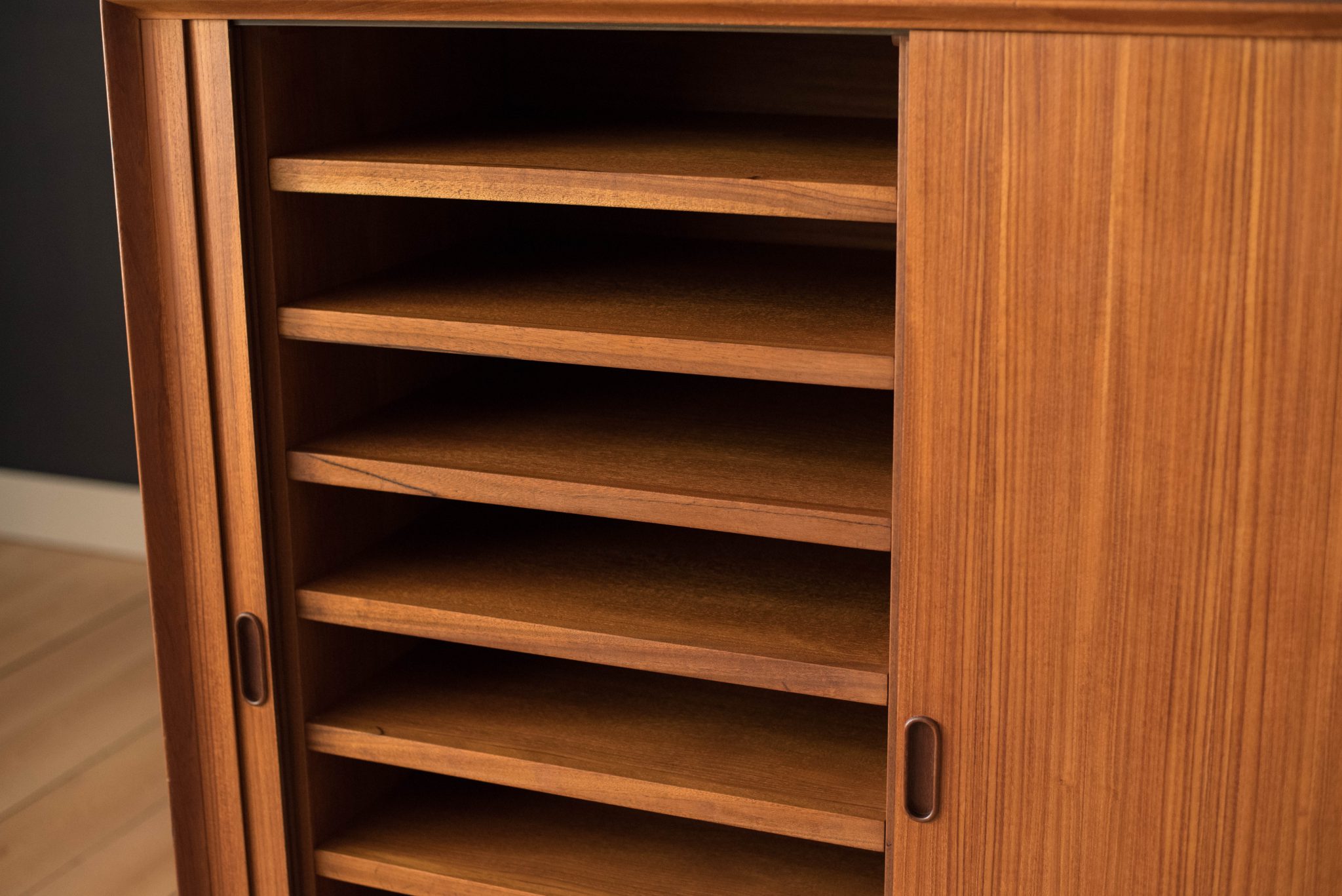 Mid-Century Modern tall wardrobe dresser chest designed by Arne Vodder for Sibast Møbler, circa 1960s, Denmark. Features a stunning and functional tambour sliding door that reveals plenty of organized storage space. Complete with eight slide out shelves, four dovetailed drawers, and two additional adjustable shelves.