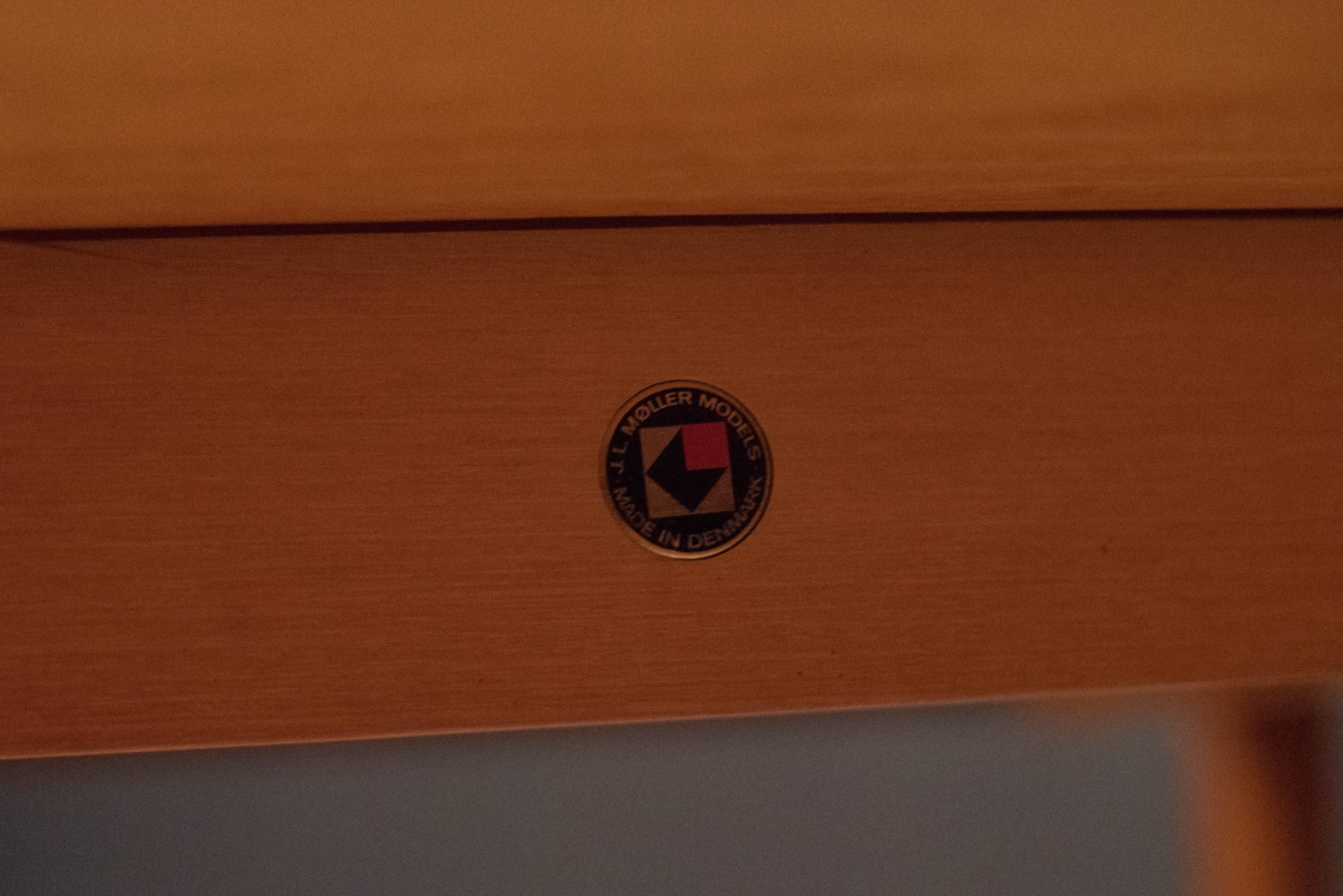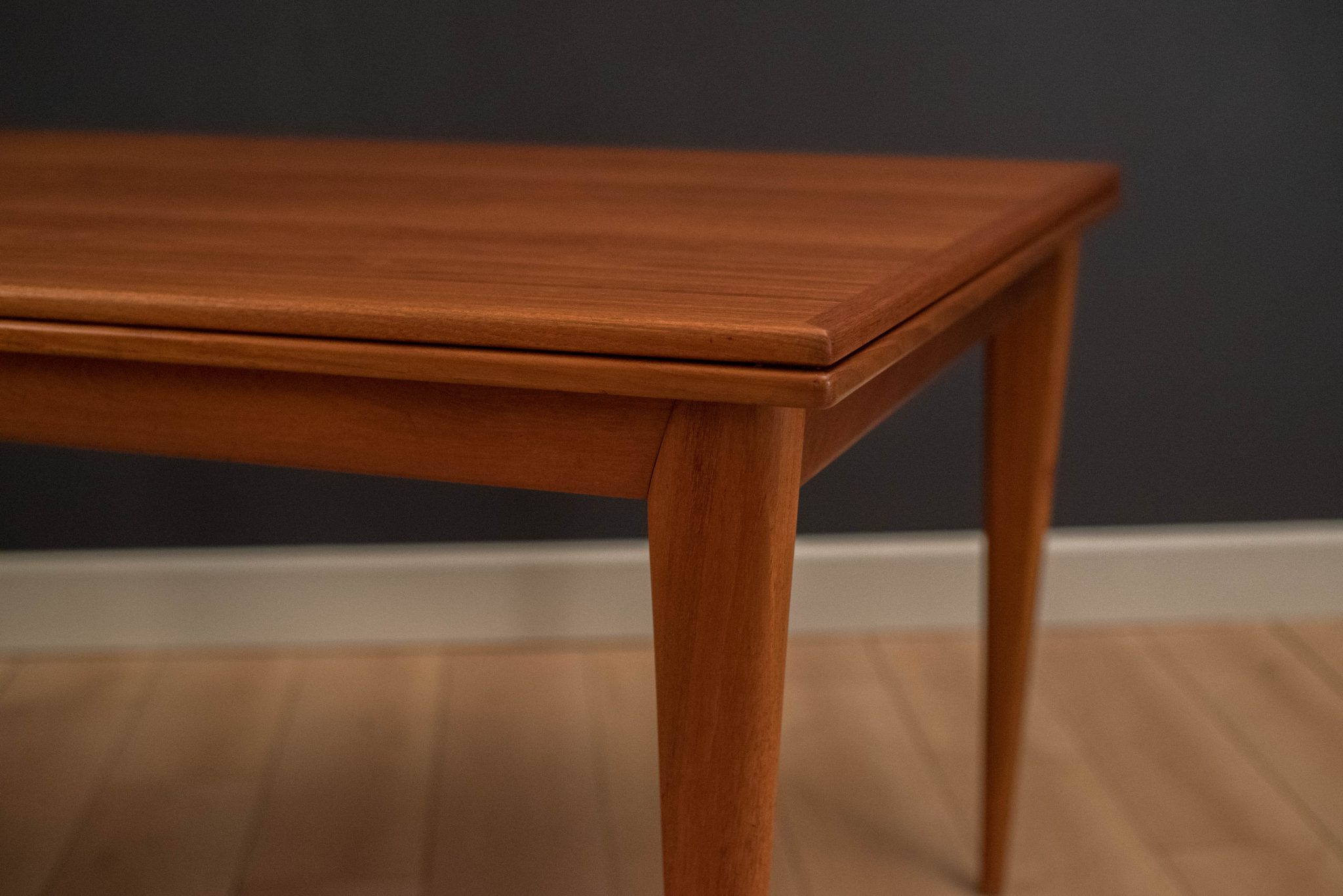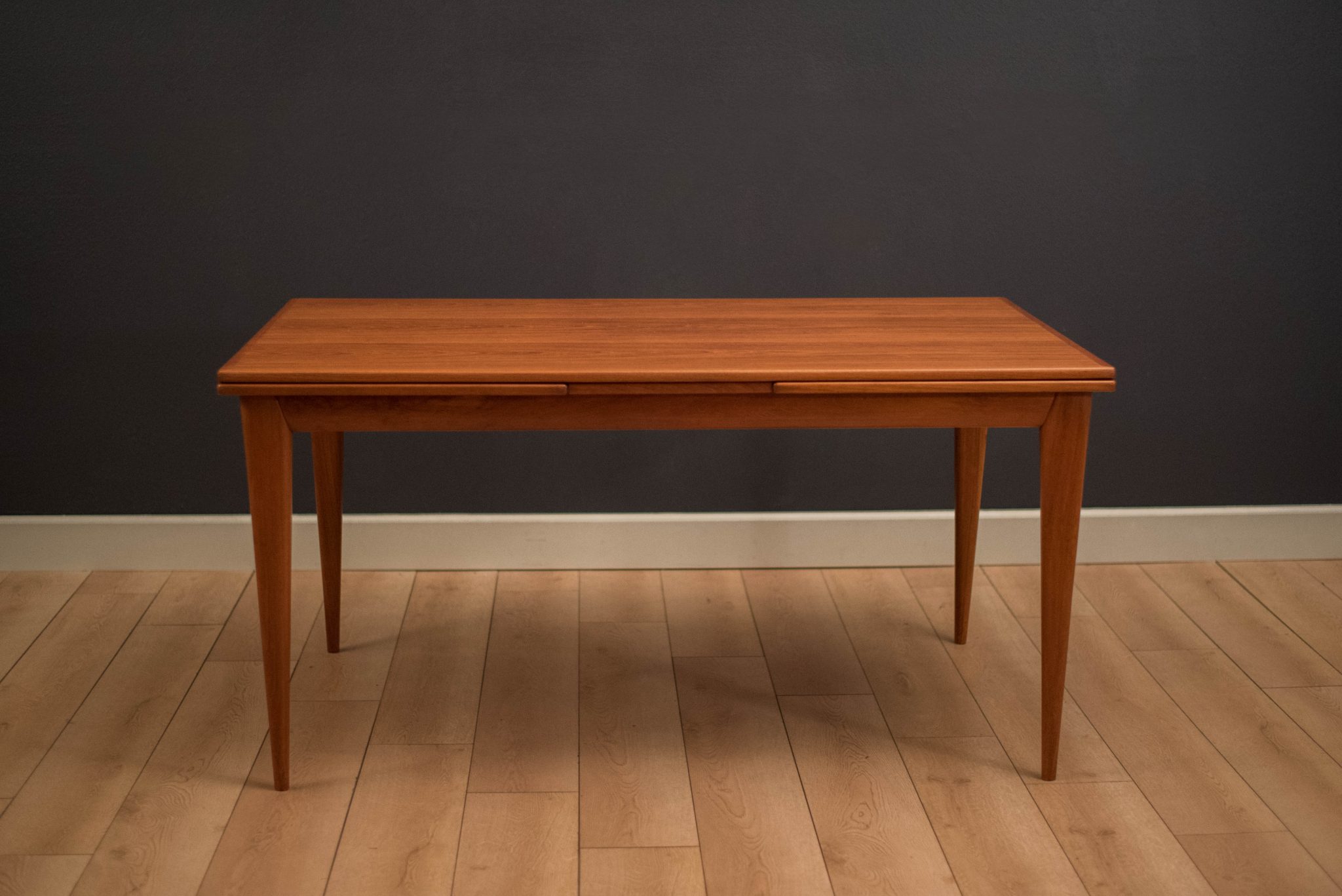 Mid century teak draw leaf dining table by Niels Otto Moller for J.L. Moller. This piece features thick tapered legs and includes two leaves that store underneath table.