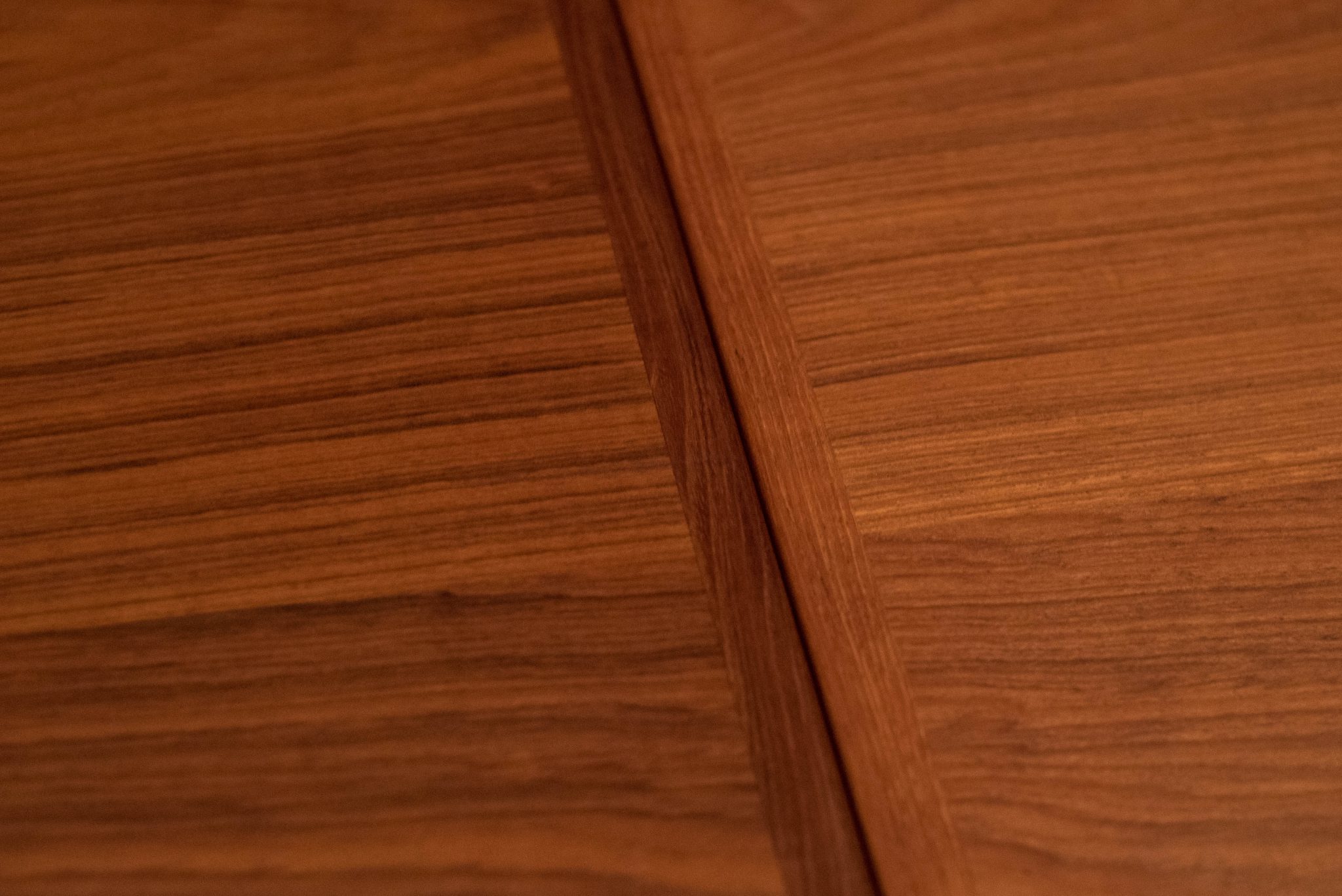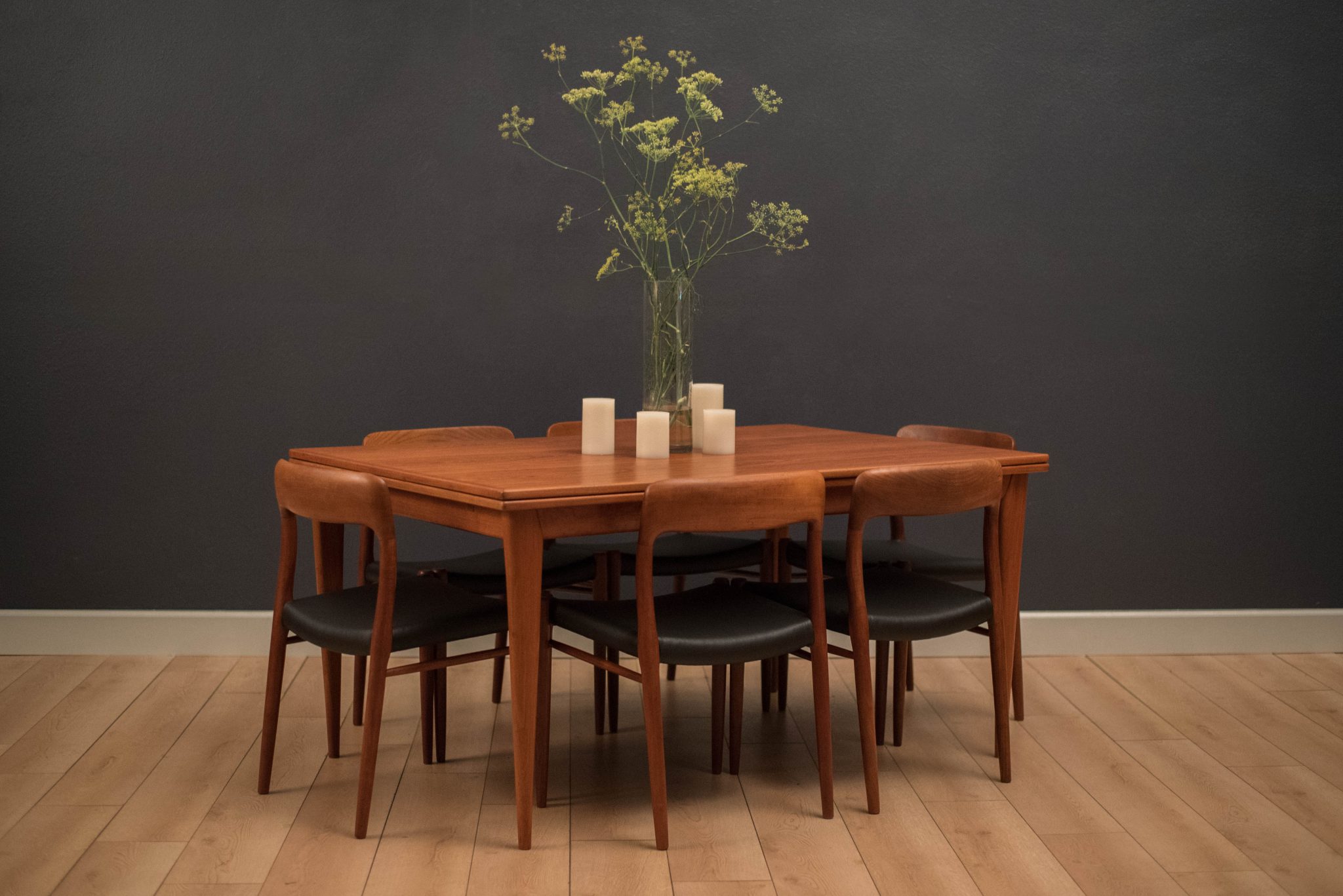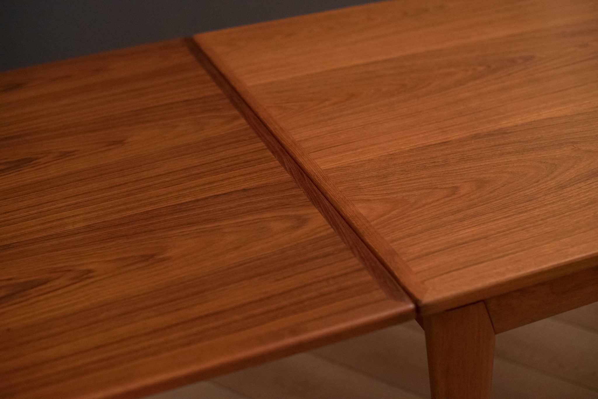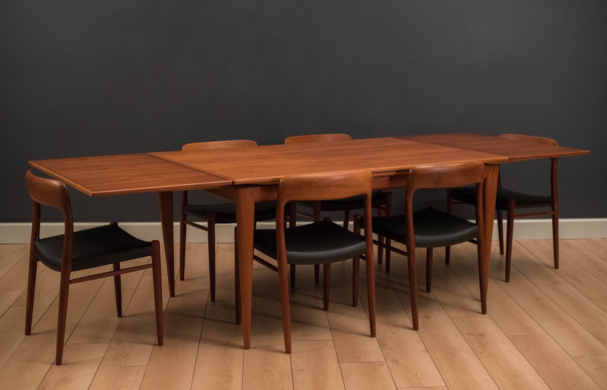 Mid century teak draw leaf dining table by Niels Otto Moller for J.L. Moller. This piece features thick tapered legs and includes two leaves that store underneath table.