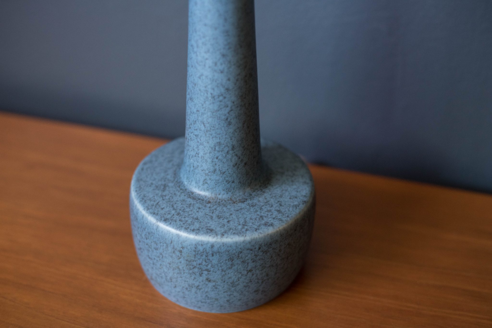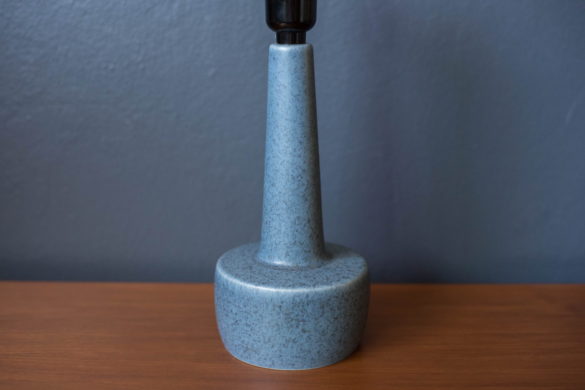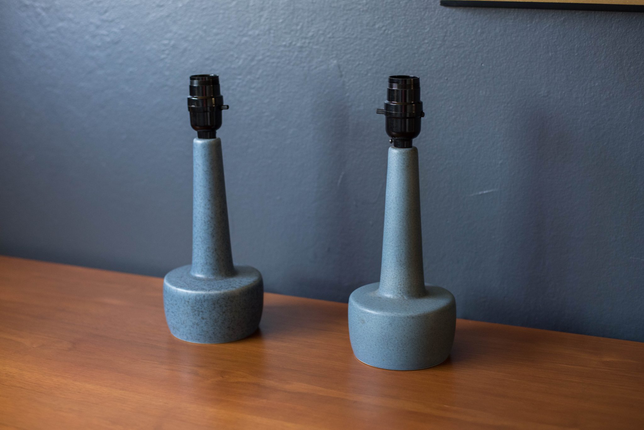 Mid century modern pair of ceramic blue stoneware lamps manufactured by Soholm, Denmark. This pair features a speckled matte light blue glaze and have been rewired for the US. Marked 972 RA.