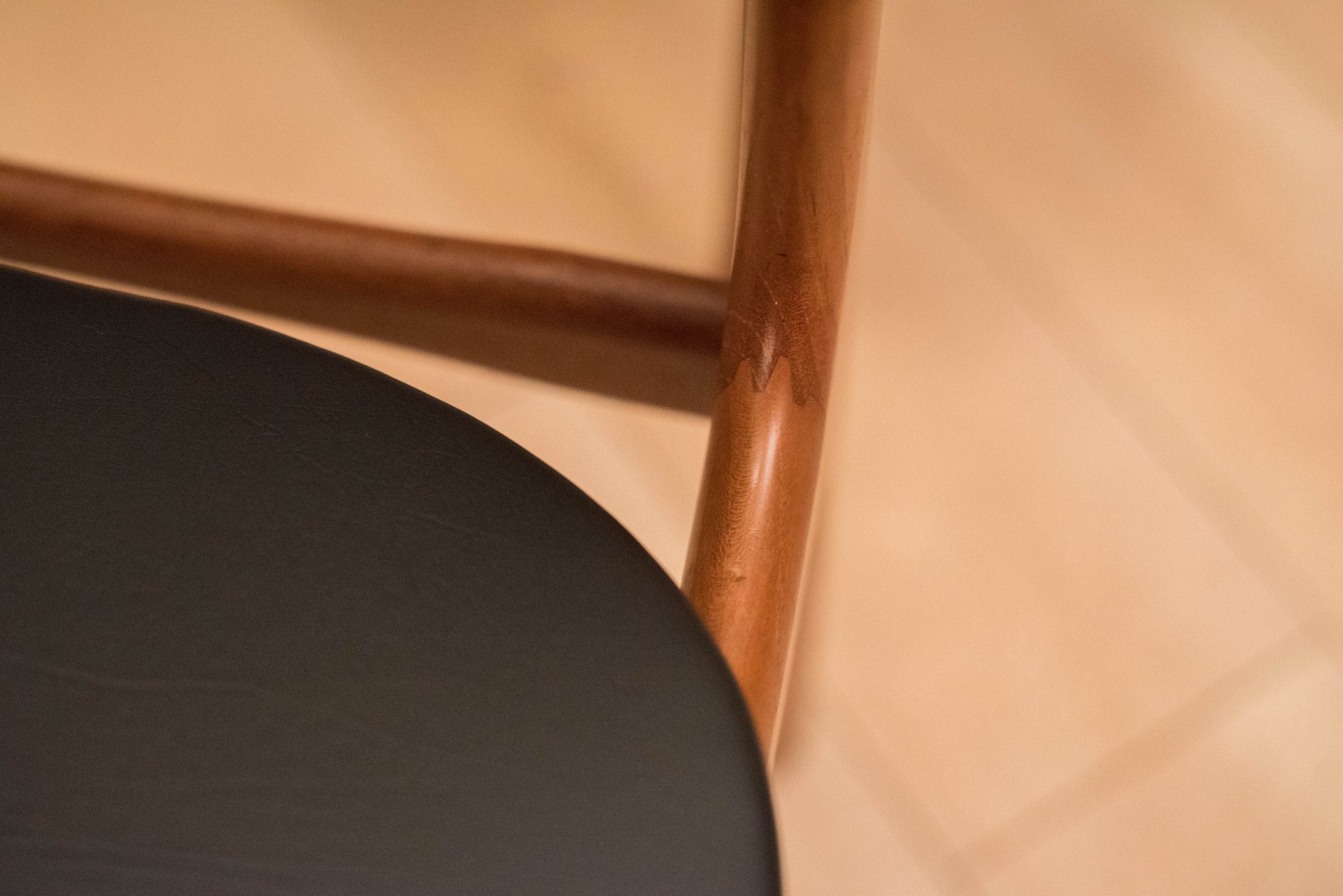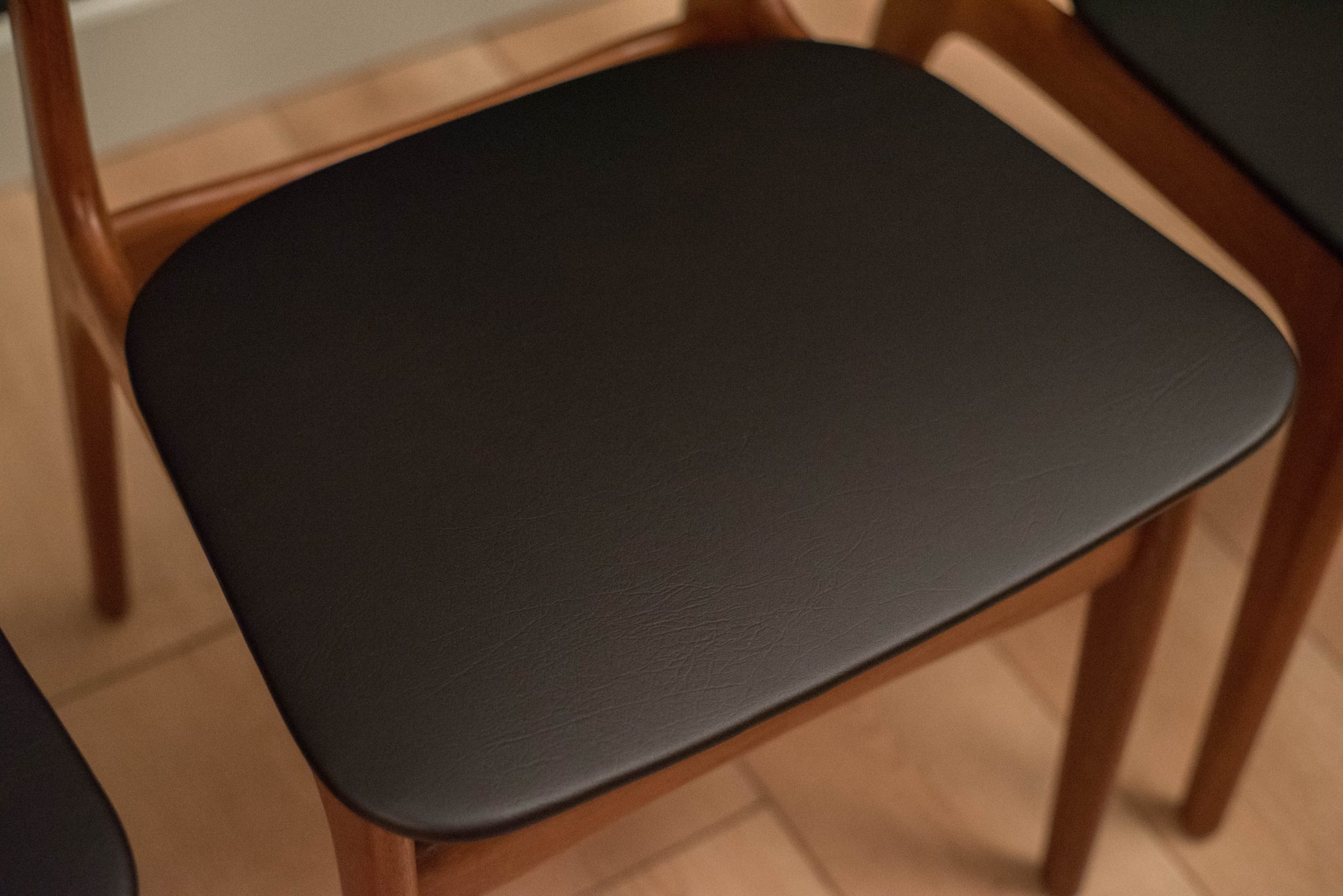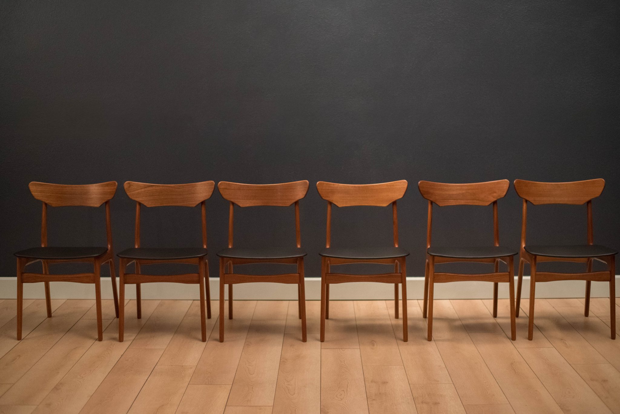 Mid Century set of six dining chairs by Schionning & Elgaard in teak. This set has new upholstered seats in black vinyl. In great condition with minimal vintage wear.