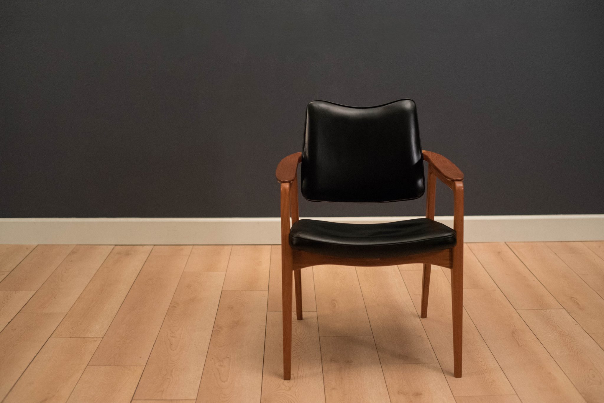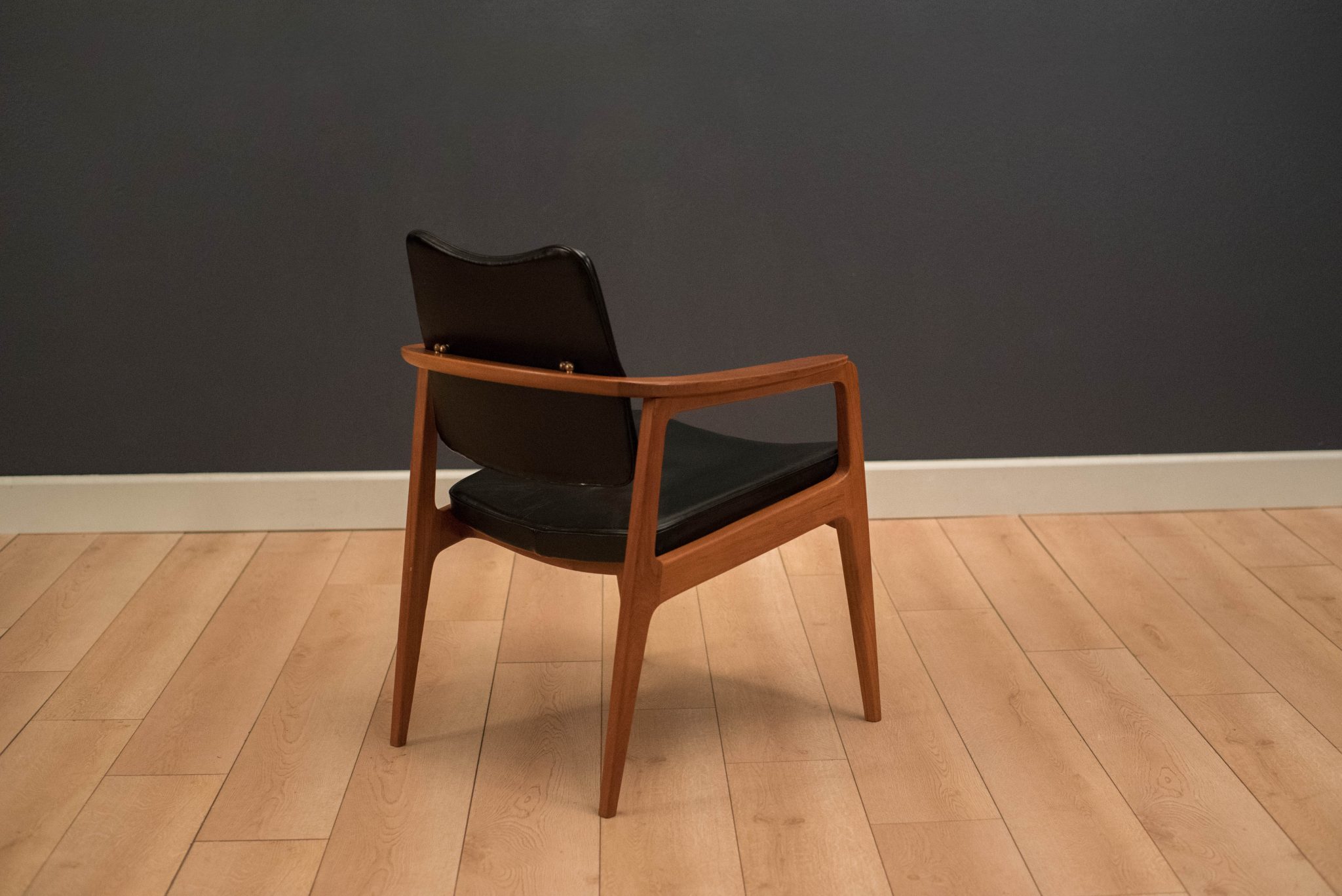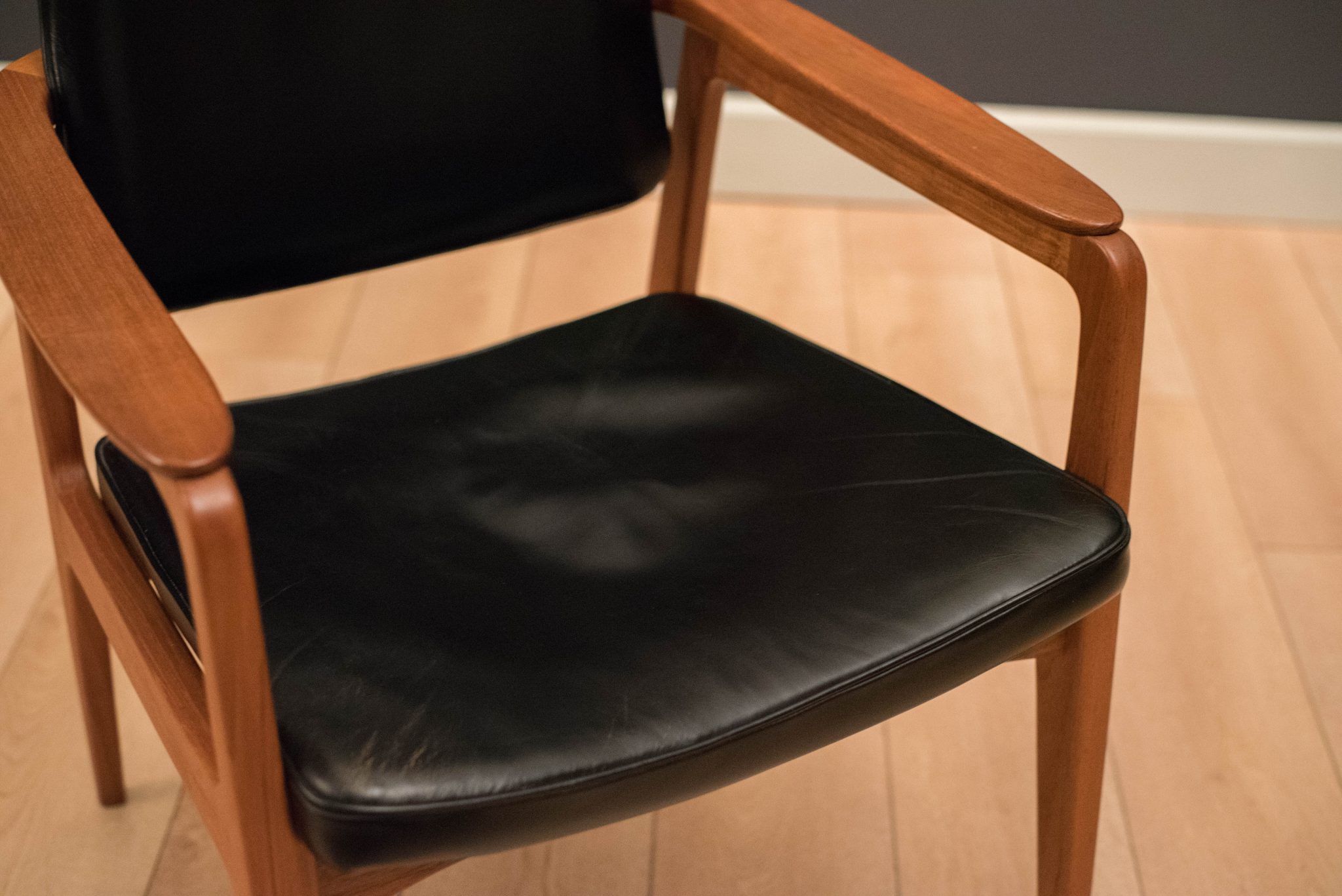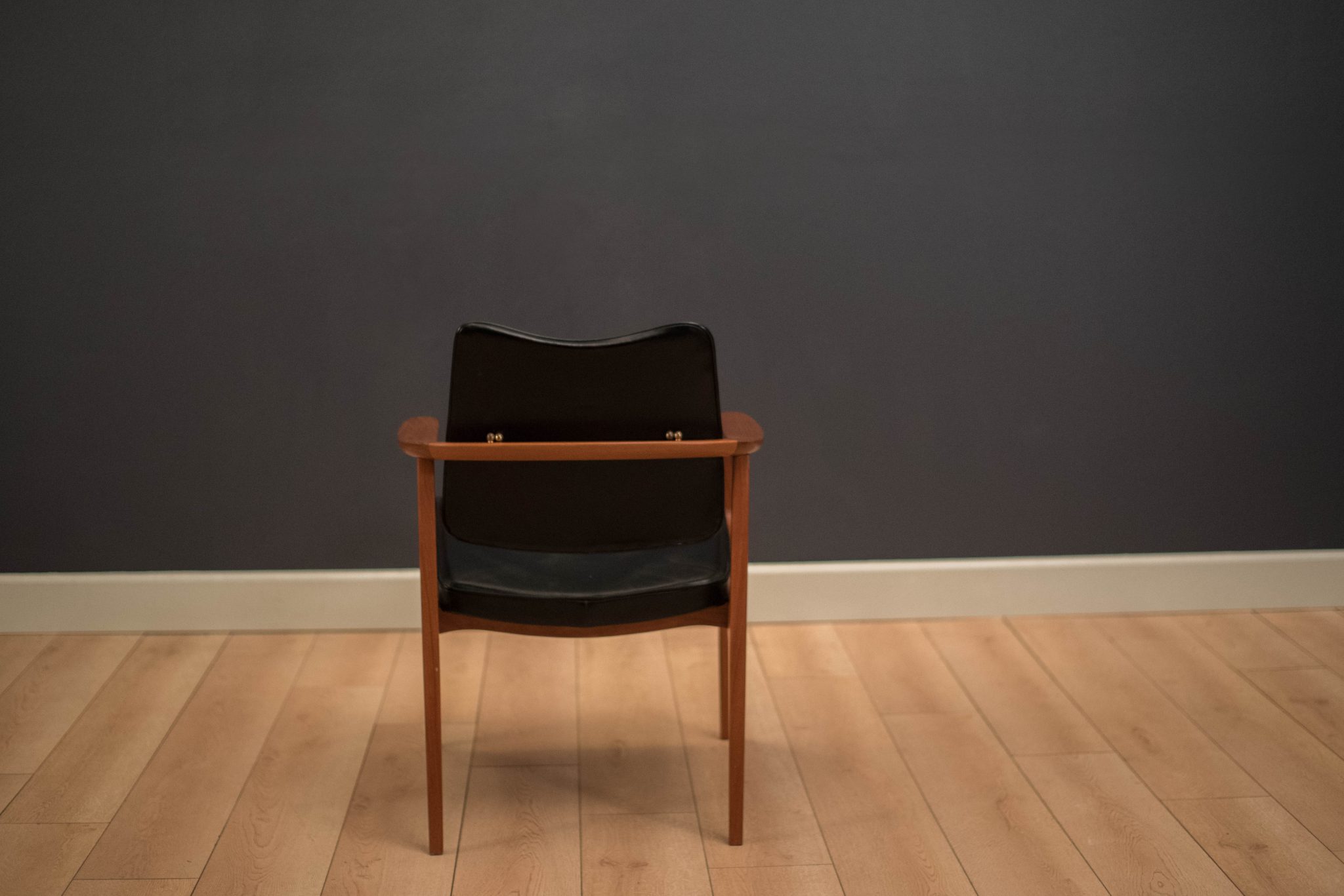 Mid-Century Modern armchair in teak by Sigvard Bernadotte for France & Son. This thoughtfully designed piece retains the original leather seats and functions with a tilting backrest. Features sculptural teak armrests that wrap around the back making this piece a statement from any angle.