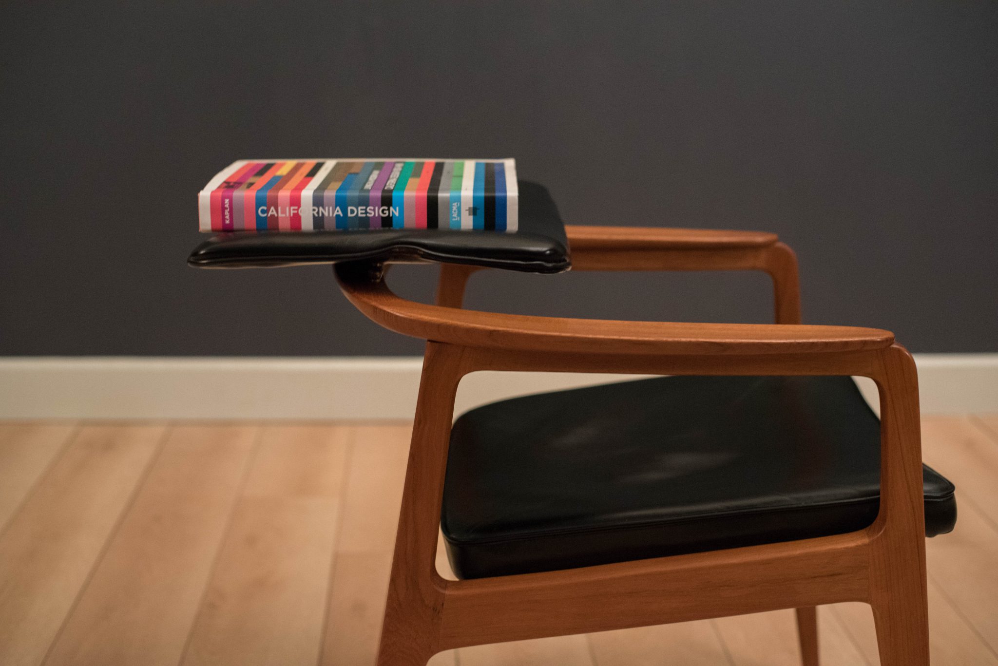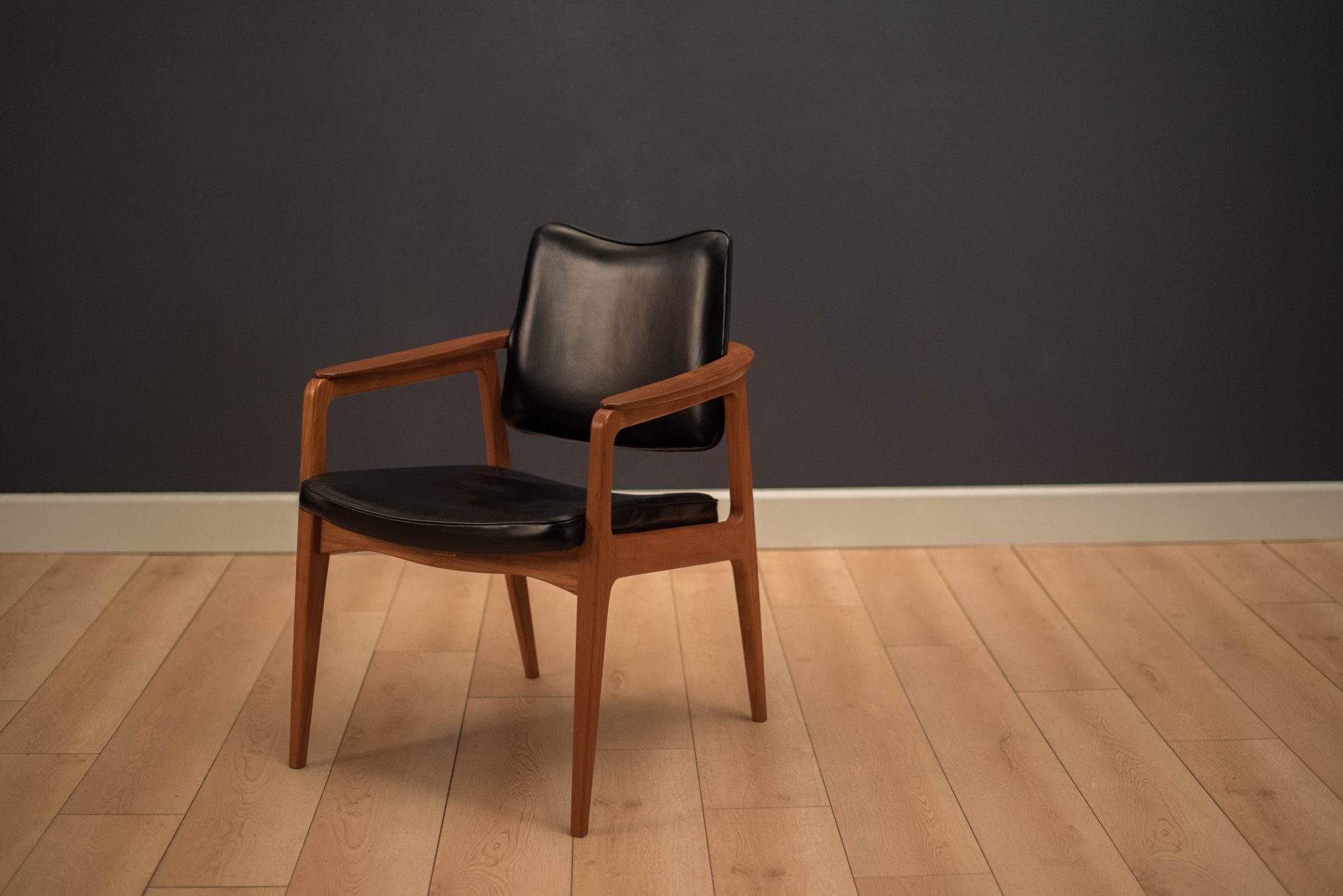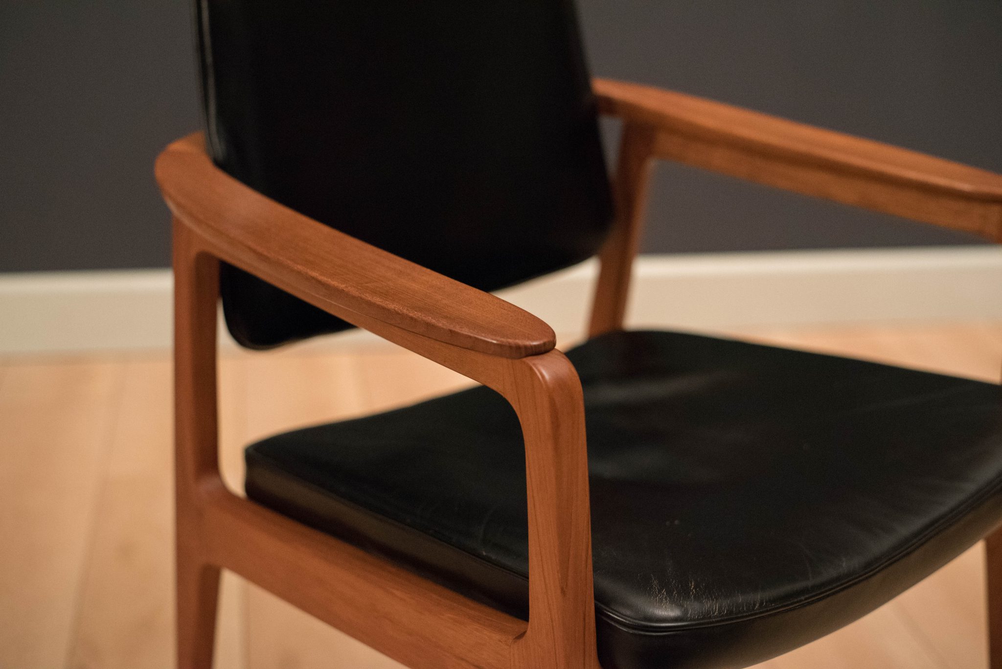 Mid-Century Modern armchair in teak by Sigvard Bernadotte for France & Son. This thoughtfully designed piece retains the original leather seats and functions with a tilting backrest. Features sculptural teak armrests that wrap around the back making this piece a statement from any angle.