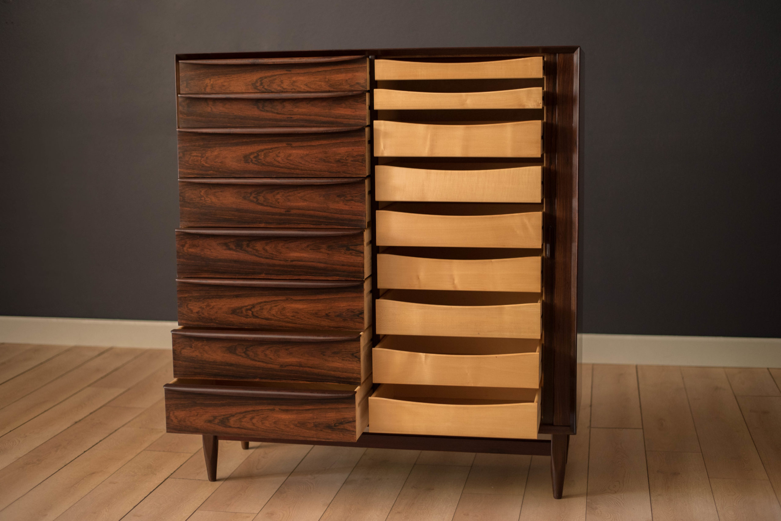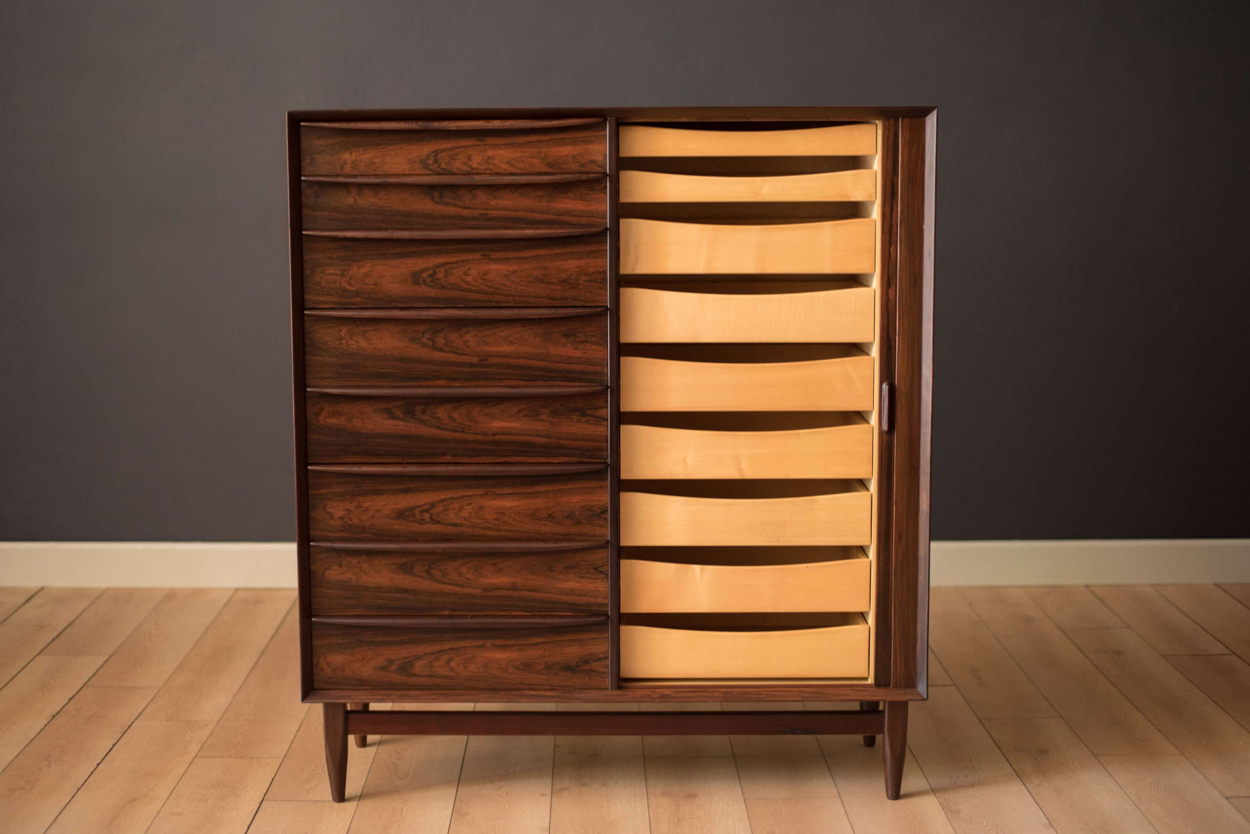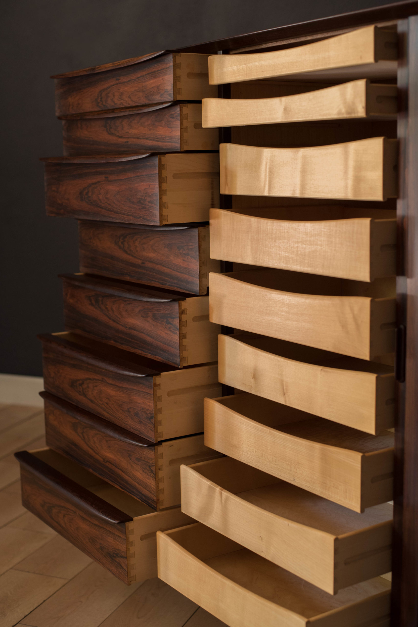 Mid-Century Modern highboy dresser chest in rosewood designed by Svend A. Madsen for Falster Møbelfabrik, Denmark. Features eight dovetailed storage drawers with sculpted pulls and a sliding tambour door that reveals an additional nine drawers.