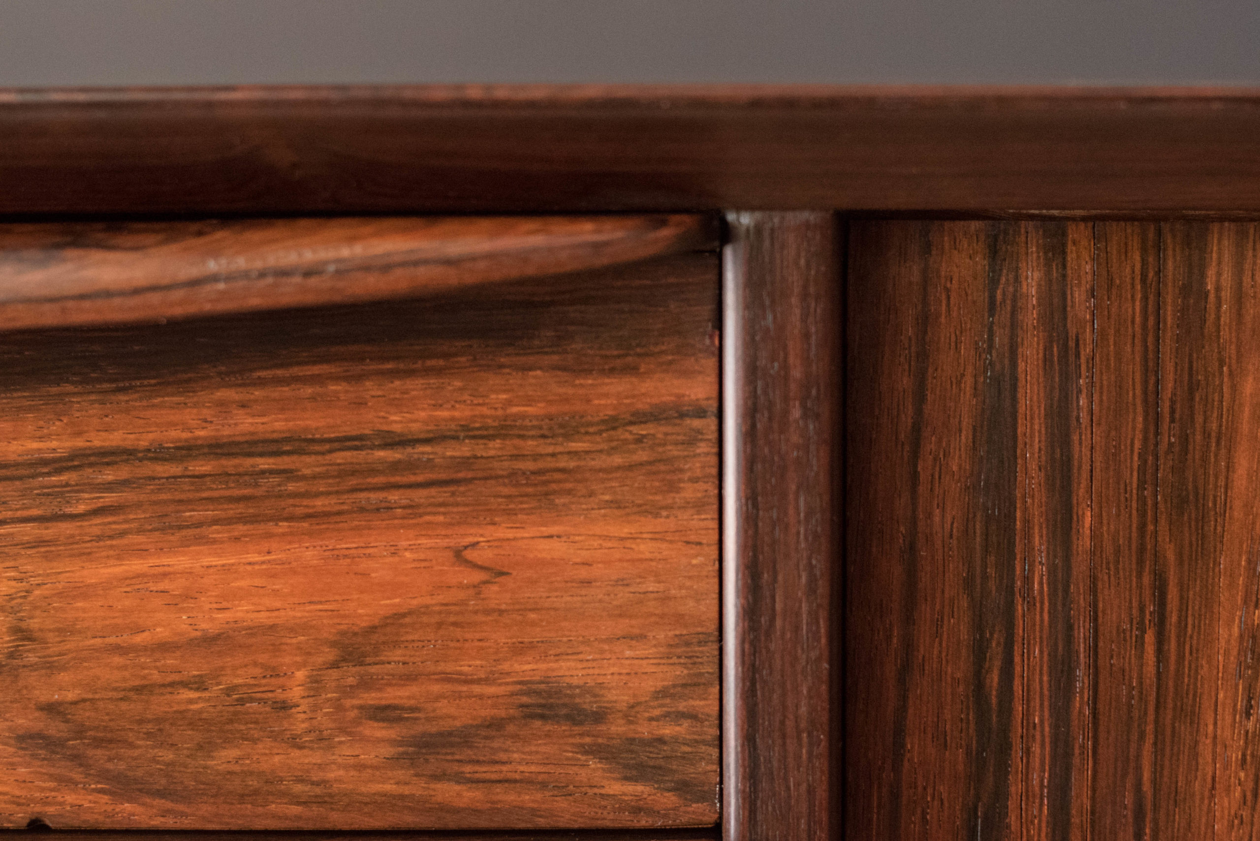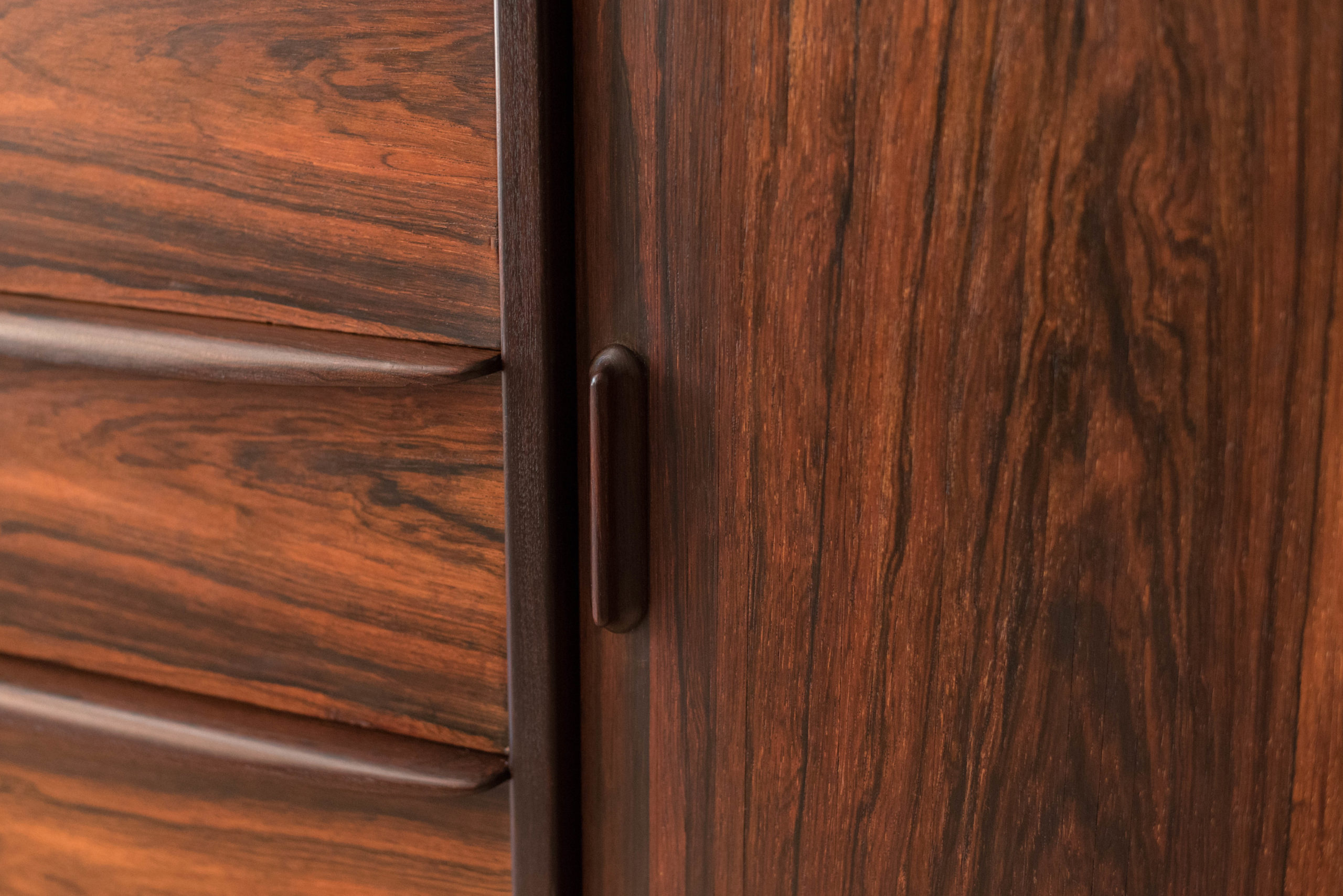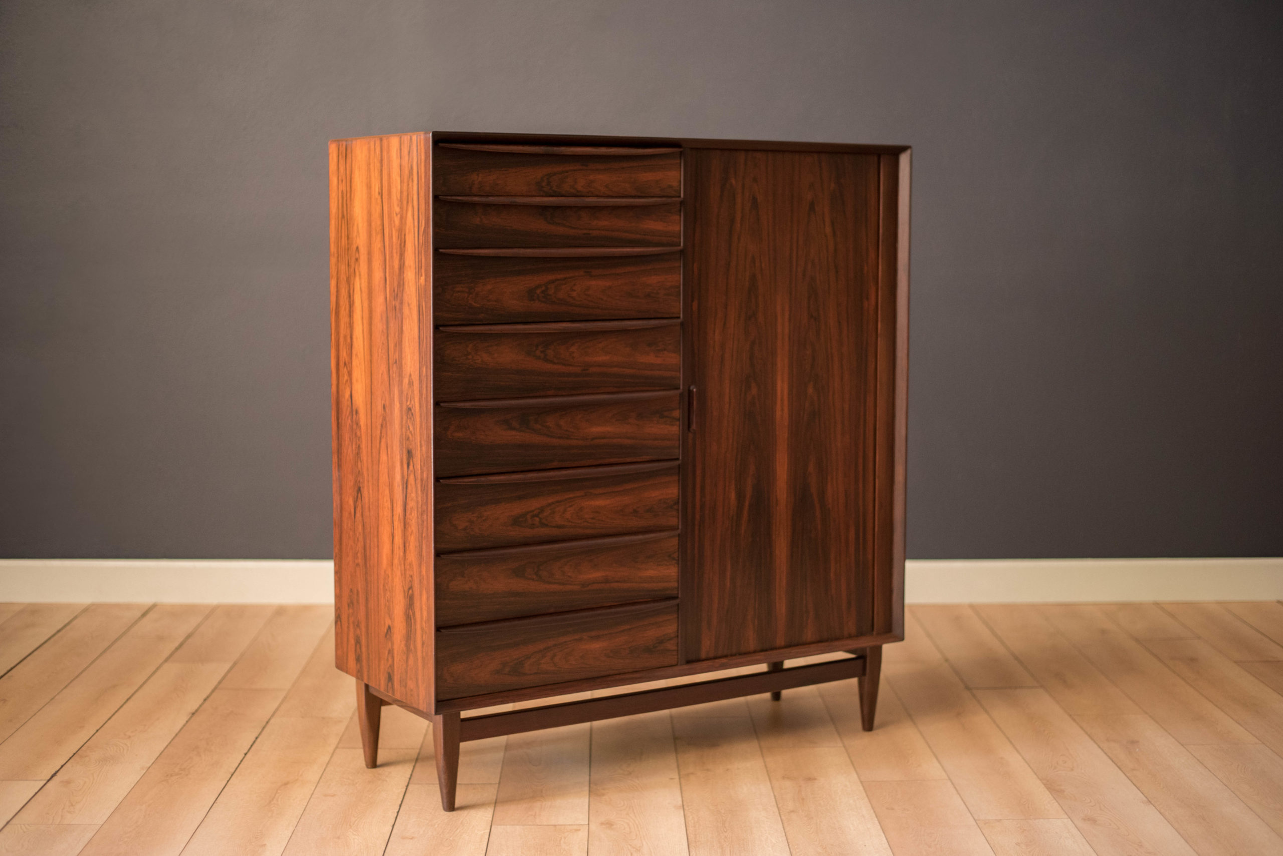 Mid-Century Modern highboy dresser chest in rosewood designed by Svend A. Madsen for Falster Møbelfabrik, Denmark. Features eight dovetailed storage drawers with sculpted pulls and a sliding tambour door that reveals an additional nine drawers.