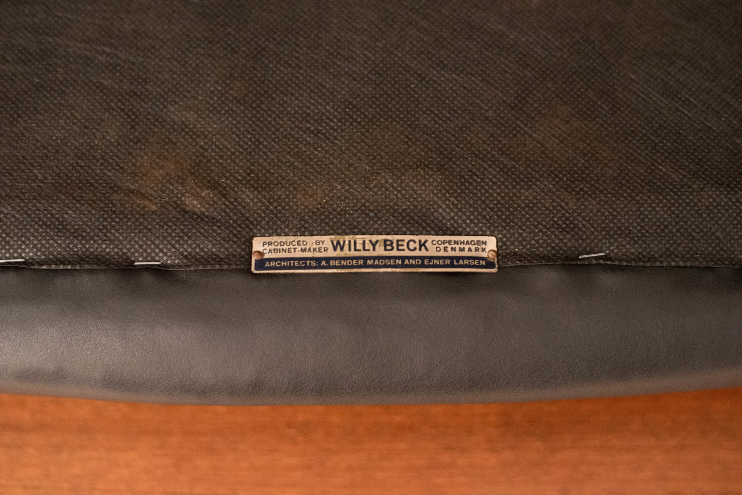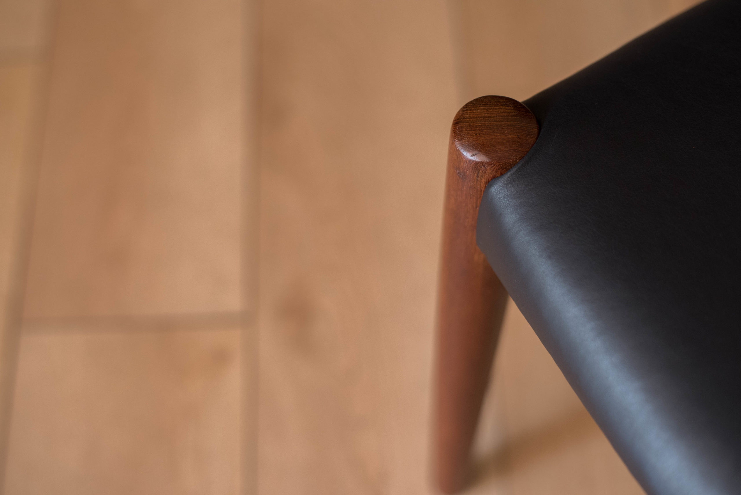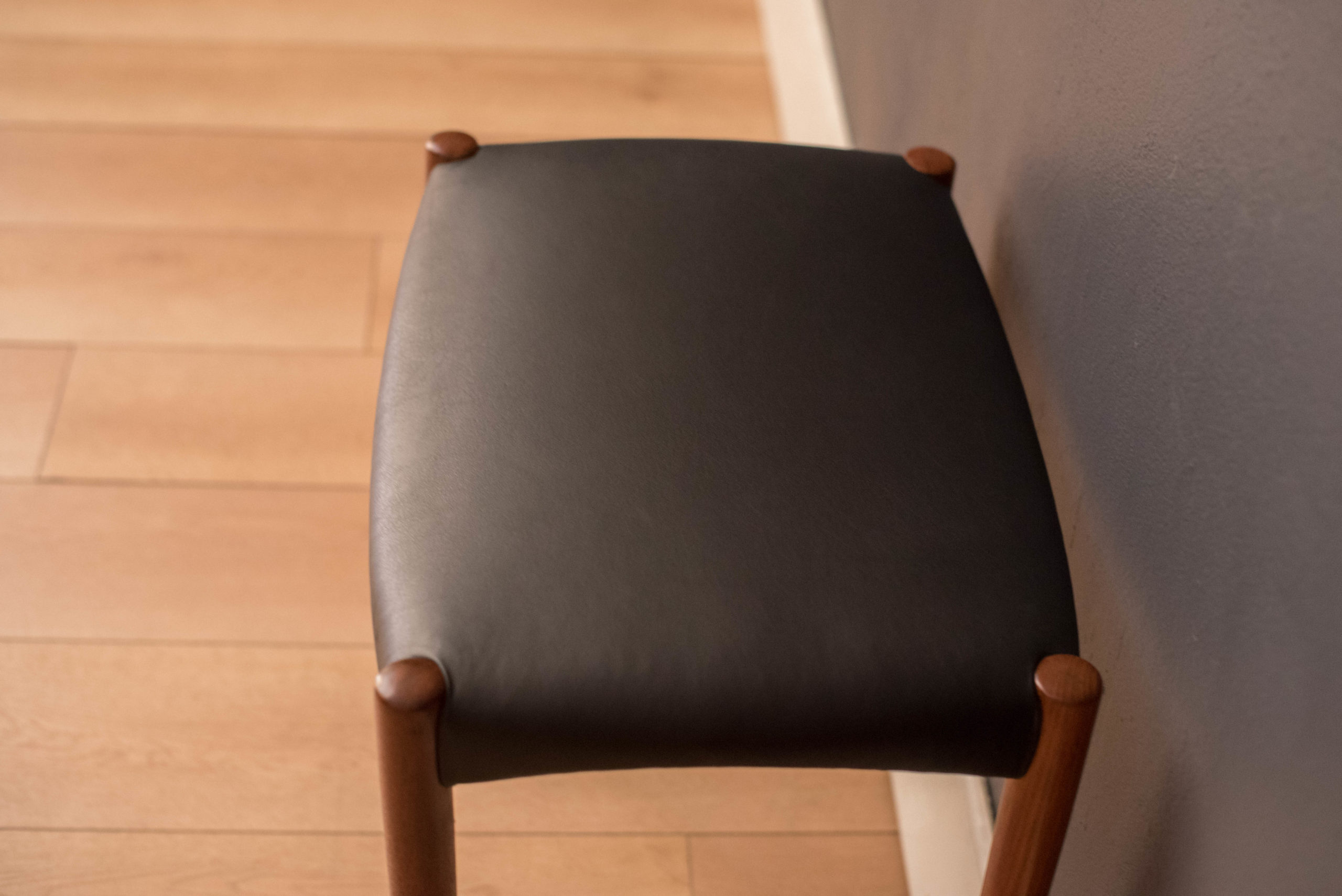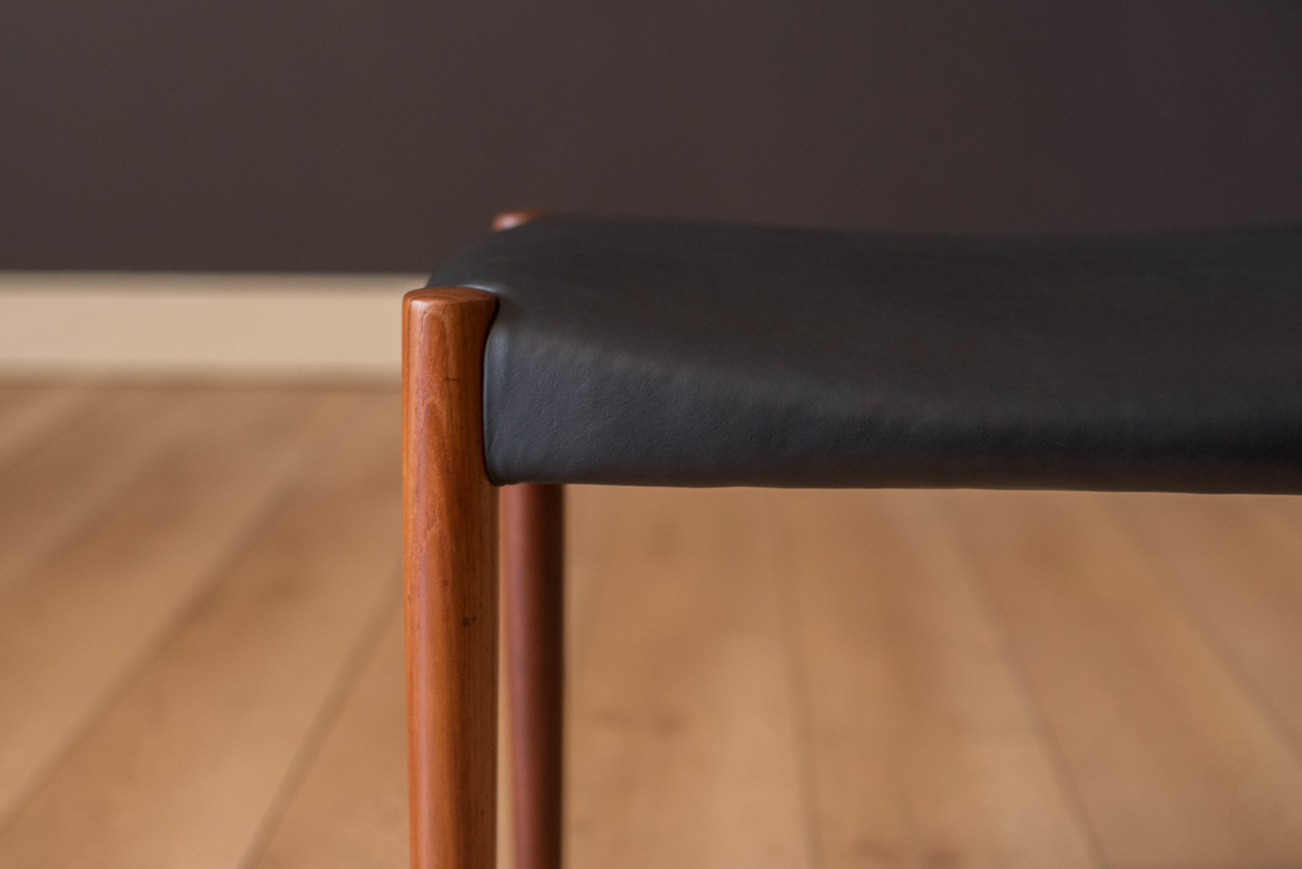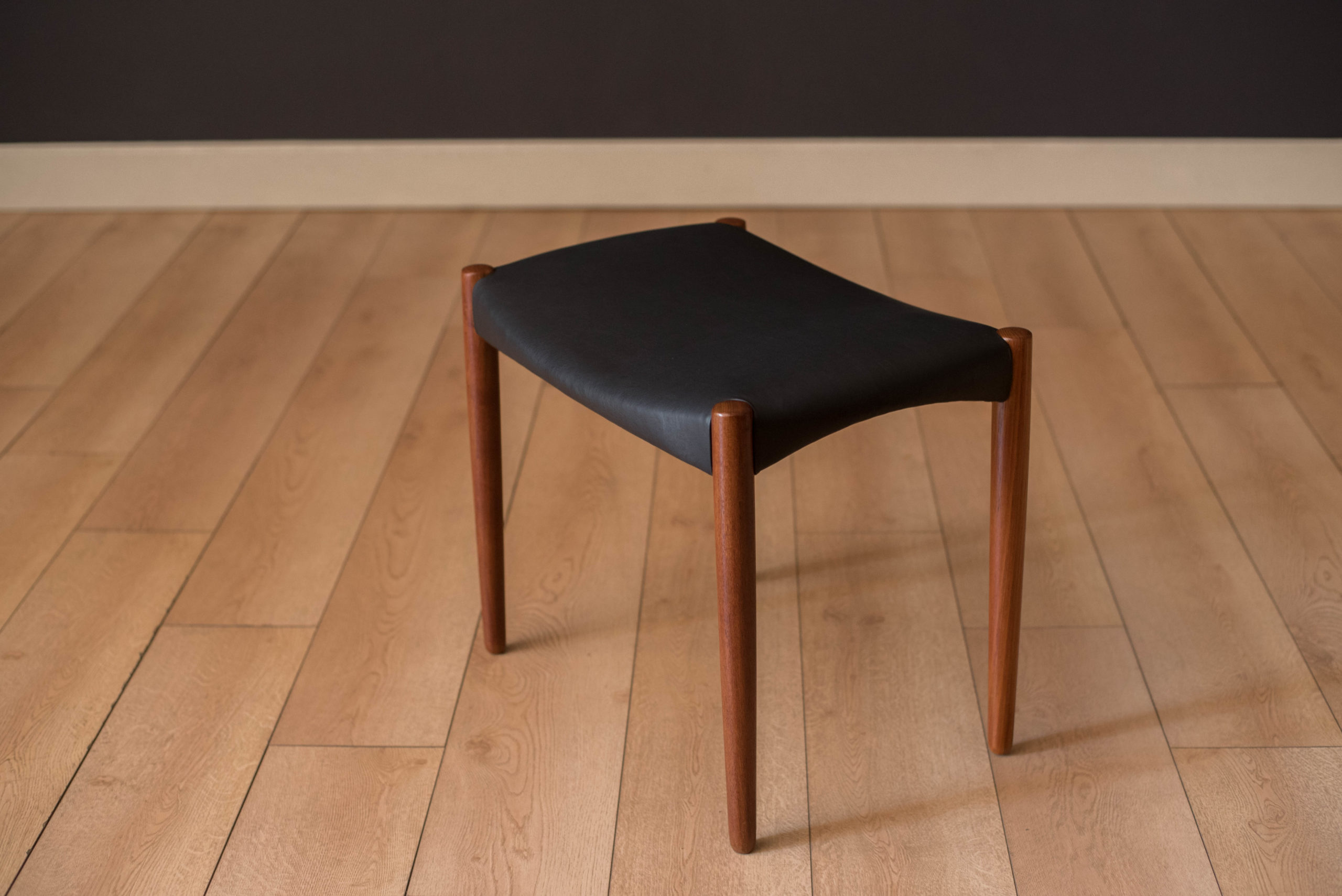 Mid-Century Modern stool in teak by Aksel Bender Madsen and Ejner Larsen for cabinet maker Willy Beck, Denmark. Features a sleek minimalist design and has been newly reupholstered in black leather. This versatile sitting stool can be used as a side chair in the dining room area or as a single desk vanity chair.