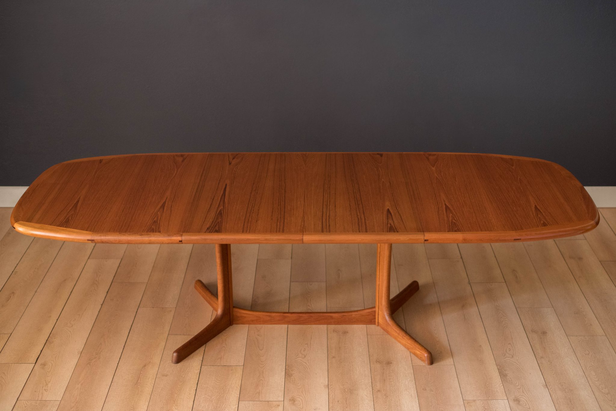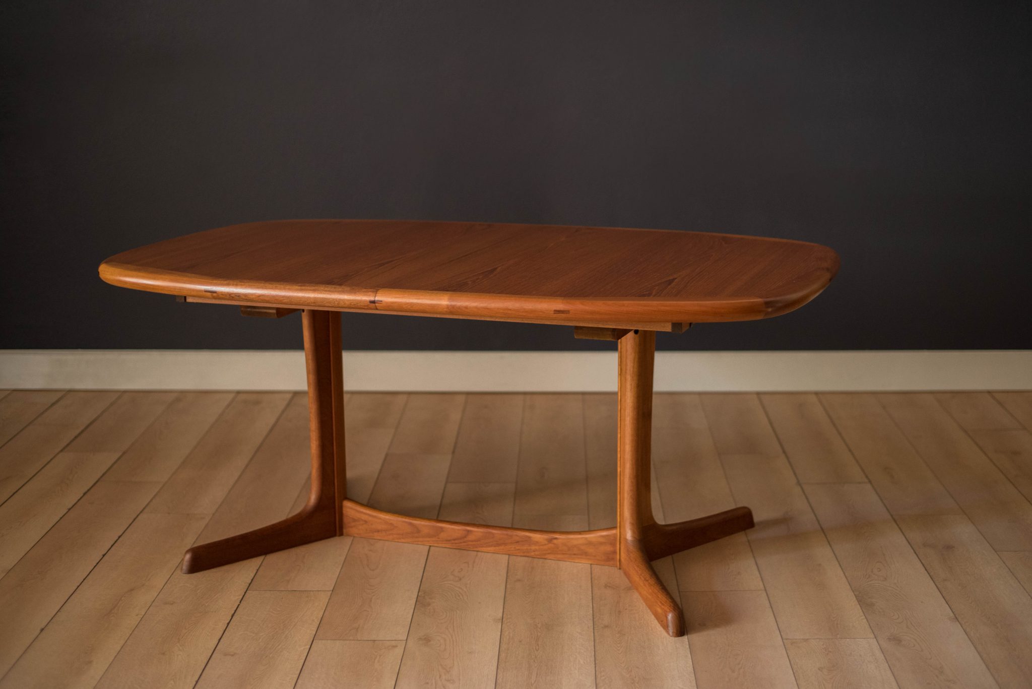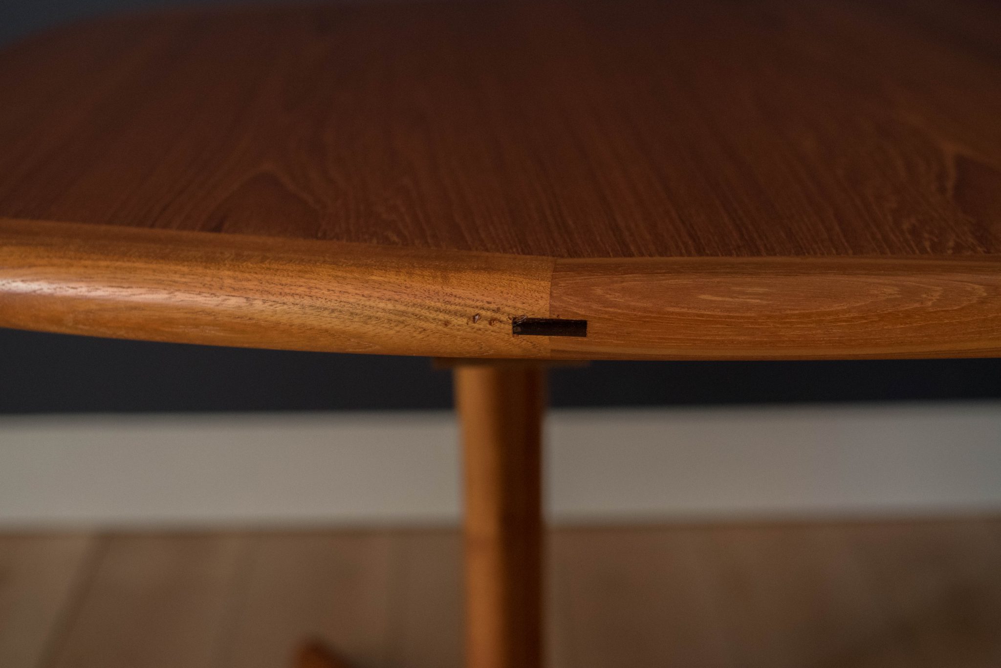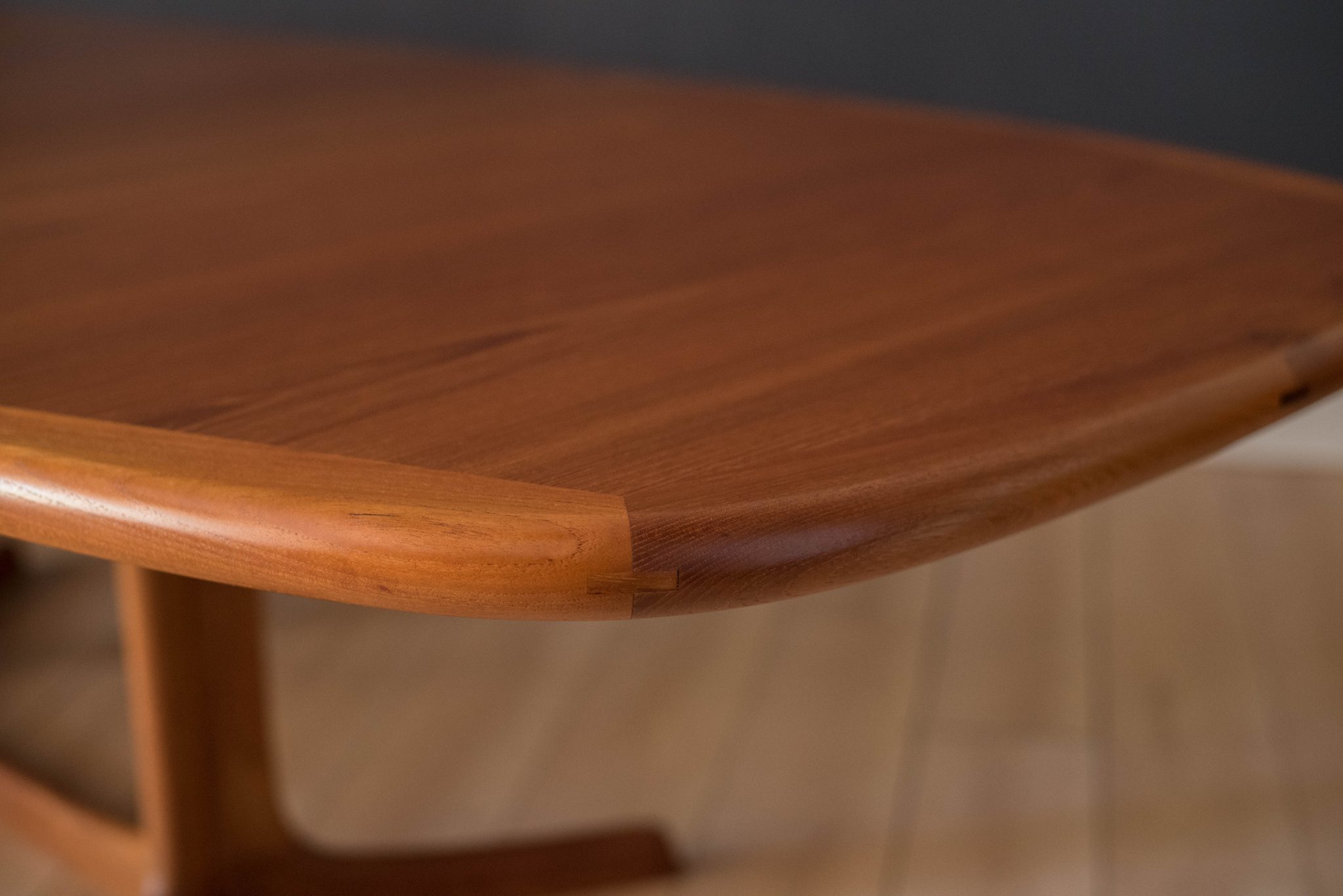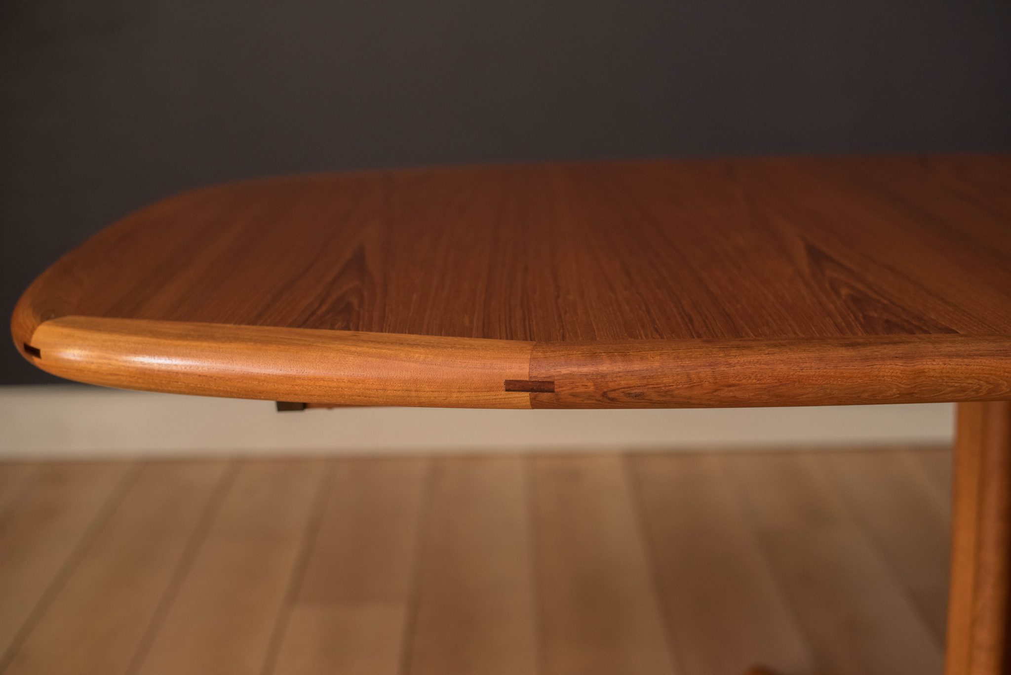 Mid-Century Modern round oval dining table in teak with rosewood accents by Rasmus. This piece features a convenient double pedestal style base that allow chairs to easily tuck in and seat up to 10 guests comfortably. Includes two extendable leaves that cleverly store underneath the table top.