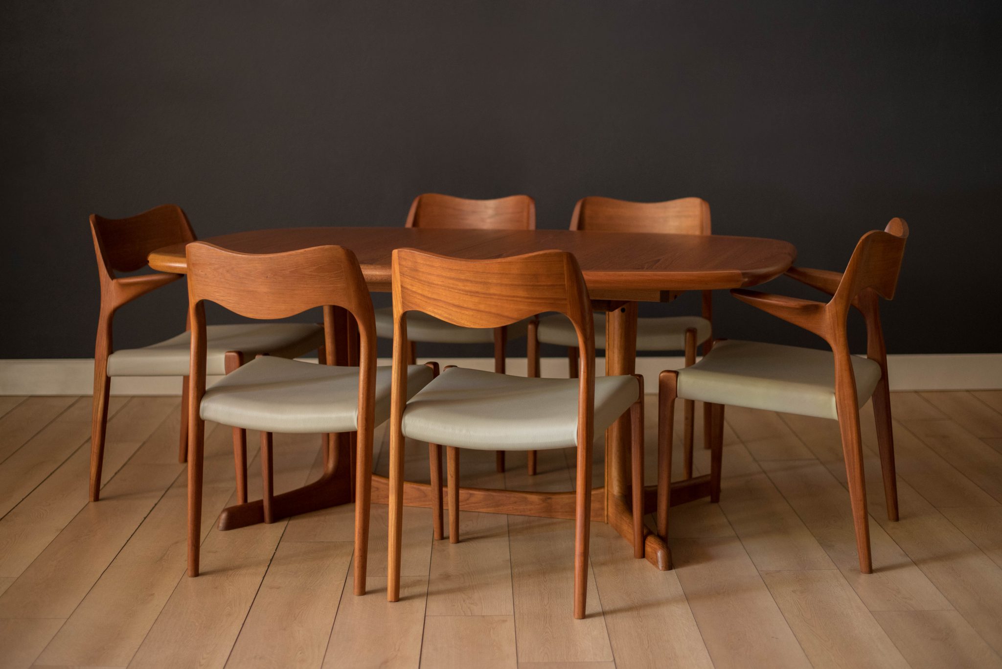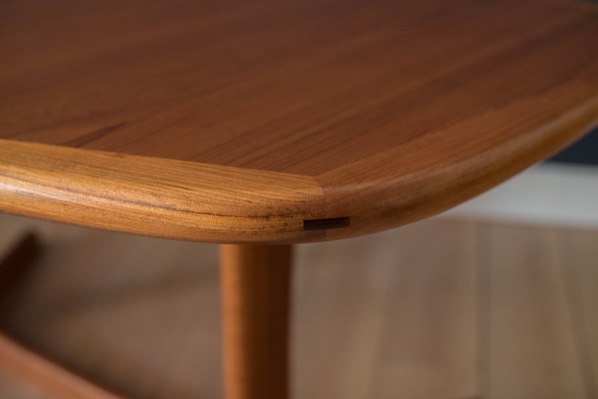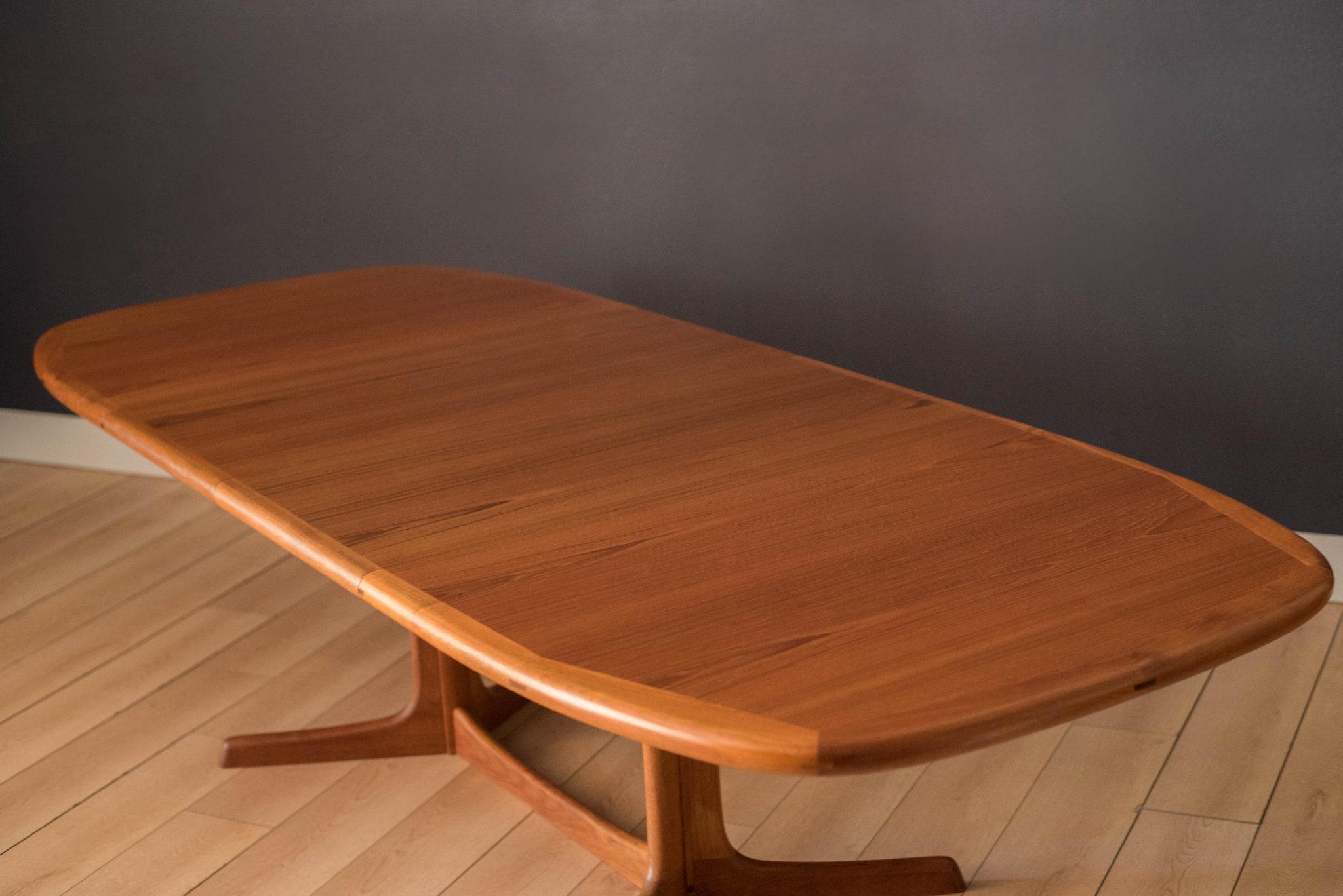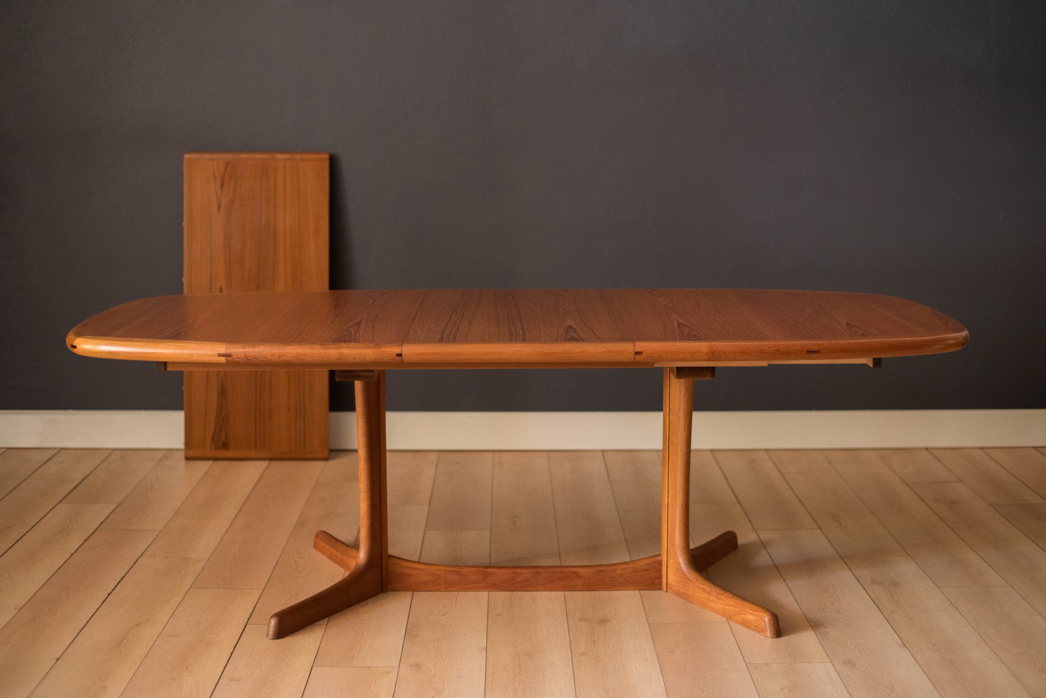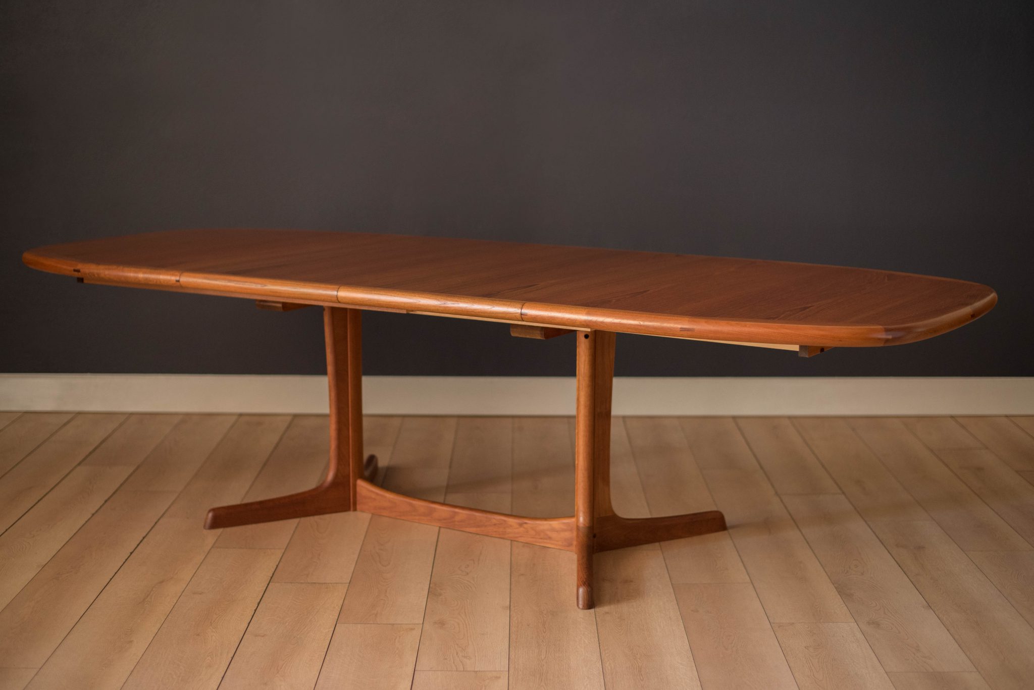Mid-Century Modern round oval dining table in teak with rosewood accents by Rasmus. This piece features a convenient double pedestal style base that allow chairs to easily tuck in and seat up to 10 guests comfortably. Includes two extendable leaves that cleverly store underneath the table top.