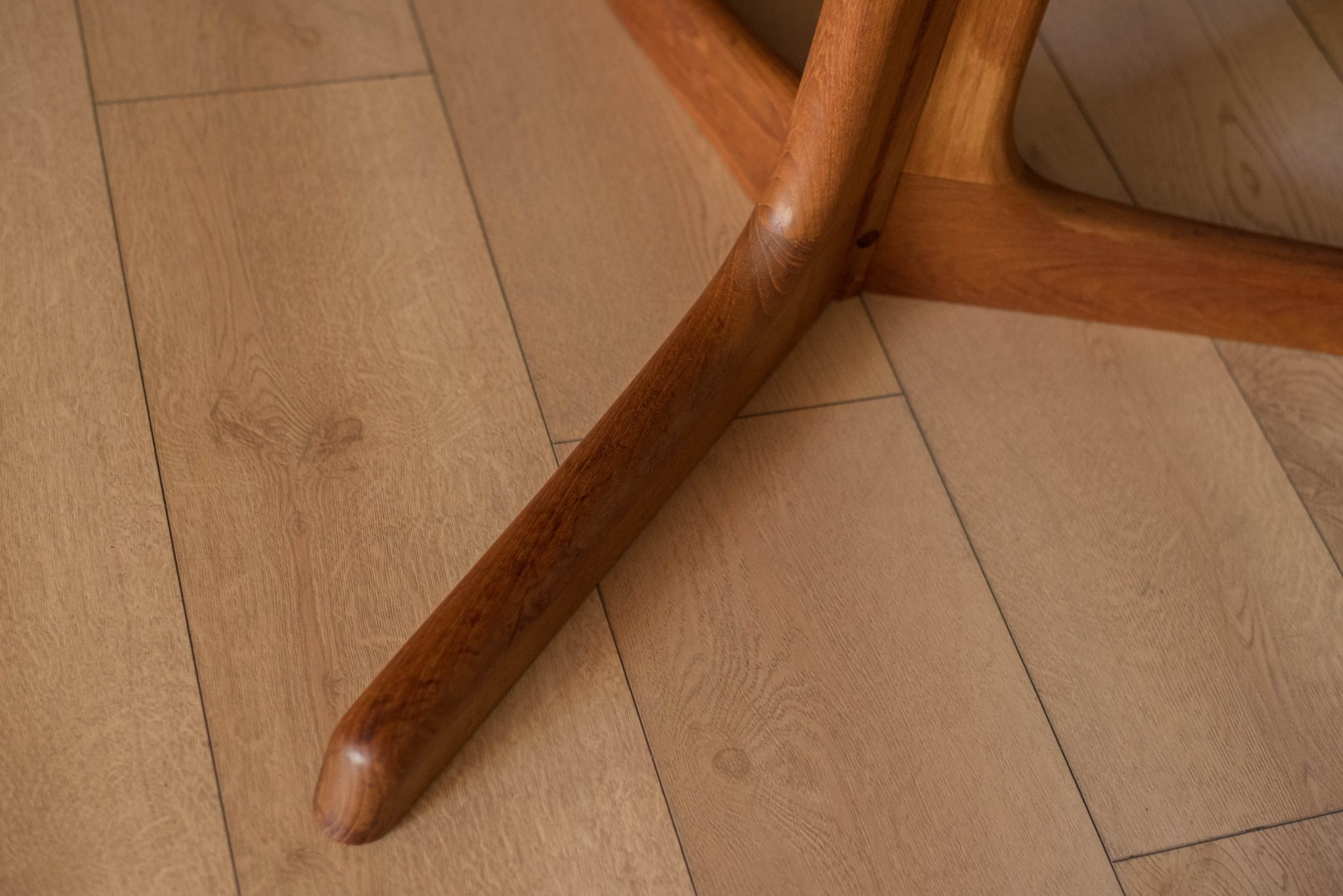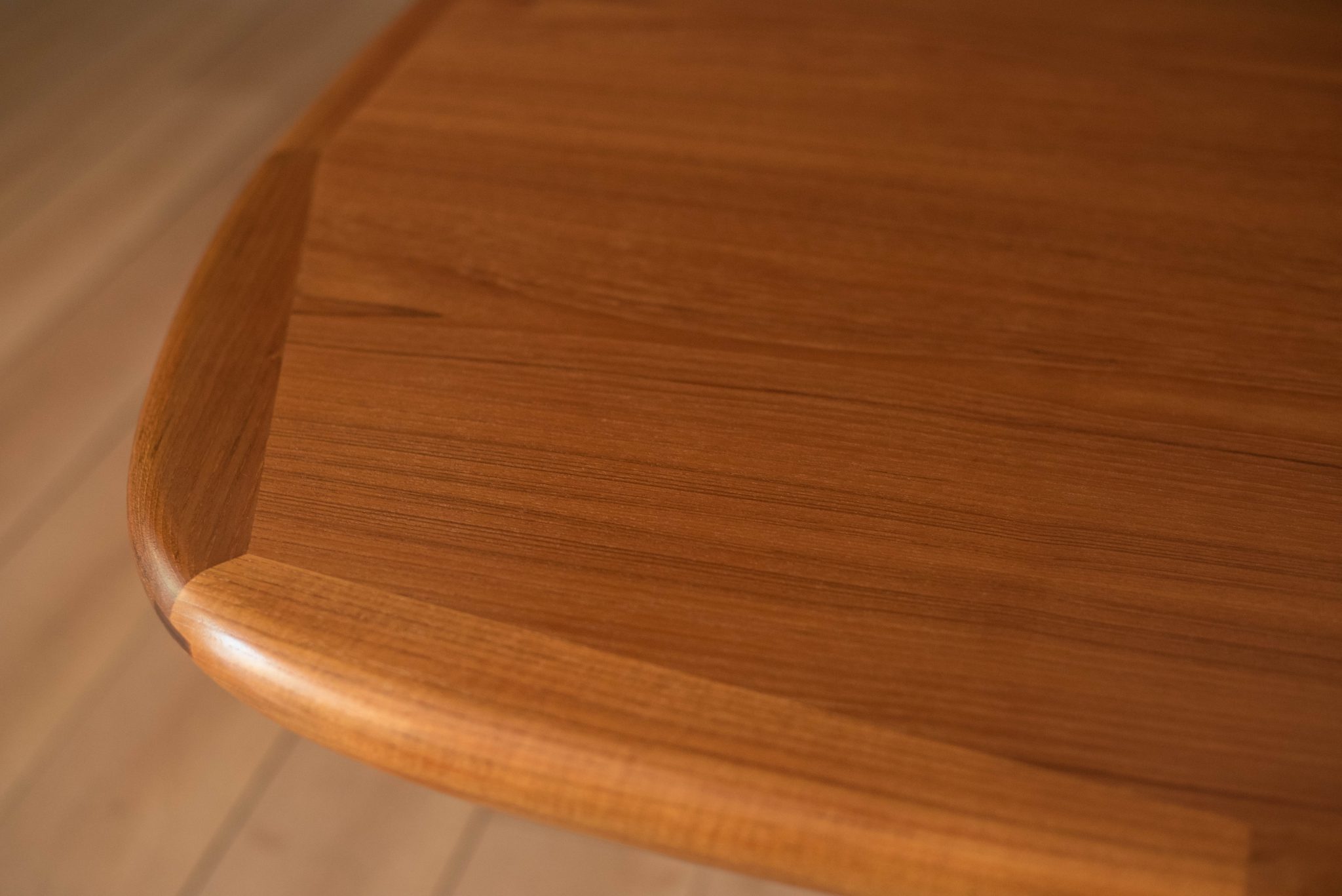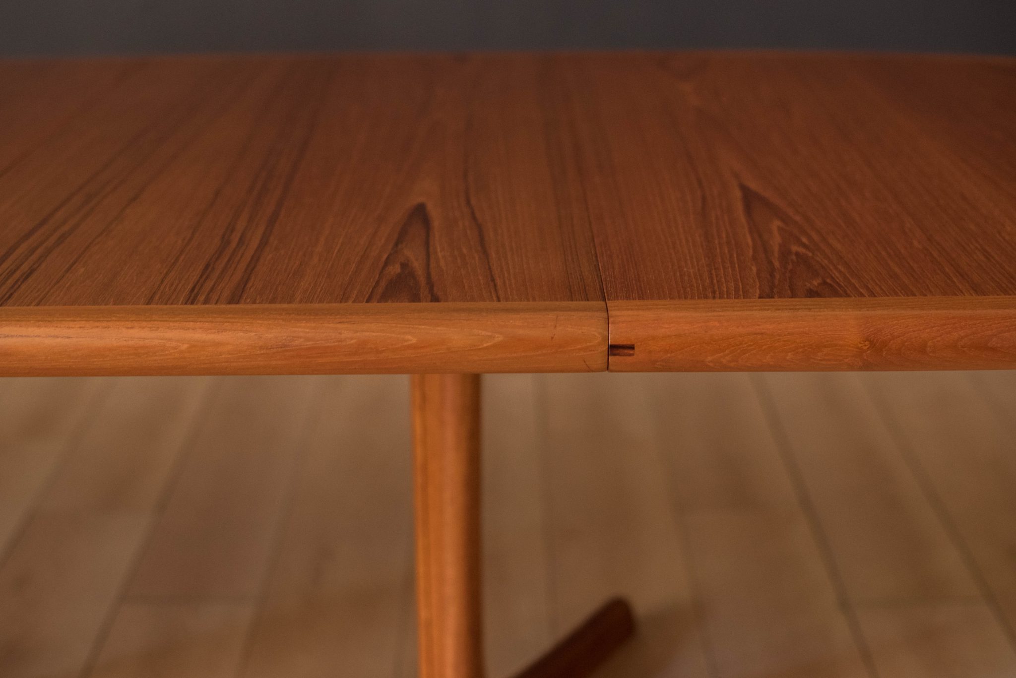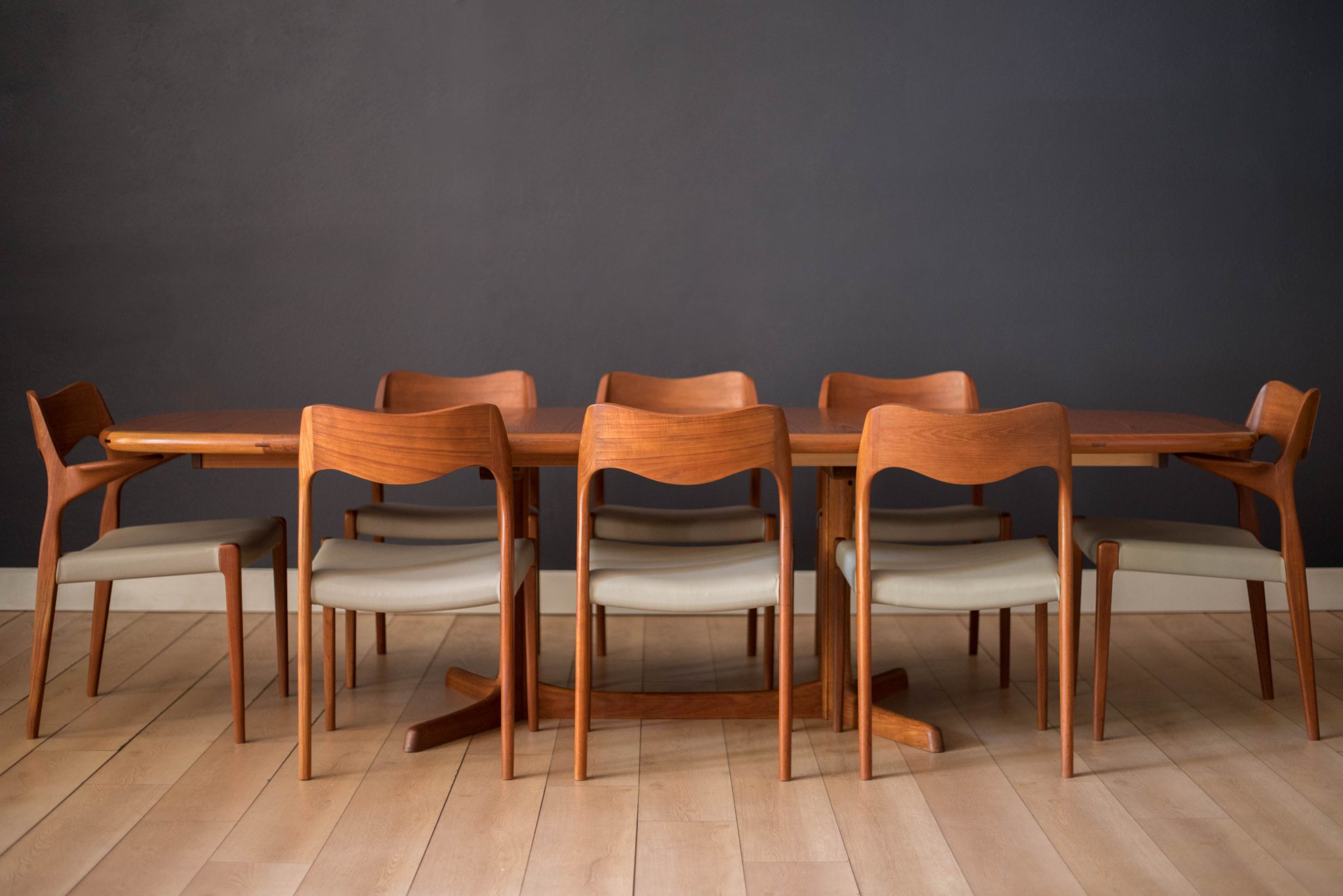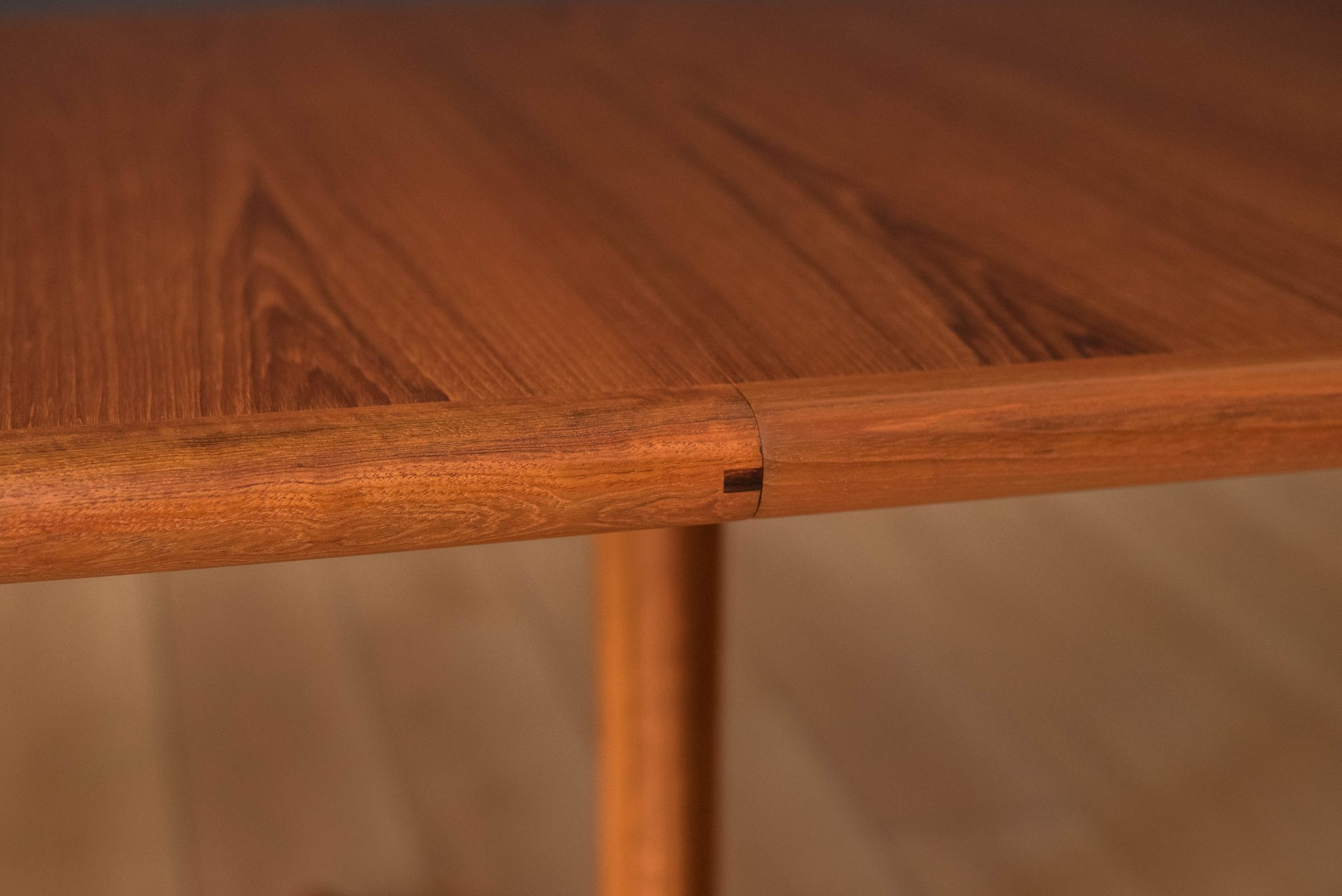 Mid-Century Modern round oval dining table in teak with rosewood accents by Rasmus. This piece features a convenient double pedestal style base that allow chairs to easily tuck in and seat up to 10 guests comfortably. Includes two extendable leaves that cleverly store underneath the table top.