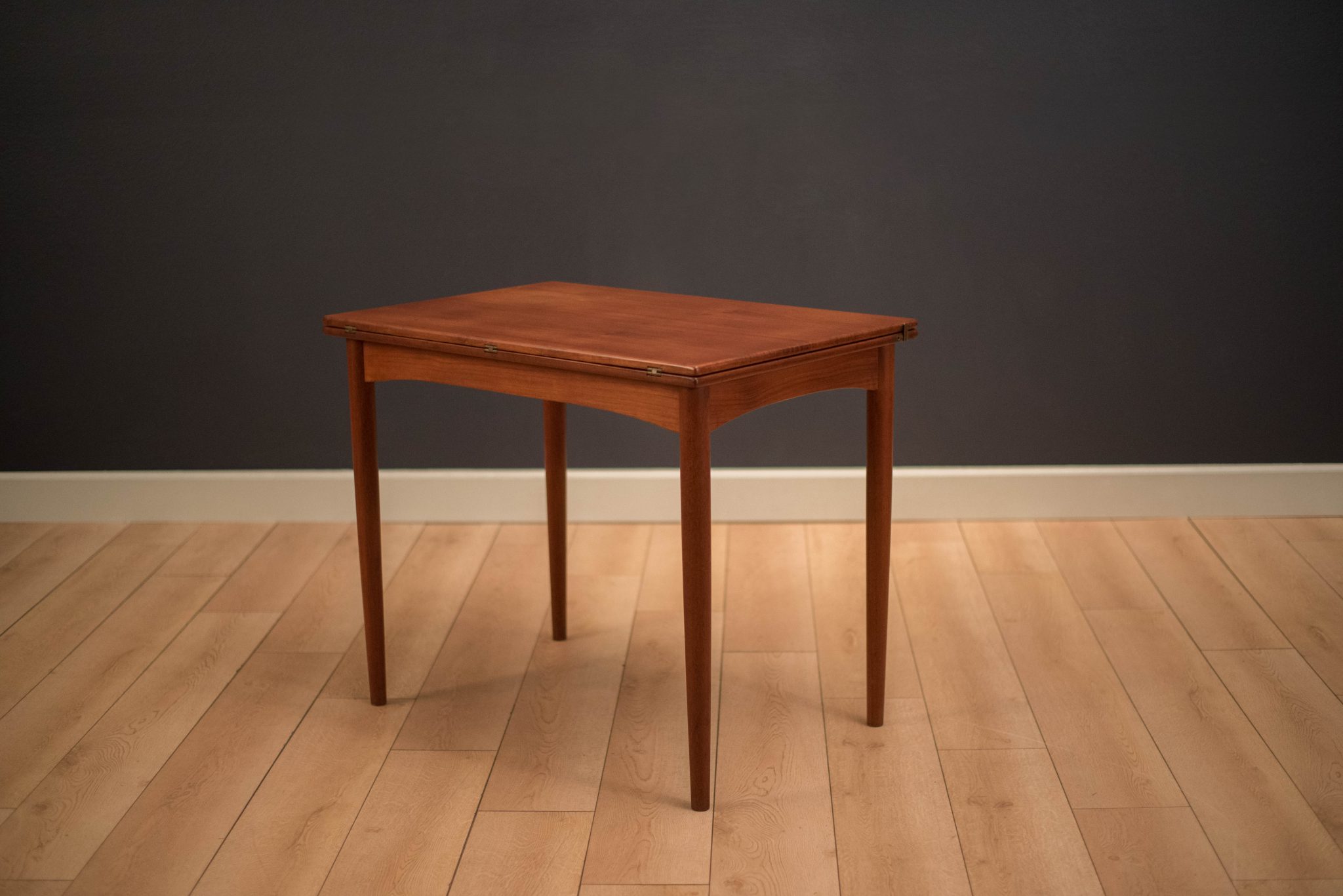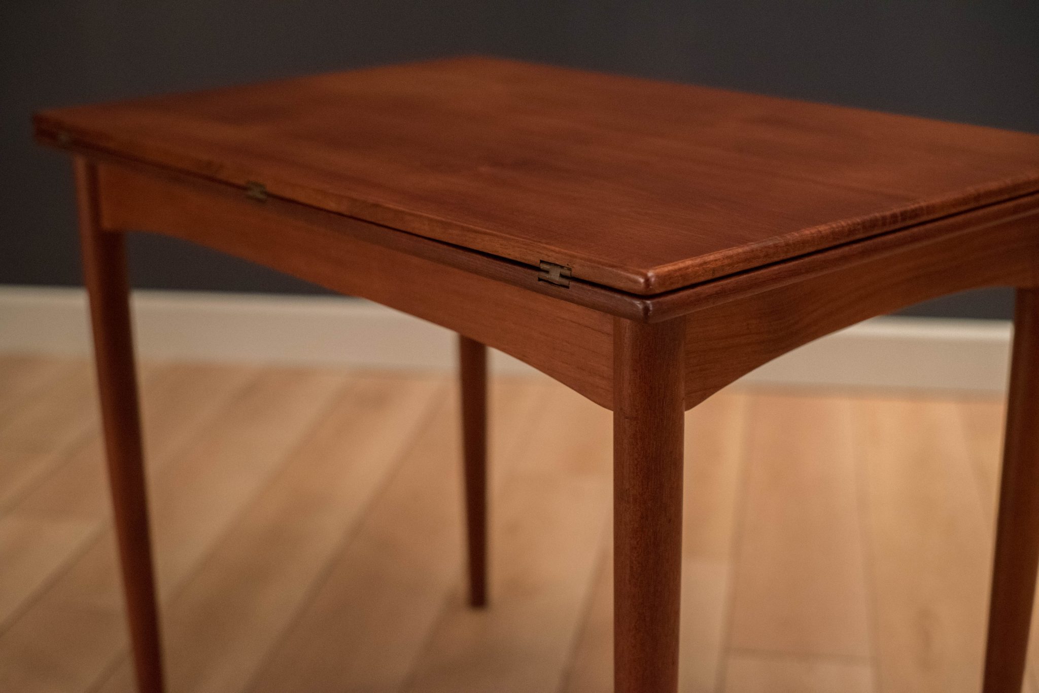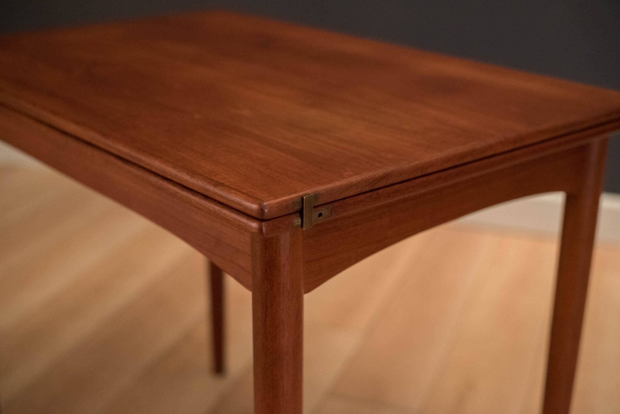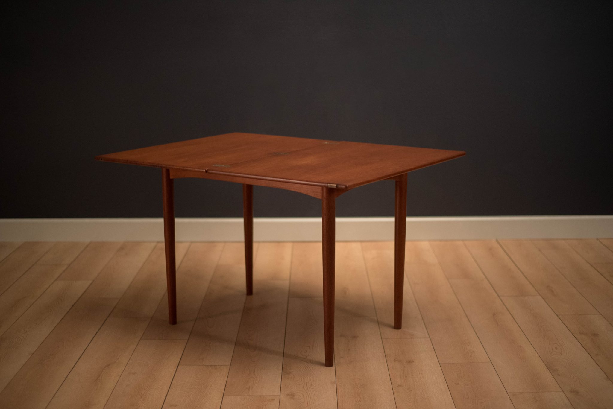 Mid century modern flip top dining table designed by Borge Mogensen for Soborg Mobler. This versatile piece is finished in teak with the designer’s custom brass hardware. Table top folds over to increase the surface area and can seat up to four.