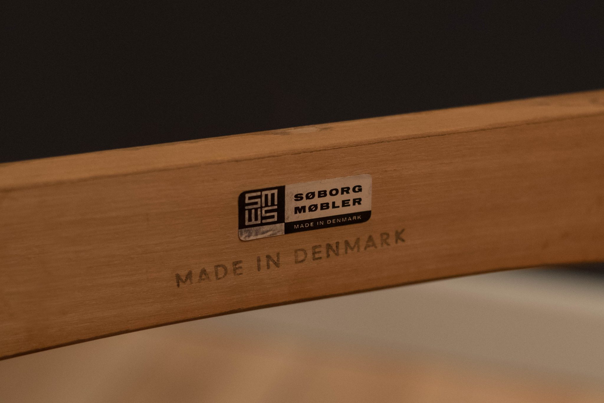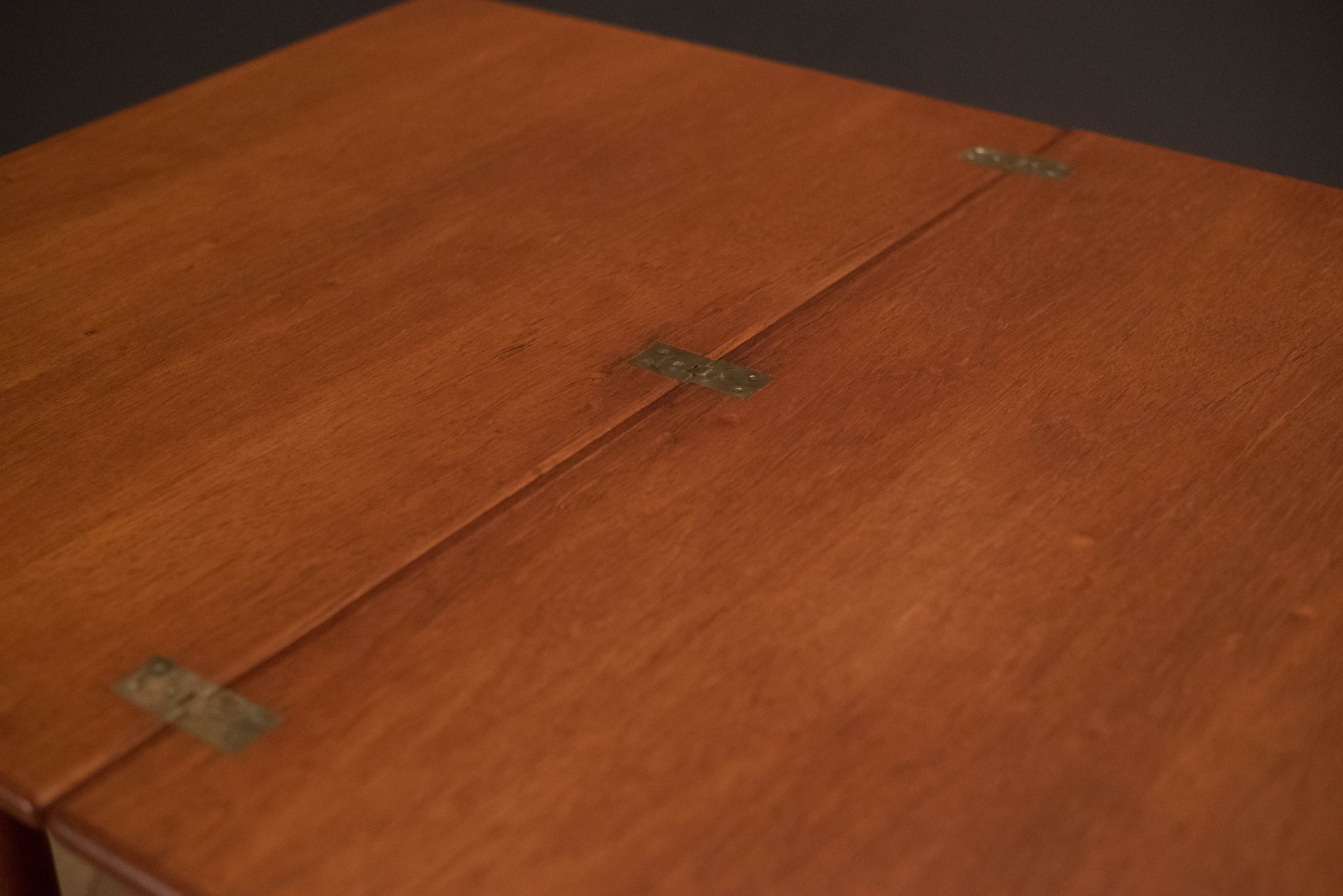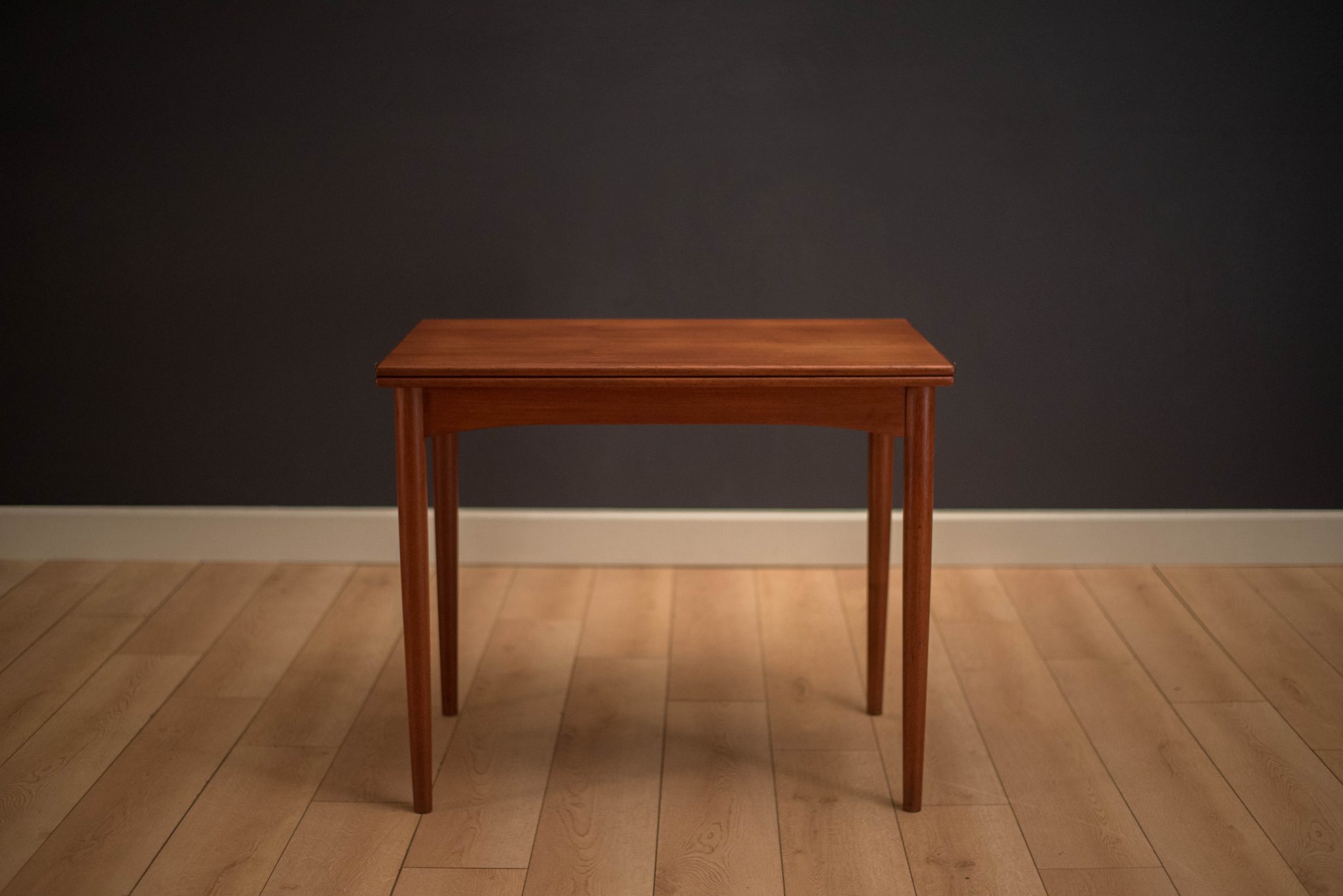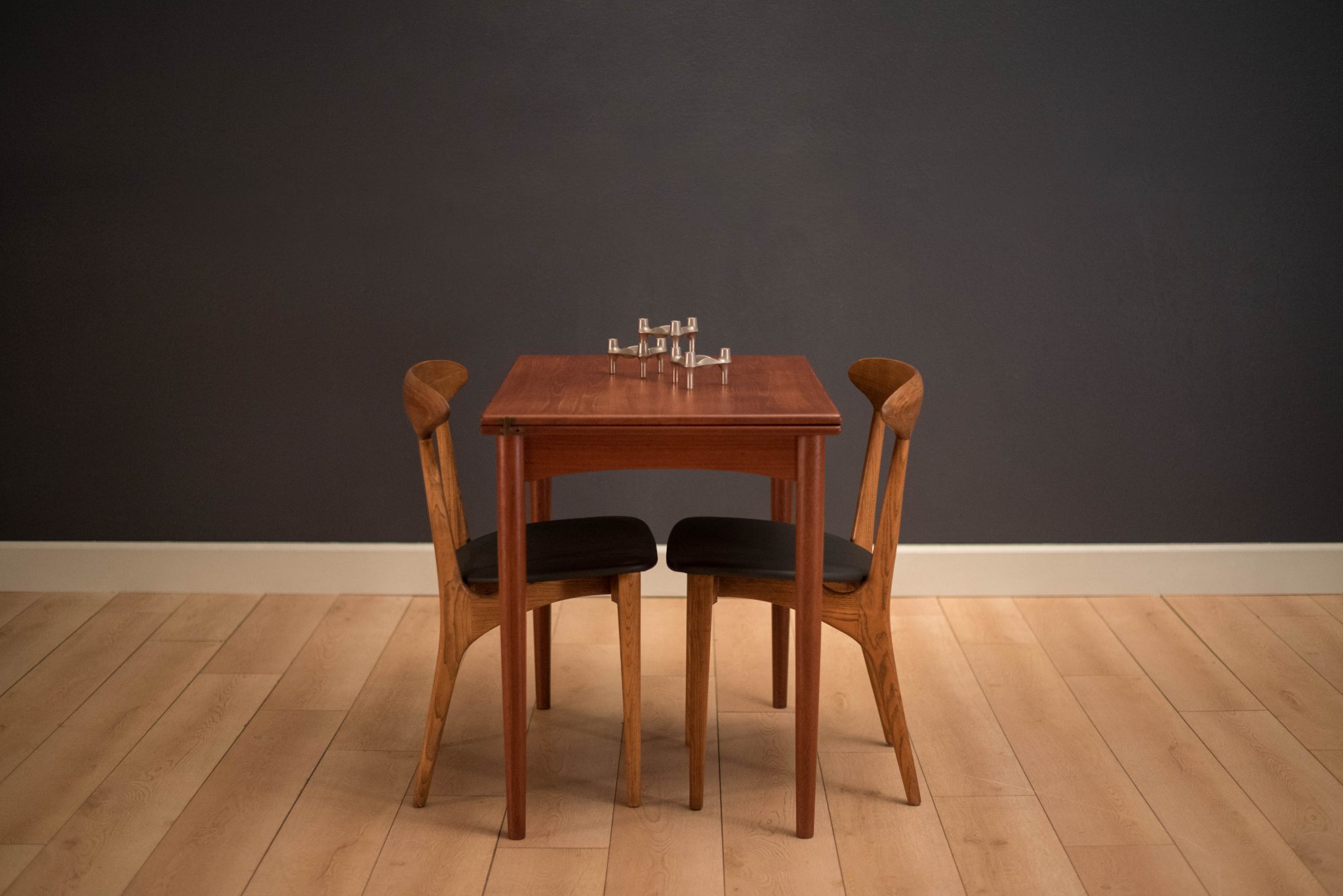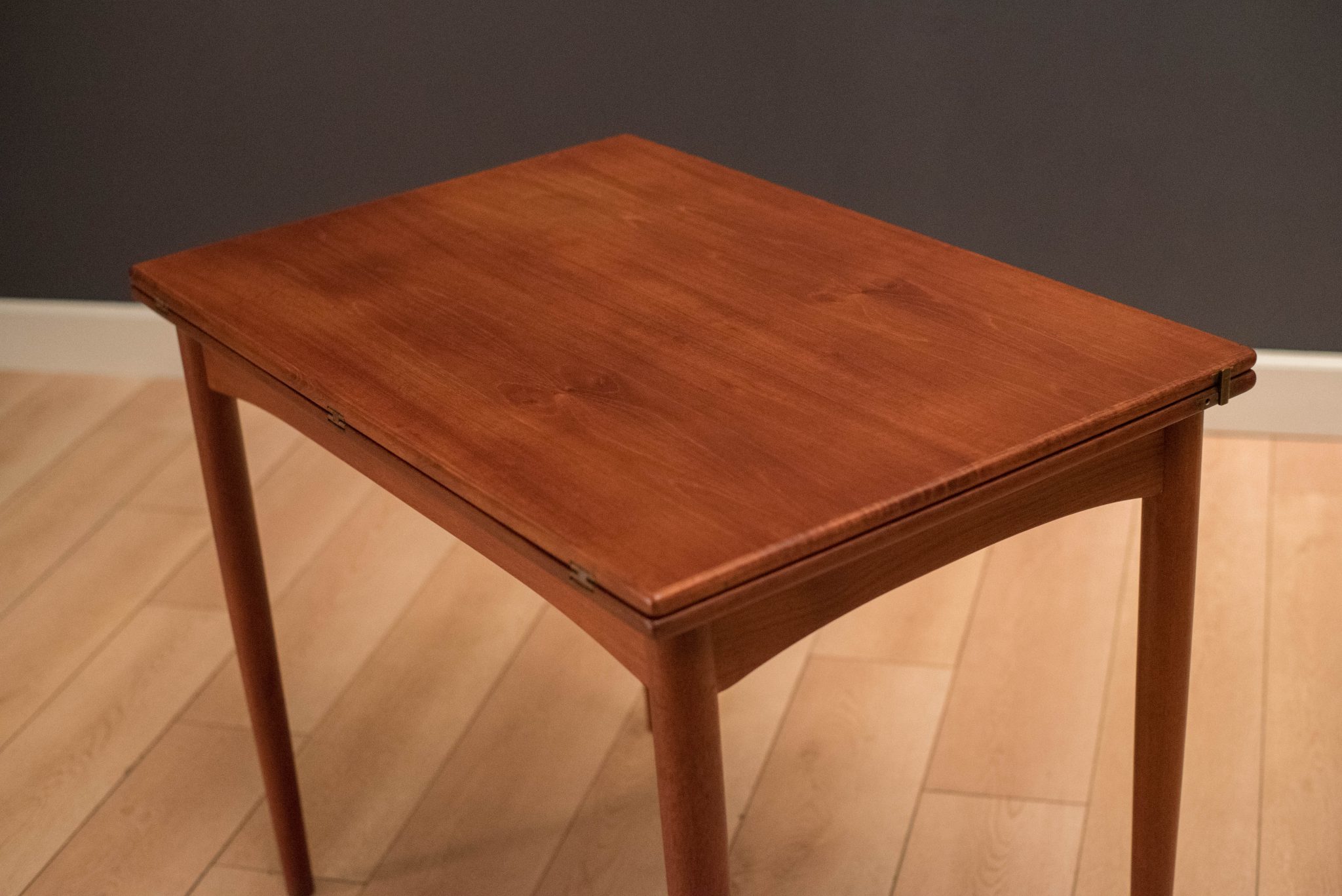 Mid century modern flip top dining table designed by Borge Mogensen for Soborg Mobler. This versatile piece is finished in teak with the designer’s custom brass hardware. Table top folds over to increase the surface area and can seat up to four.