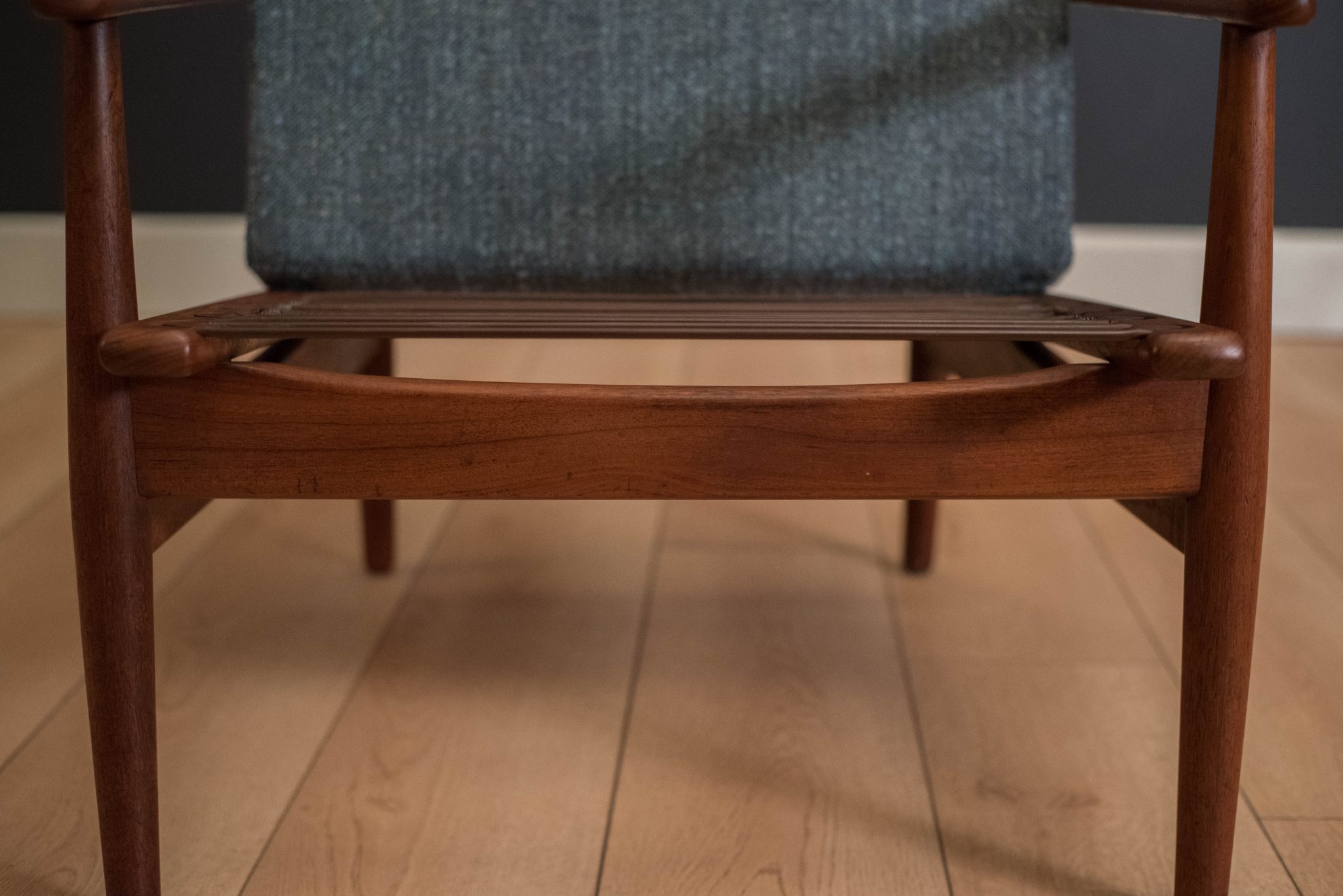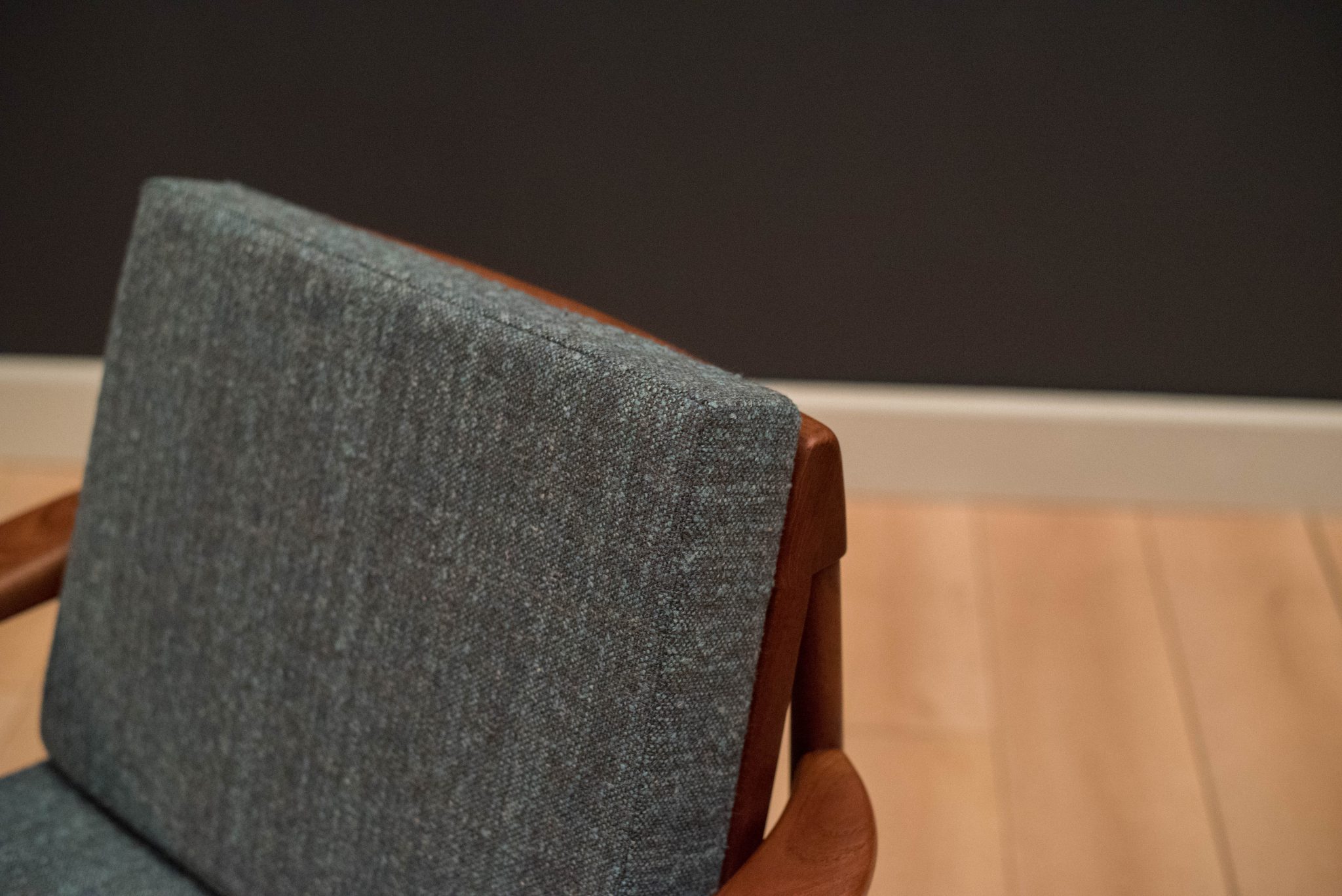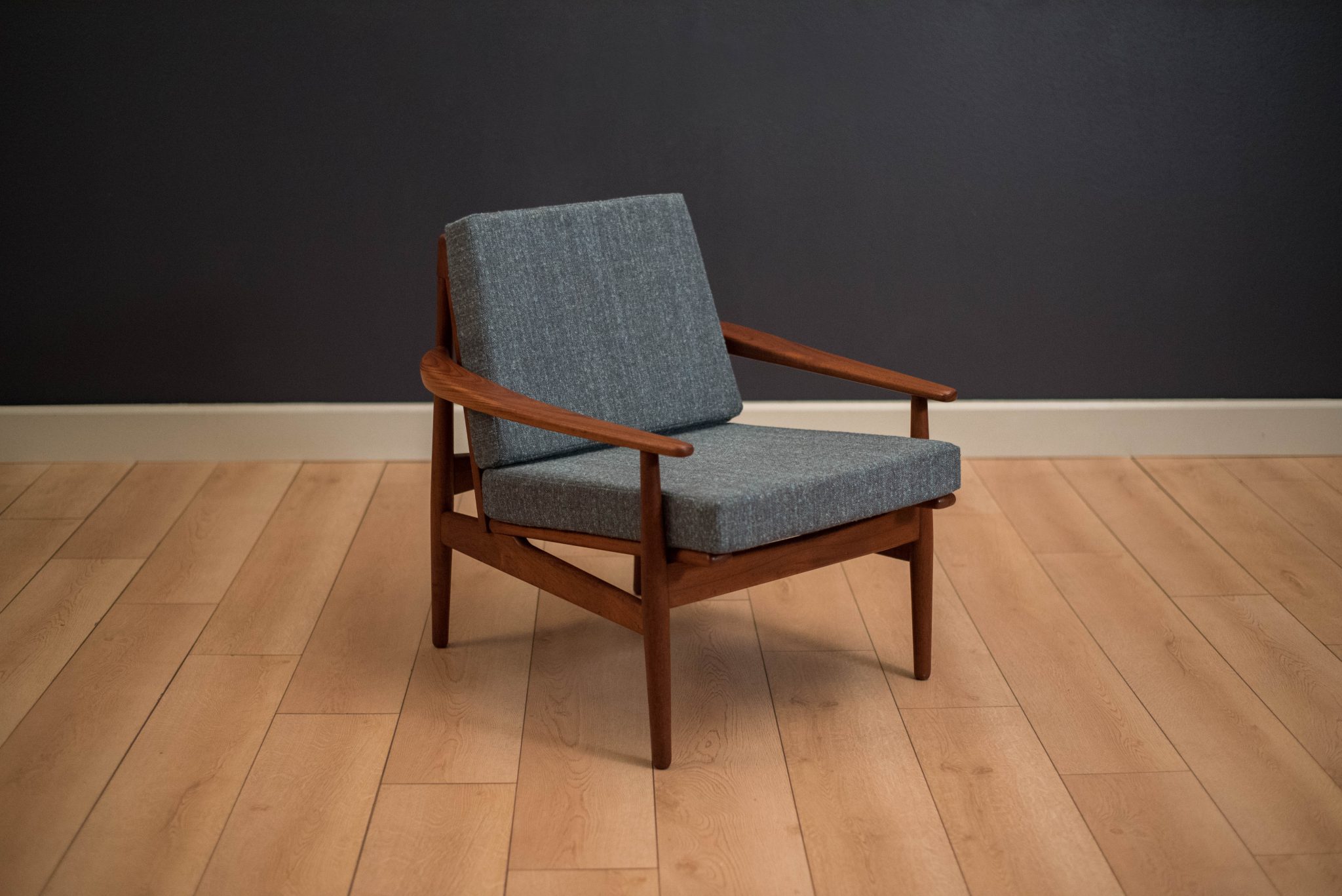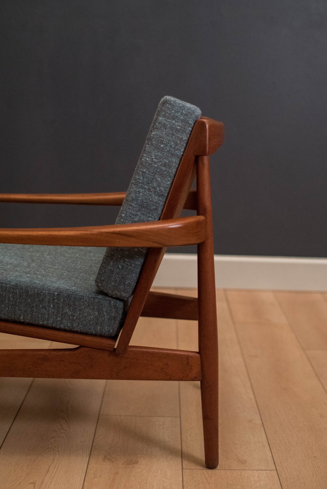 Mid-Century lounge chair by Grete Jalk for Glostrup Møbelfabrik in teak. This piece has a unique angled backrest and has been professionally reupholstered.