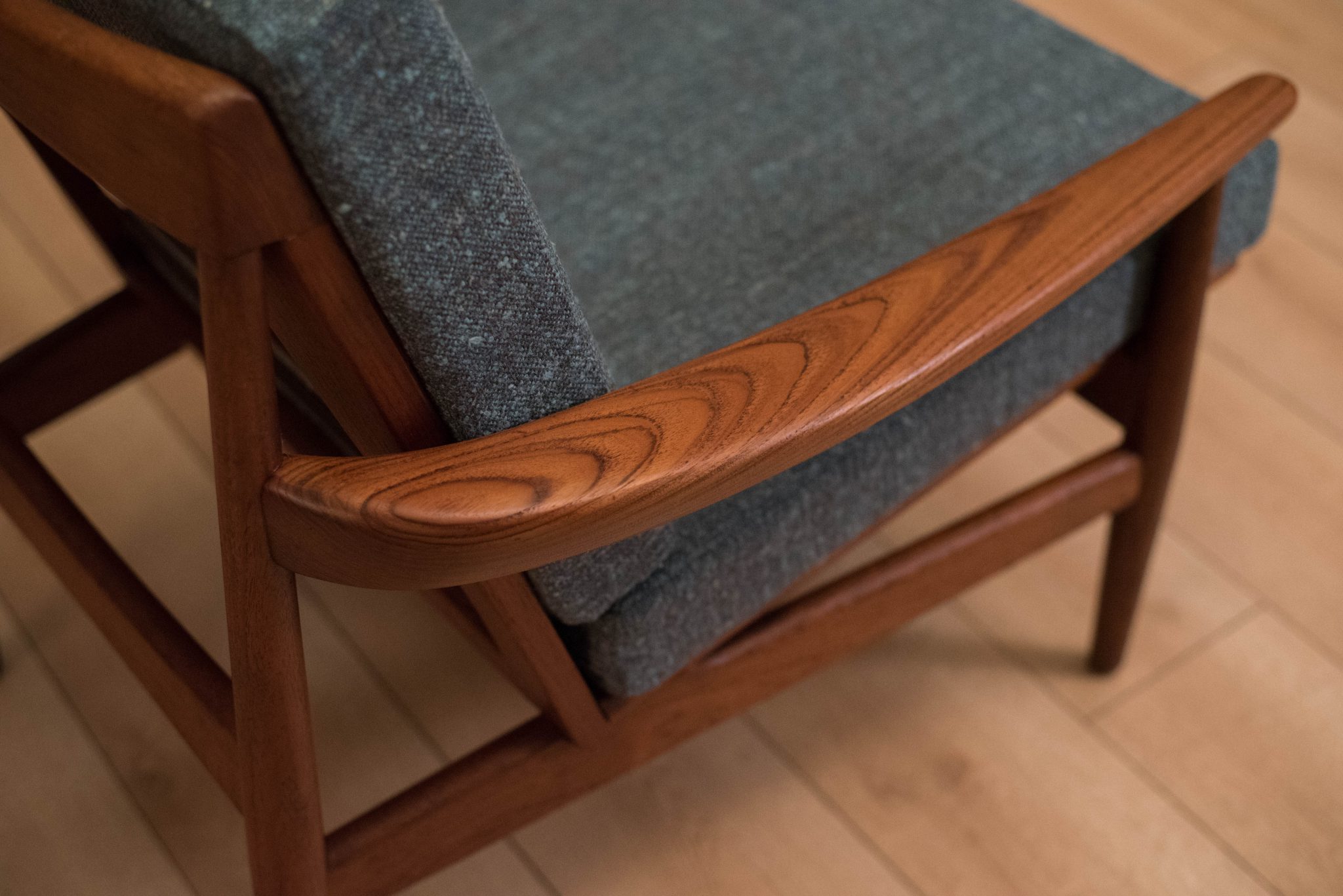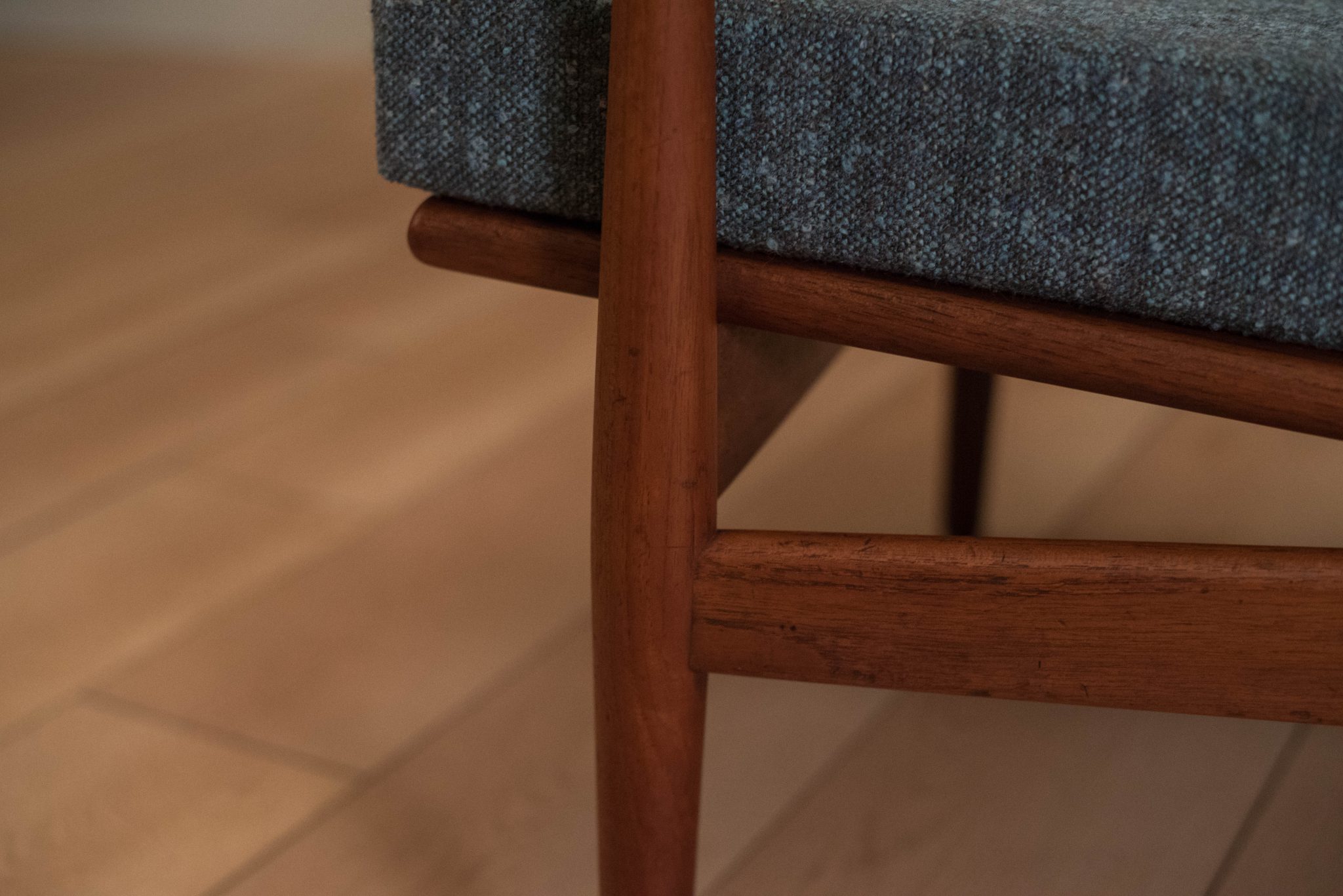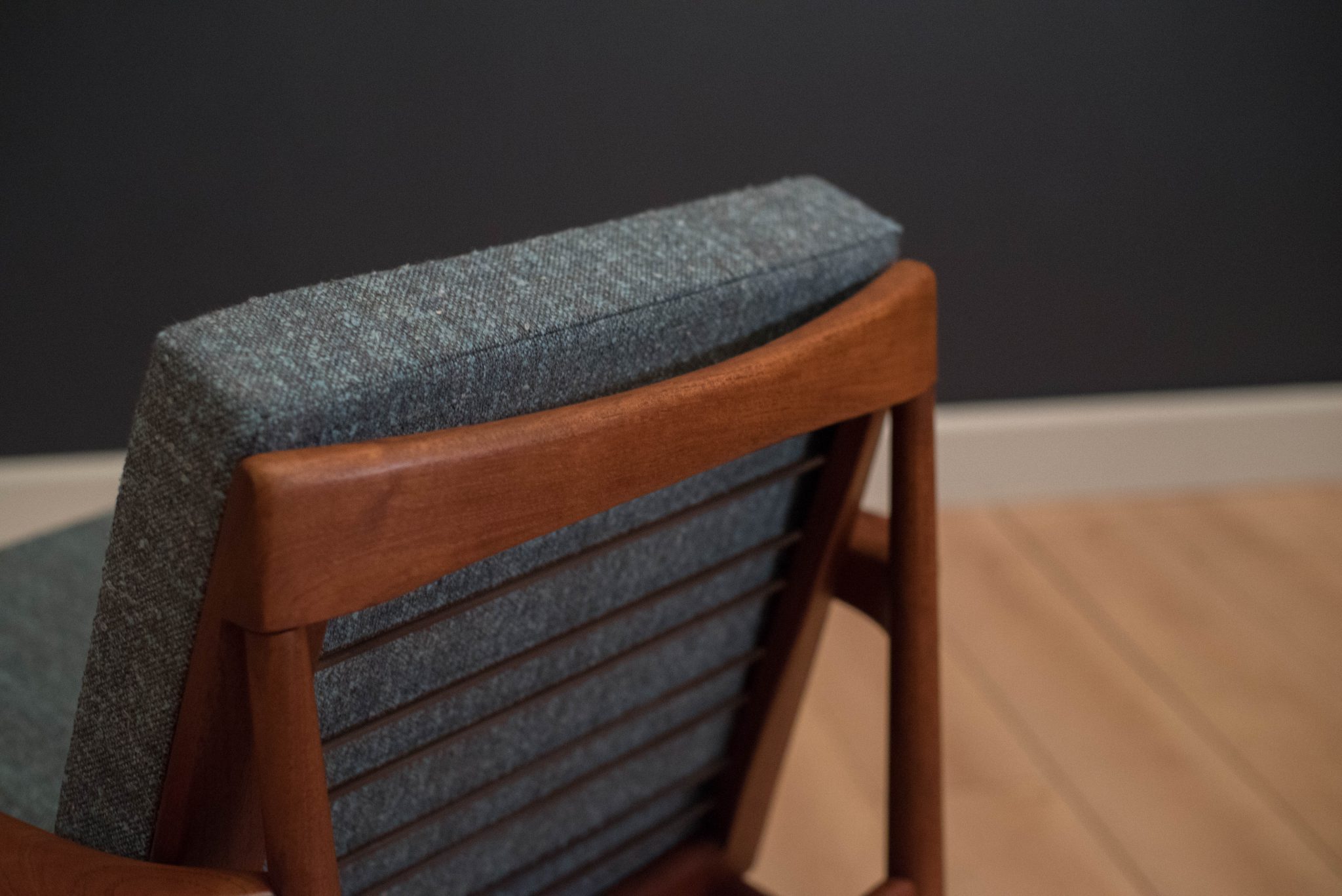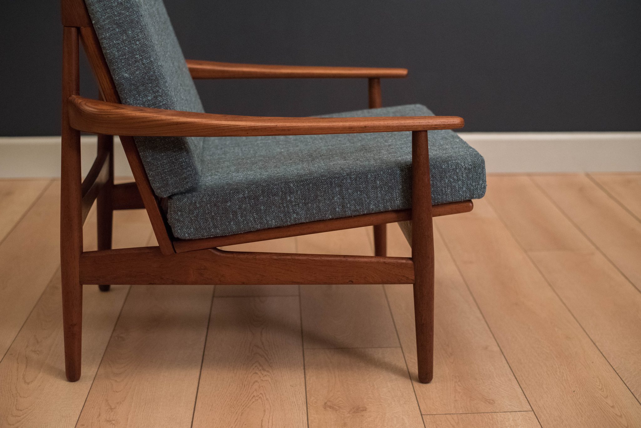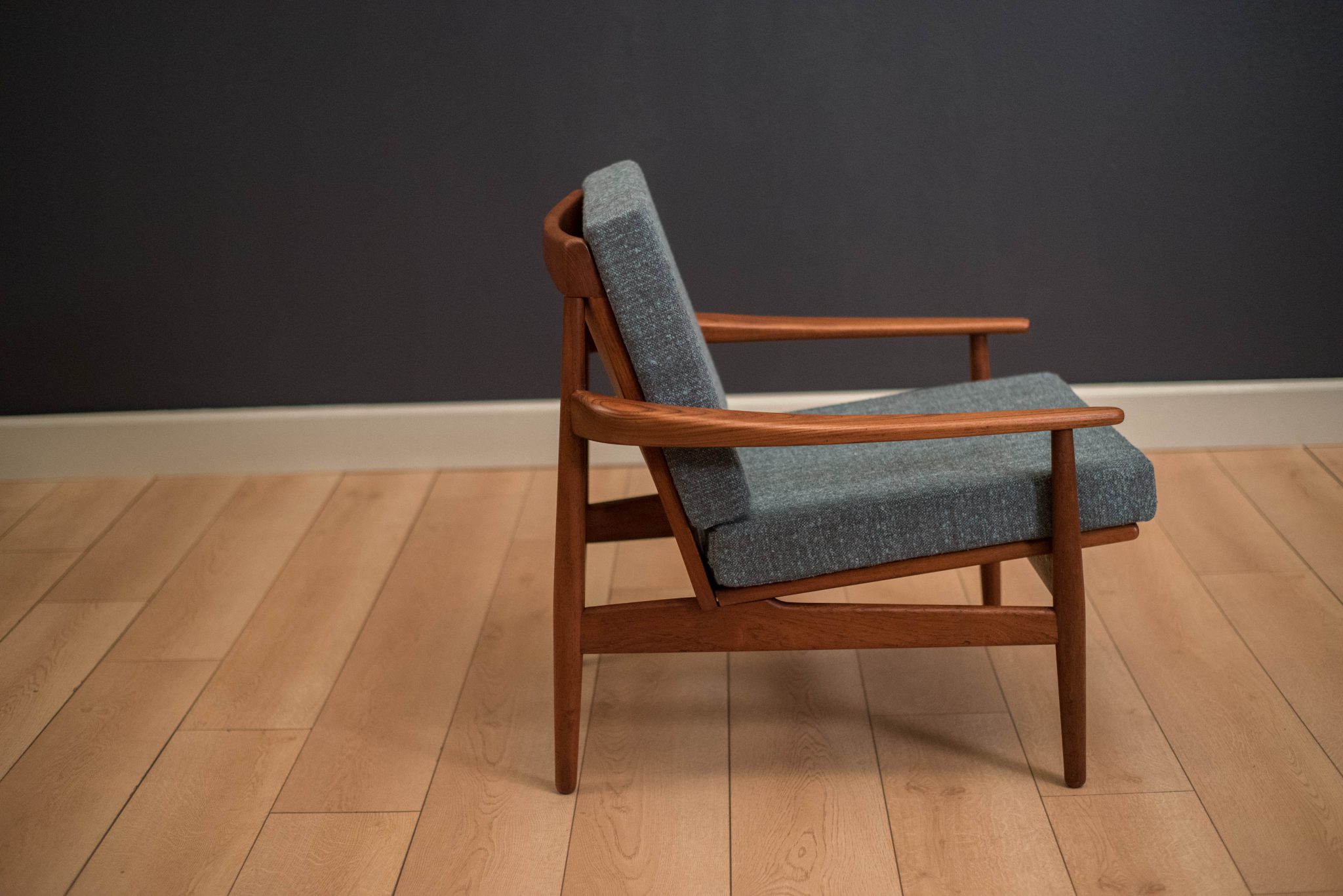 Mid-Century lounge chair by Grete Jalk for Glostrup Møbelfabrik in teak. This piece has a unique angled backrest and has been professionally reupholstered.