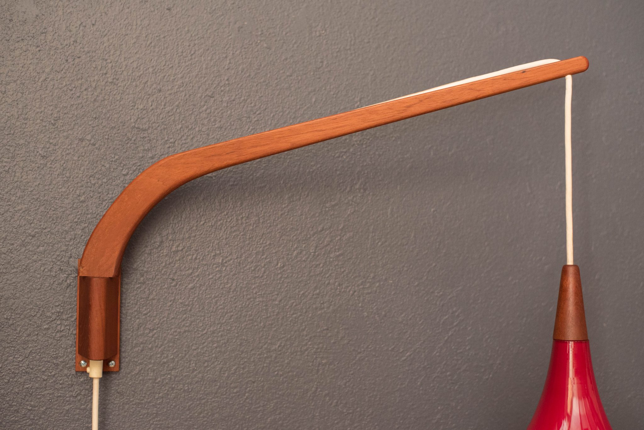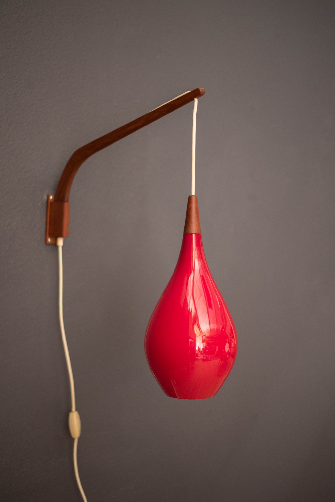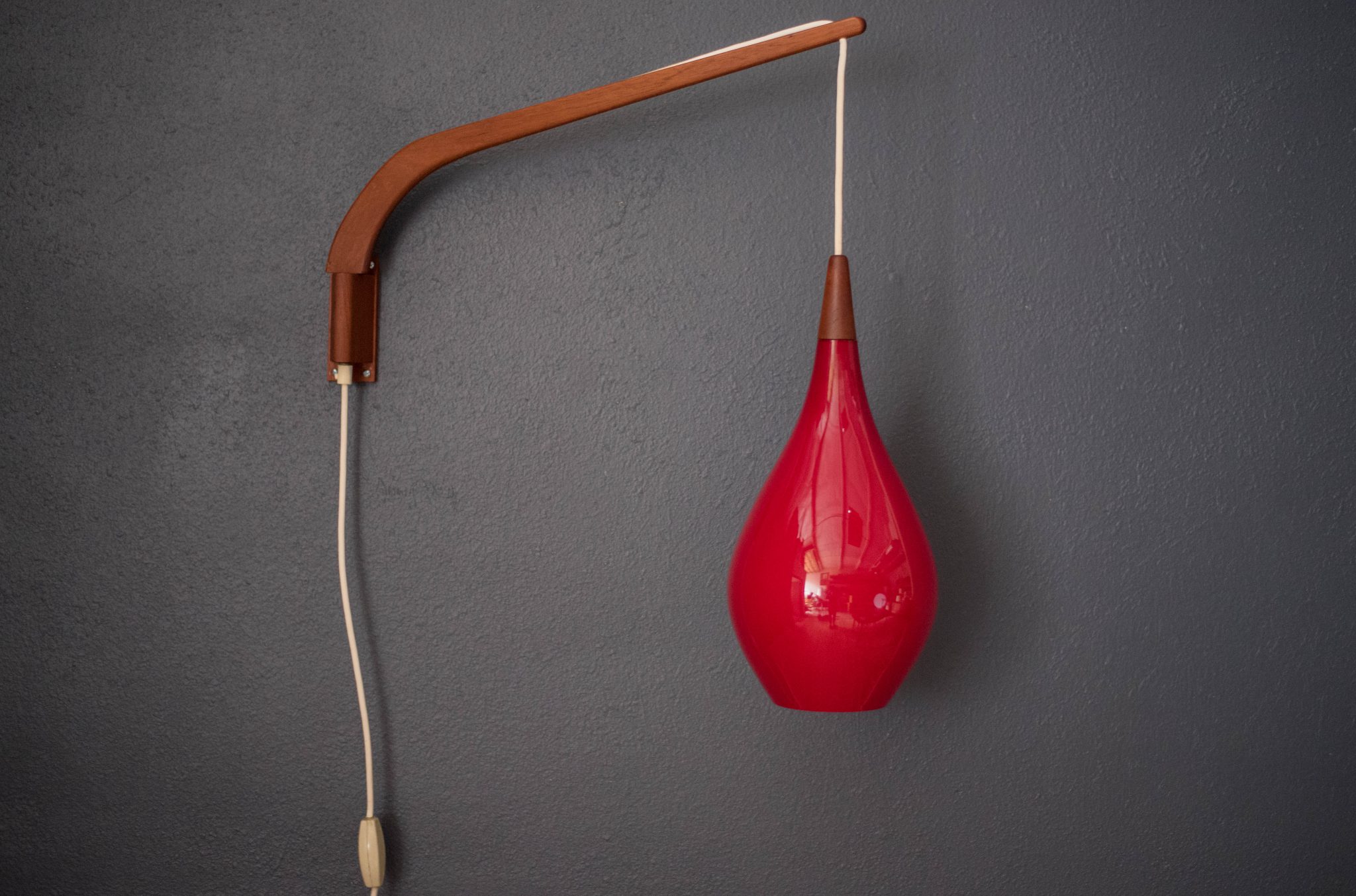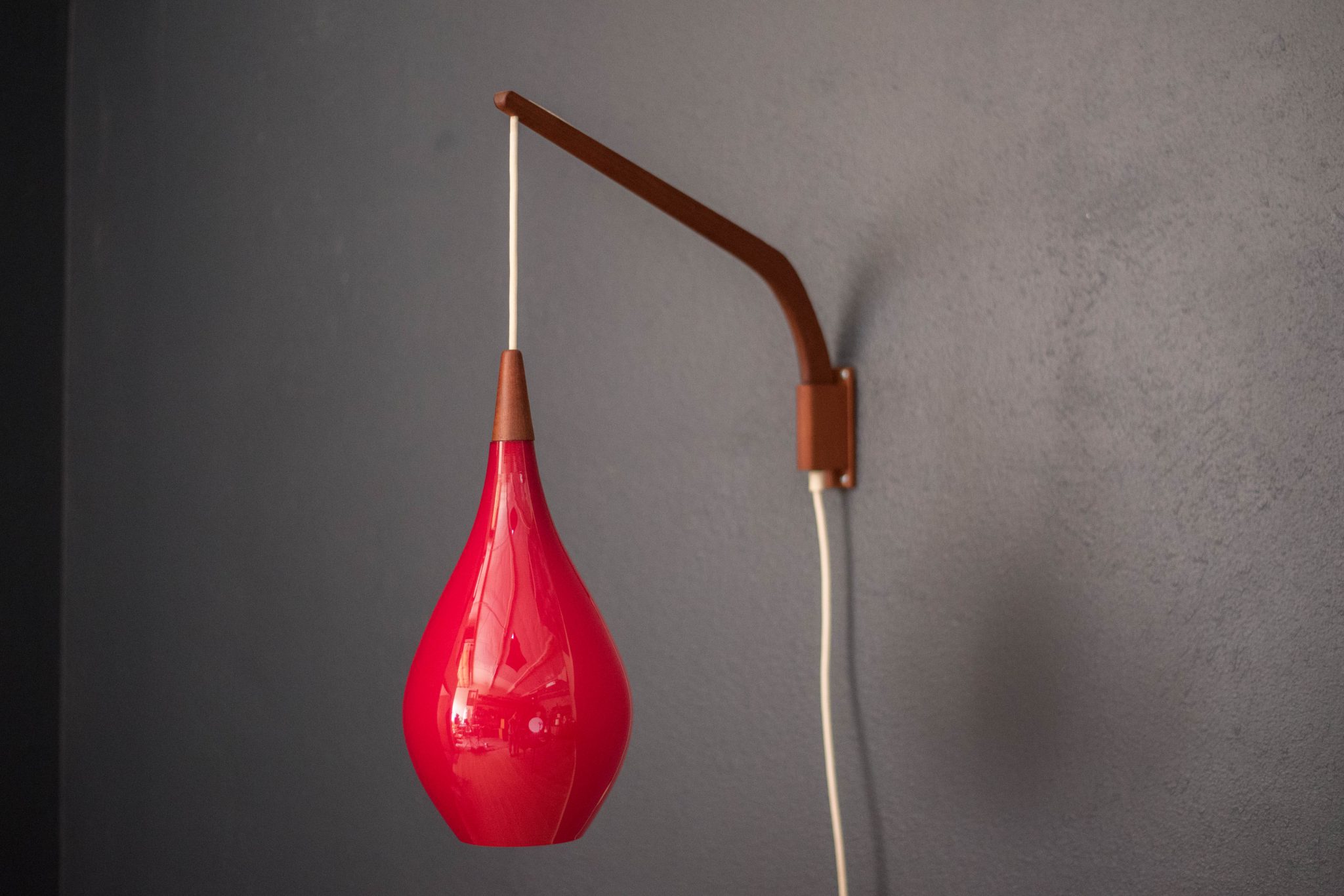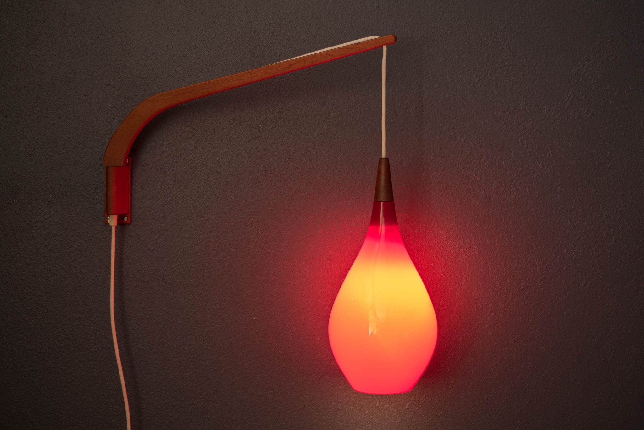Mid-Century Modern hanging wall light by Holmegaard circa 1960’s, Denmark. This piece displays a candy red teardrop glass shade with a frosted white interior. Includes a teak swivel arm with an adjustable cord.