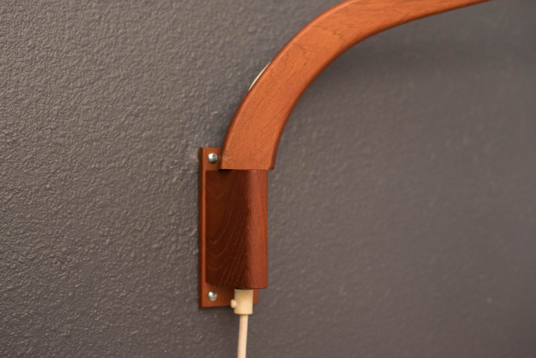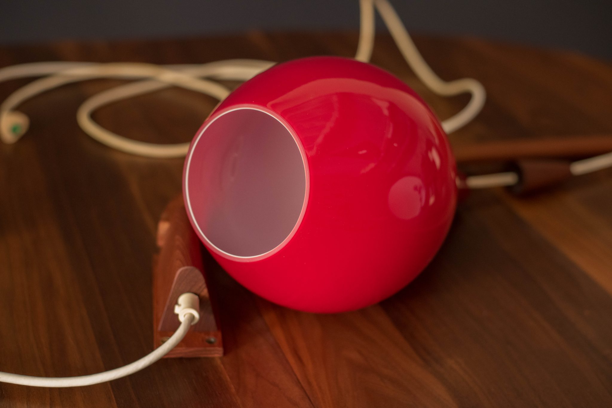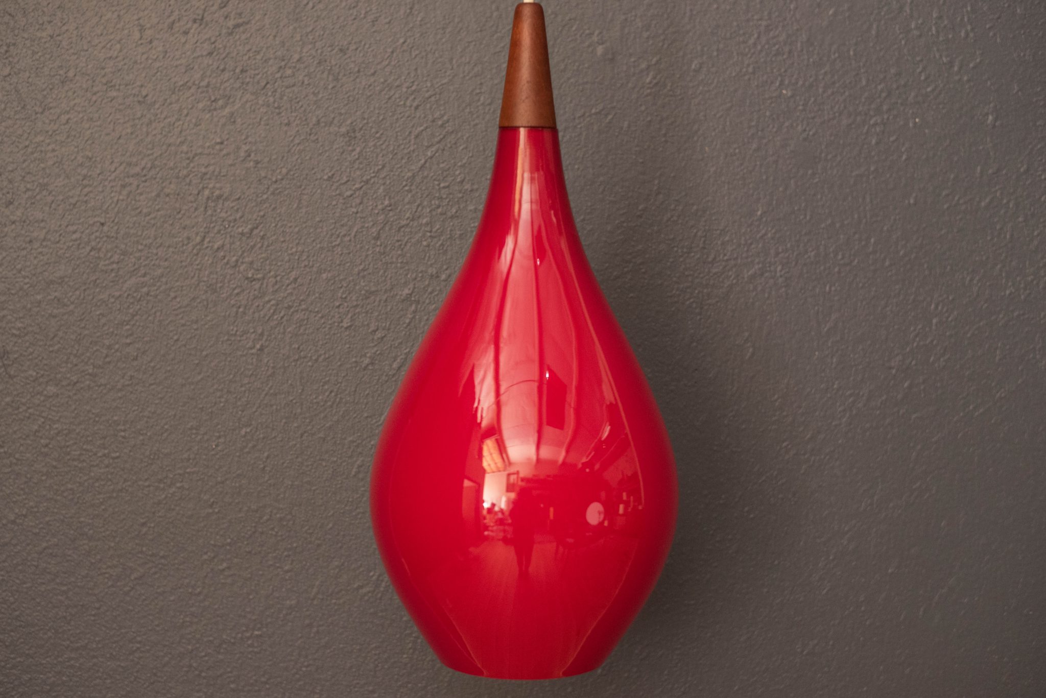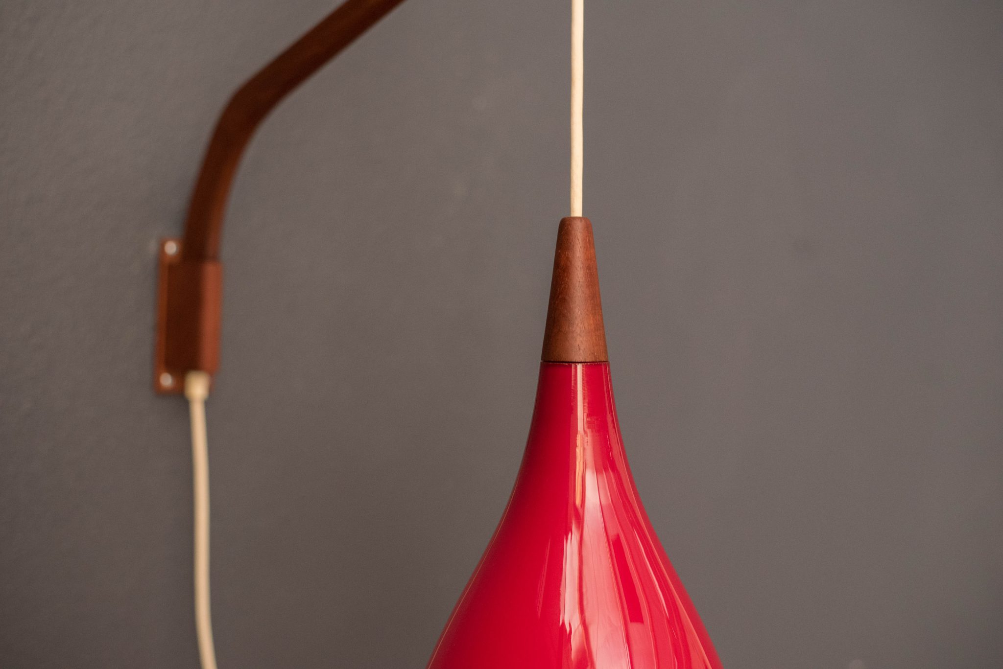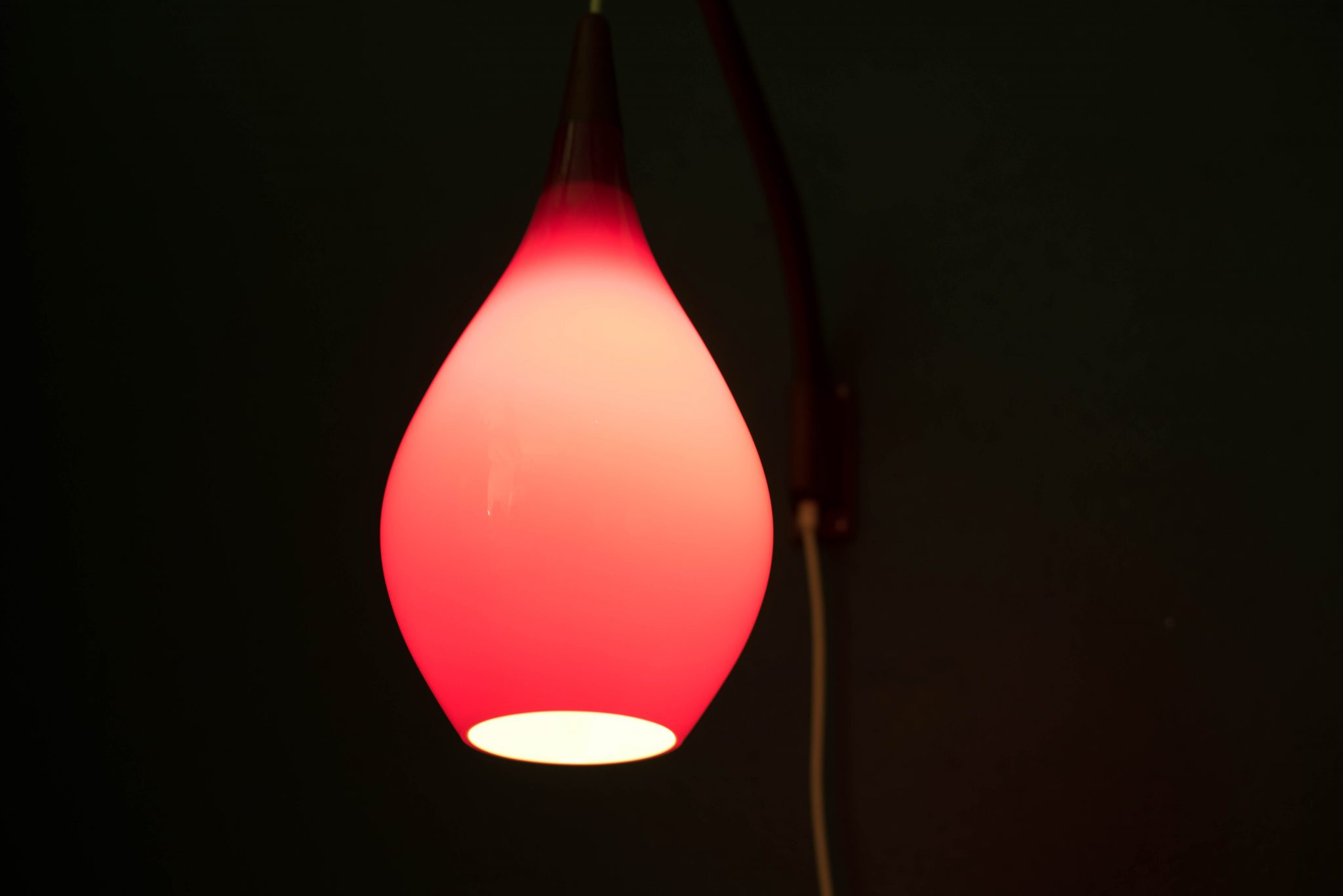Mid-Century Modern hanging wall light by Holmegaard circa 1960’s, Denmark. This piece displays a candy red teardrop glass shade with a frosted white interior. Includes a teak swivel arm with an adjustable cord.