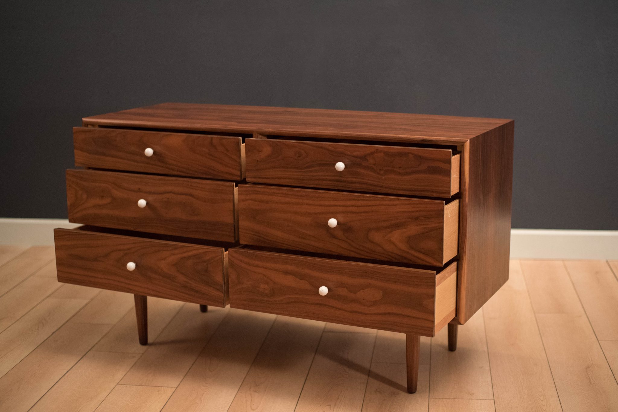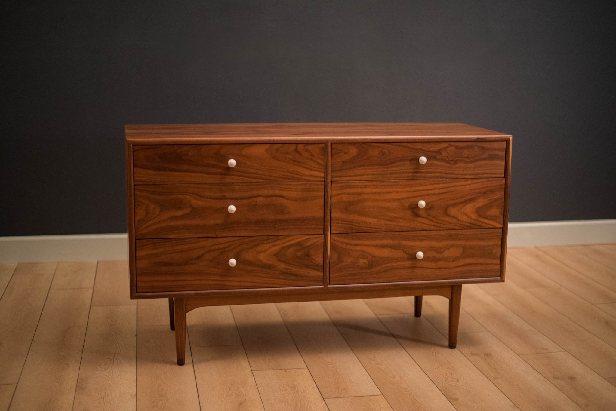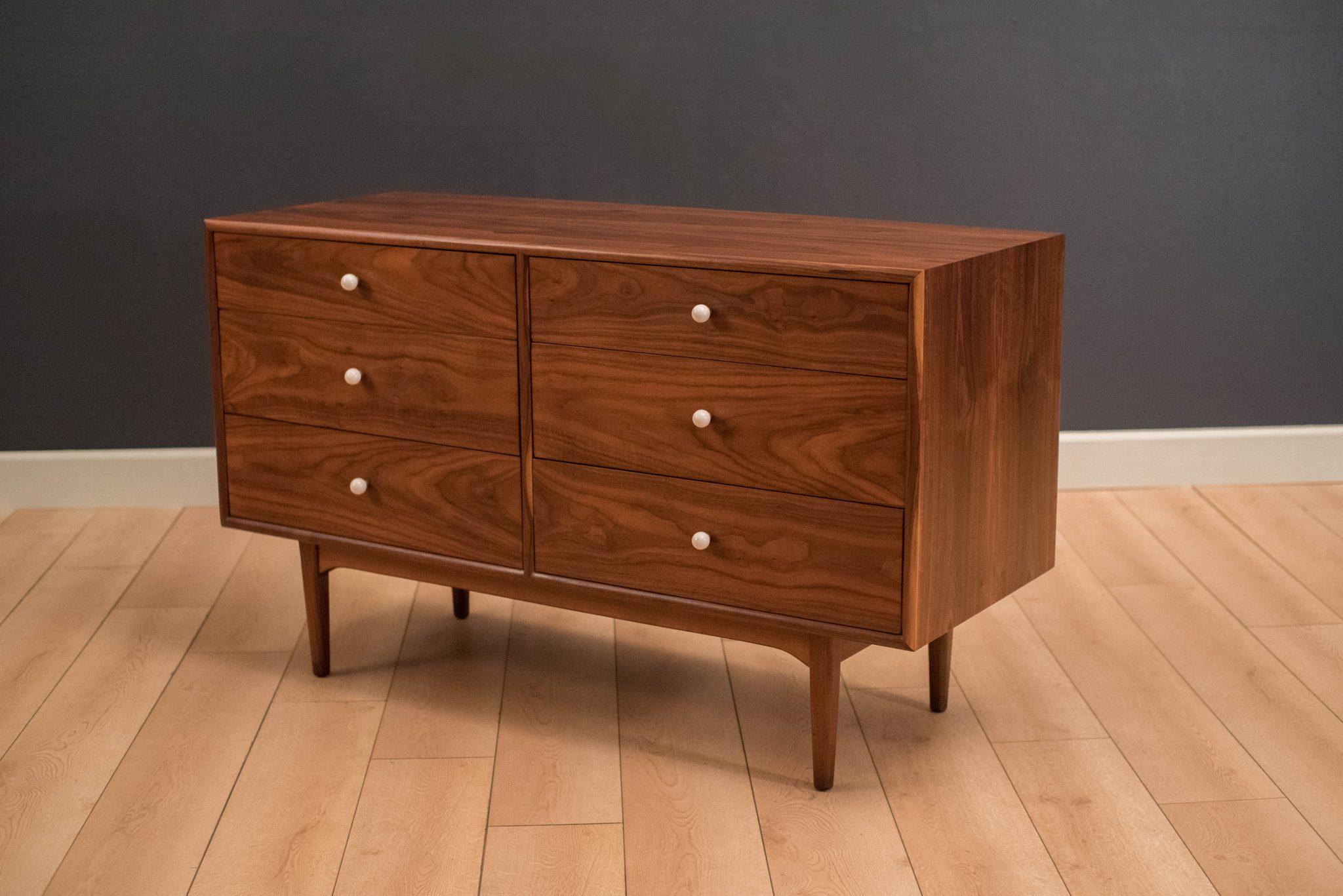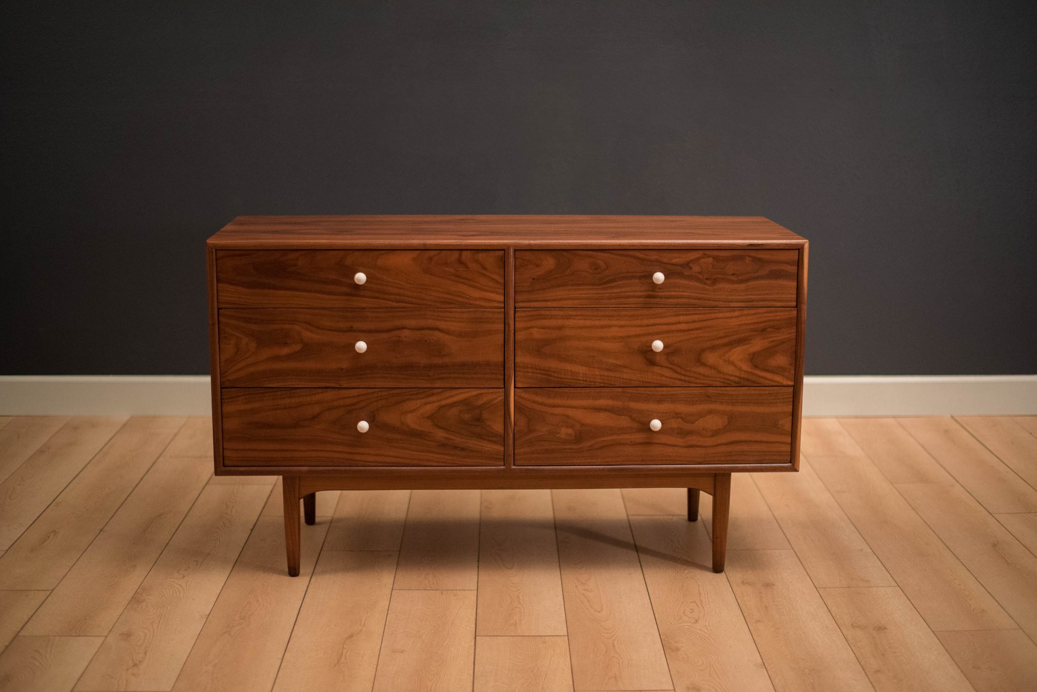 Mid Century Drexel Declaration low dresser by Kipp Stewart & Stewart McDougall. This piece features book matched black walnut grains and includes their signature porcelain knobs. Includes plenty of storage with six dovetailed drawers.