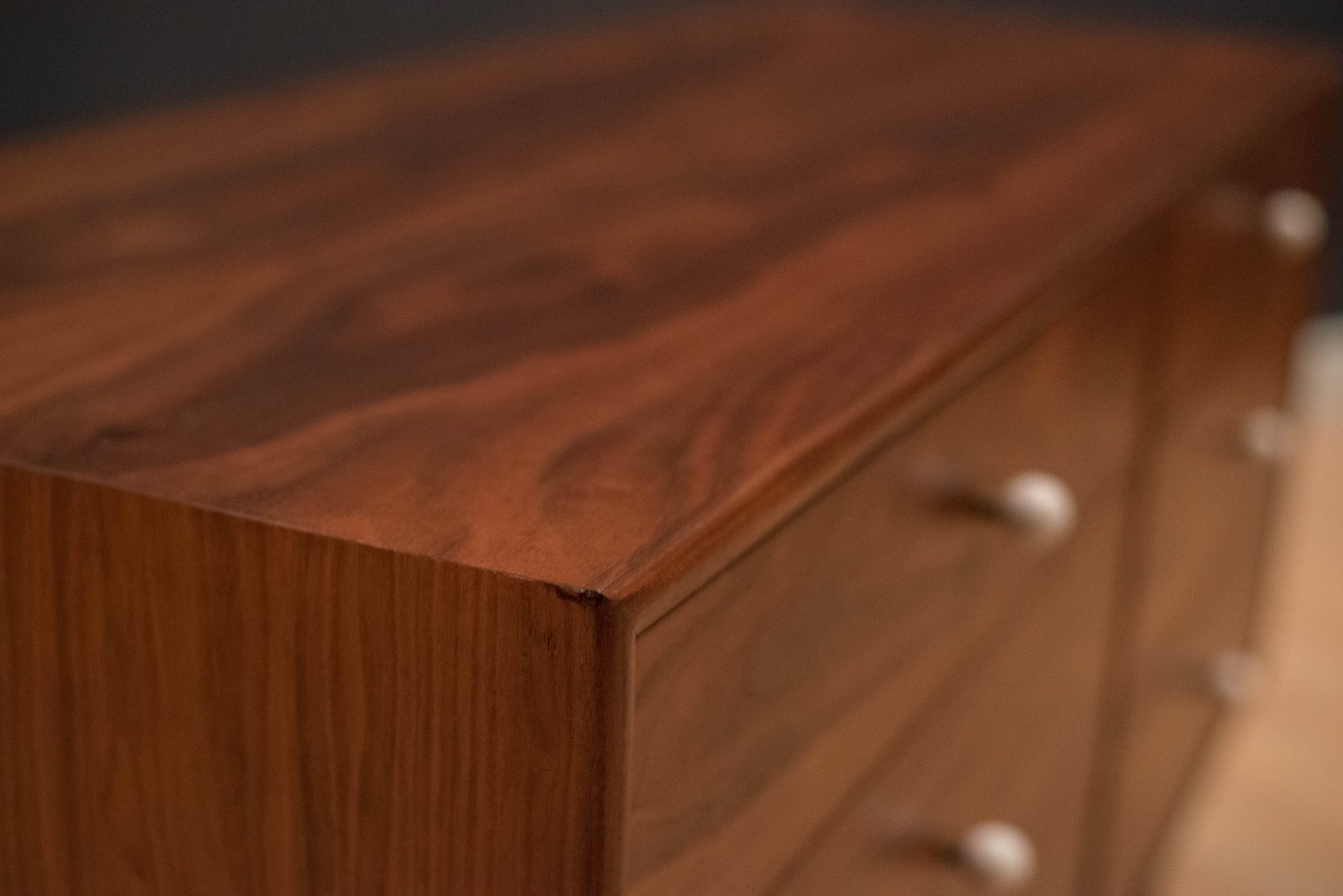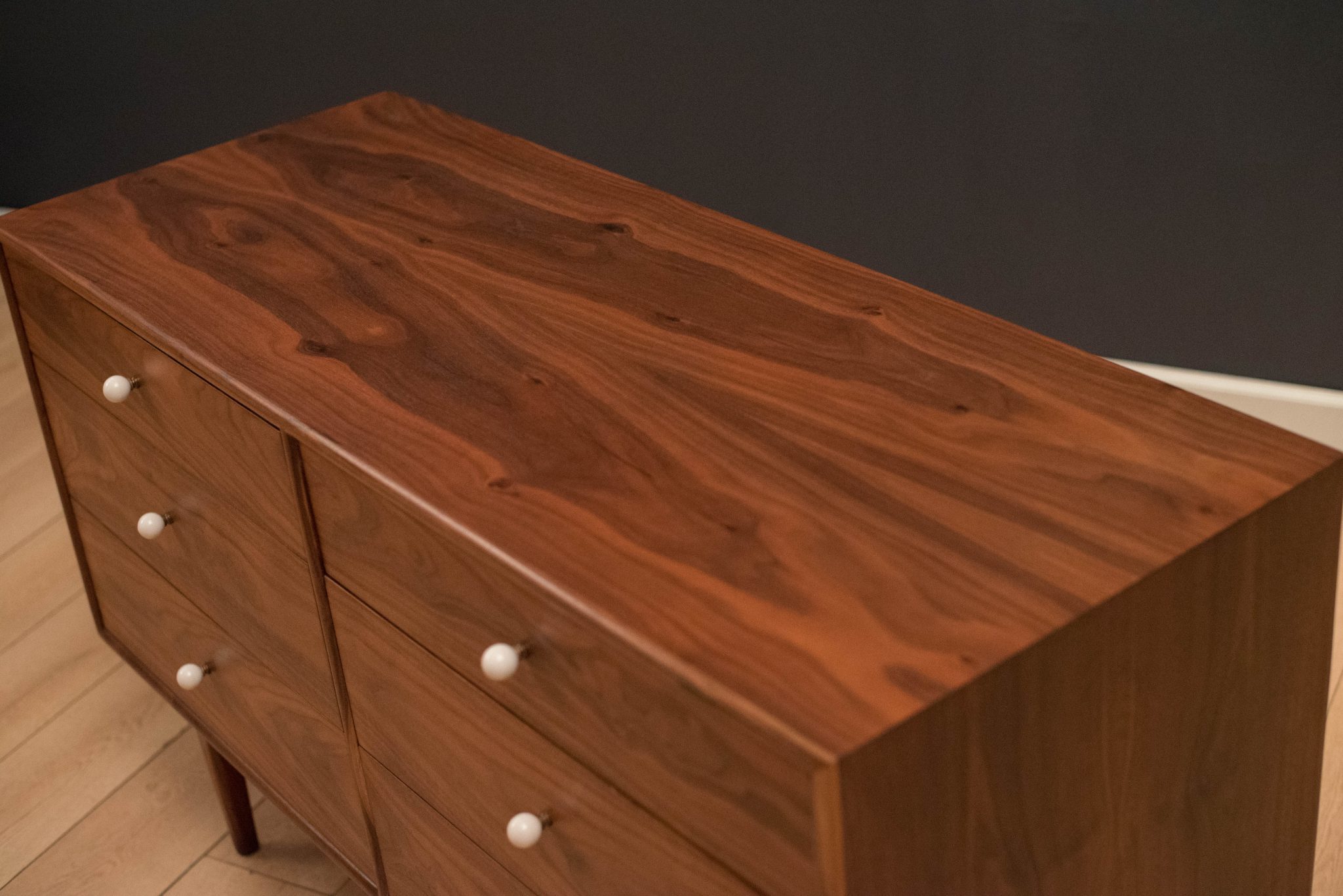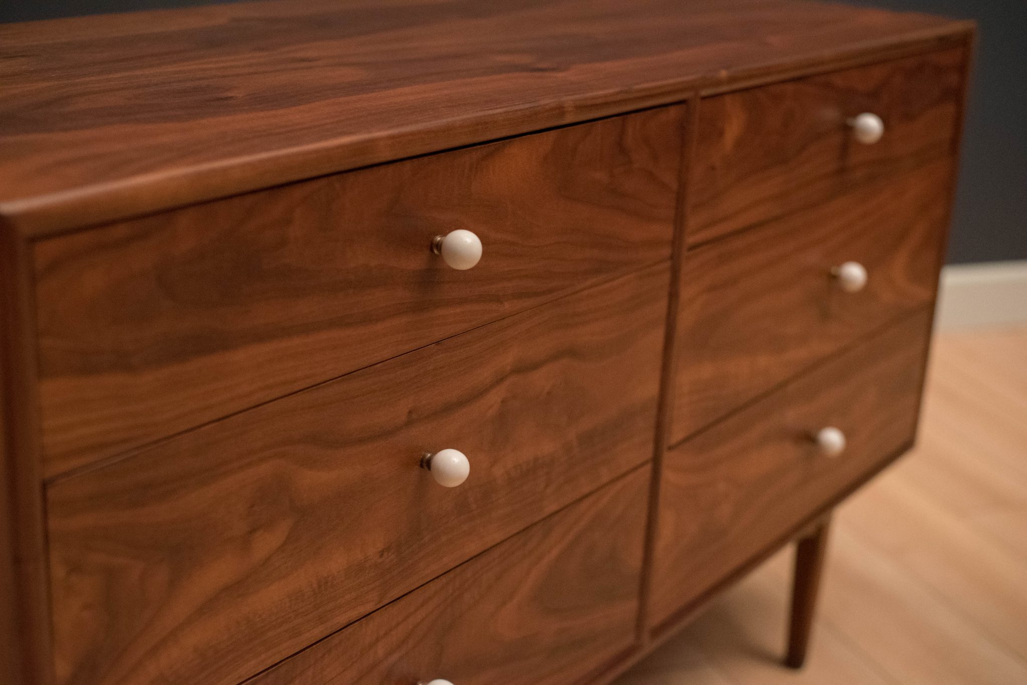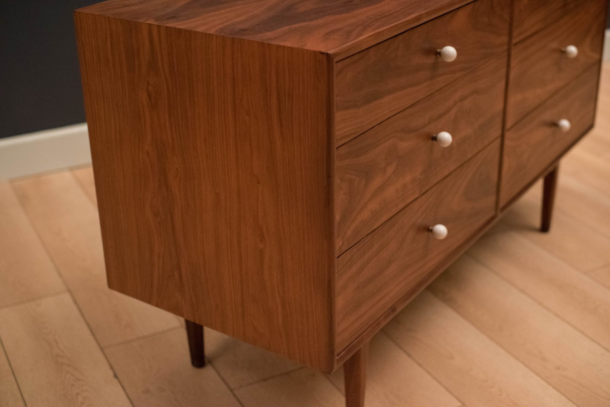 Mid Century Drexel Declaration low dresser by Kipp Stewart & Stewart McDougall. This piece features book matched black walnut grains and includes their signature porcelain knobs. Includes plenty of storage with six dovetailed drawers.