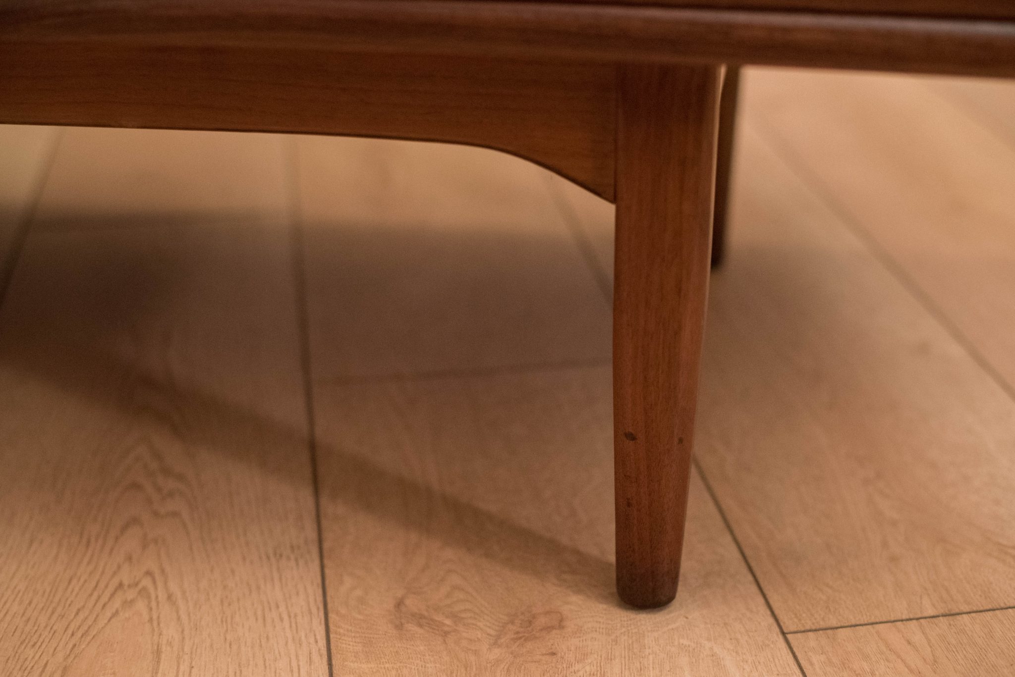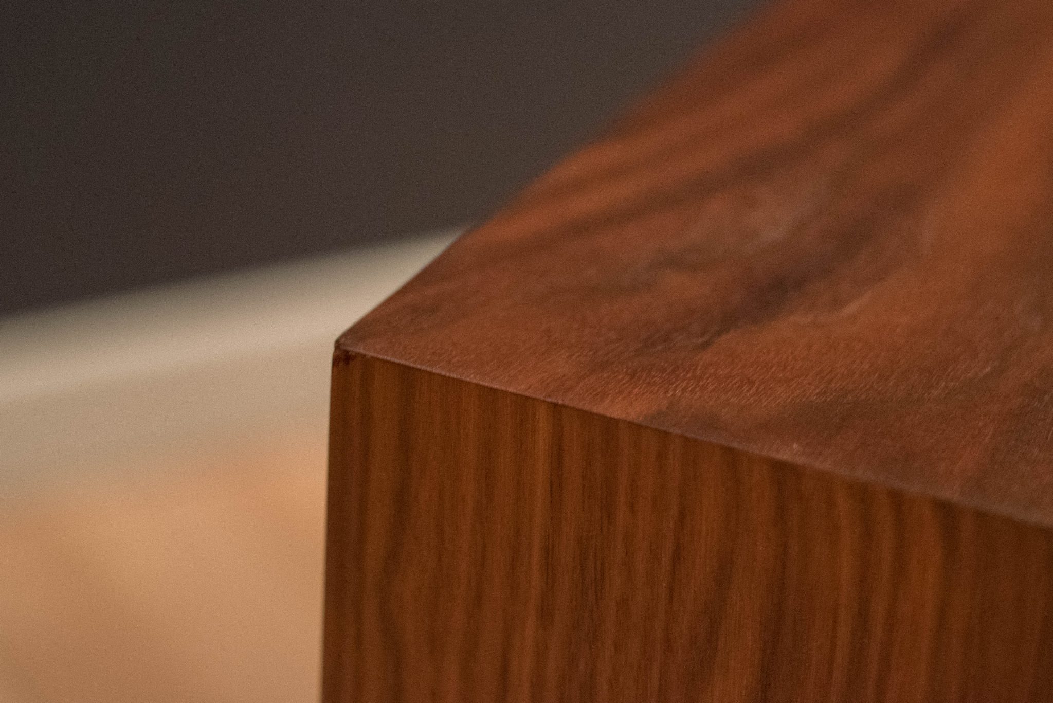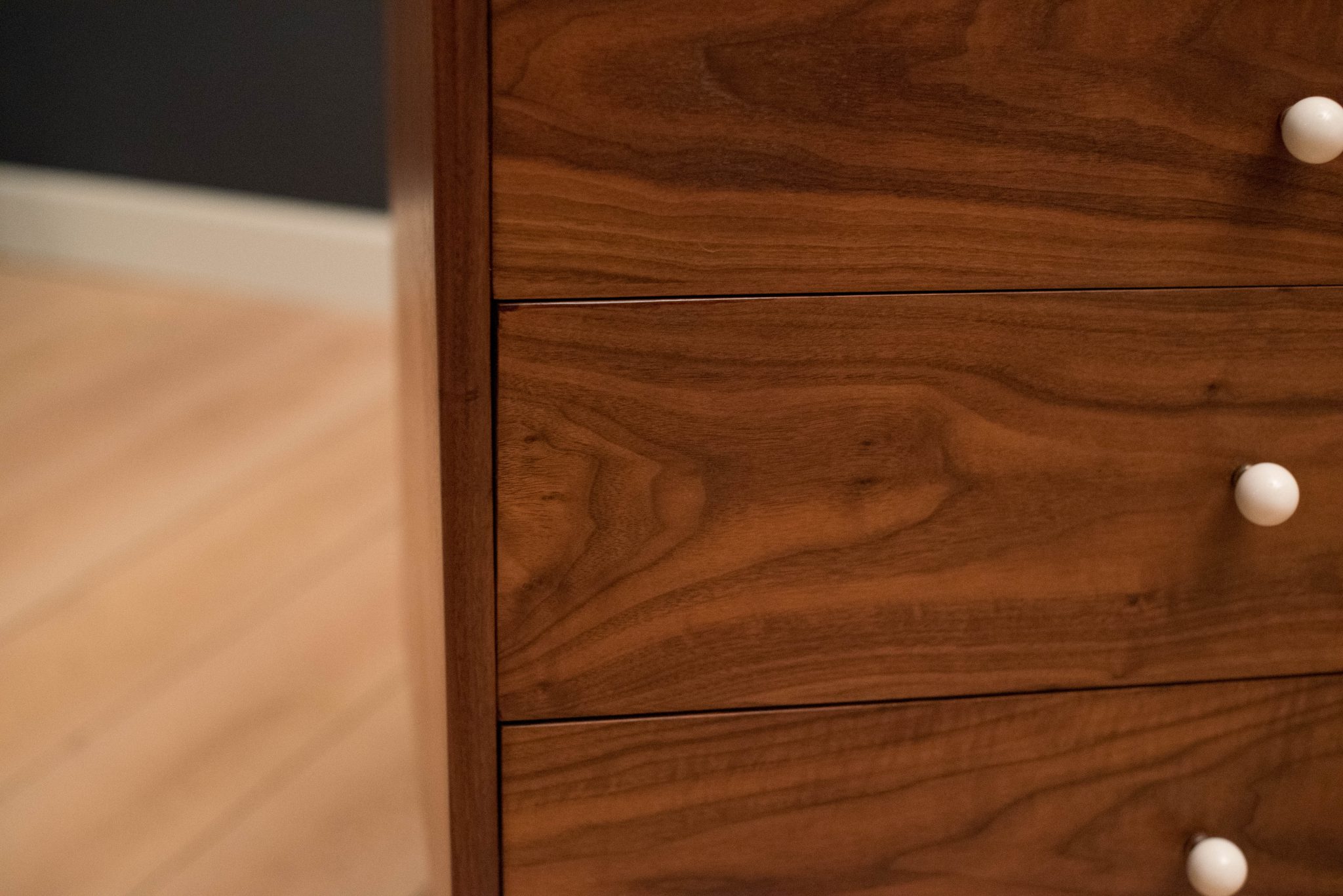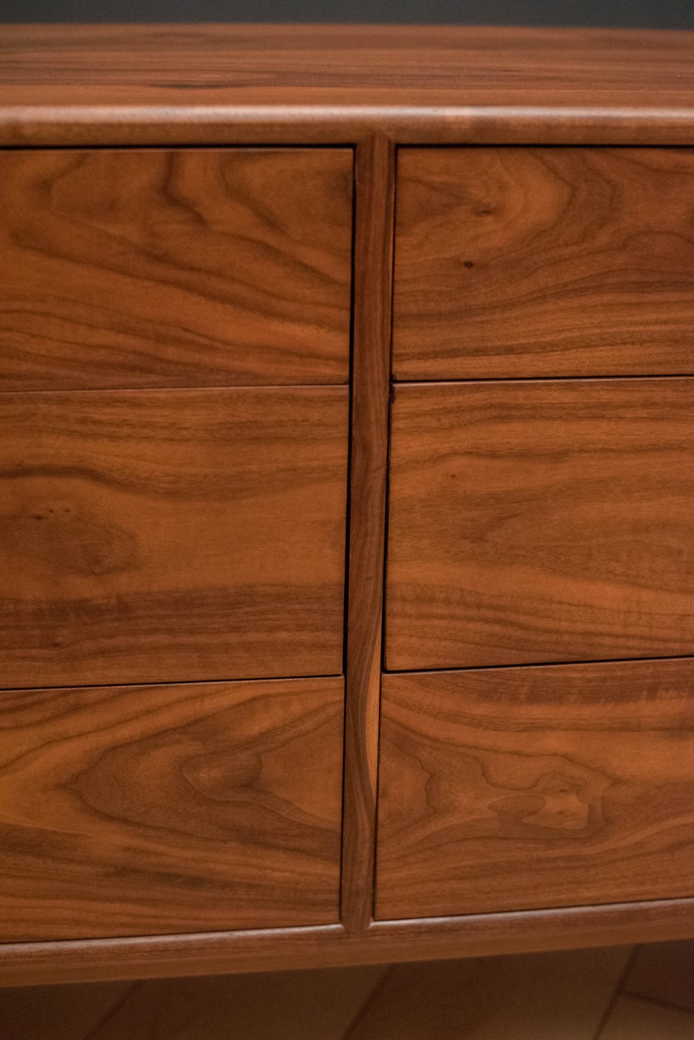 Mid Century Drexel Declaration low dresser by Kipp Stewart & Stewart McDougall. This piece features book matched black walnut grains and includes their signature porcelain knobs. Includes plenty of storage with six dovetailed drawers.