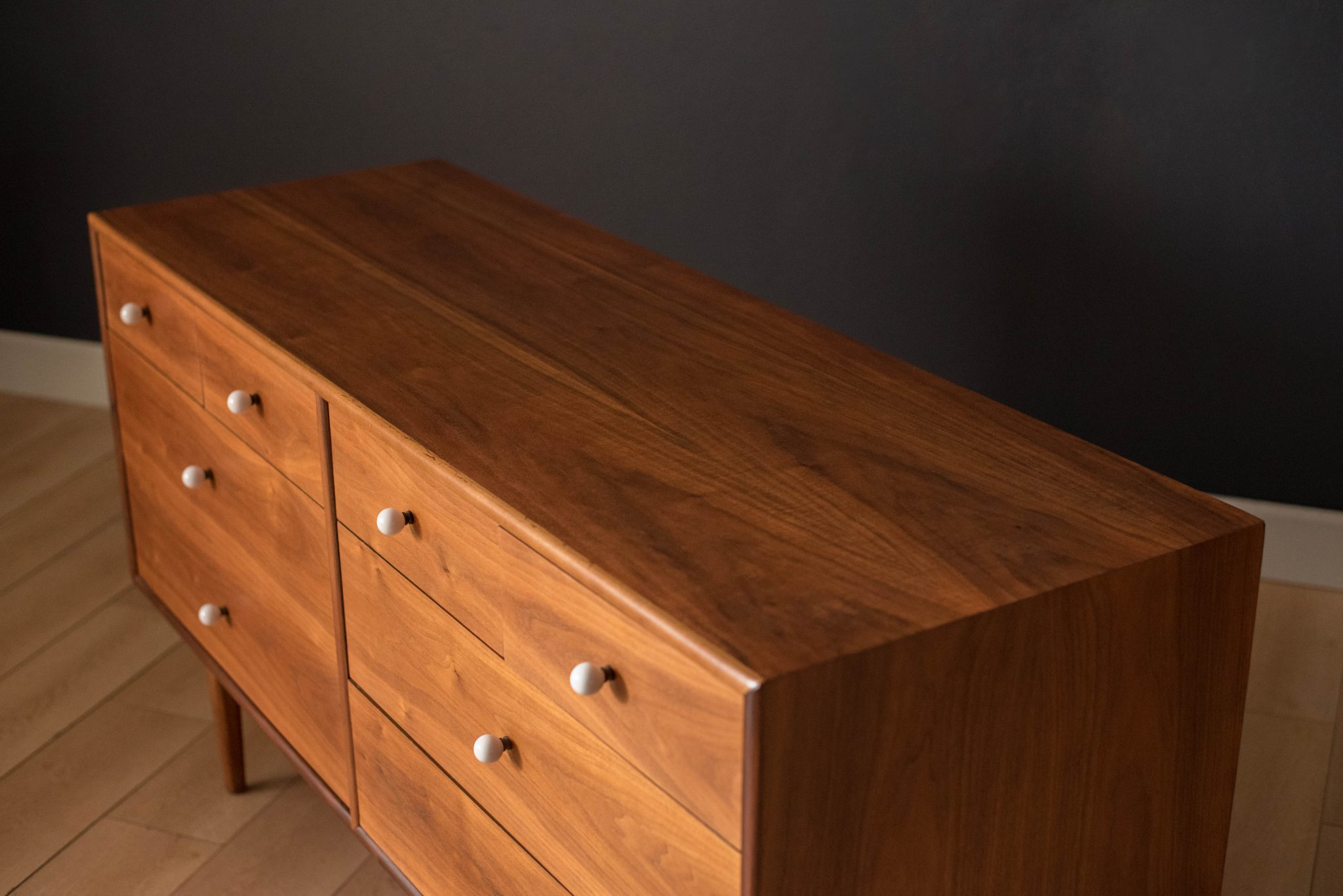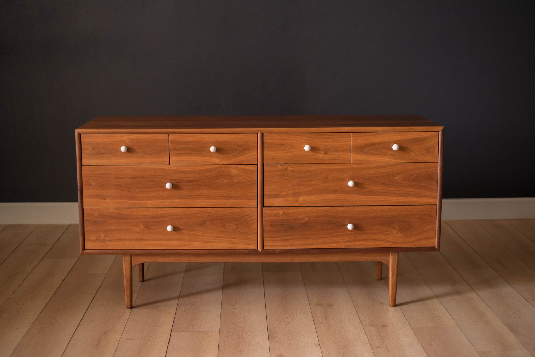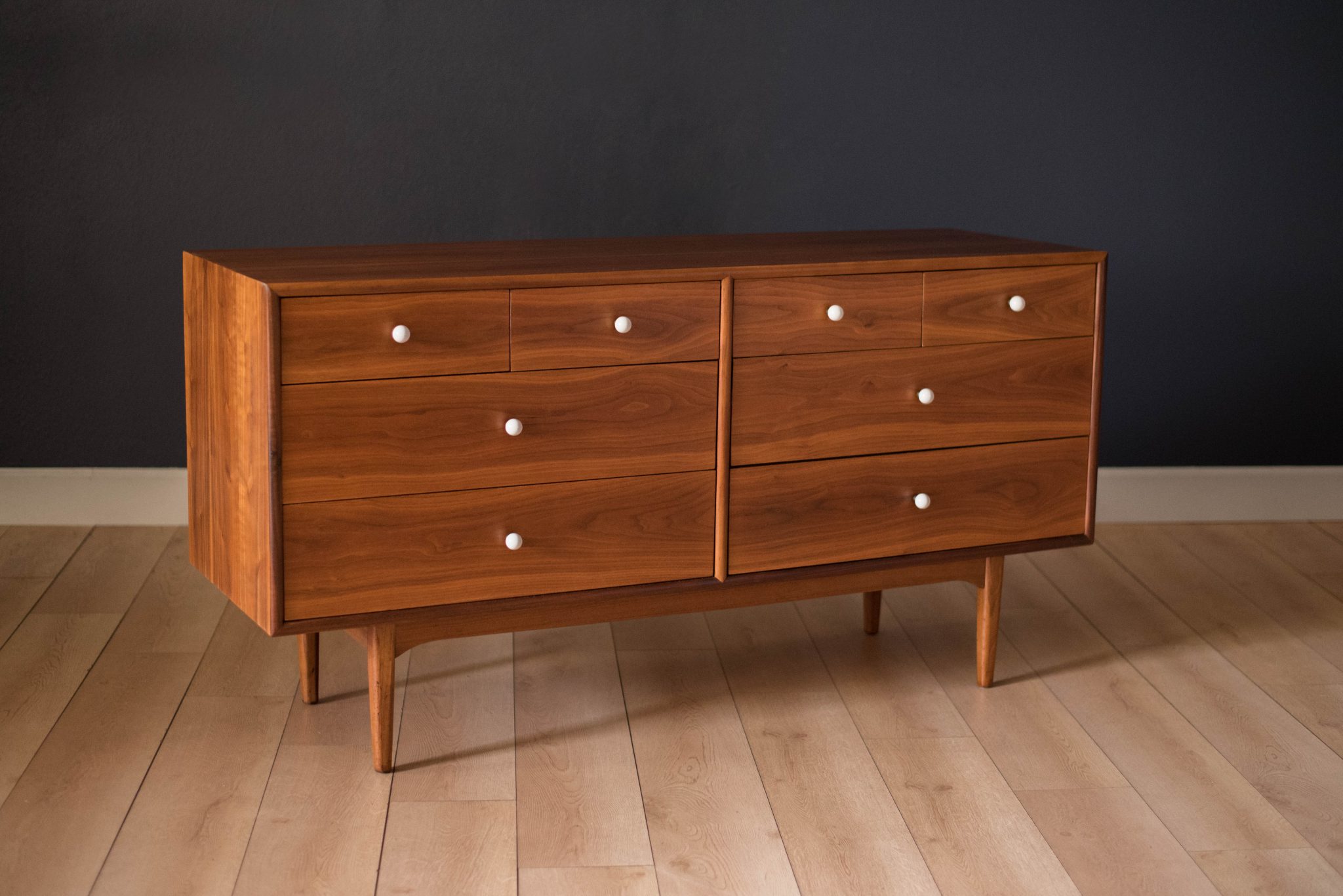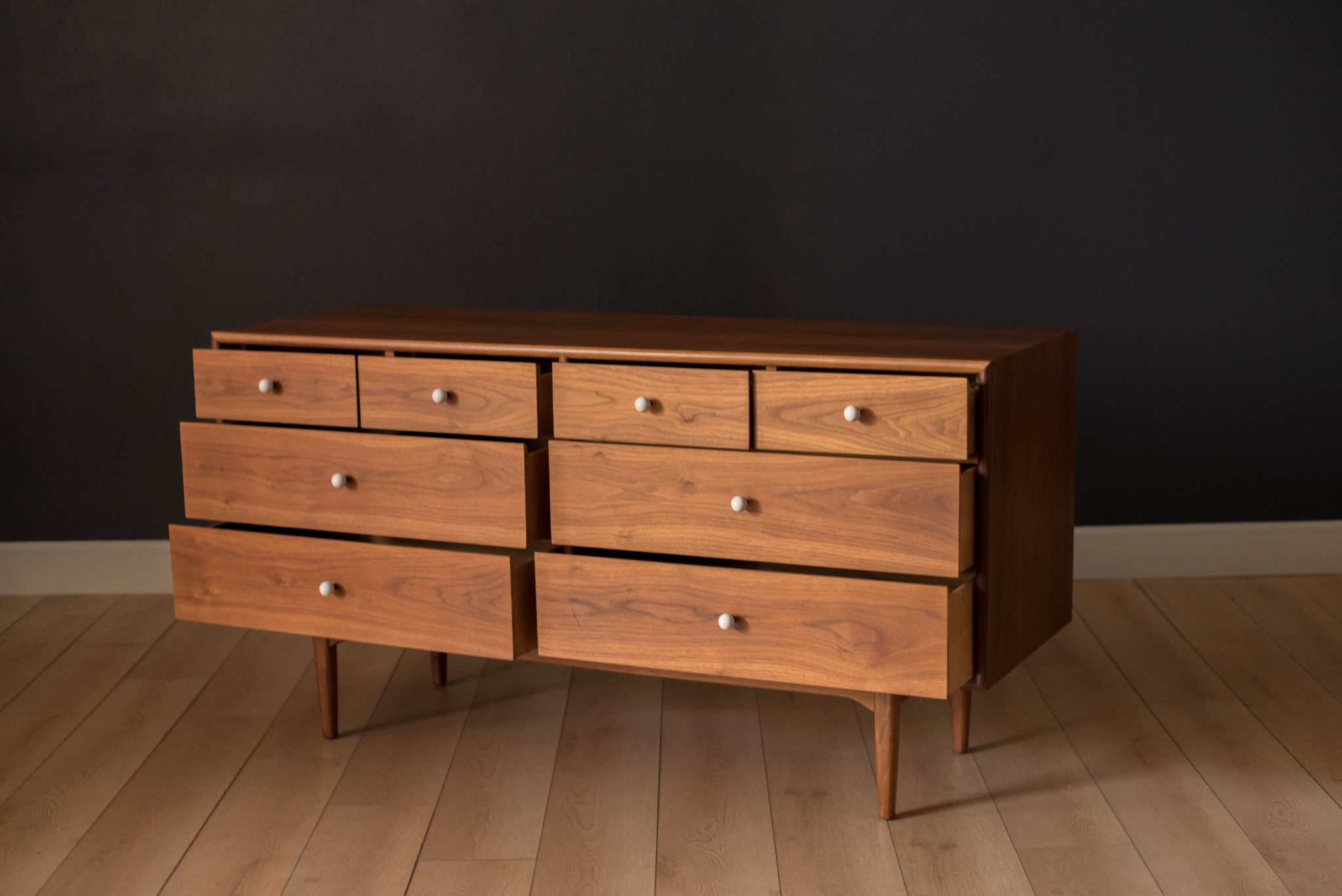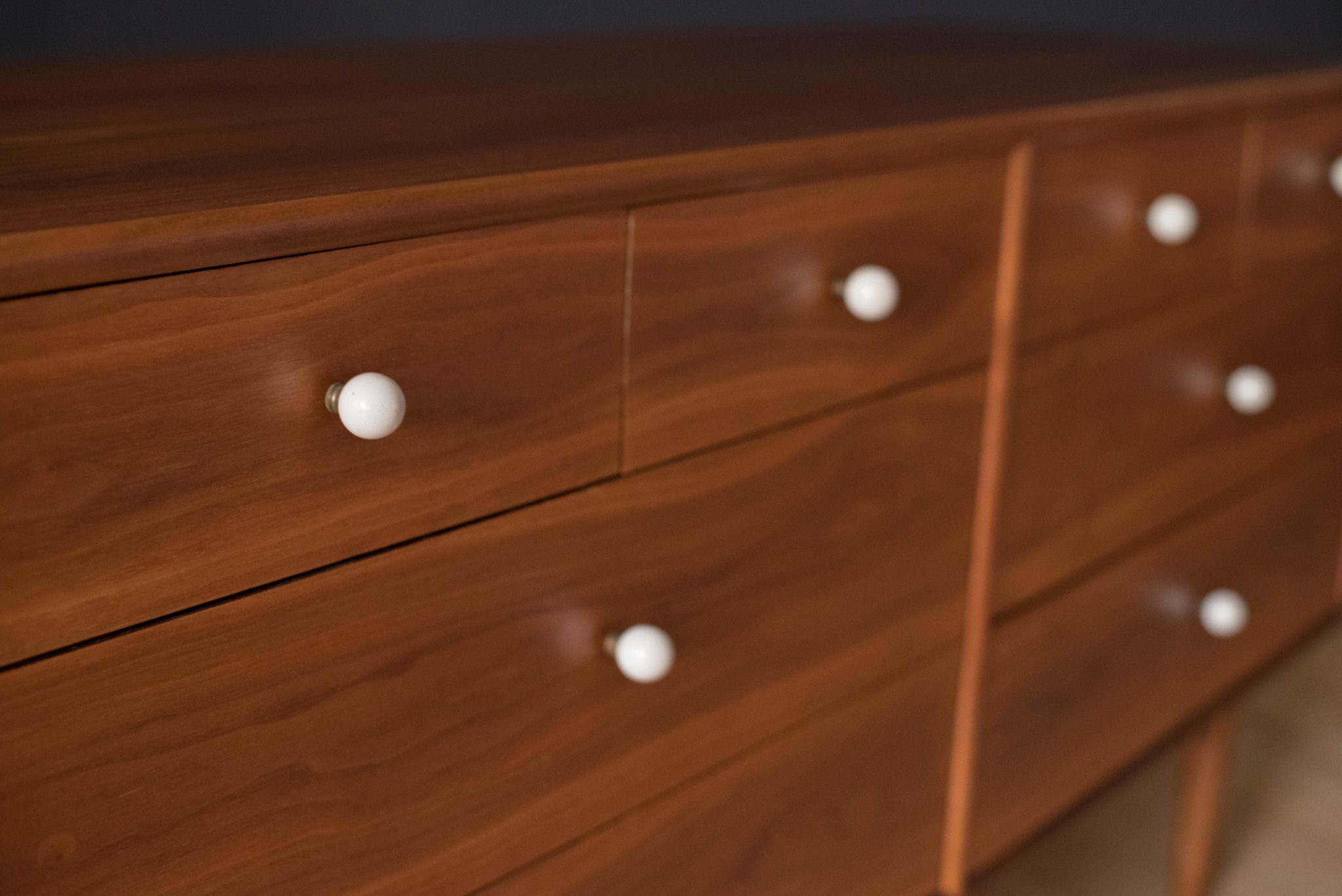 Mid Century Drexel Declaration low dresser by Kipp Stewart & Stewart McDougall. This piece features bookmatched black walnut grains equipped with the collection’s signature porcelain knobs. Includes plenty of storage with eight dovetailed drawers.