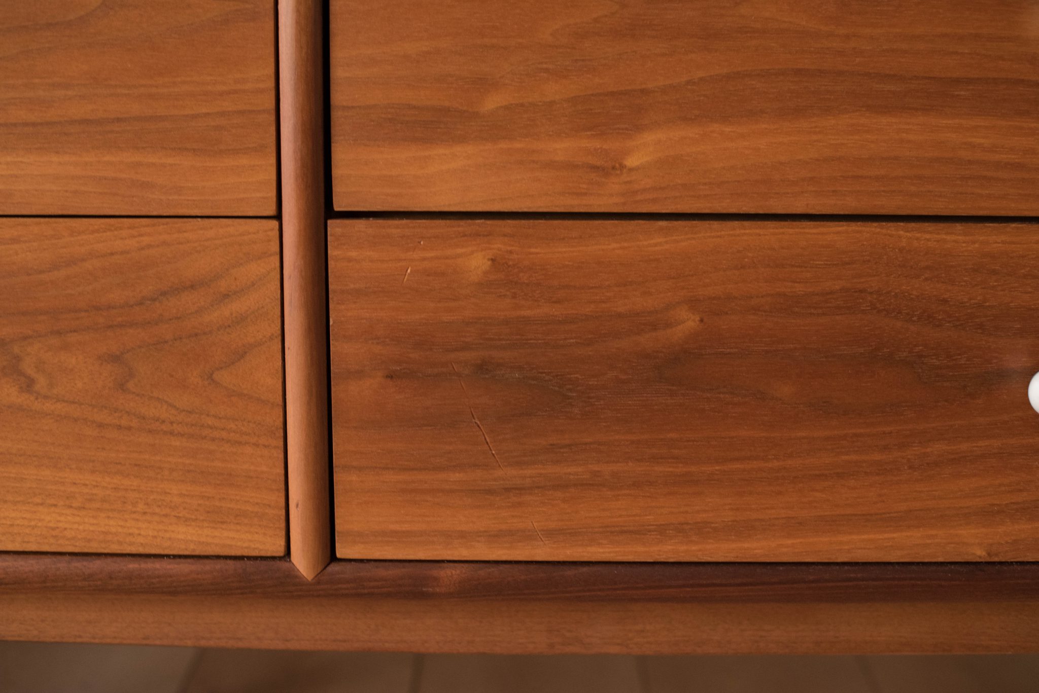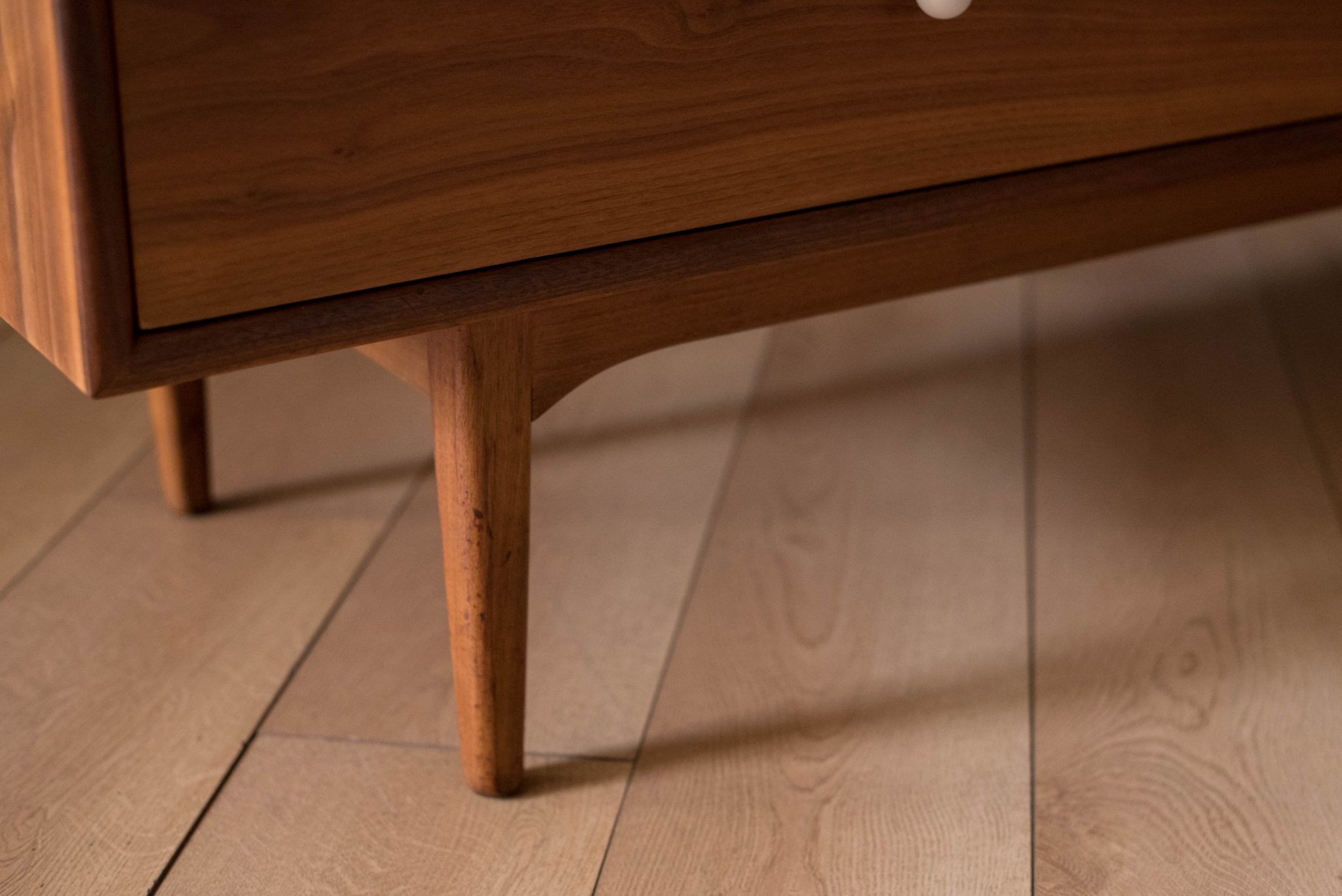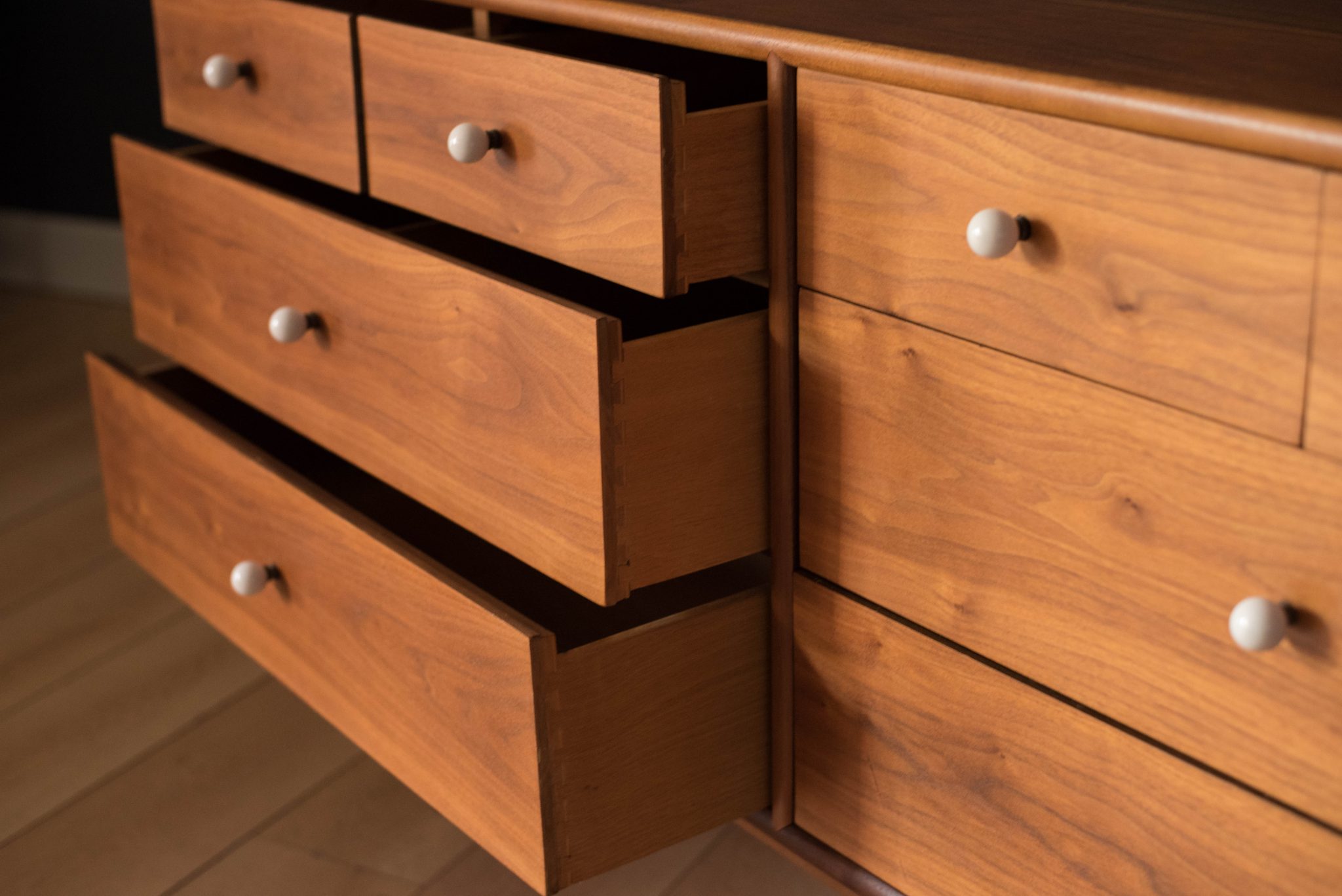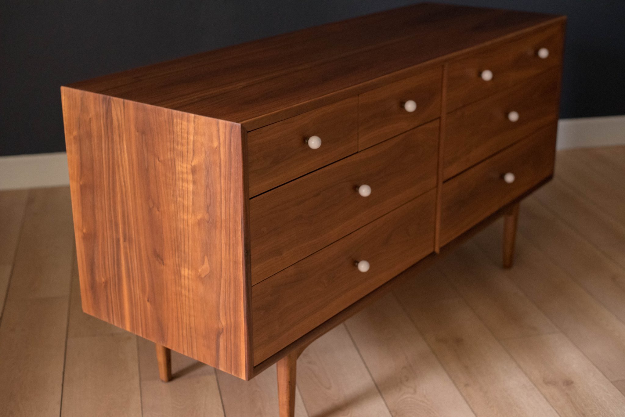 Mid Century Drexel Declaration low dresser by Kipp Stewart & Stewart McDougall. This piece features bookmatched black walnut grains equipped with the collection’s signature porcelain knobs. Includes plenty of storage with eight dovetailed drawers.