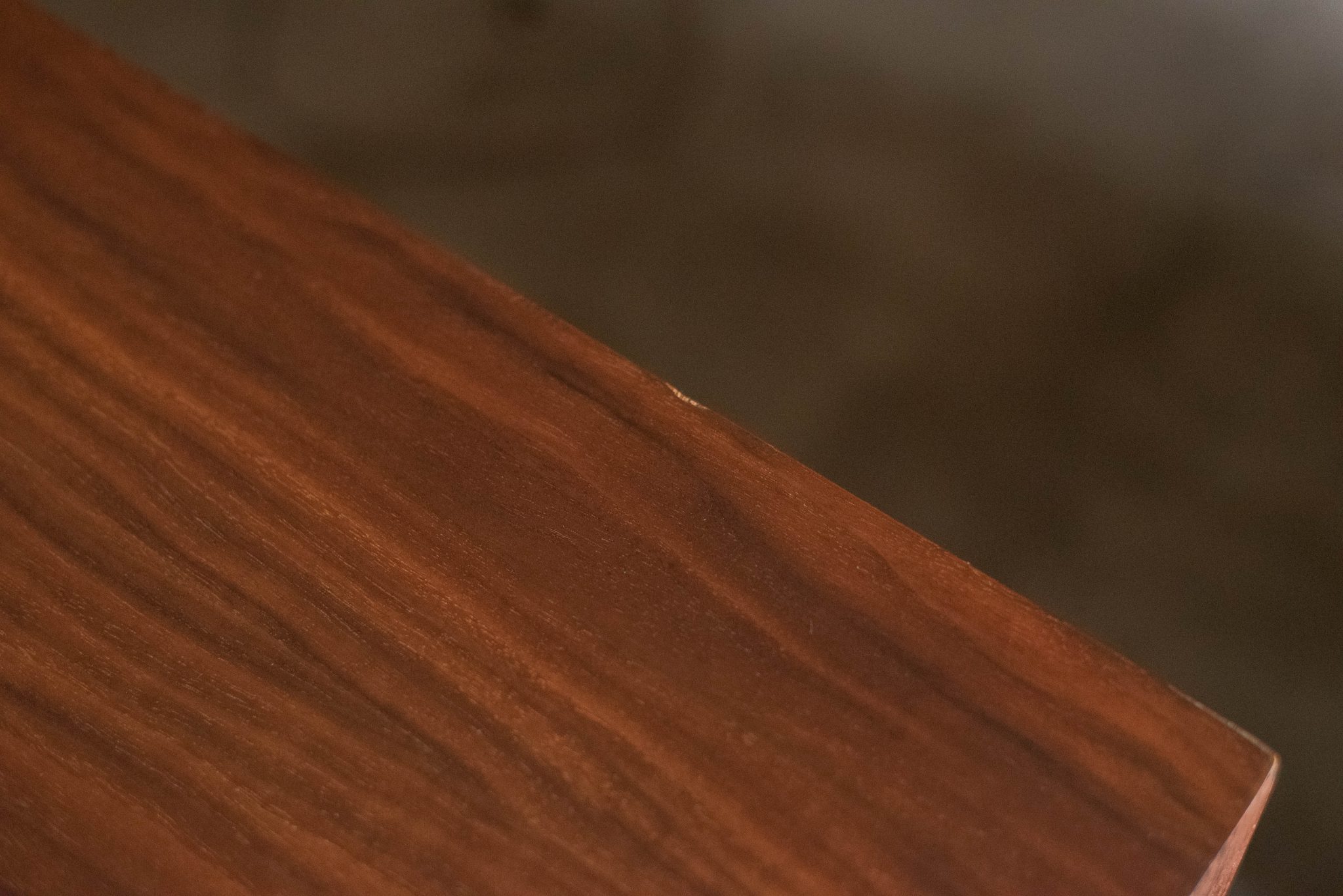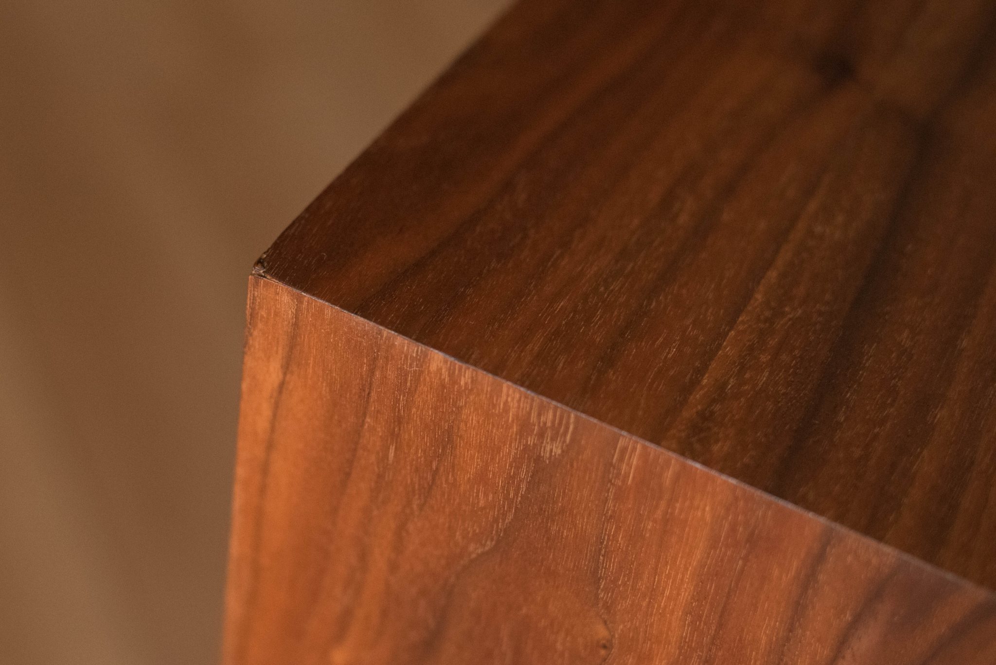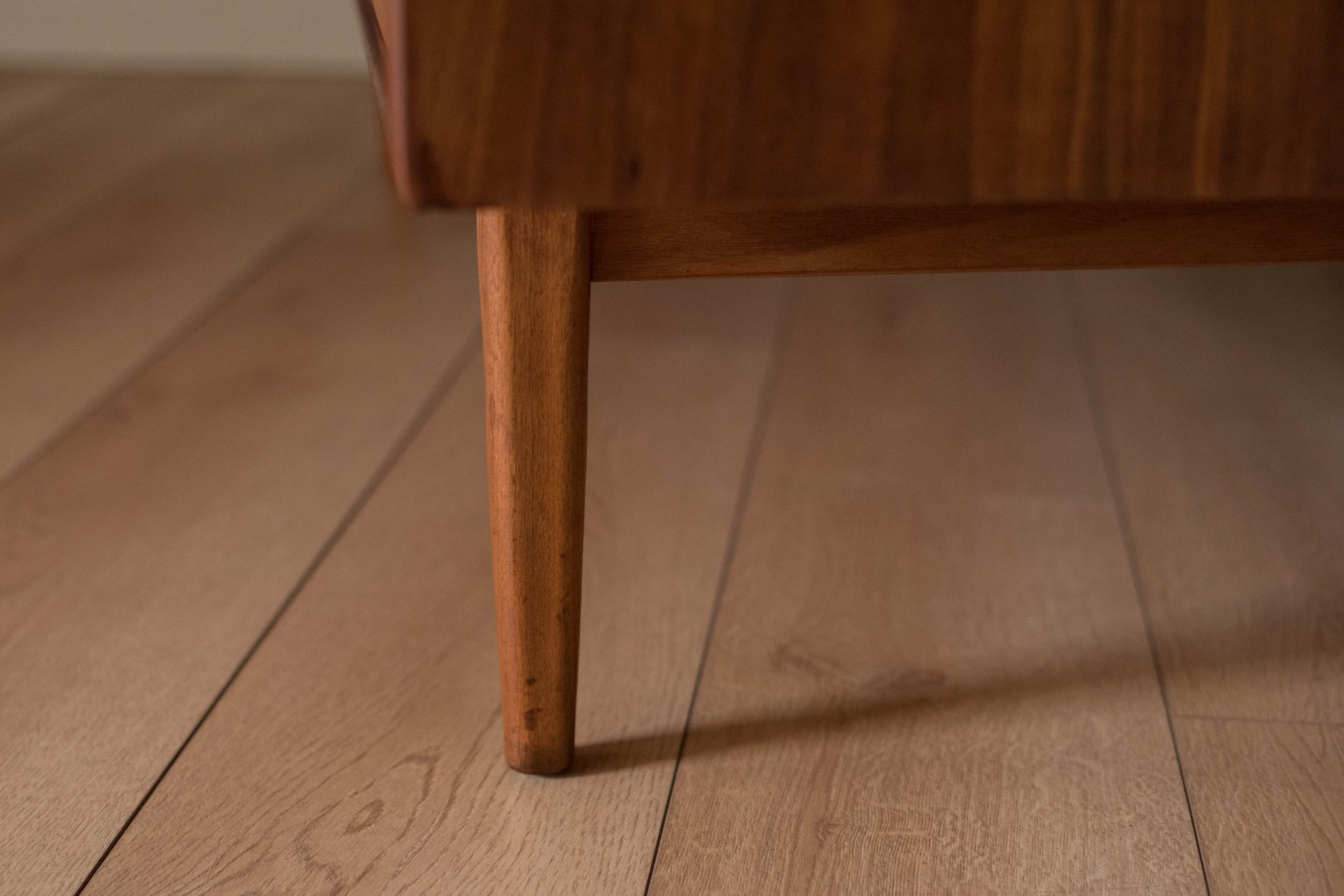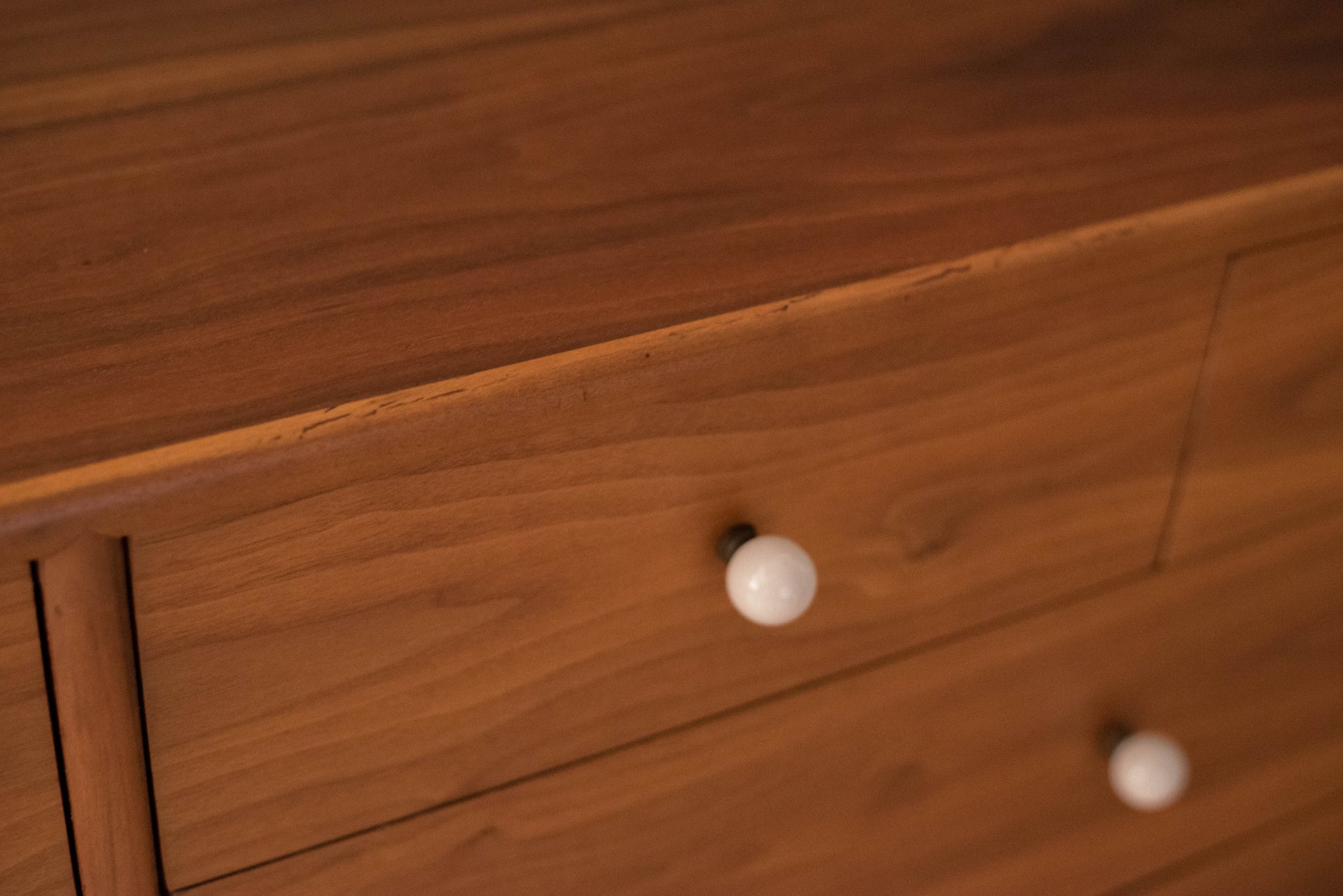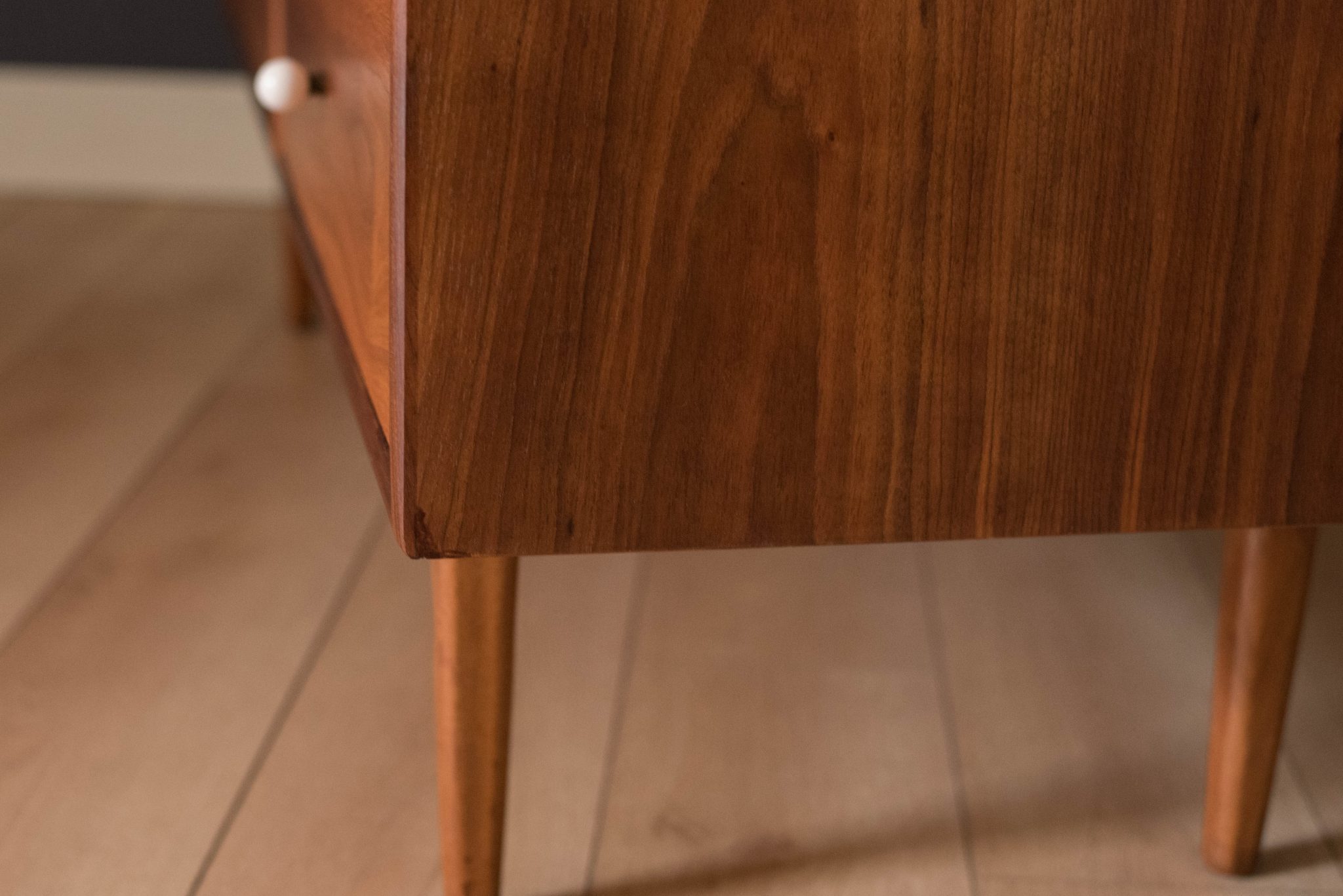 Mid Century Drexel Declaration low dresser by Kipp Stewart & Stewart McDougall. This piece features bookmatched black walnut grains equipped with the collection’s signature porcelain knobs. Includes plenty of storage with eight dovetailed drawers.
