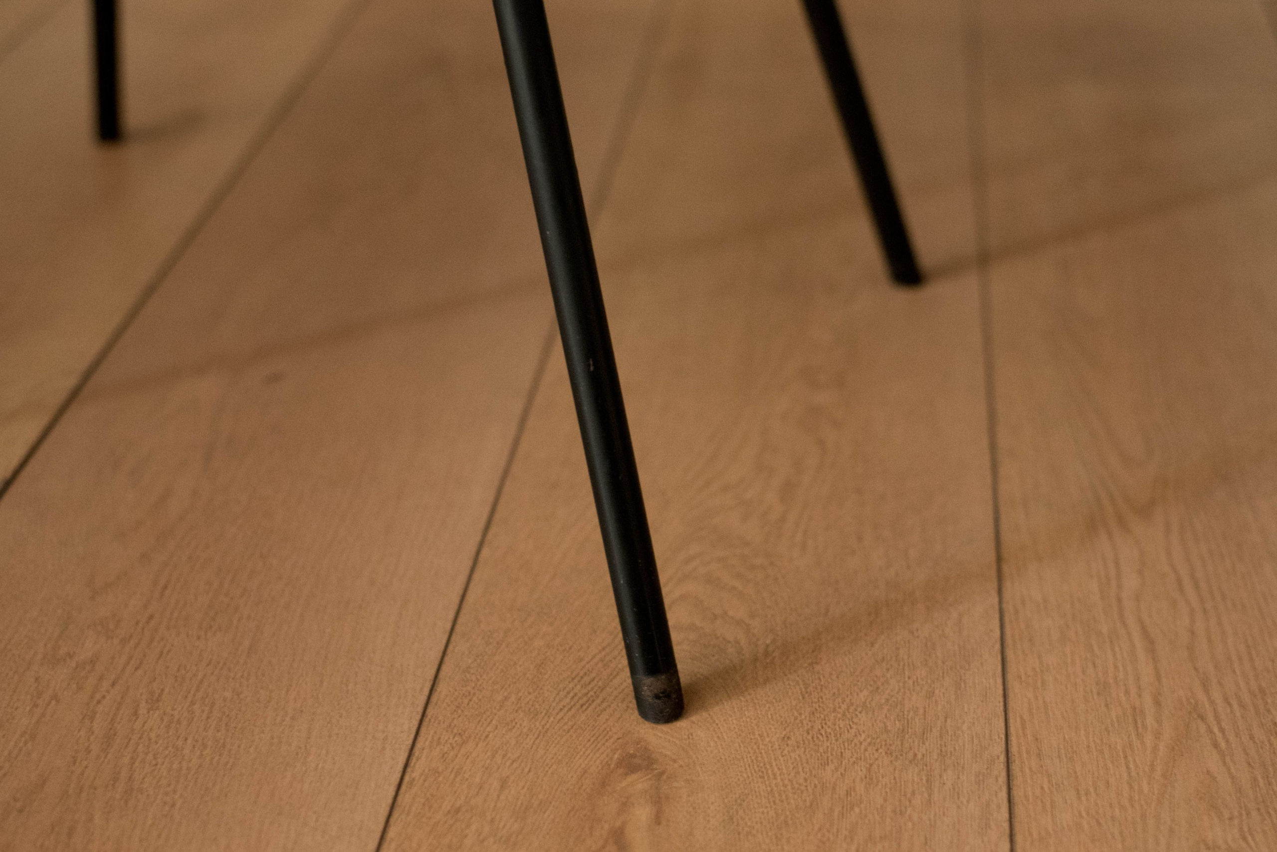 Iconic design (DAX) dining armchair x-base by Ray and Charles Eames, circa early 1950’s. This second generation parchment colored armchair retains a high gloss finish supported by the original black X steel base with large shock mounts. An earlier production piece manufactured by Zenith Plastics.