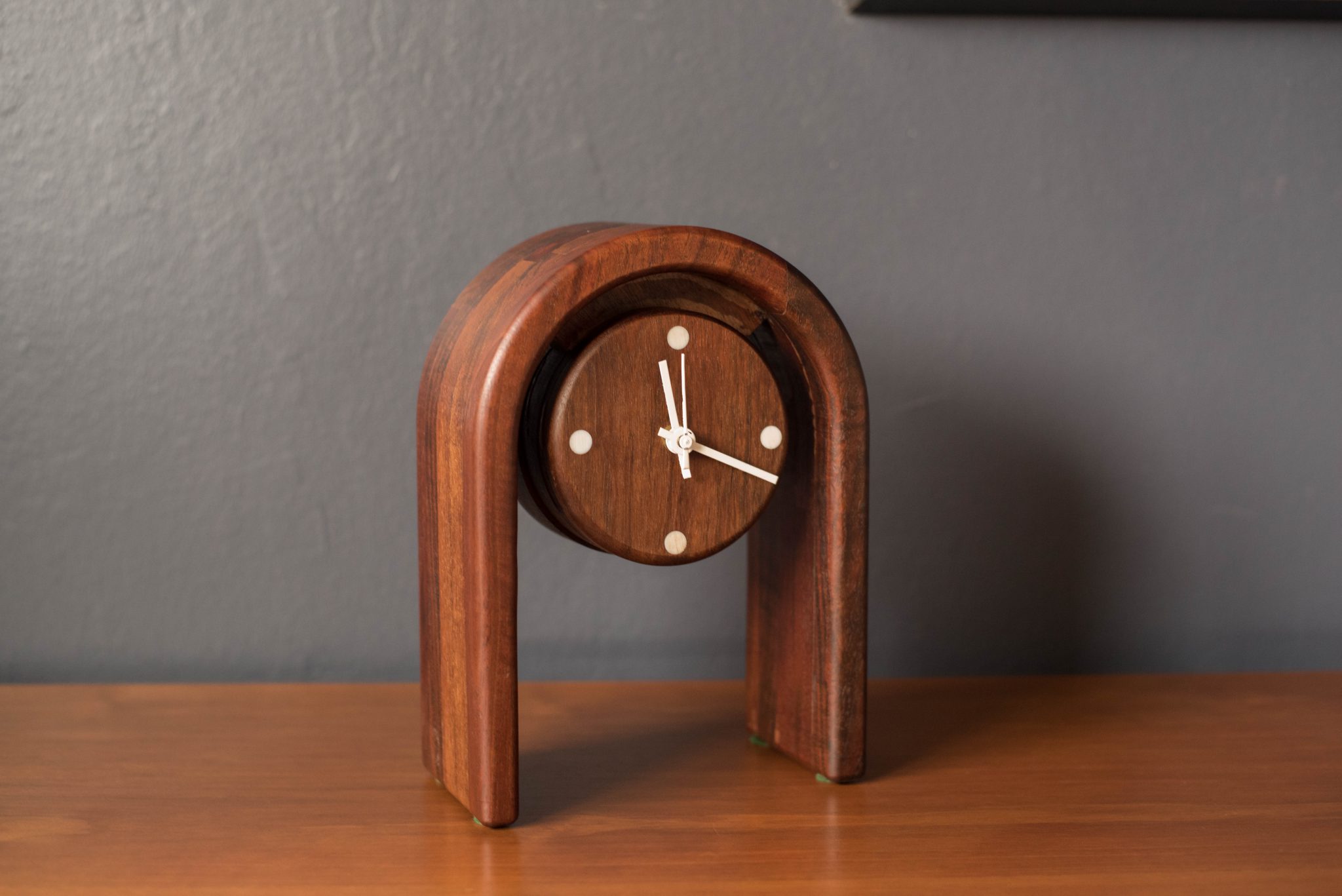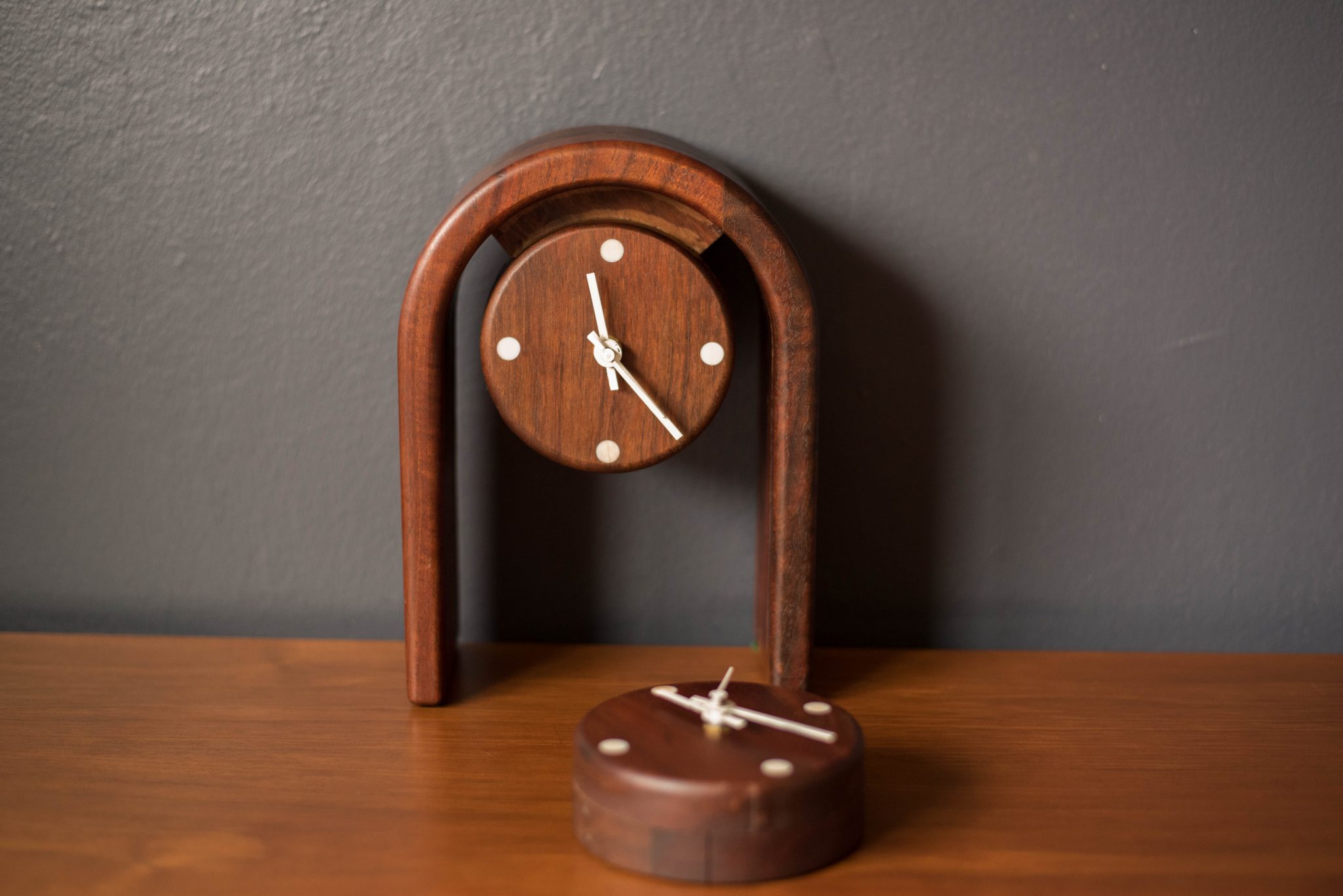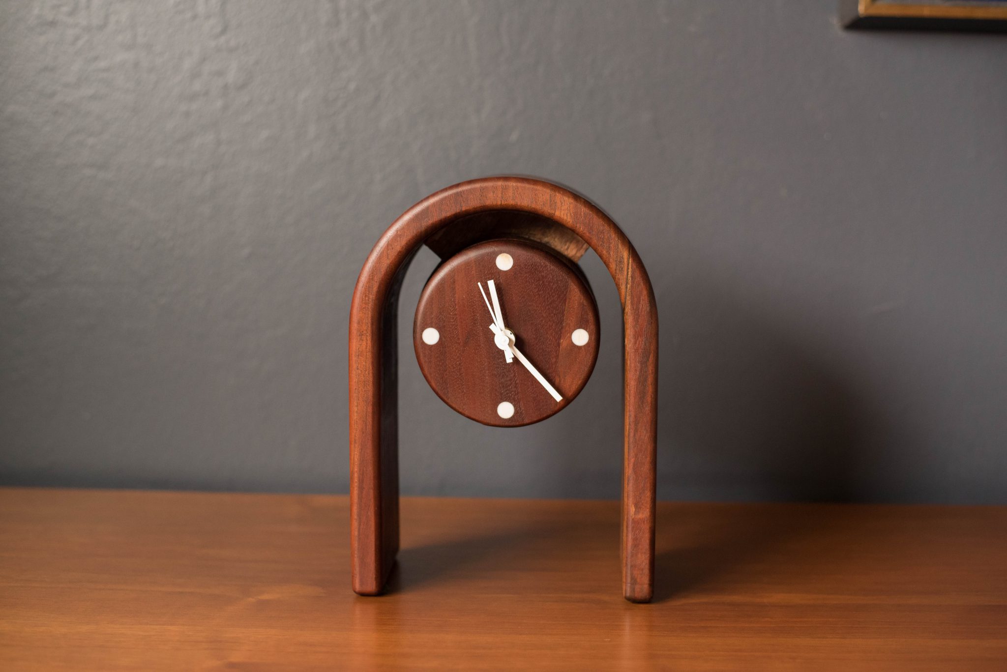 Mid century studio handcrafted clock made of walnut, circa 1960s. This two sided piece can be displayed from any angle and keeps time with separate movements.