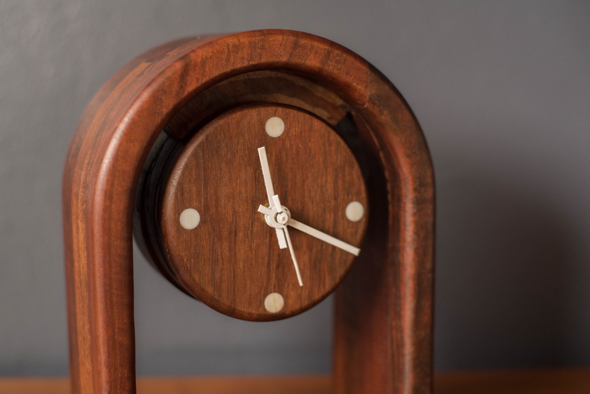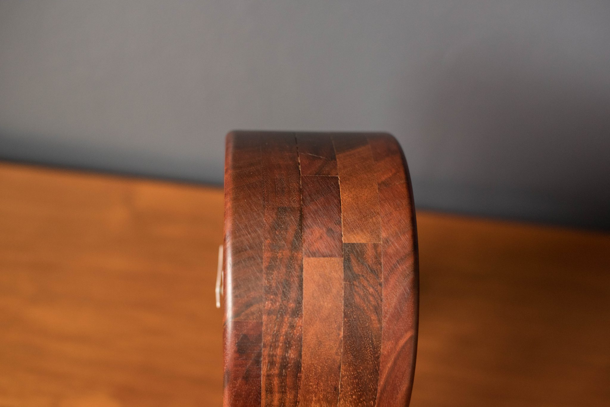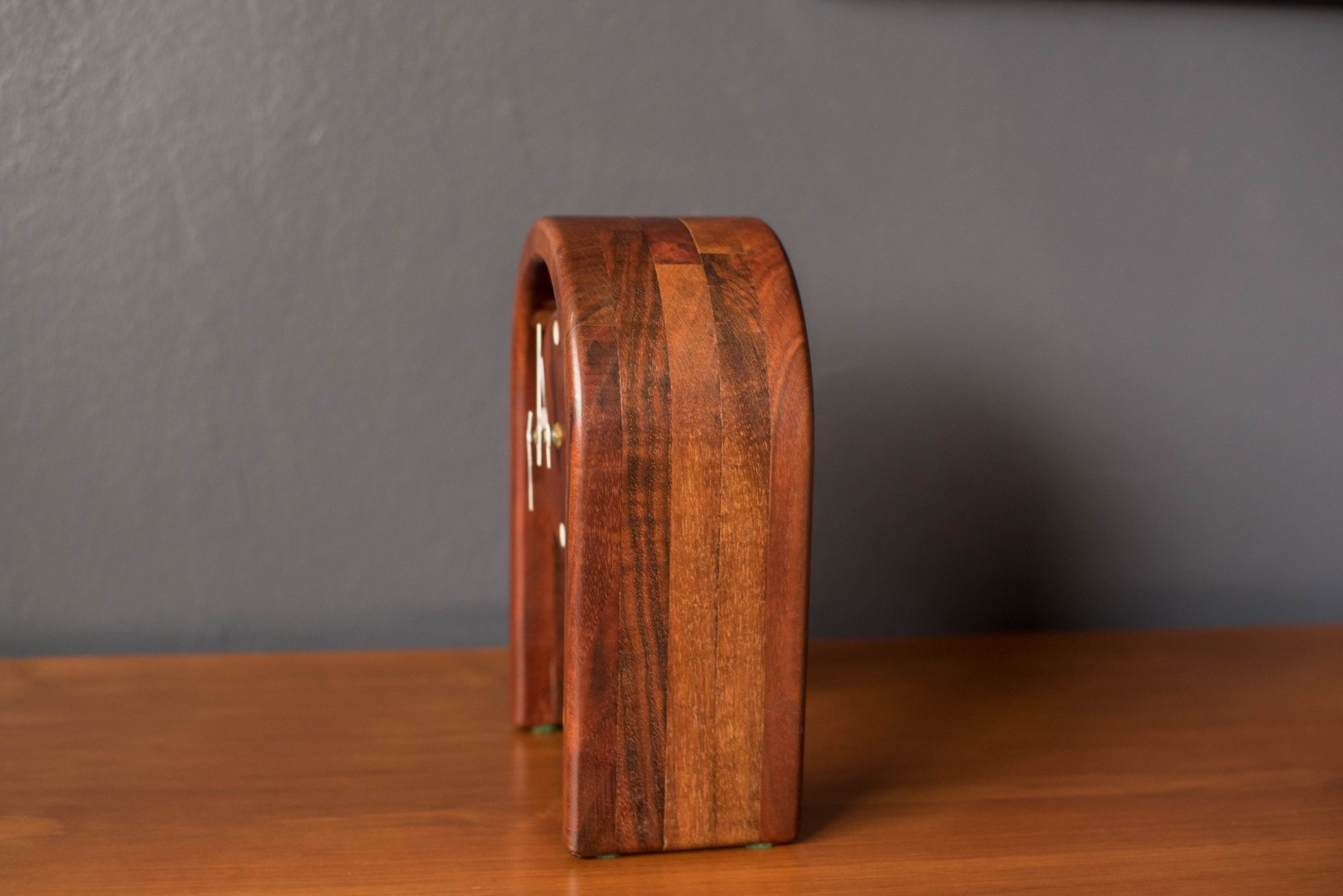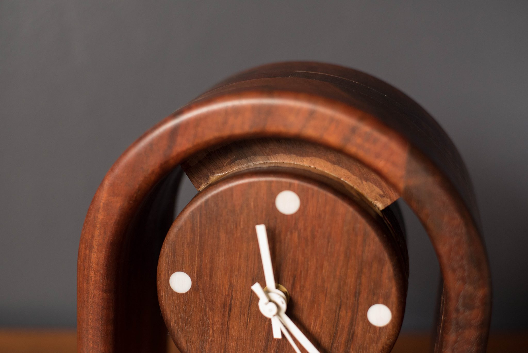 Mid century studio handcrafted clock made of walnut, circa 1960s. This two sided piece can be displayed from any angle and keeps time with separate movements.