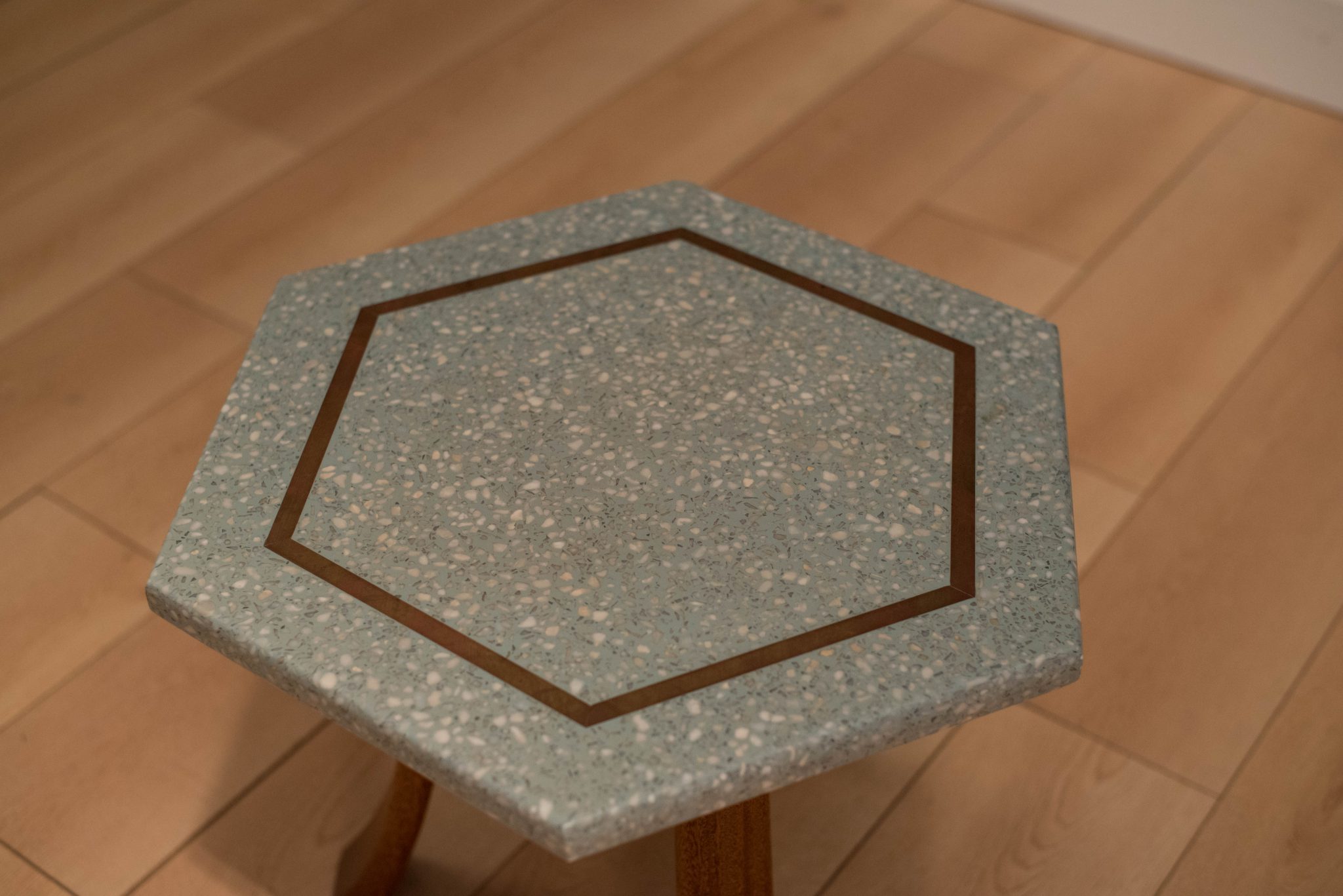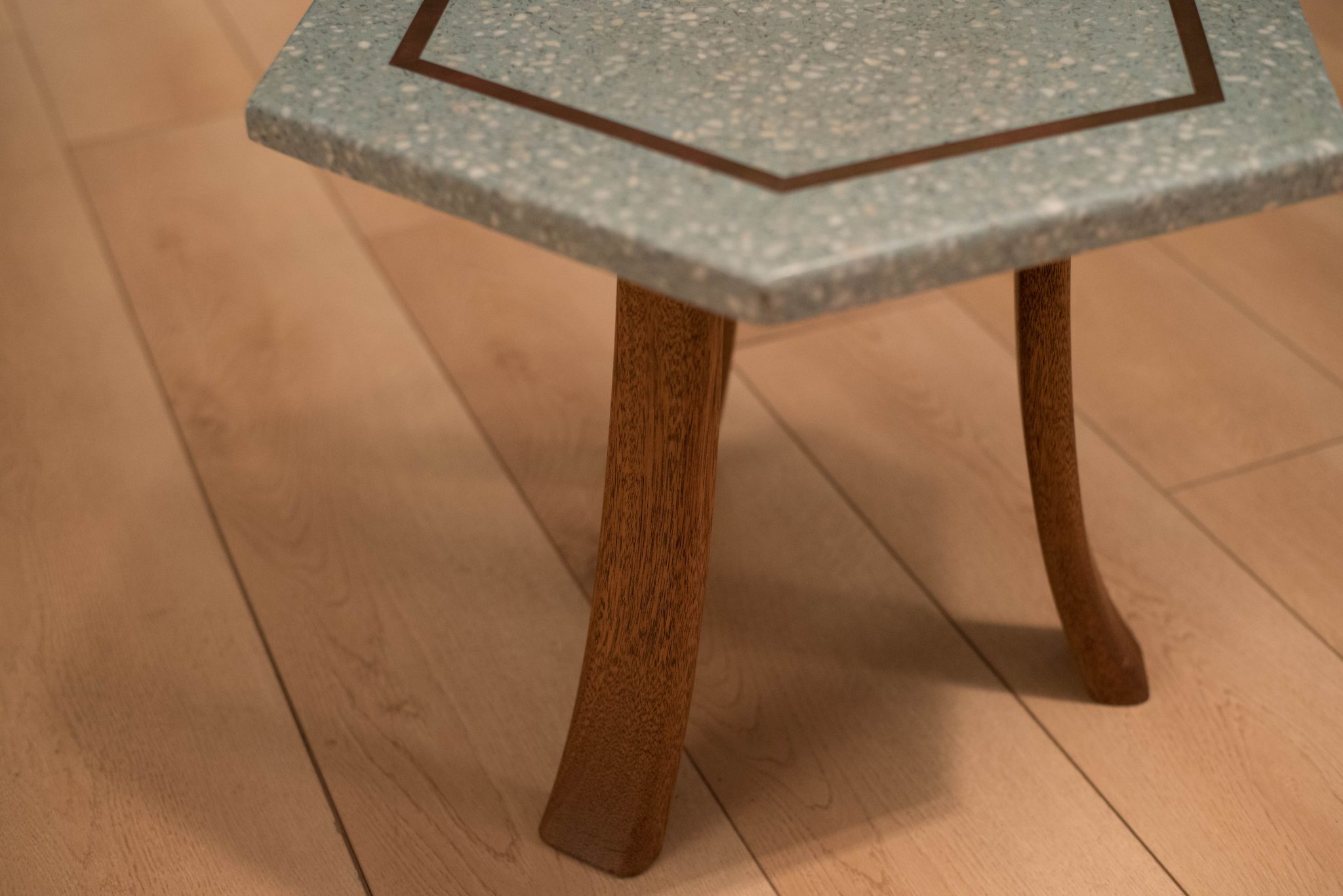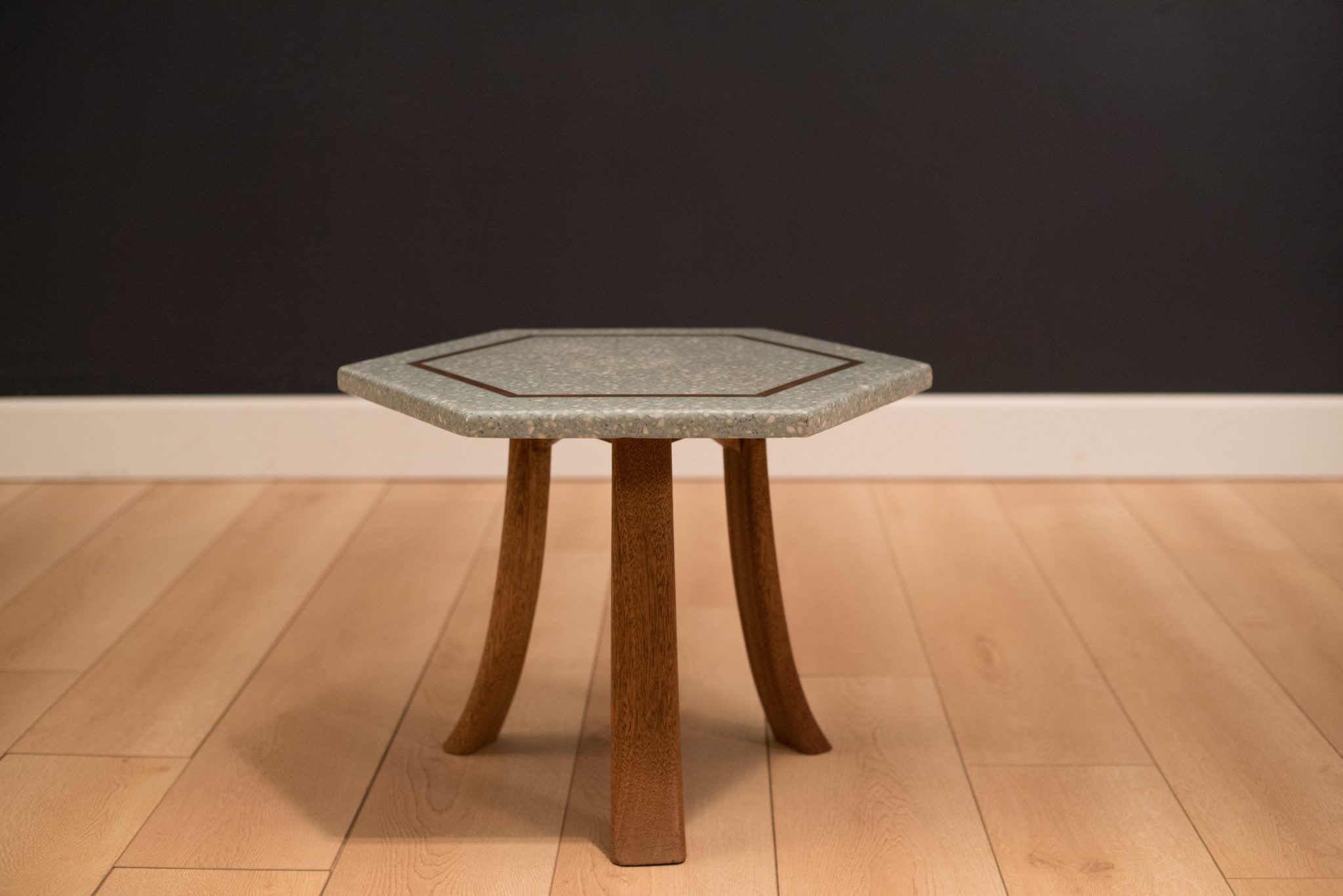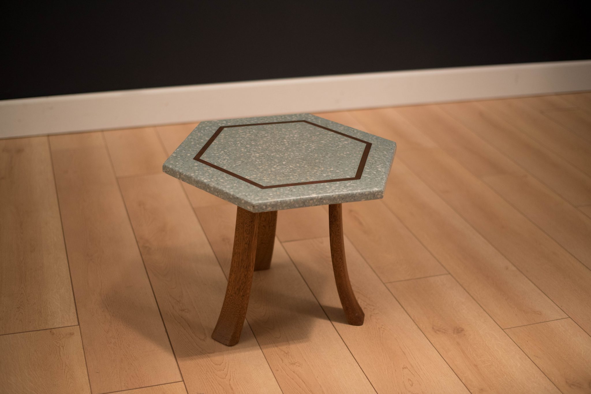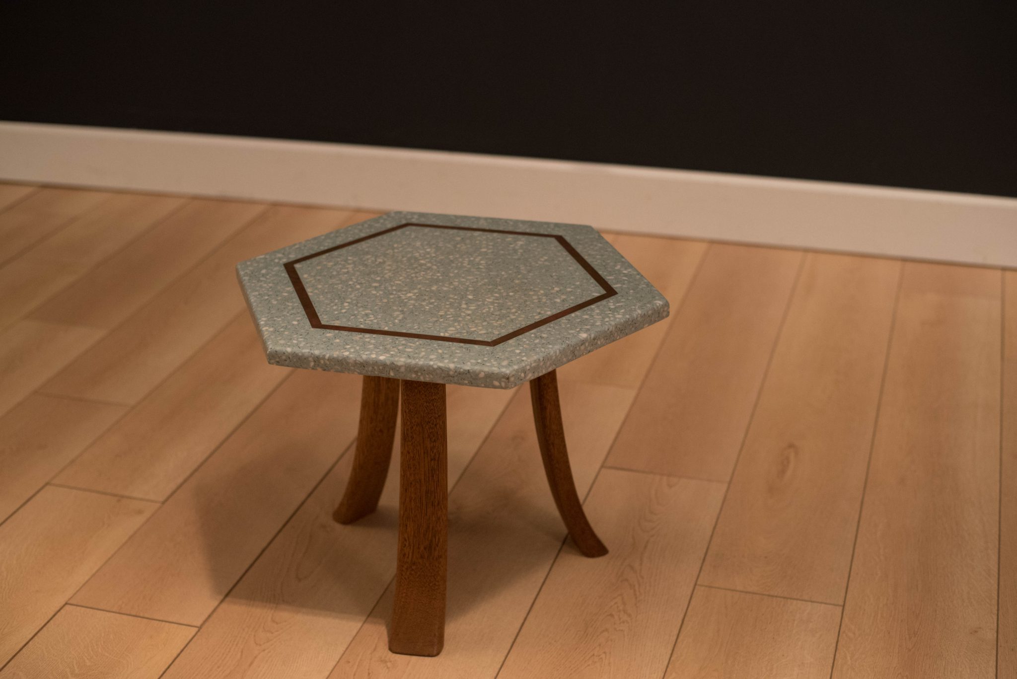 Mid Century Hexagonal Side Table designed by Harvey Probber. This piece displays a turquoise blue terrazzo top with brass inlay and sits on three solid sculpted mahogany legs. It is in great condition with minimal vintage wear.