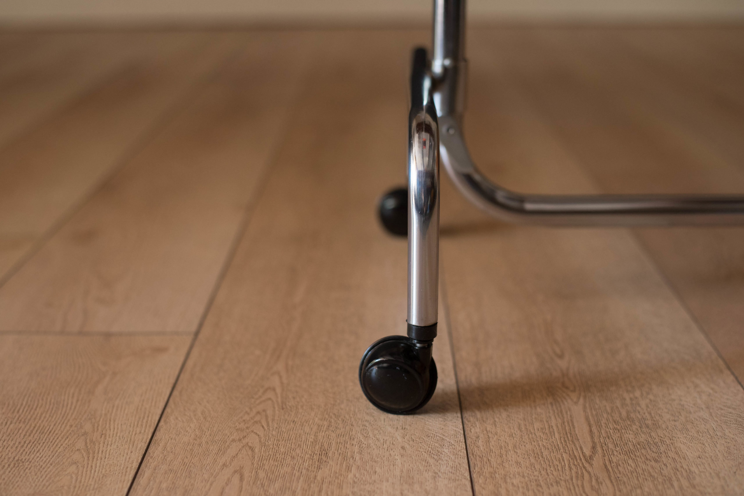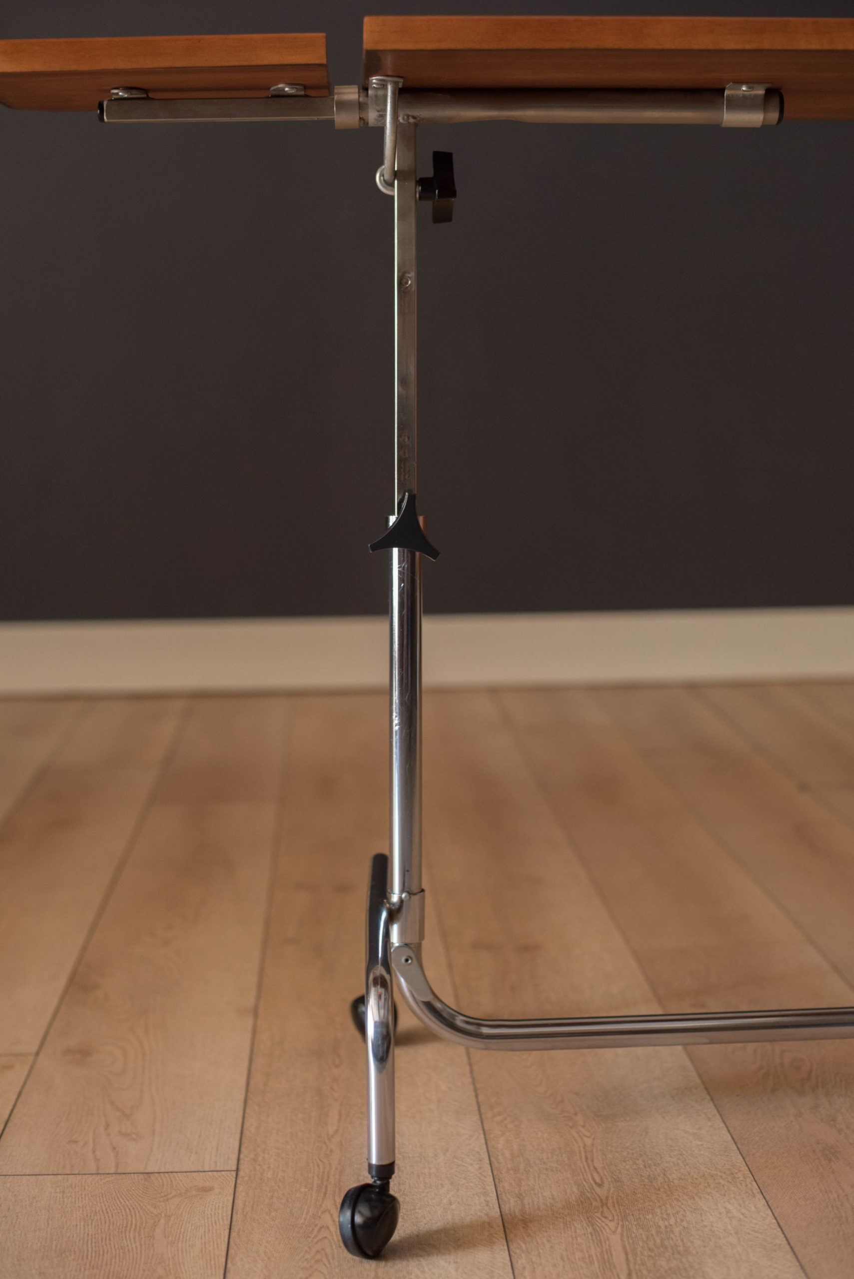 Mid-Century Modern ergonomic bedside reading stand in rosewood and chrome manufactured by H.M.N., Denmark circa 1970s. Features a tilting tray and a small fixed table designed with sculptural raised edges to catch pens or small accessories. The height is adjustable on the portable metal stand and rolls easily on casters. This versatile workstation is ideal for laptops, books, or to use as a sheet music stand. In good condition with patina on the metal and light scuffs on the plastic wheels and base.