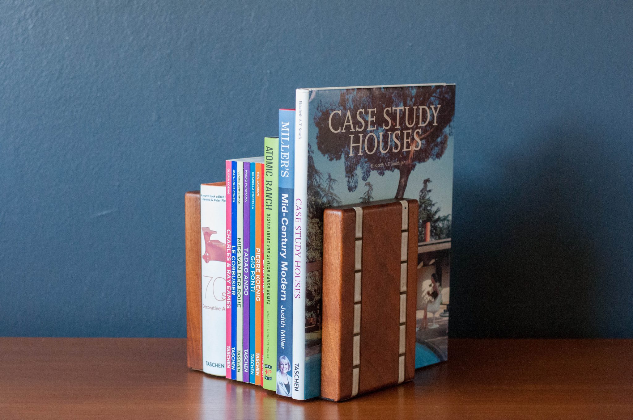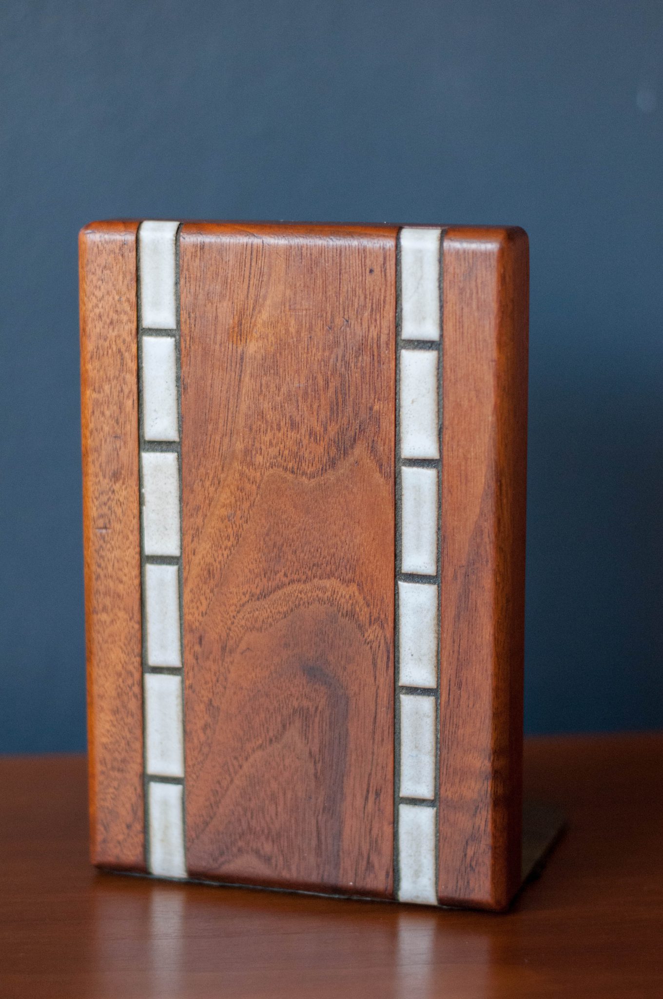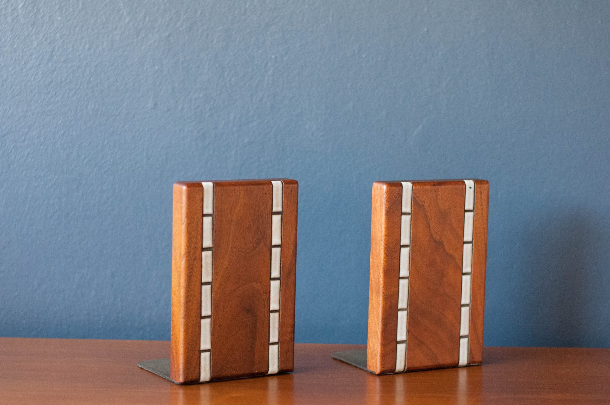 Mid Century pair of Jane and Gordon Martz Bookends for Marshall Studios. This set is made of walnut and ceramic tile. In good condition with minimal vintage wear.