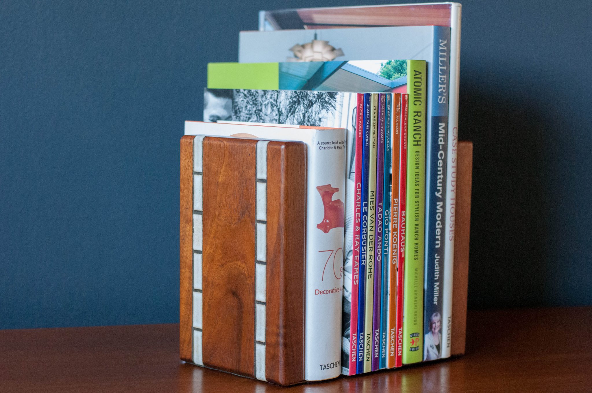 Mid Century pair of Jane and Gordon Martz Bookends for Marshall Studios. This set is made of walnut and ceramic tile. In good condition with minimal vintage wear.