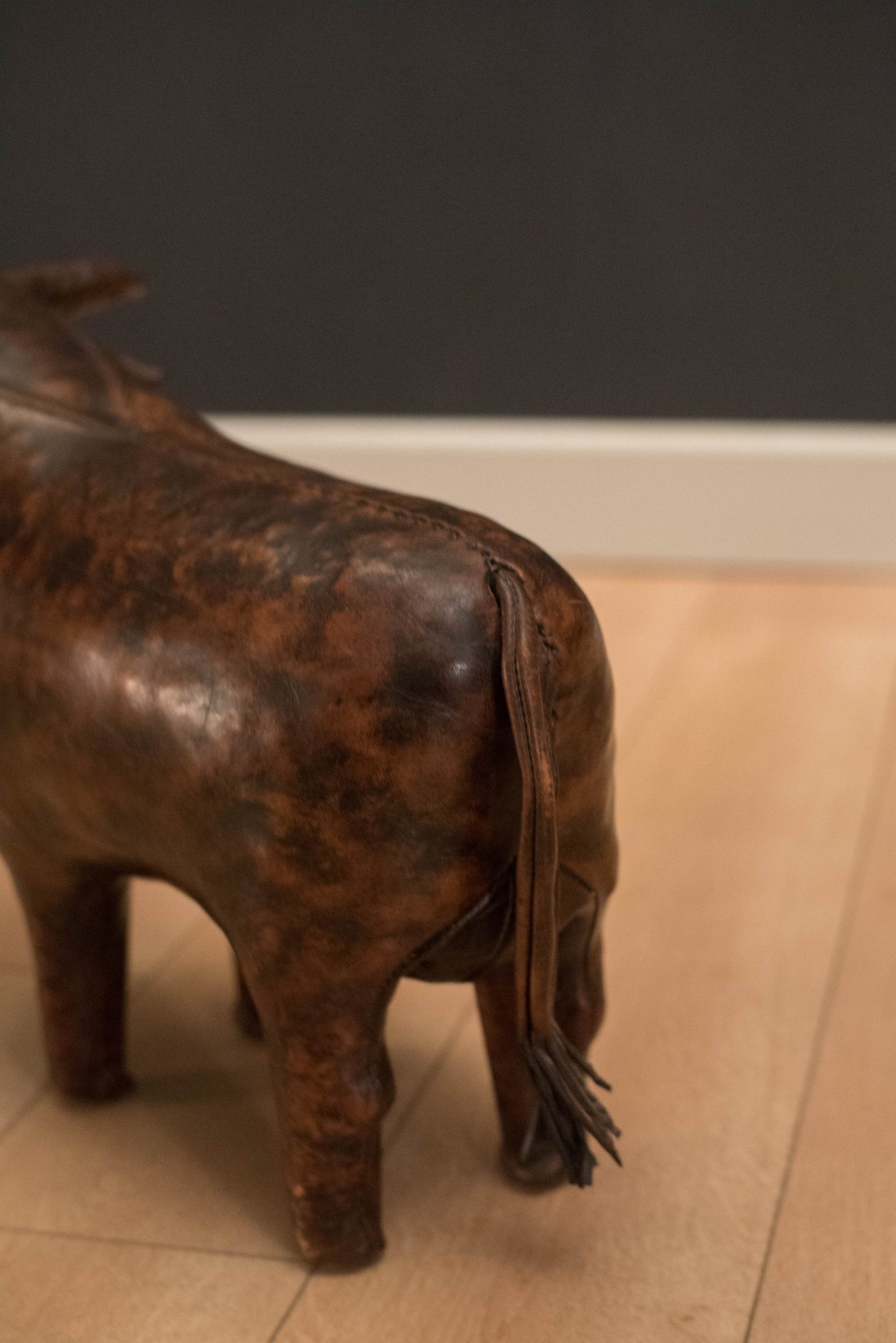 Vintage original leather bull designed by Dimitri Omersa for Abercrombie and Fitch. This unique piece features hand-stitched aged leather with tail intact.