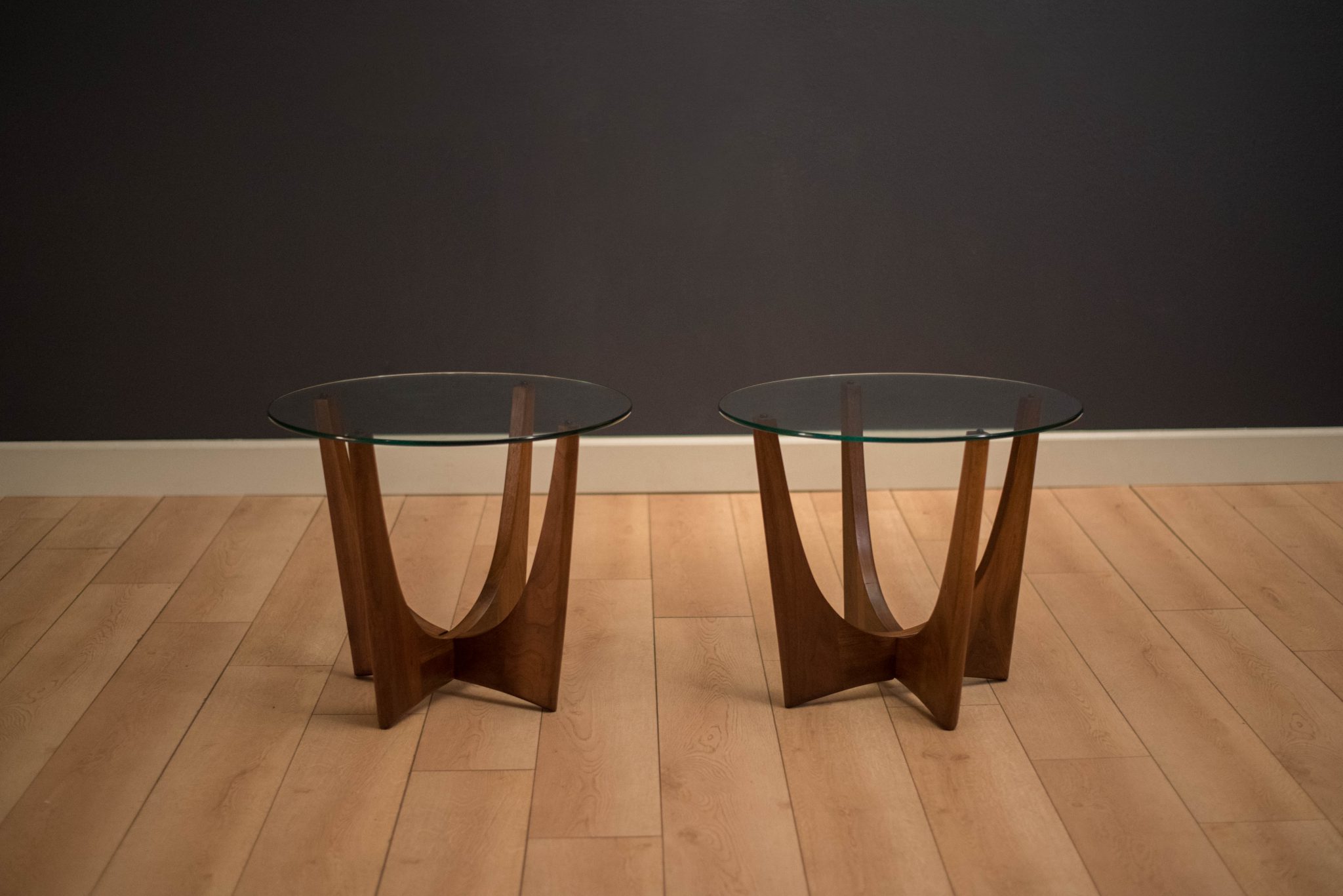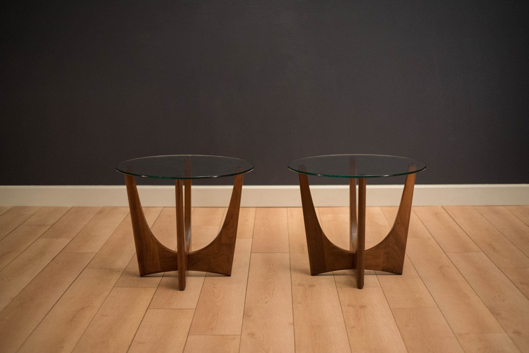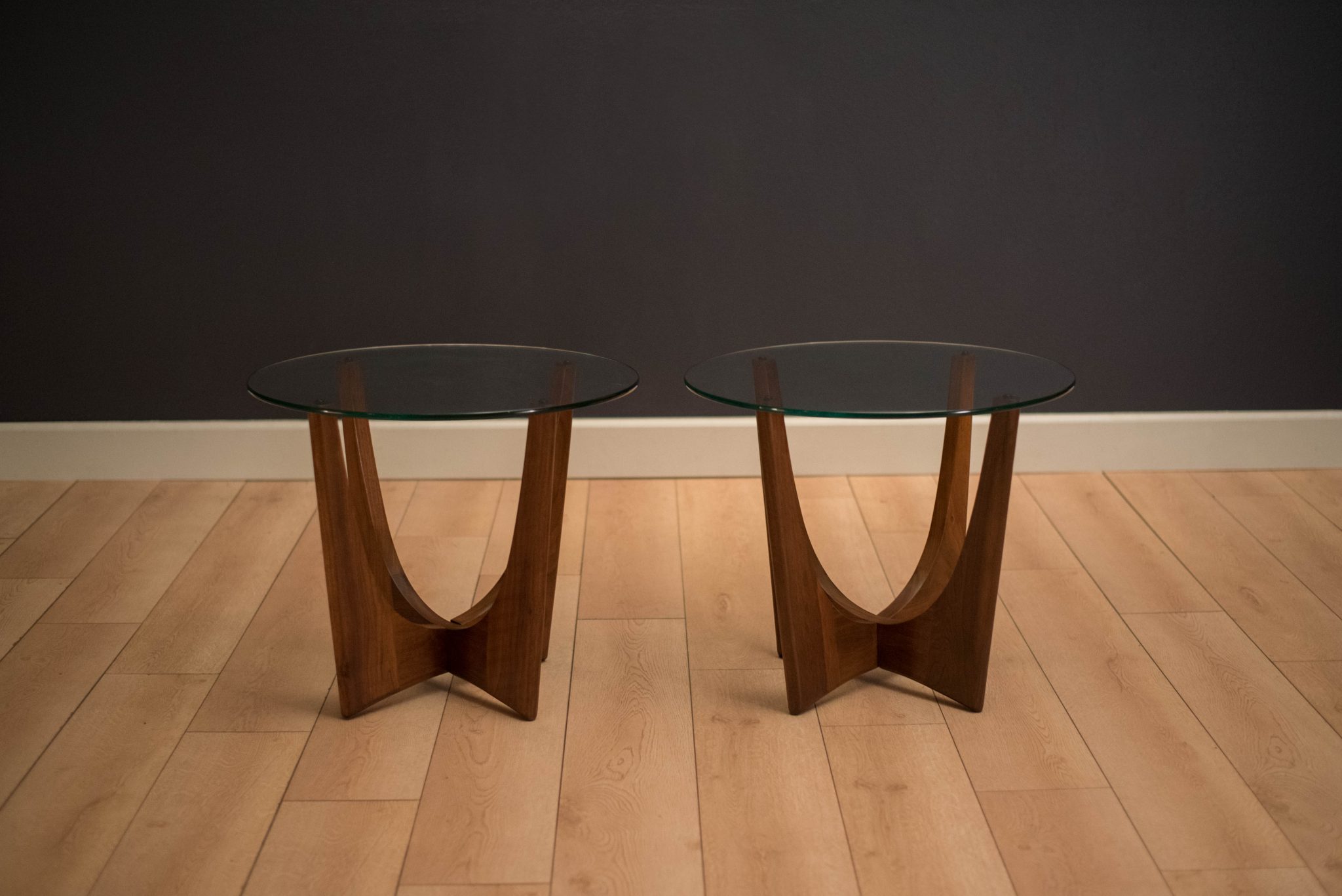 Mid-century modern pair of side tables designed by Adrian Pearsall for Craft Associates. This set is made of solid sculpted walnut with a round glass top. Price is for the pair. Matching coffee table also available in separate listing.