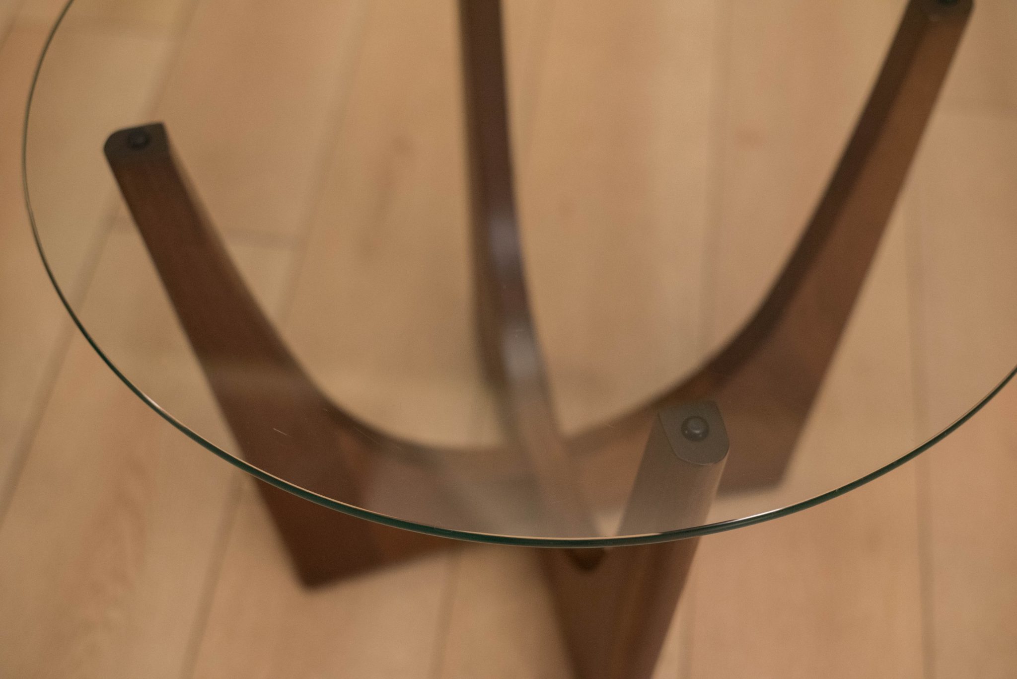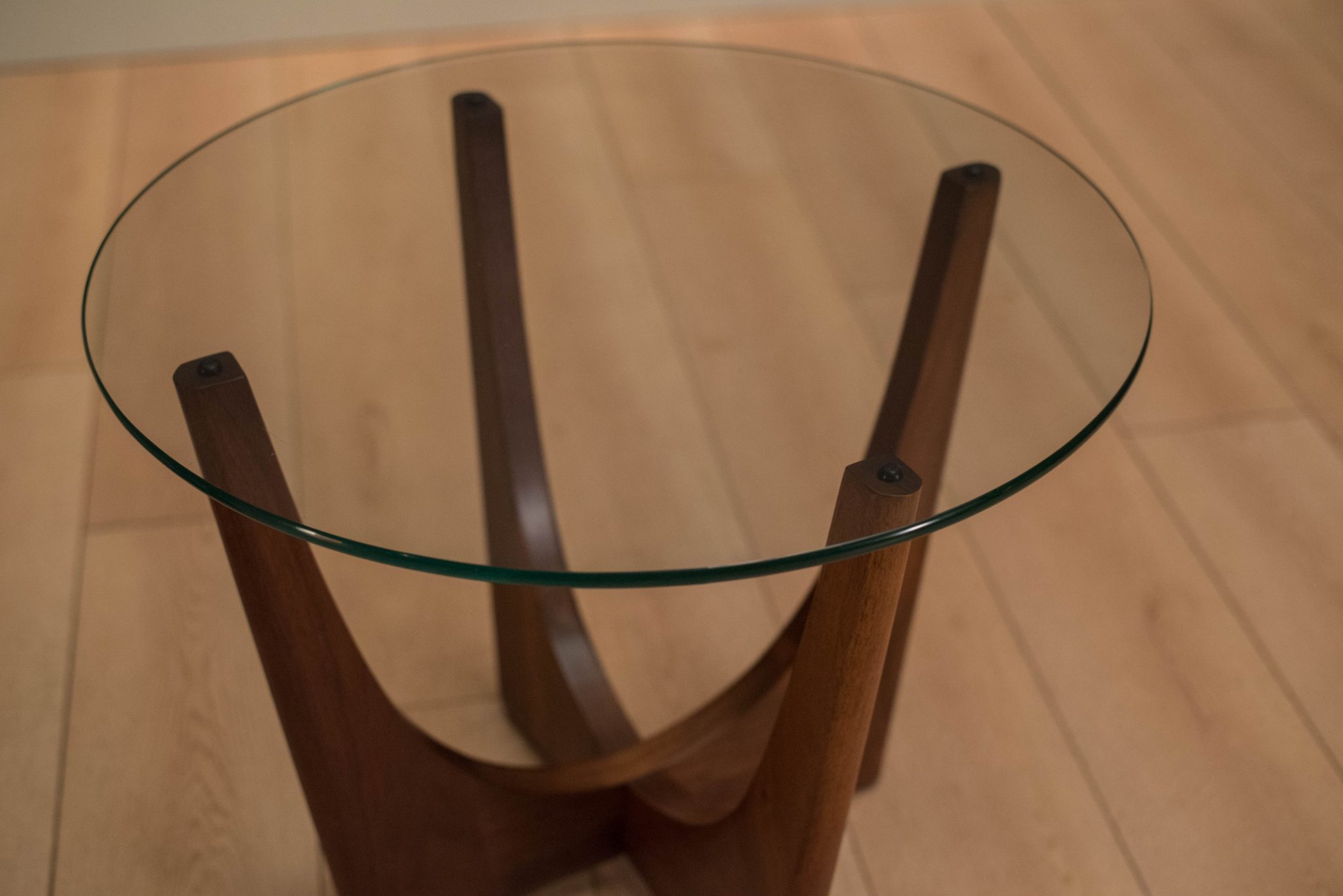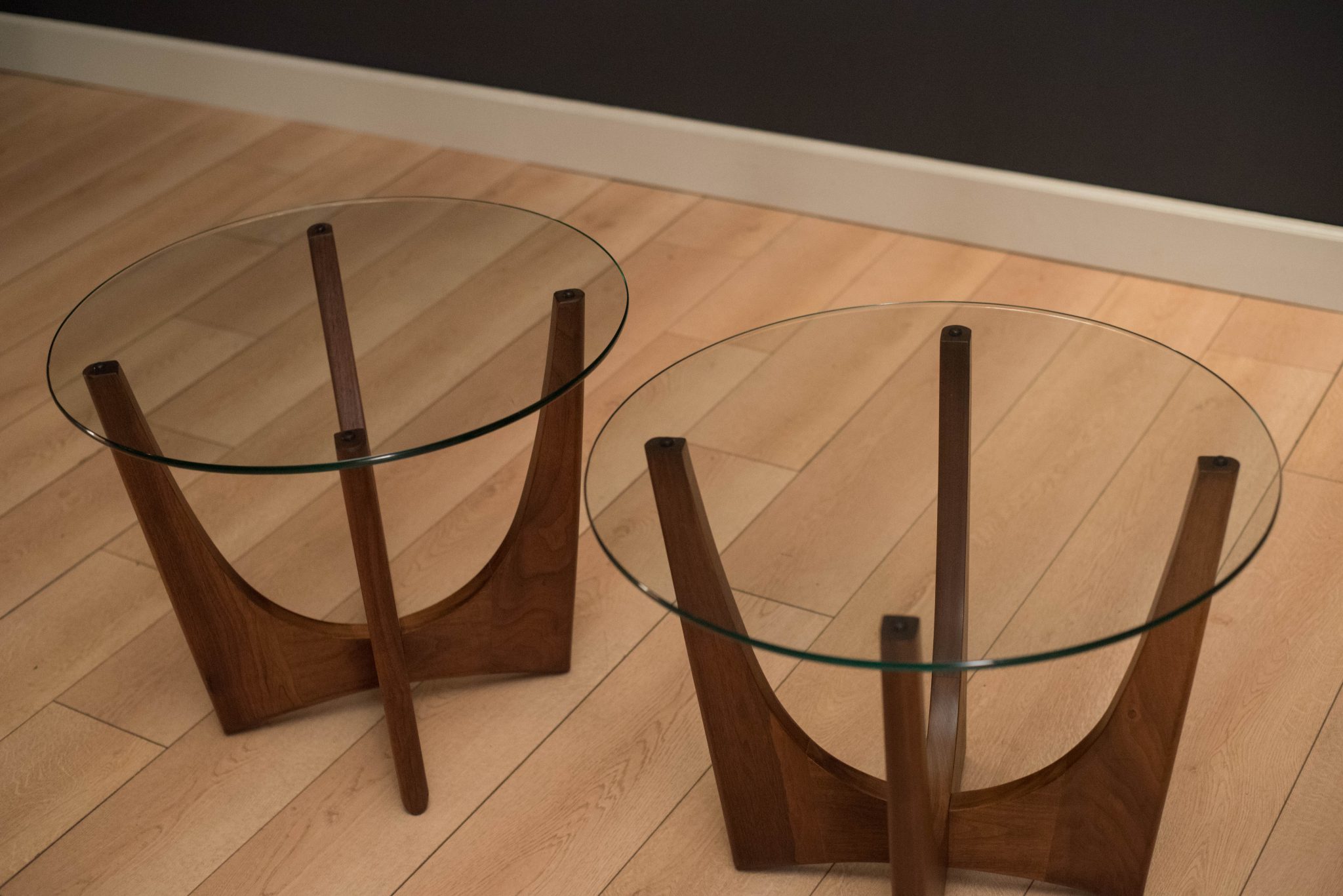Mid-century modern pair of side tables designed by Adrian Pearsall for Craft Associates. This set is made of solid sculpted walnut with a round glass top. Price is for the pair. Matching coffee table also available in separate listing.