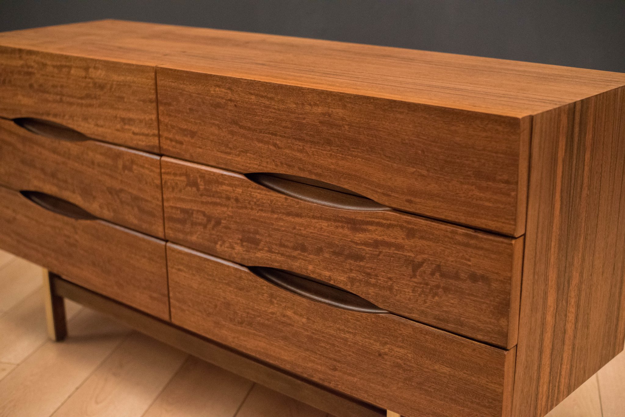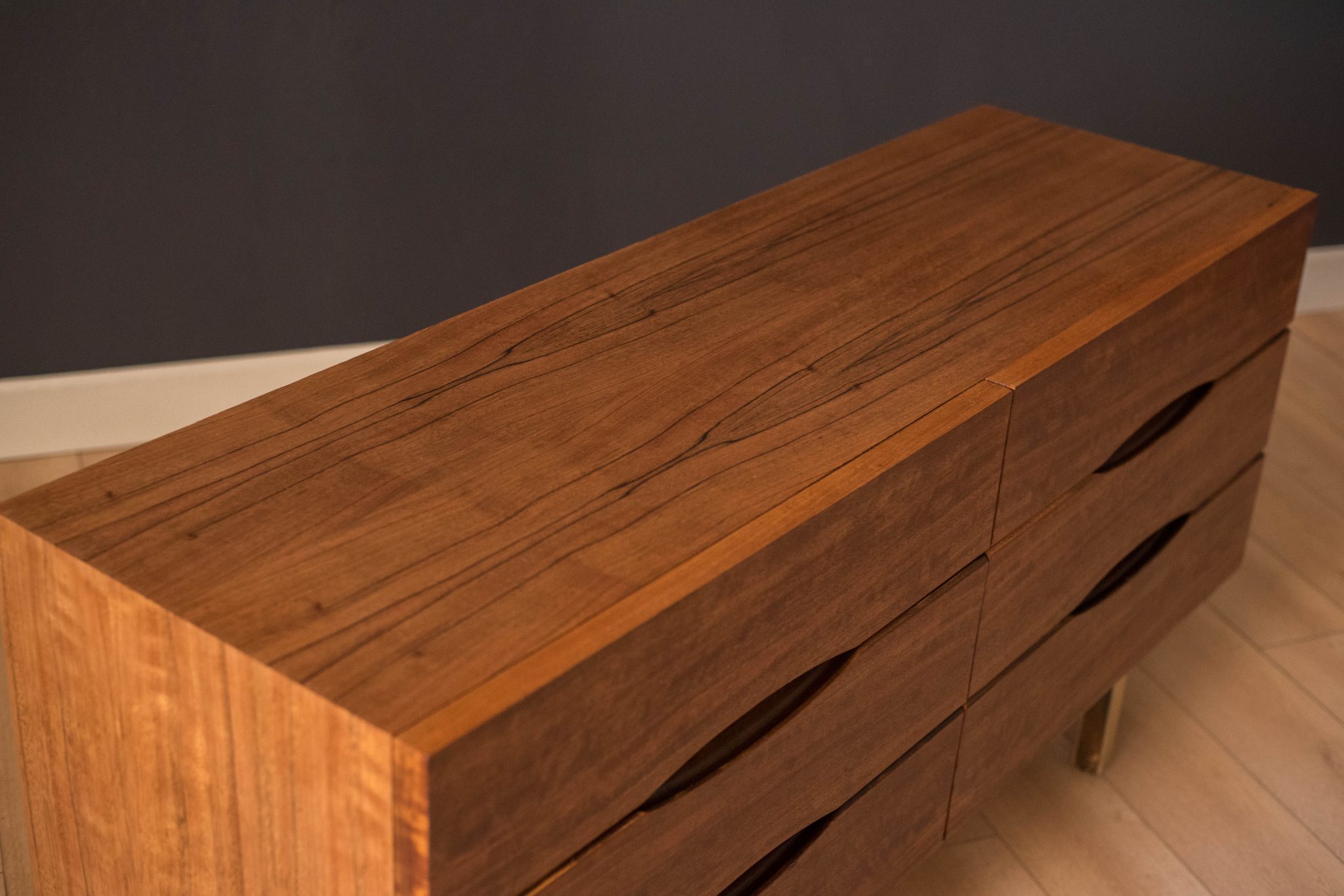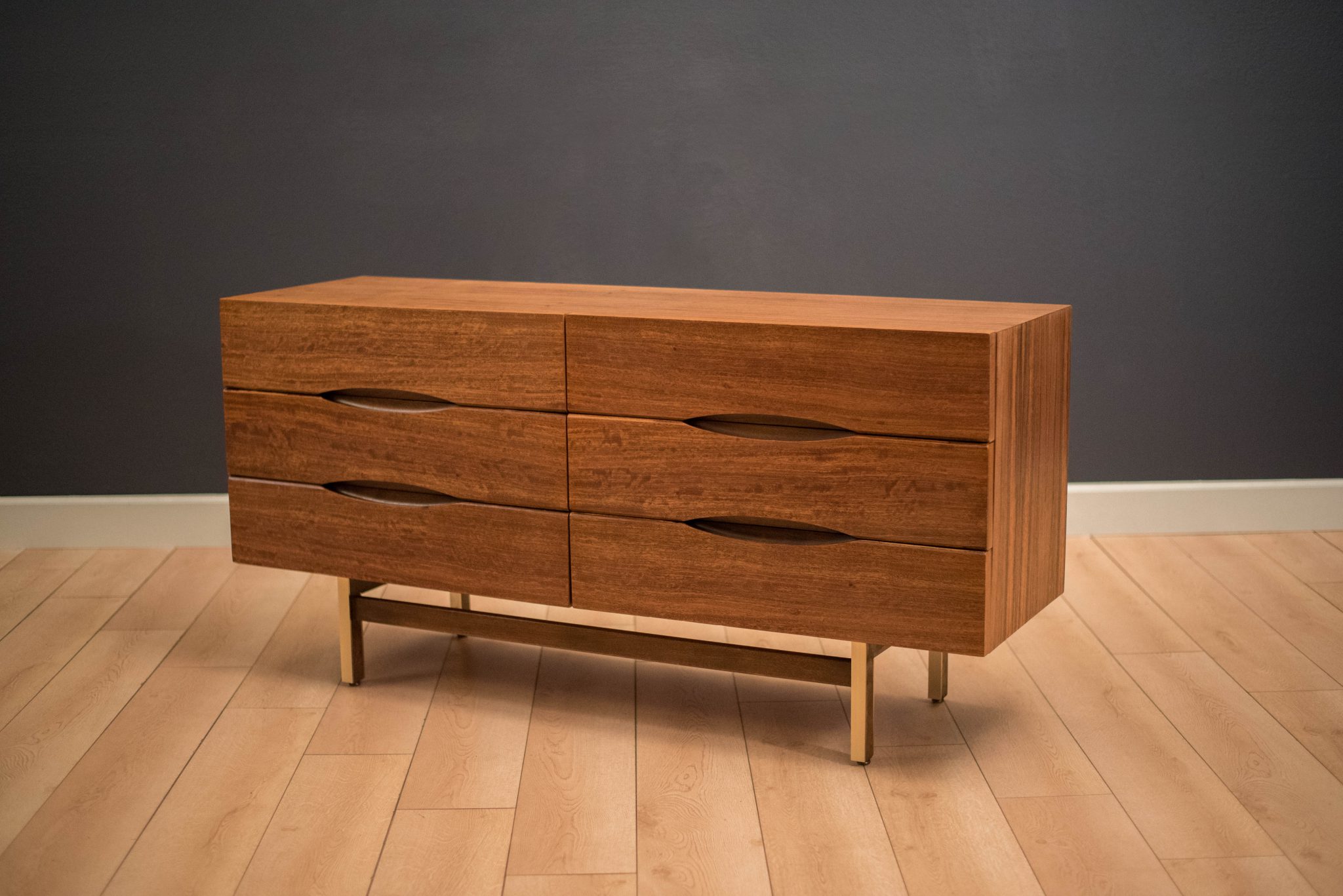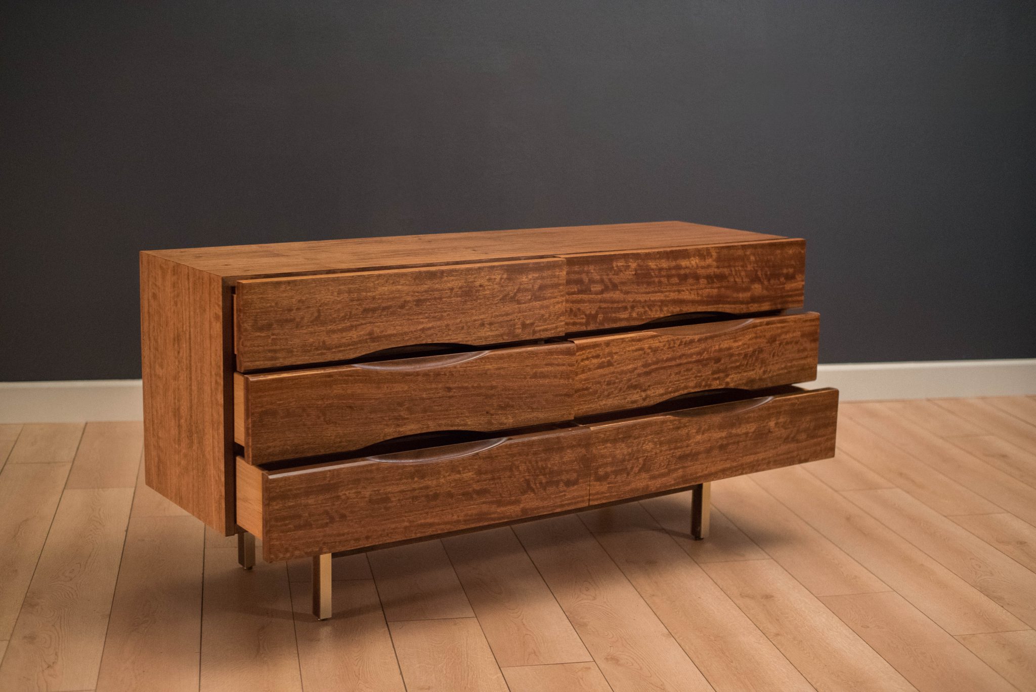 Vintage double dresser manufactured by American of Martinsville in mahogany. This piece includes six storage drawers with sculpted eye pulls and brass accents.