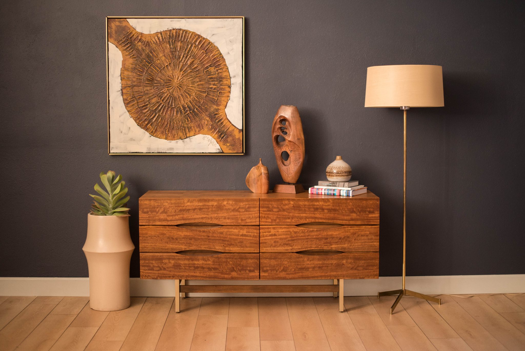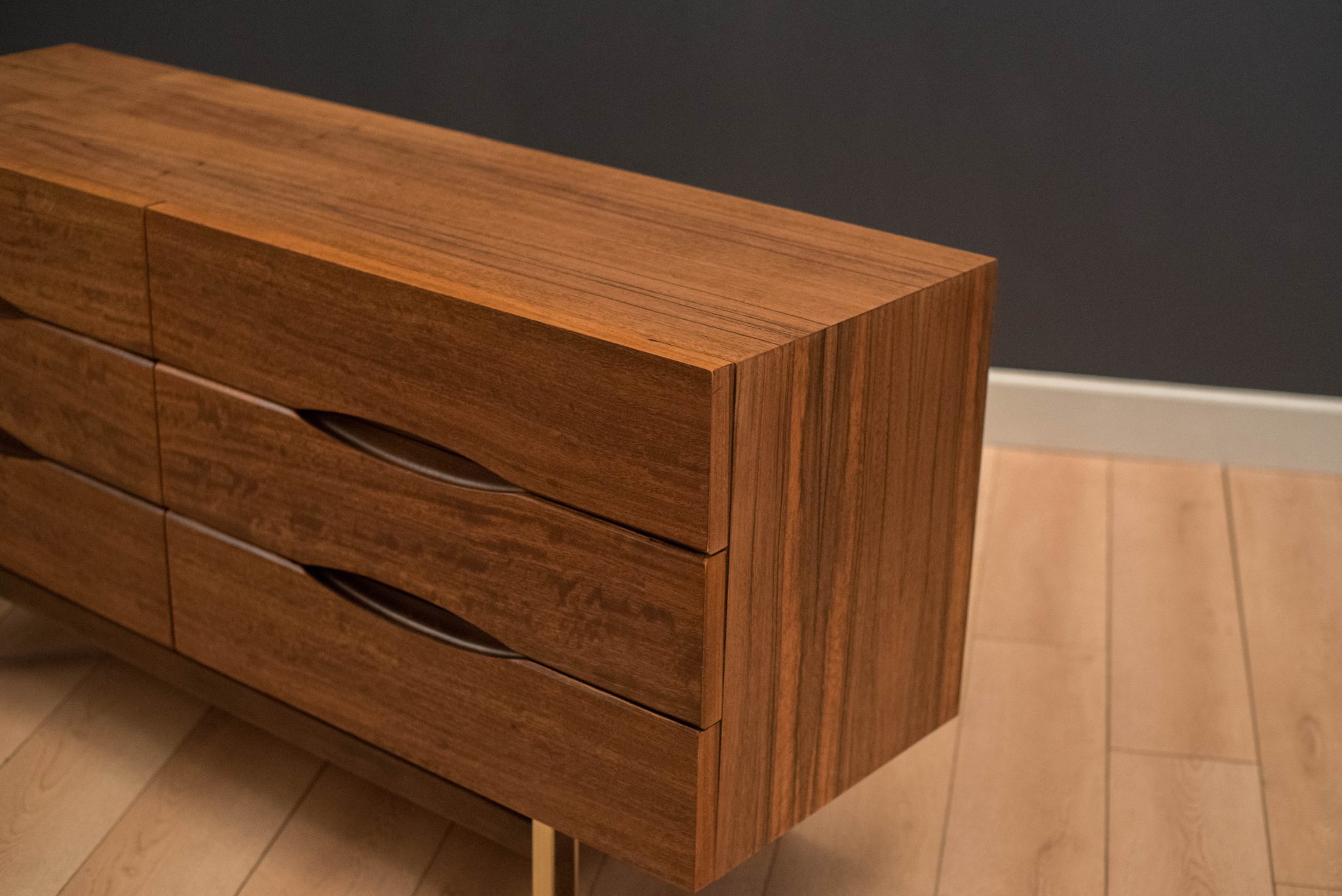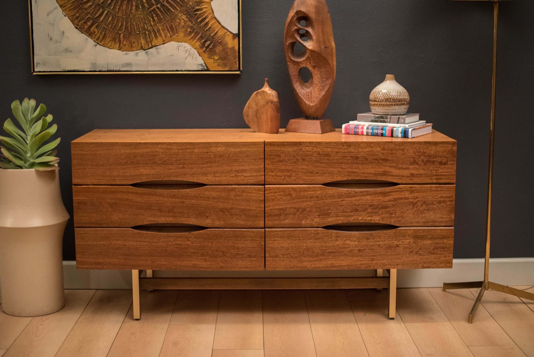 Vintage double dresser manufactured by American of Martinsville in mahogany. This piece includes six storage drawers with sculpted eye pulls and brass accents.