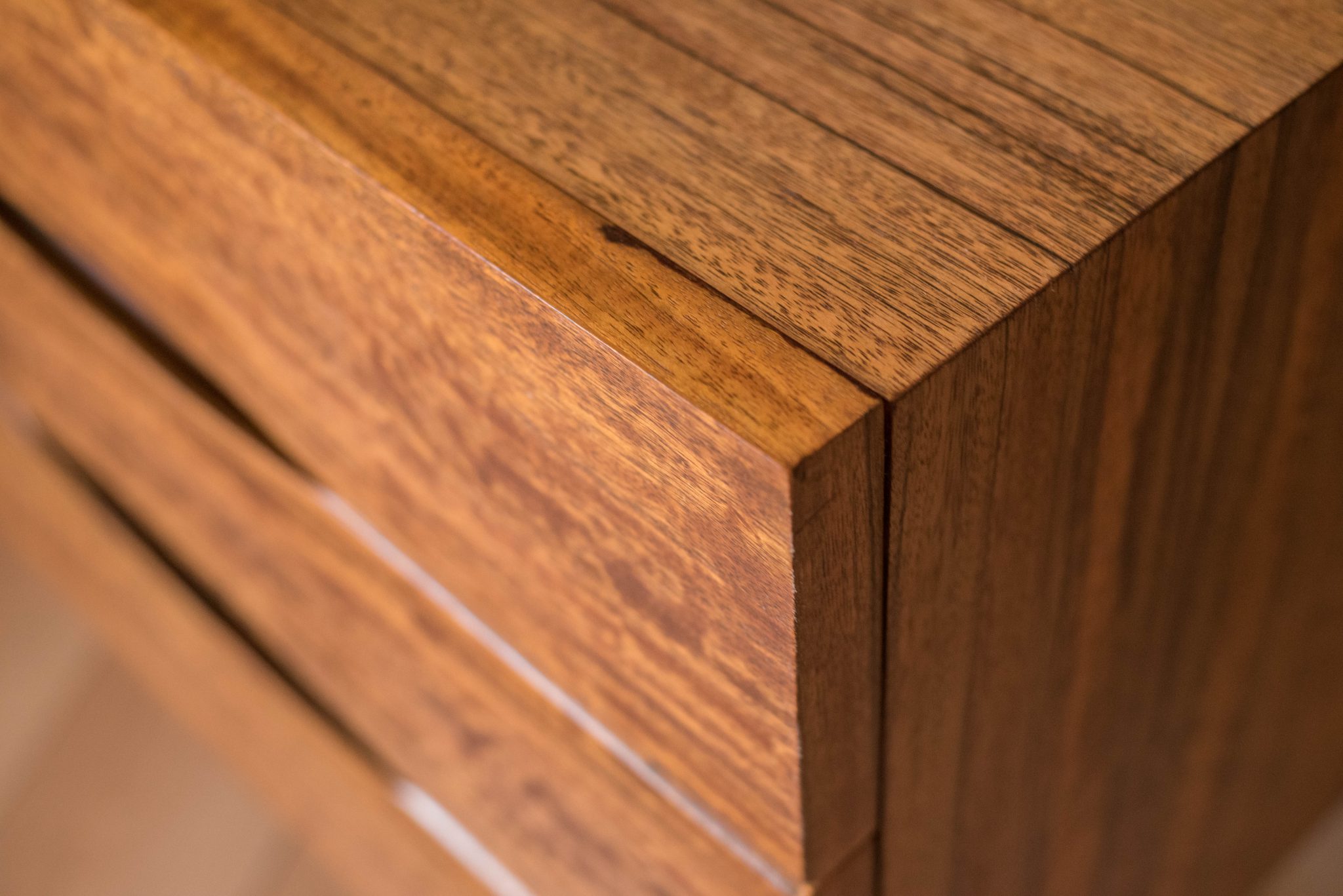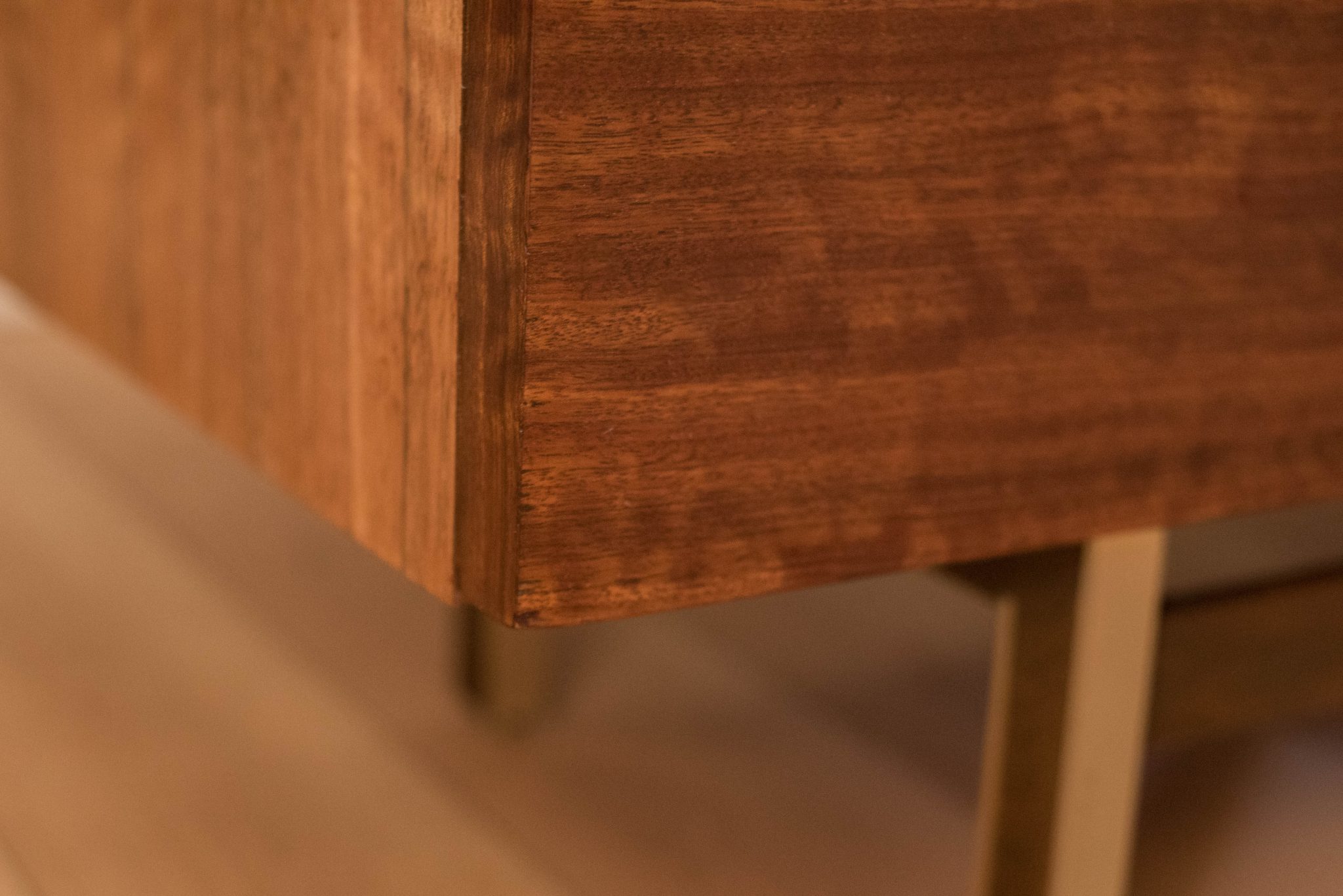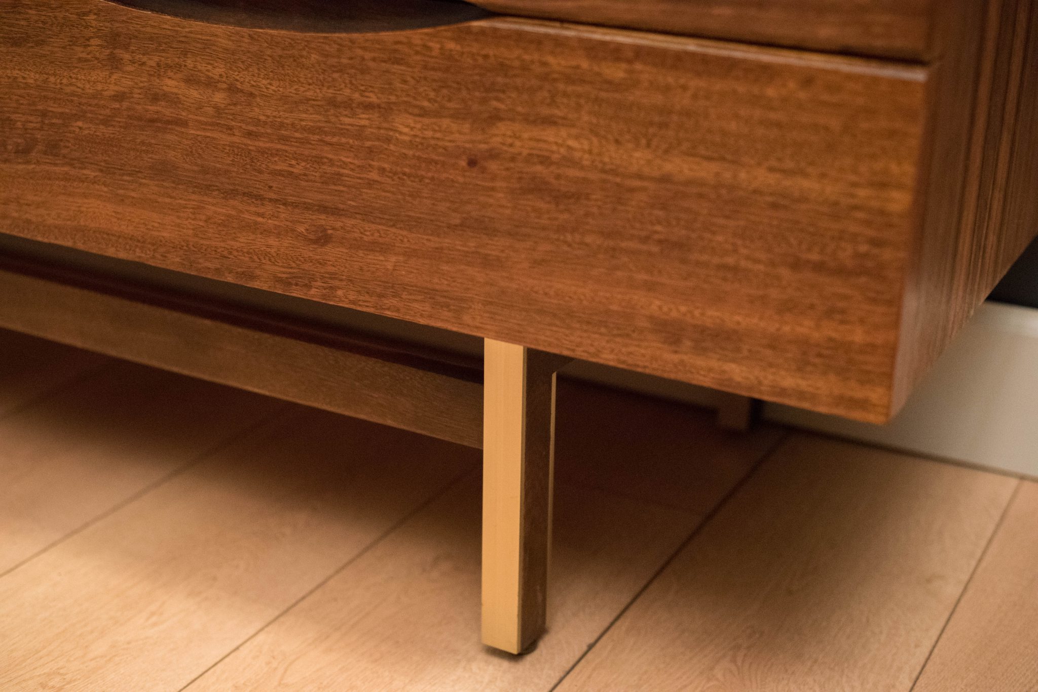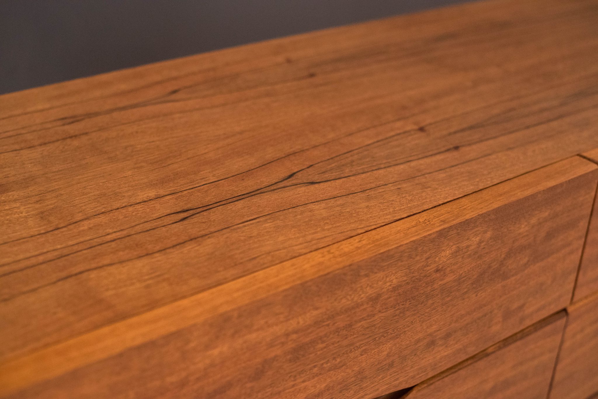 Vintage double dresser manufactured by American of Martinsville in mahogany. This piece includes six storage drawers with sculpted eye pulls and brass accents.