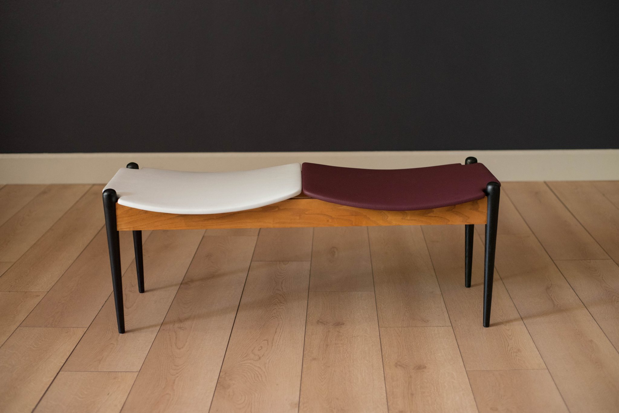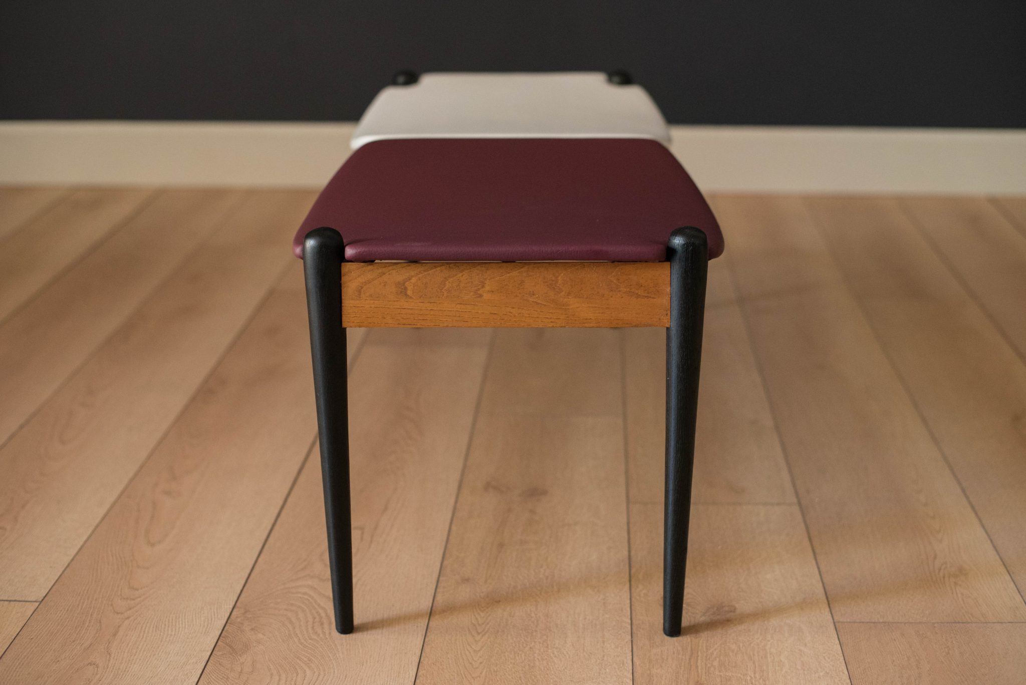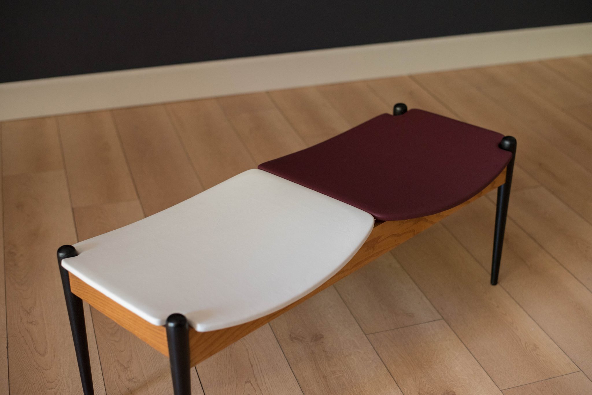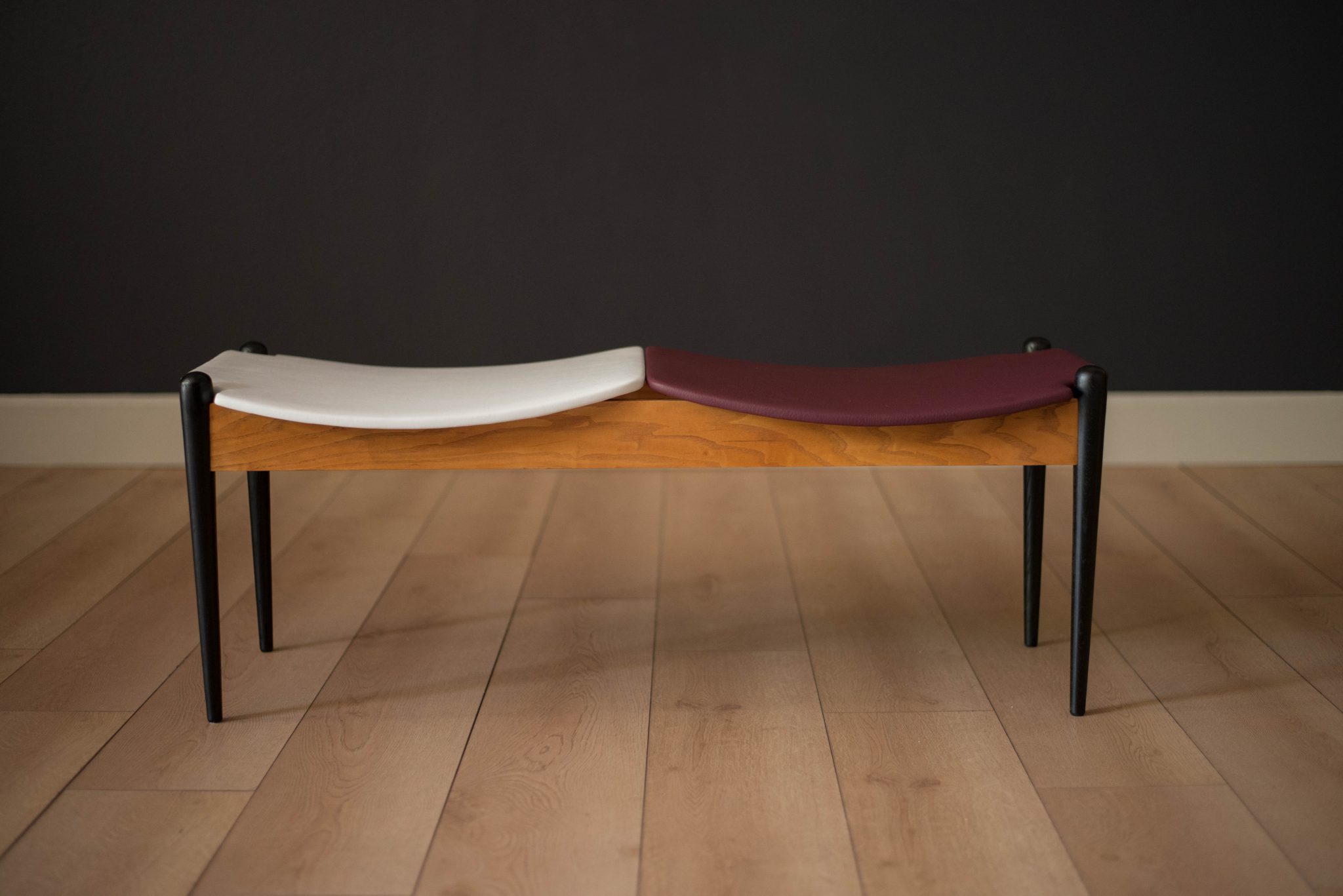 Classic Mid-Century Modern designed bench by Arthur Umanoff for Washington Wood Prod. Inc. This versatile piece features two-tone double seating reupholstered in white and maroon vinyl. Perfect to use as an entryway or bedside bench.