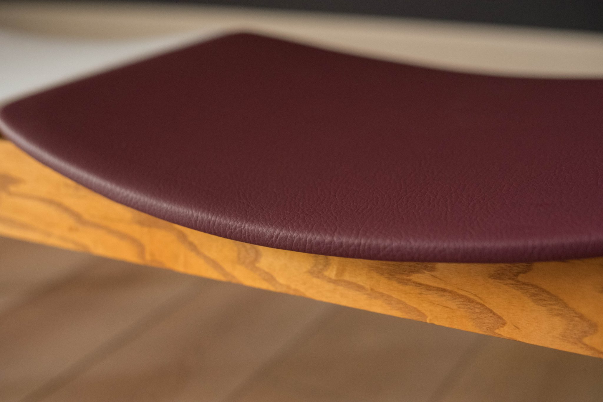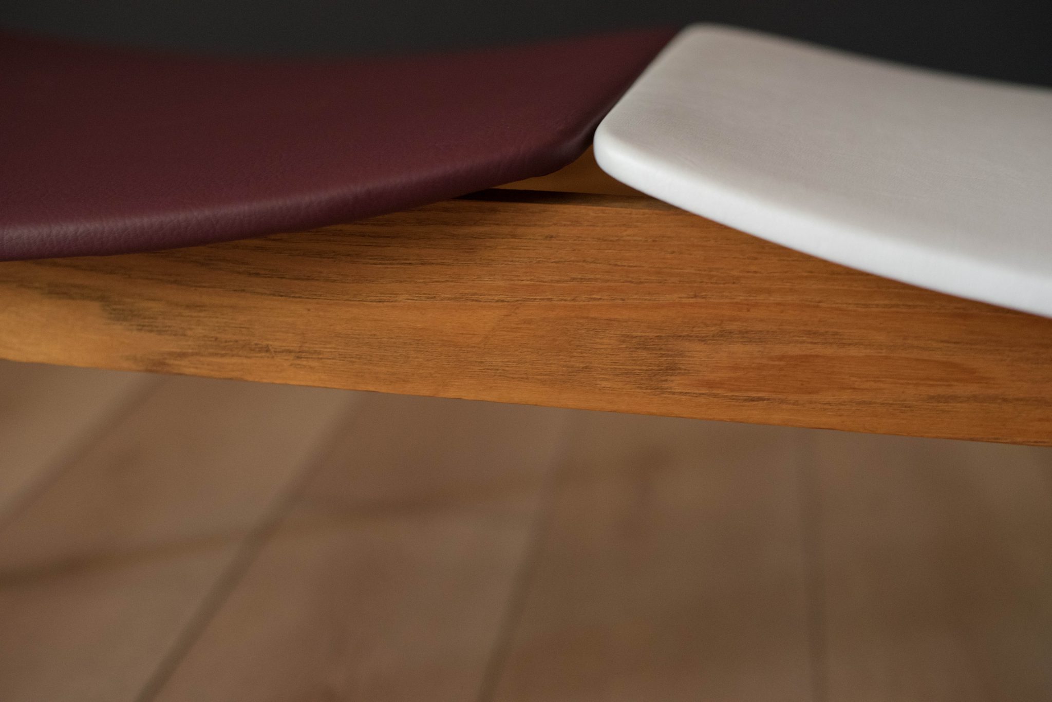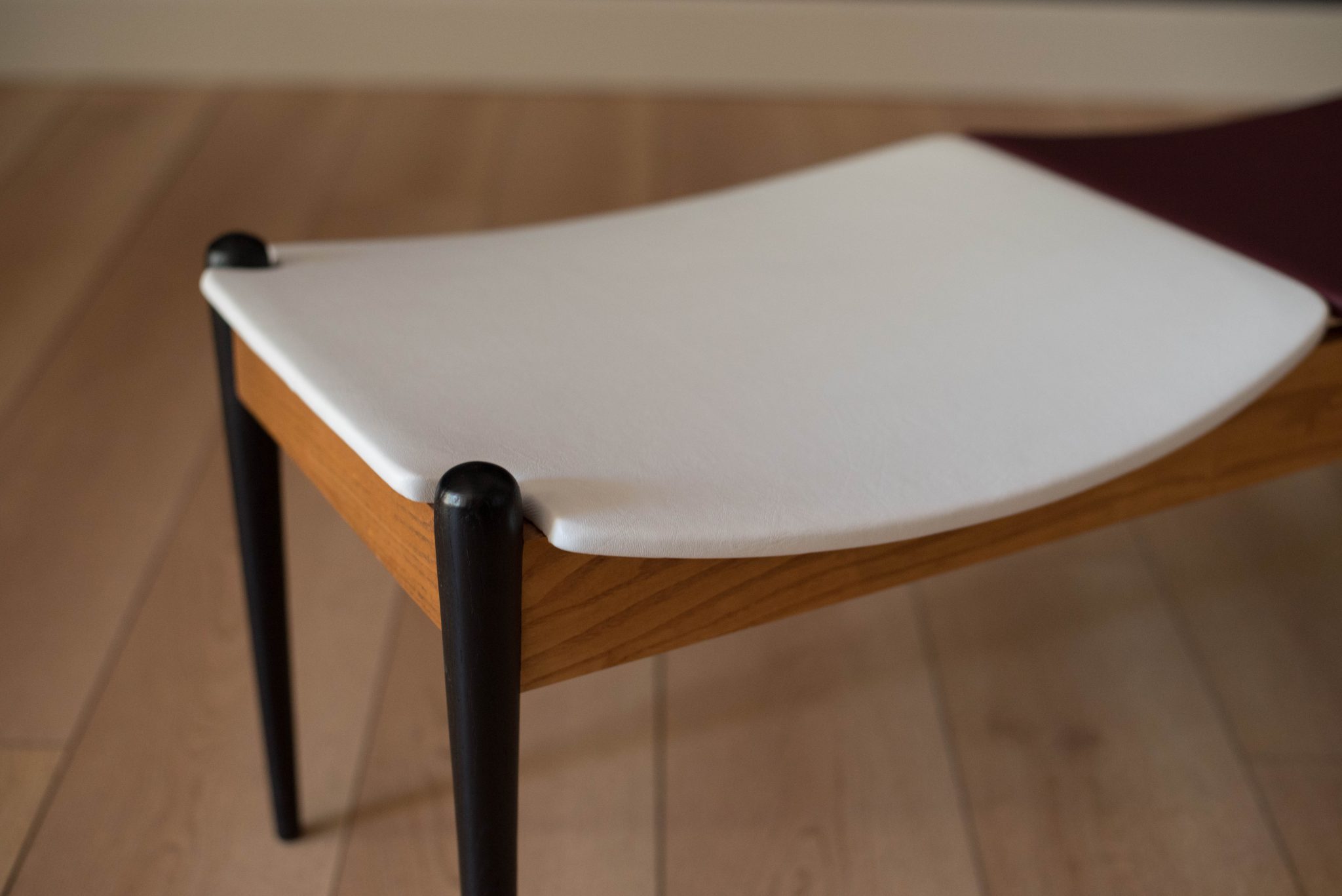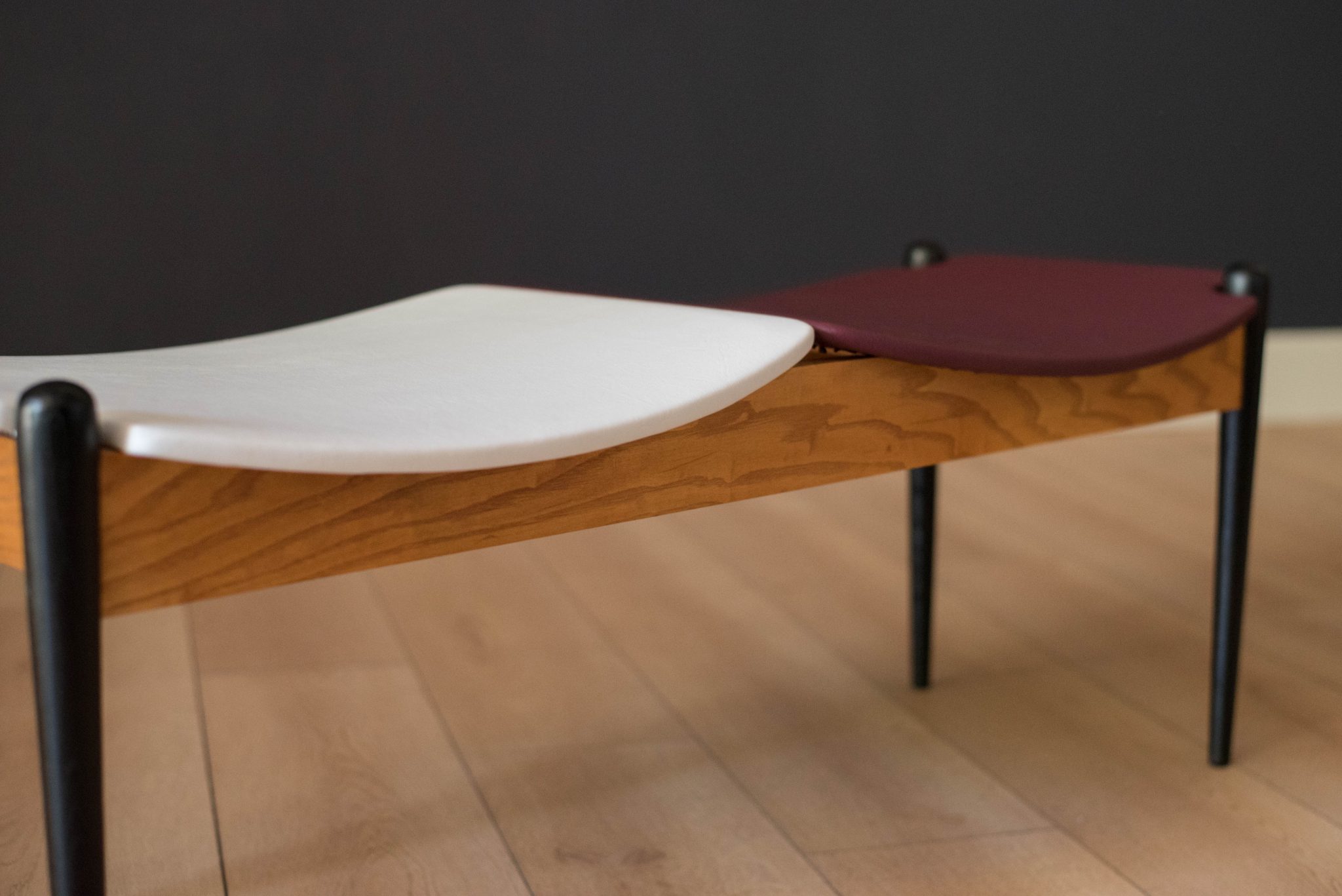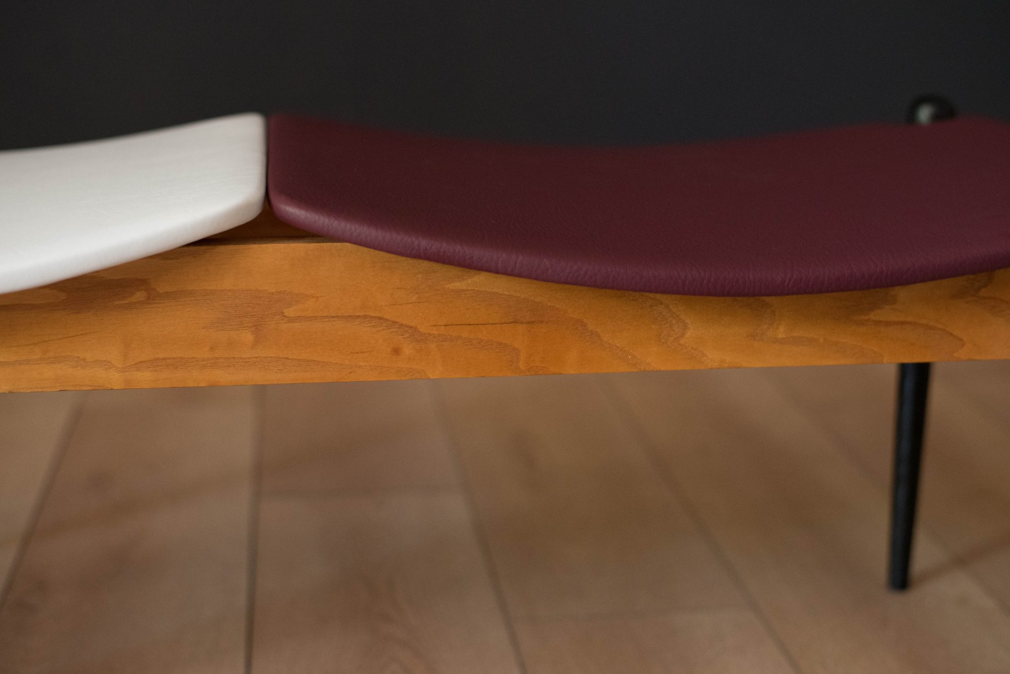 Classic Mid-Century Modern designed bench by Arthur Umanoff for Washington Wood Prod. Inc. This versatile piece features two-tone double seating reupholstered in white and maroon vinyl. Perfect to use as an entryway or bedside bench.