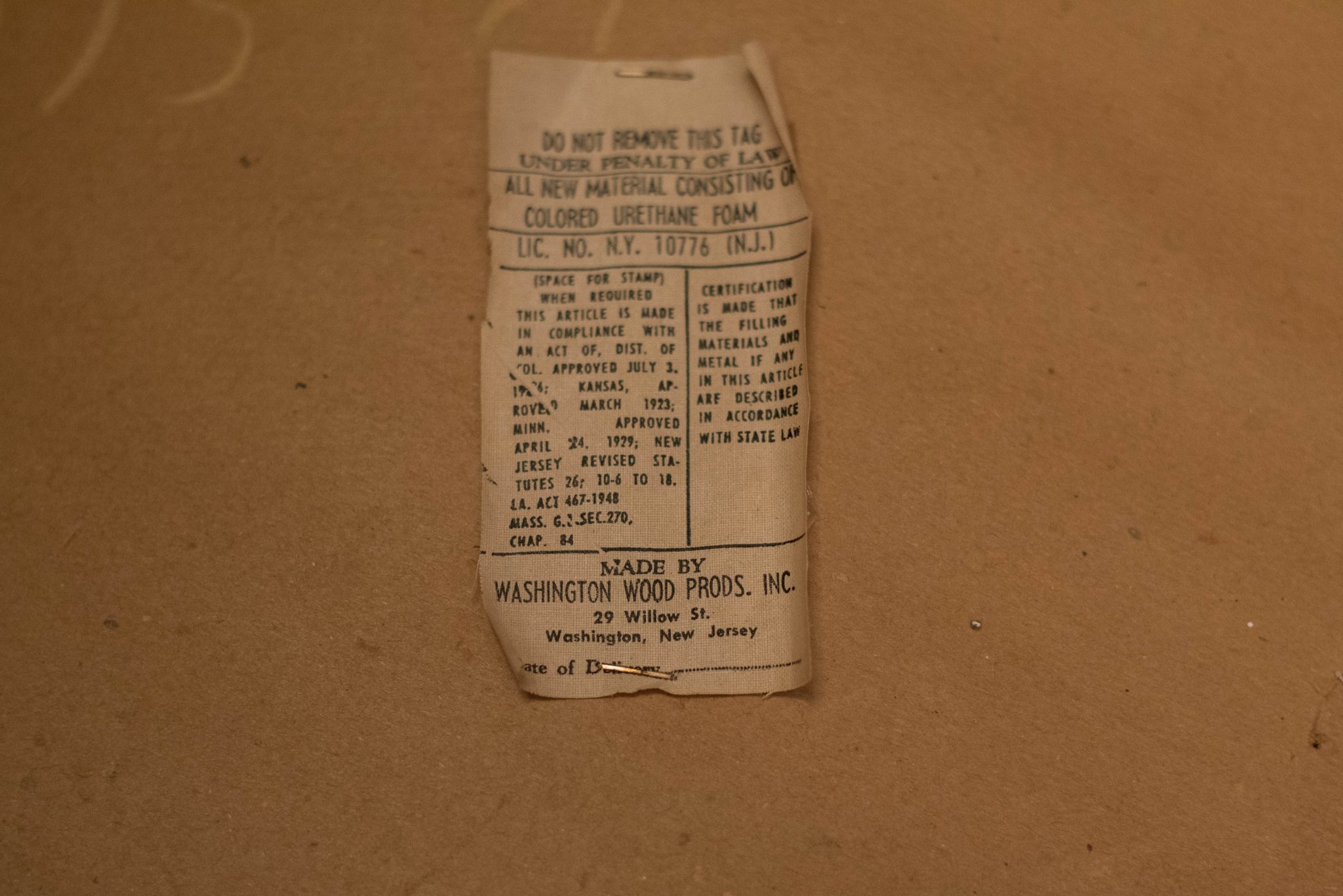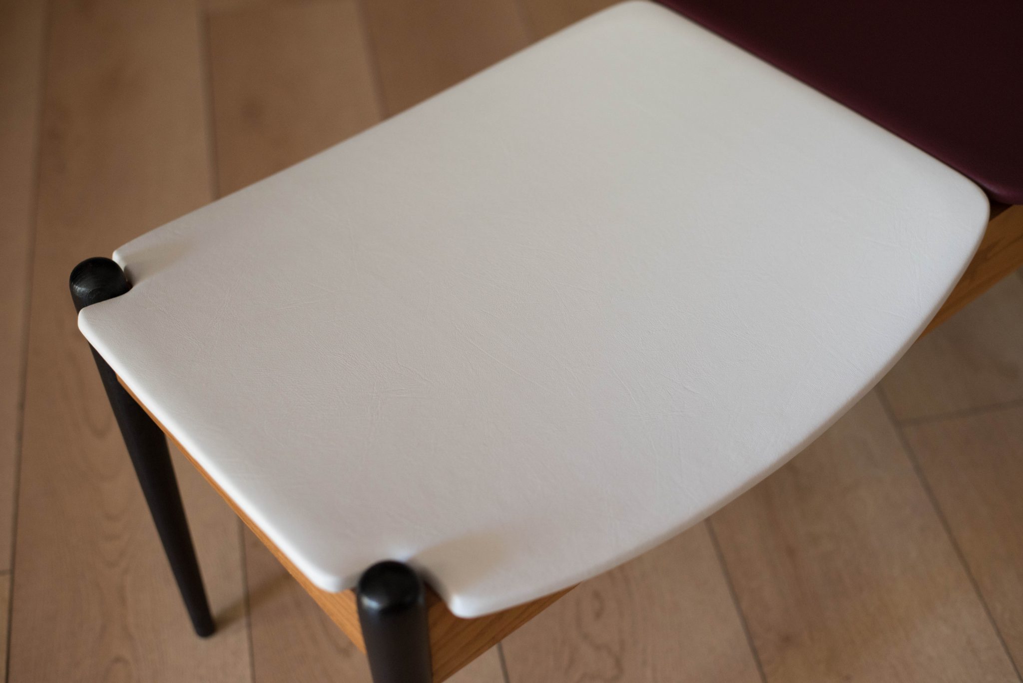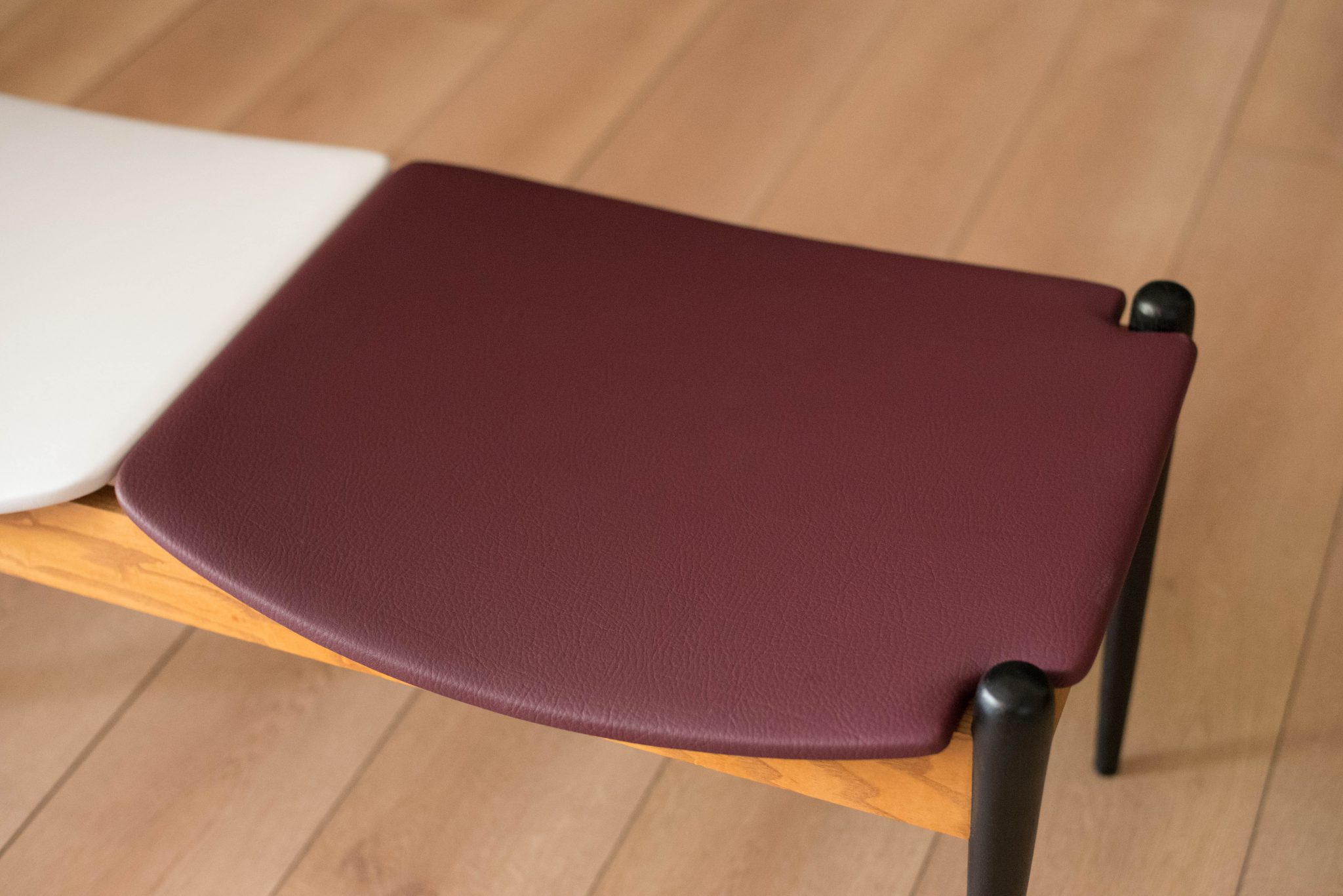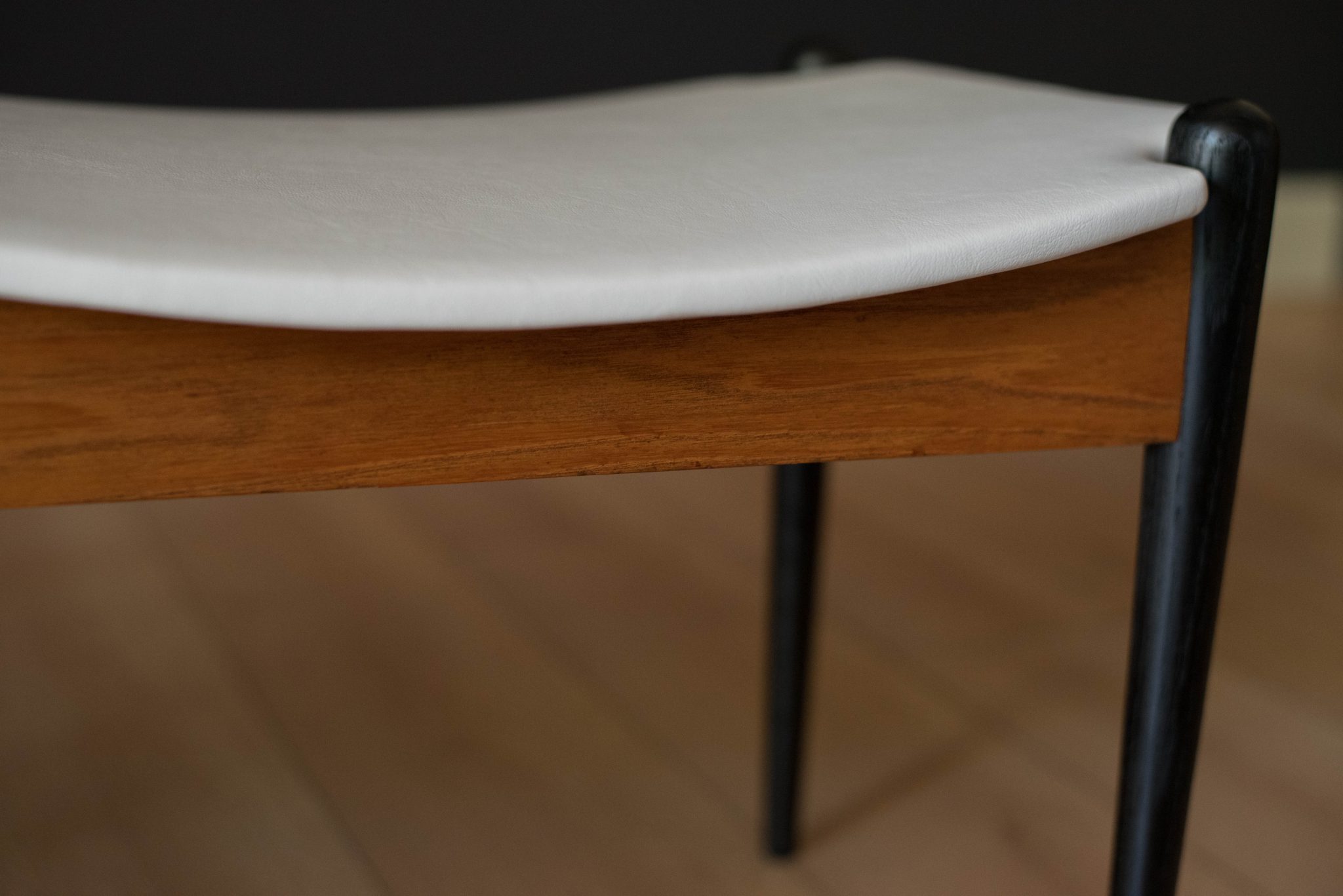 Classic Mid-Century Modern designed bench by Arthur Umanoff for Washington Wood Prod. Inc. This versatile piece features two-tone double seating reupholstered in white and maroon vinyl. Perfect to use as an entryway or bedside bench.