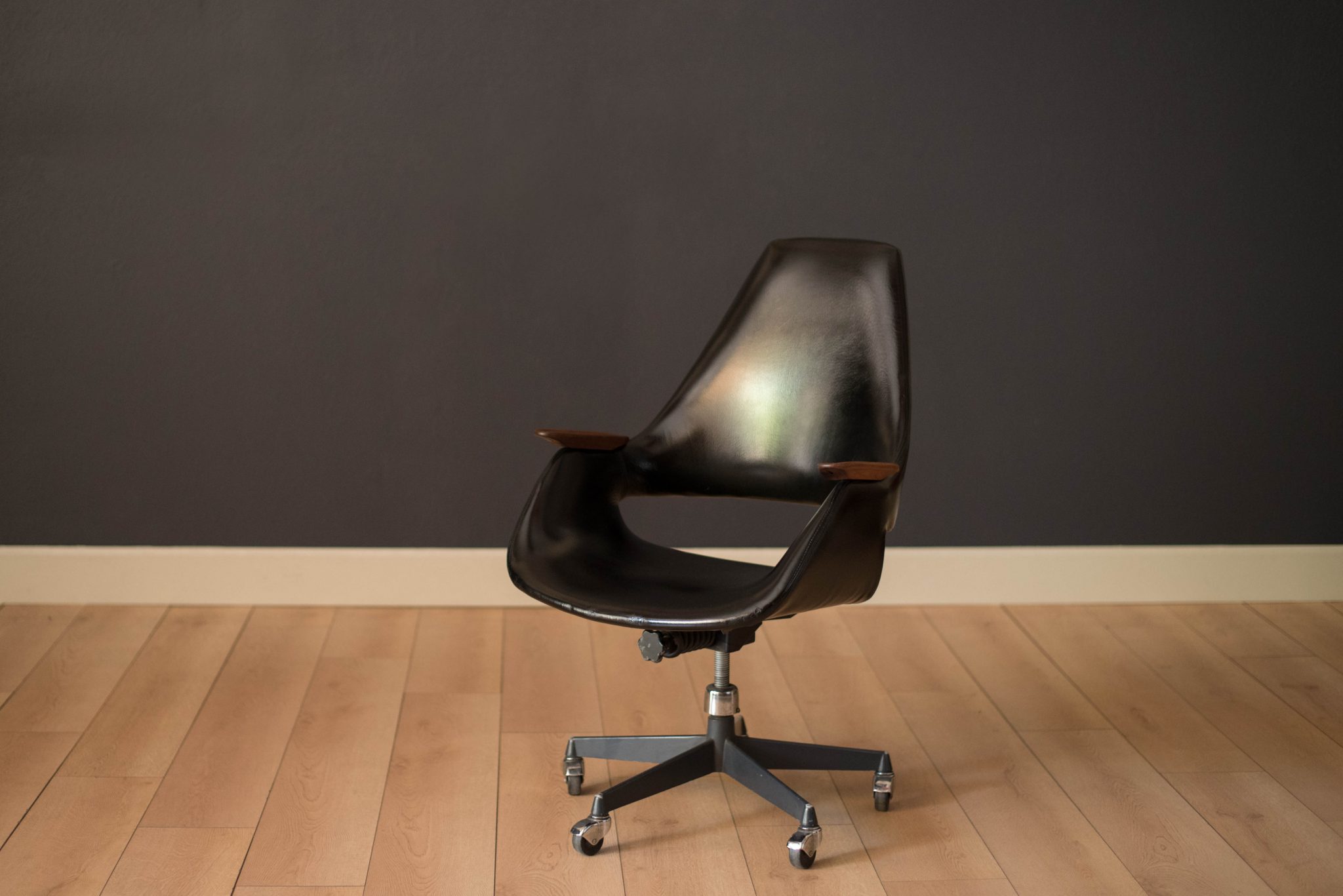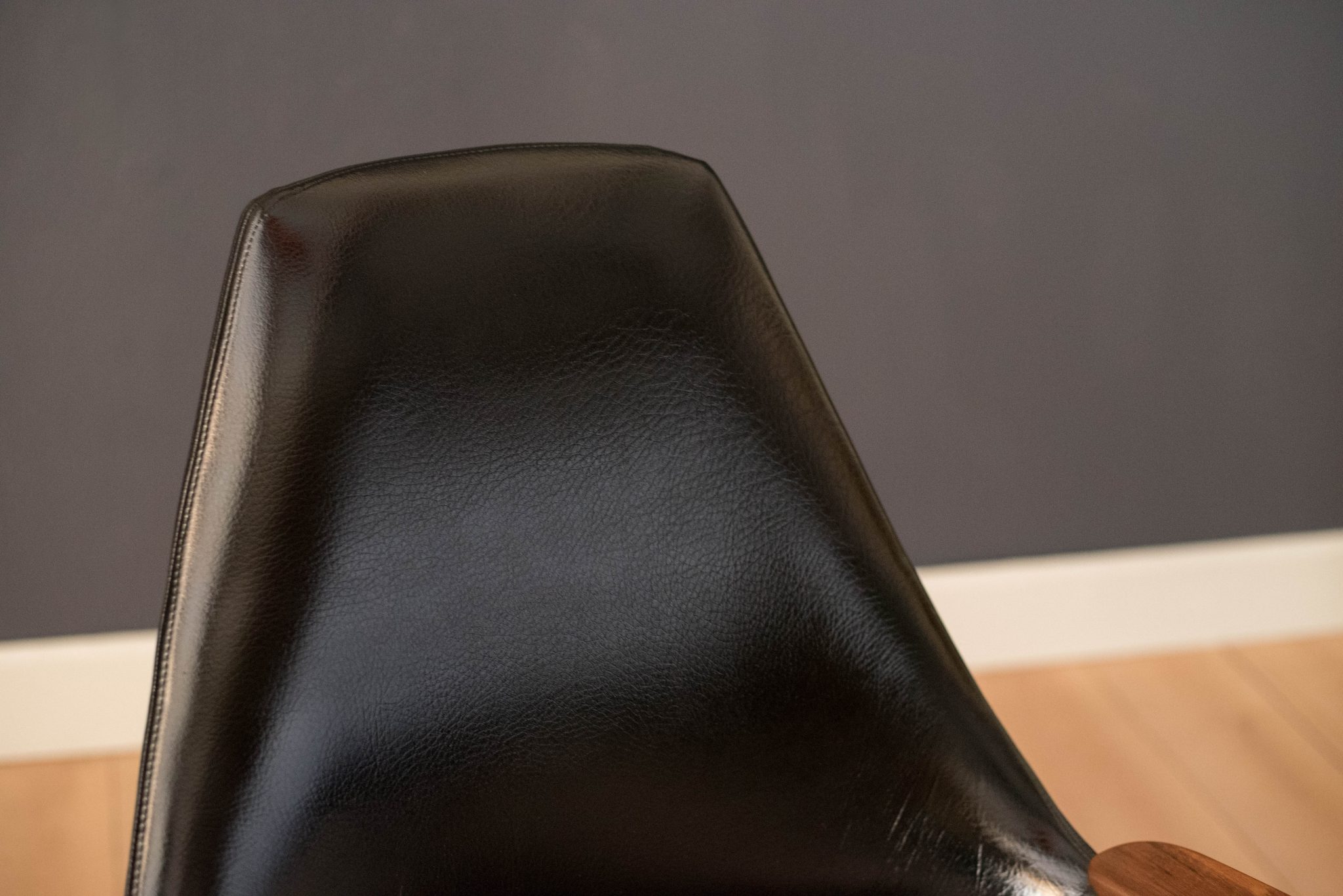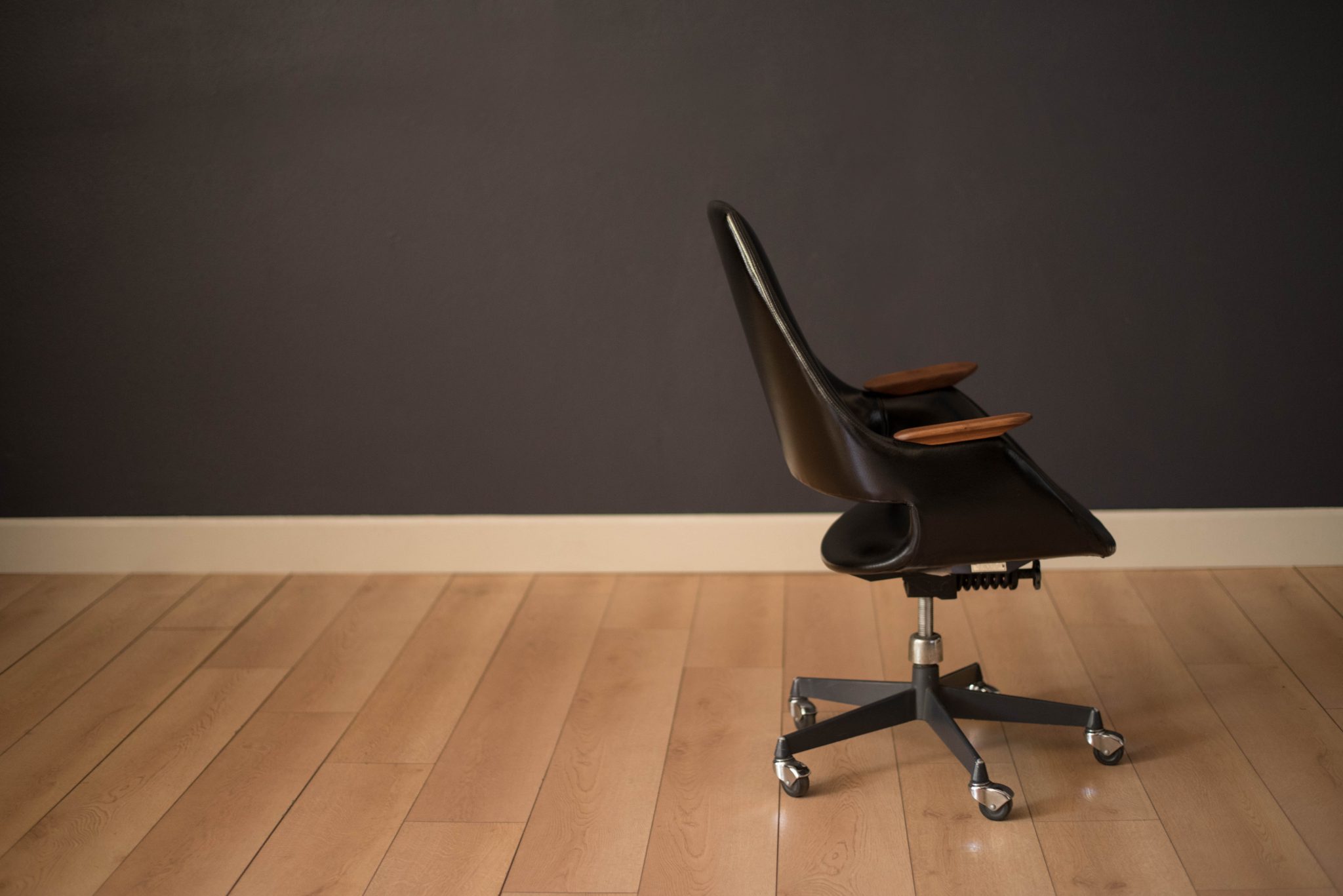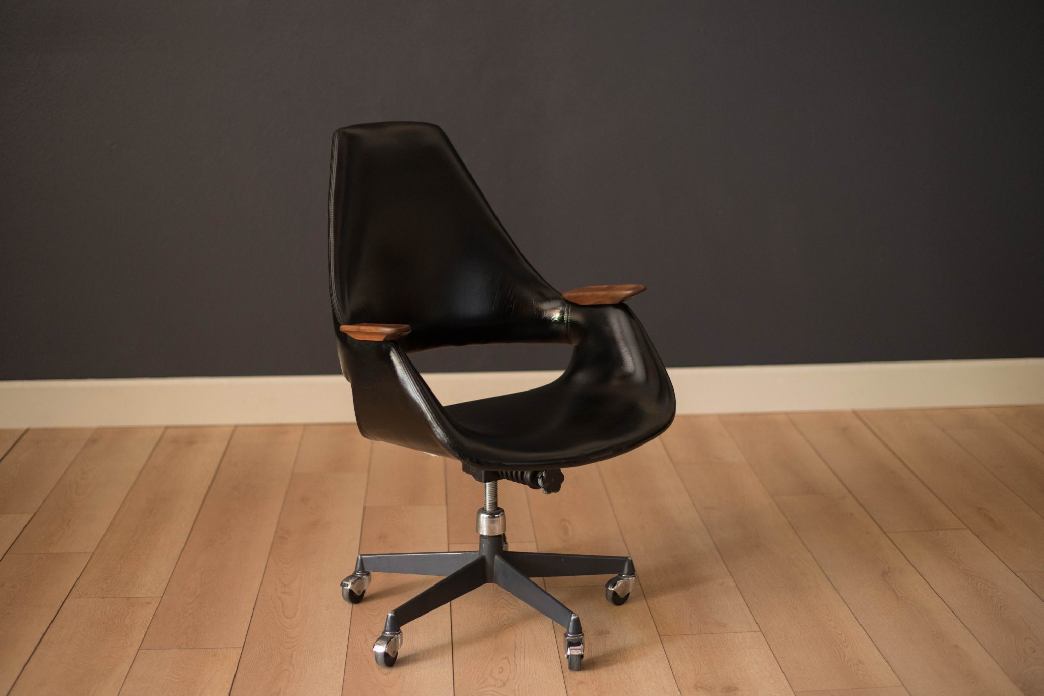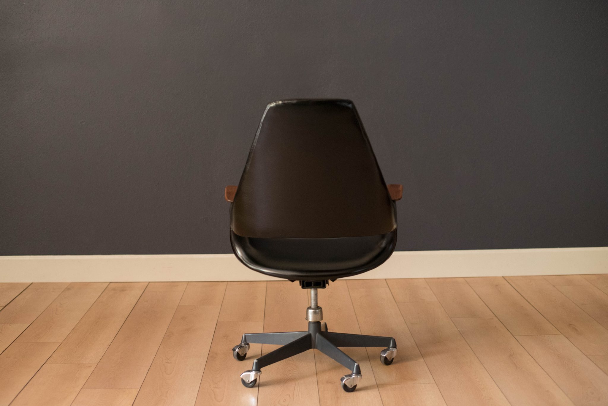 Mid century desk chair designed by Arthur Umanoff for Madison Furniture Company. This comfortable chair is finished in black vinyl with sculpted walnut armrests. Rolls on a heavy duty swivel base and five casters. Seat height is adjustable.