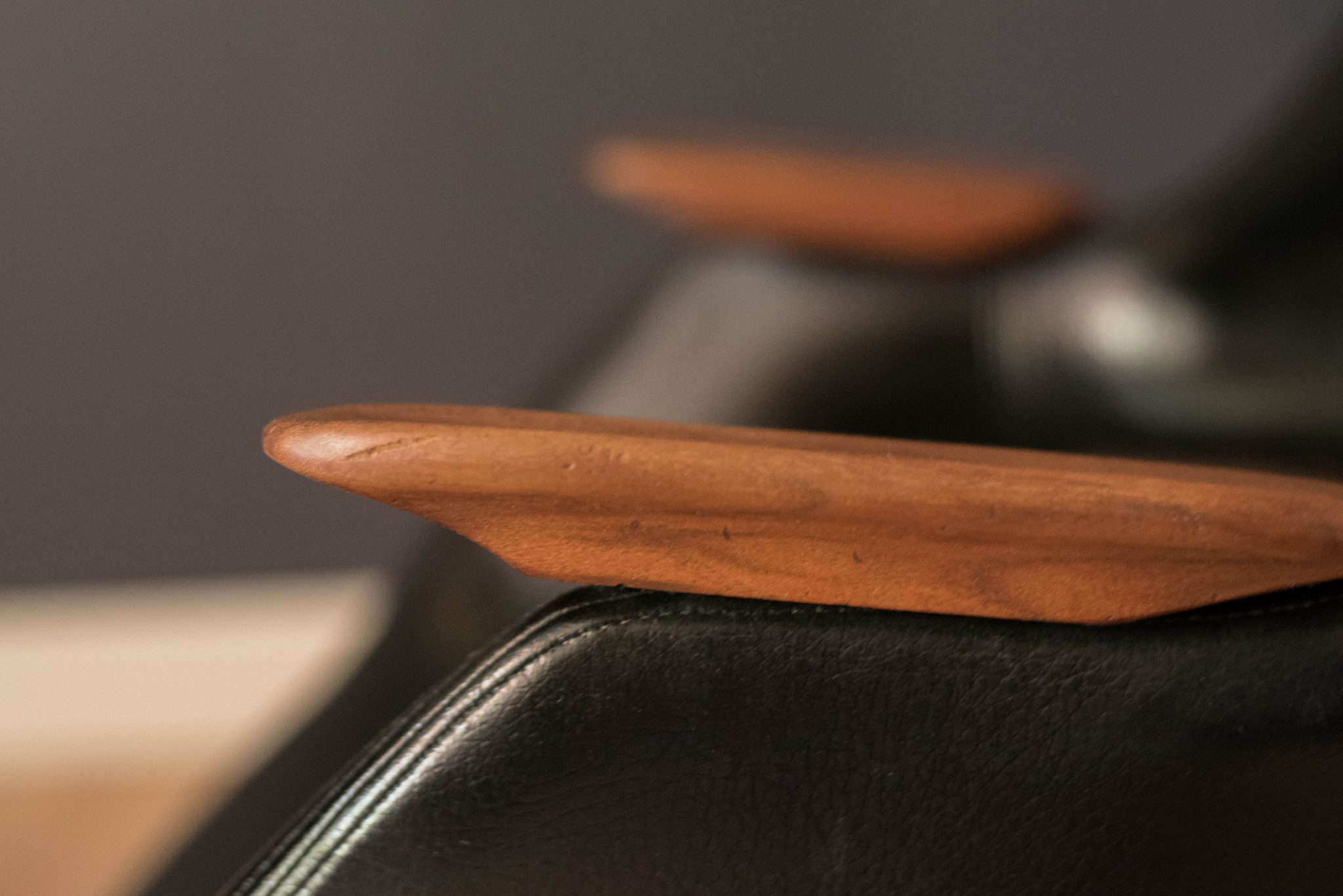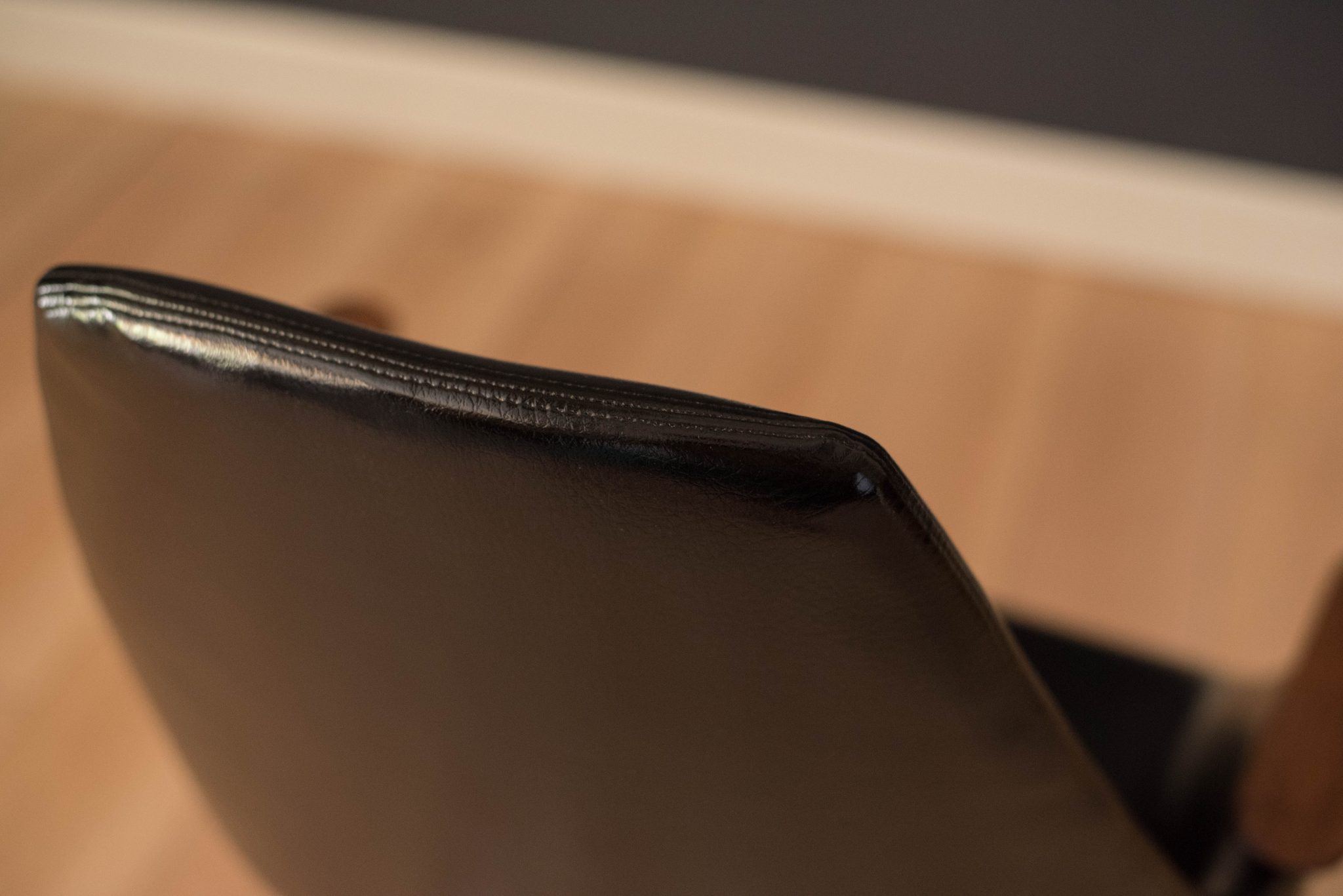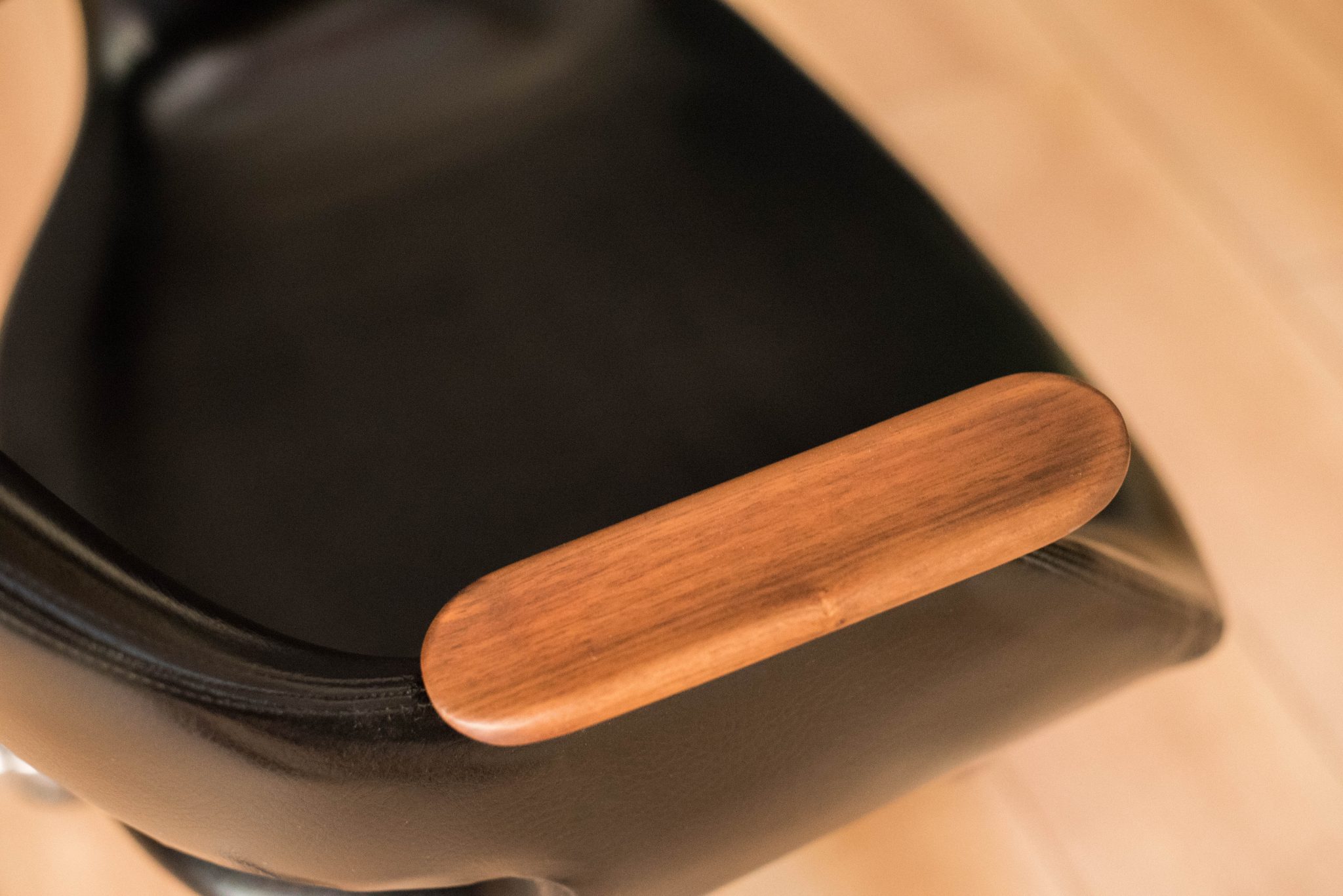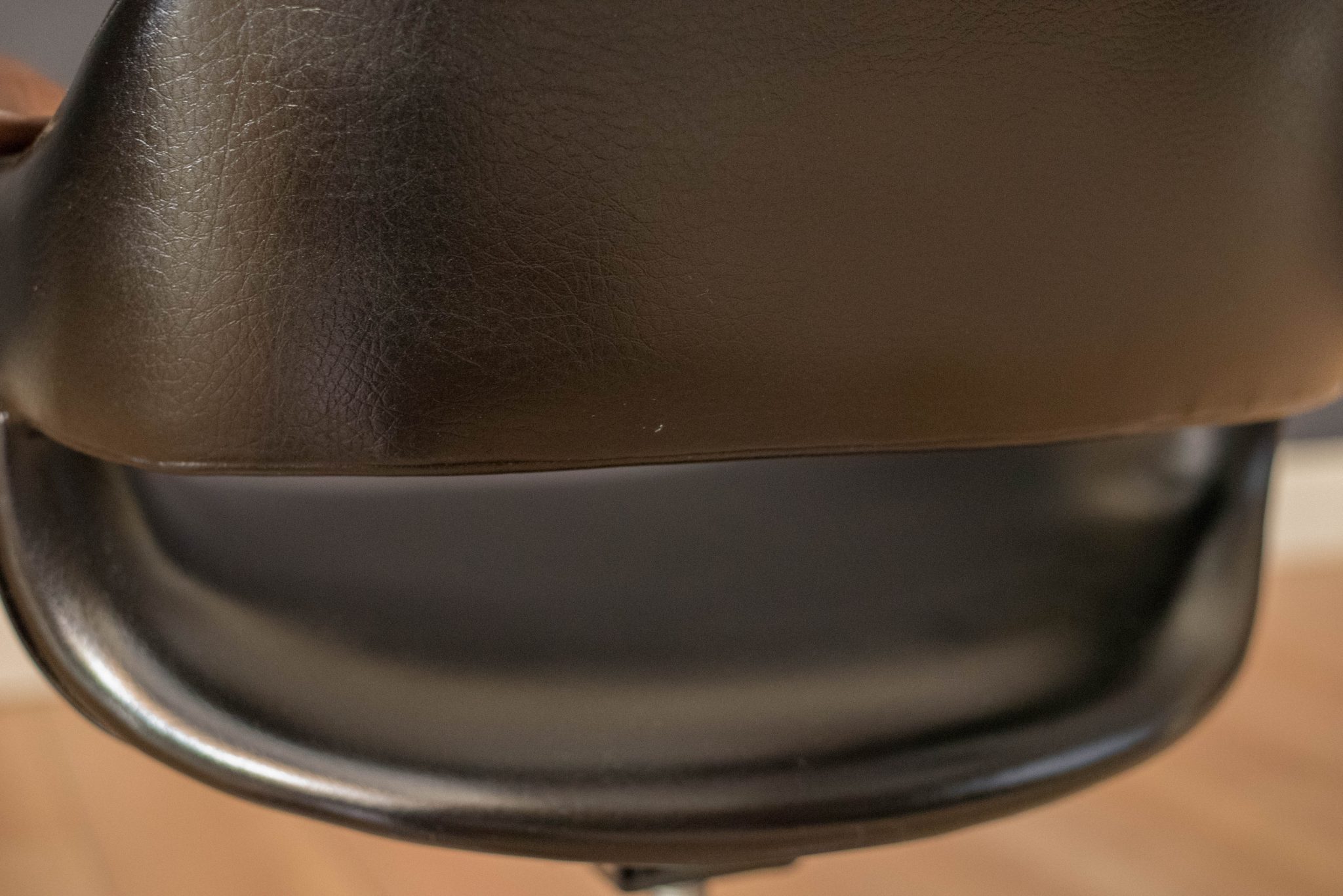 Mid century desk chair designed by Arthur Umanoff for Madison Furniture Company. This comfortable chair is finished in black vinyl with sculpted walnut armrests. Rolls on a heavy duty swivel base and five casters. Seat height is adjustable.
