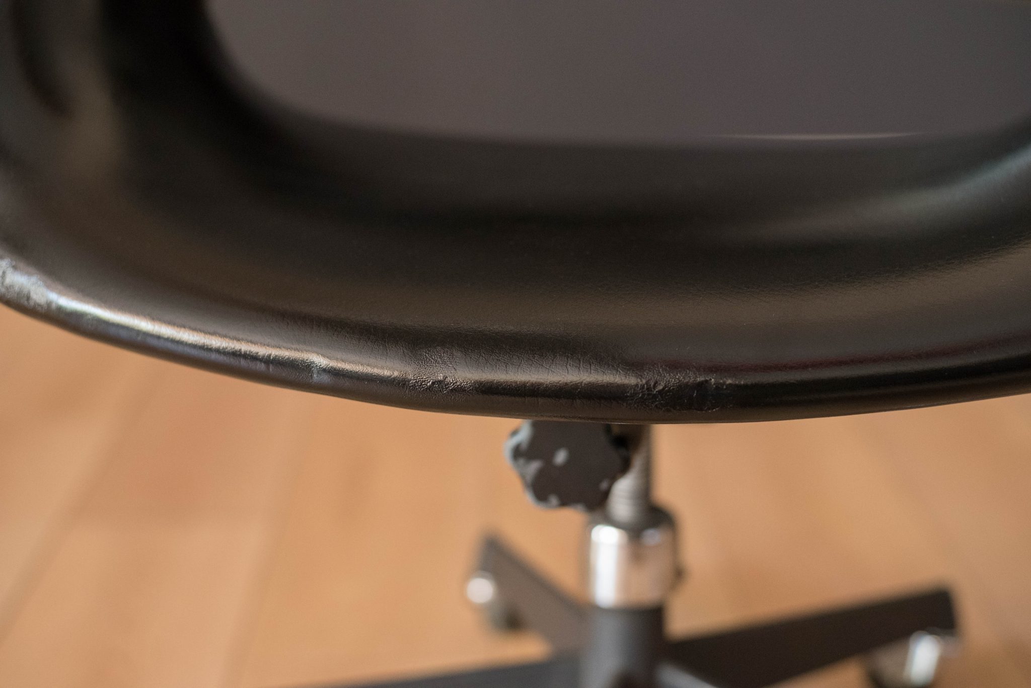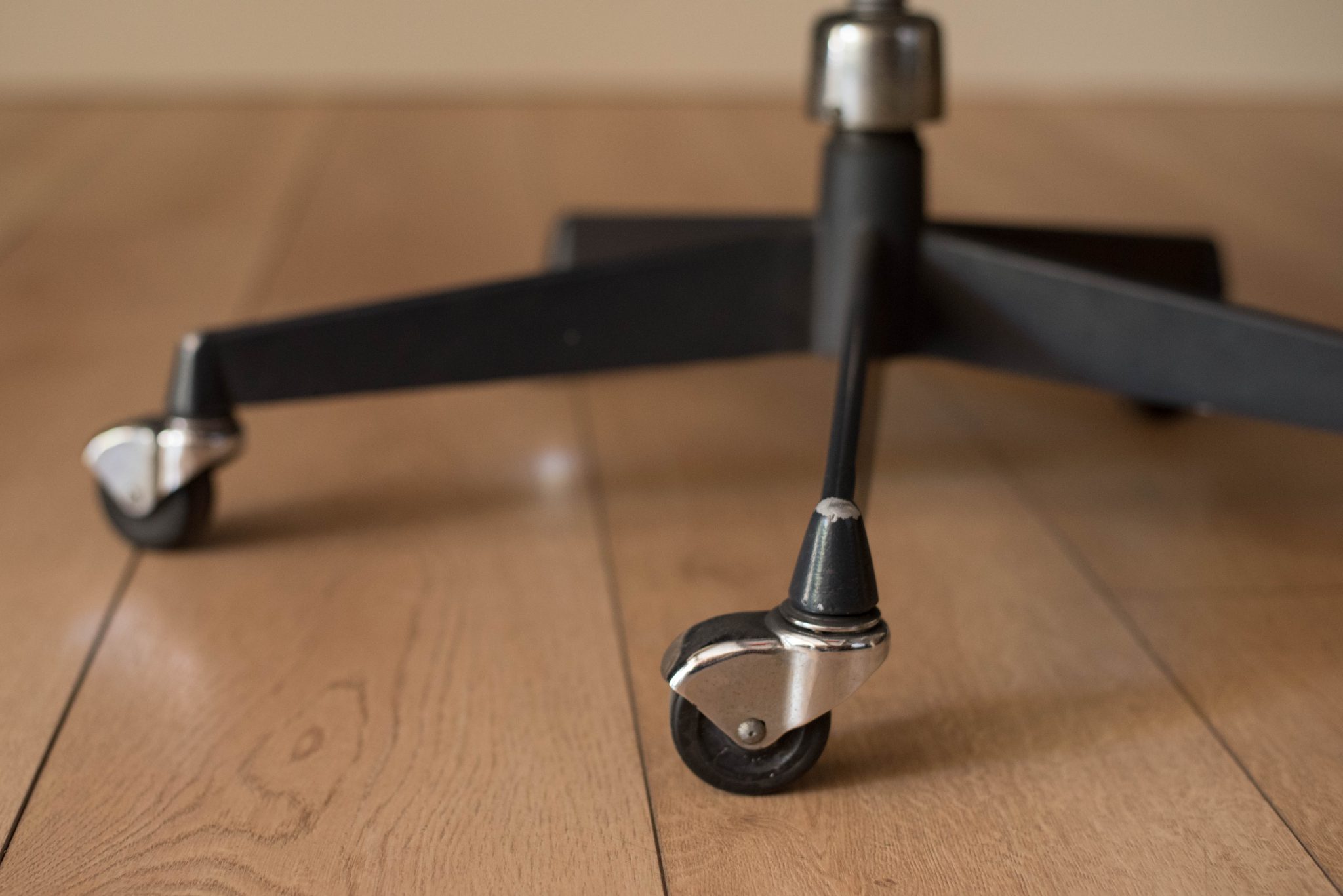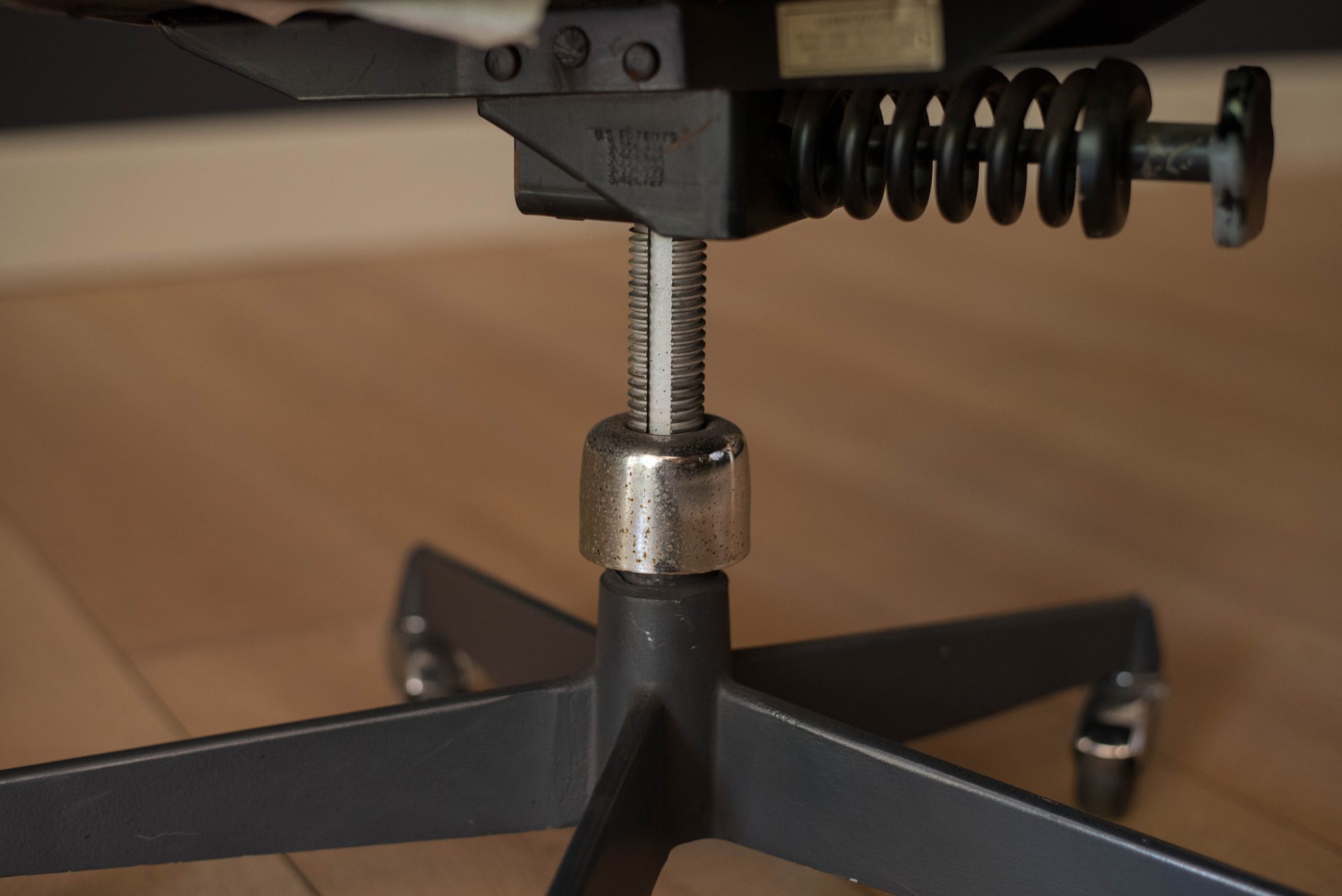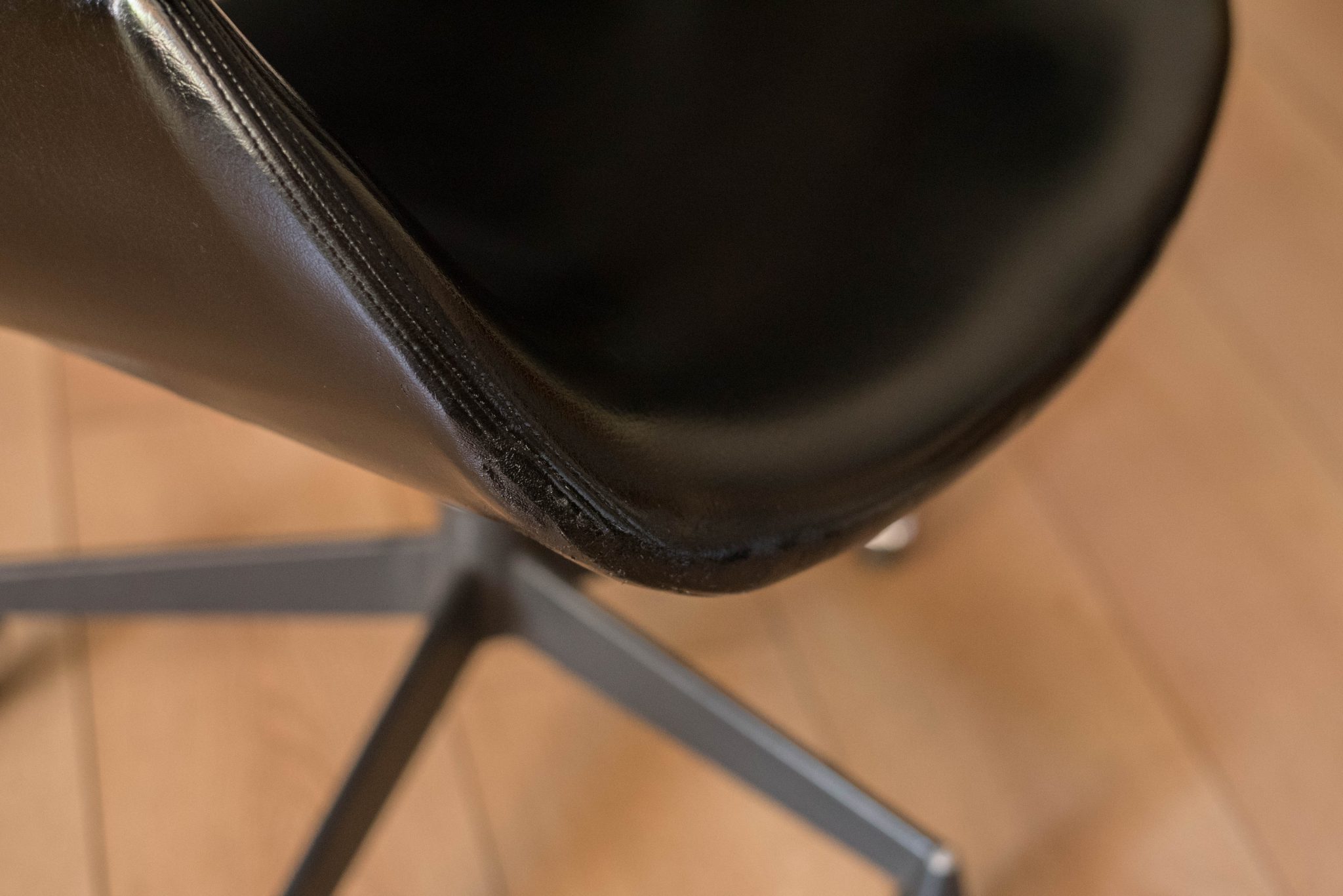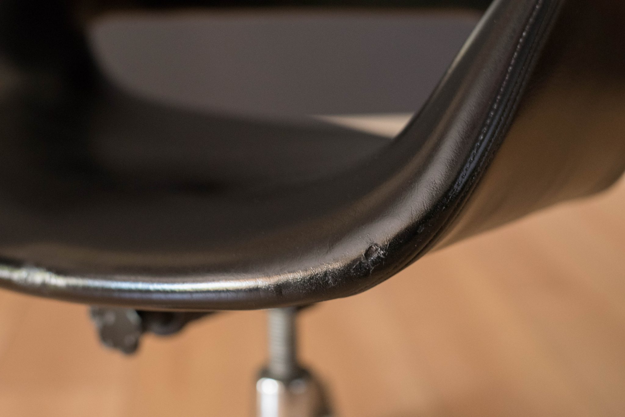 Mid century desk chair designed by Arthur Umanoff for Madison Furniture Company. This comfortable chair is finished in black vinyl with sculpted walnut armrests. Rolls on a heavy duty swivel base and five casters. Seat height is adjustable.