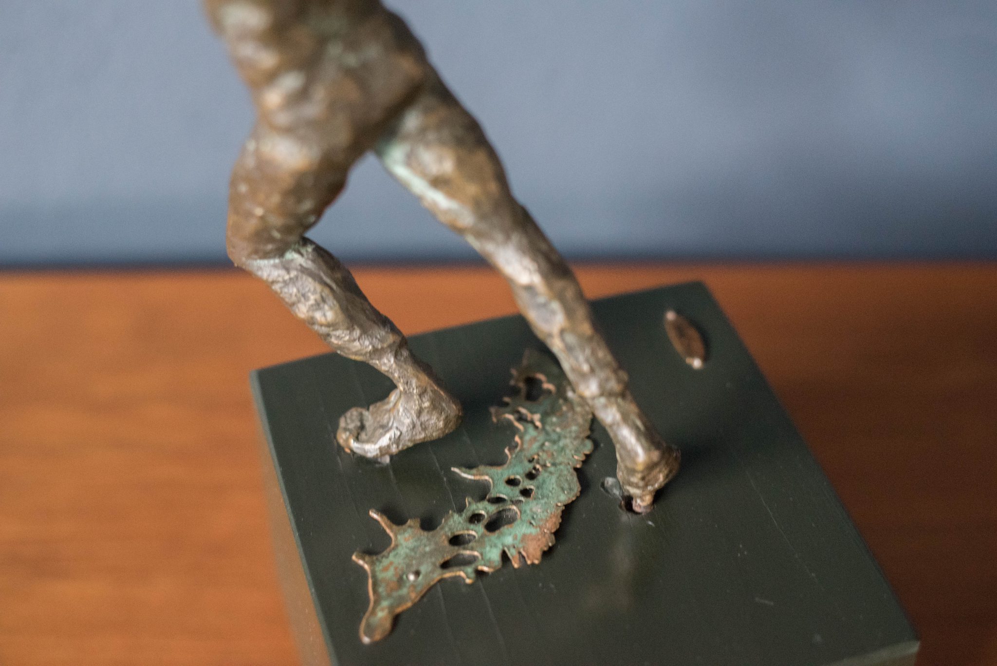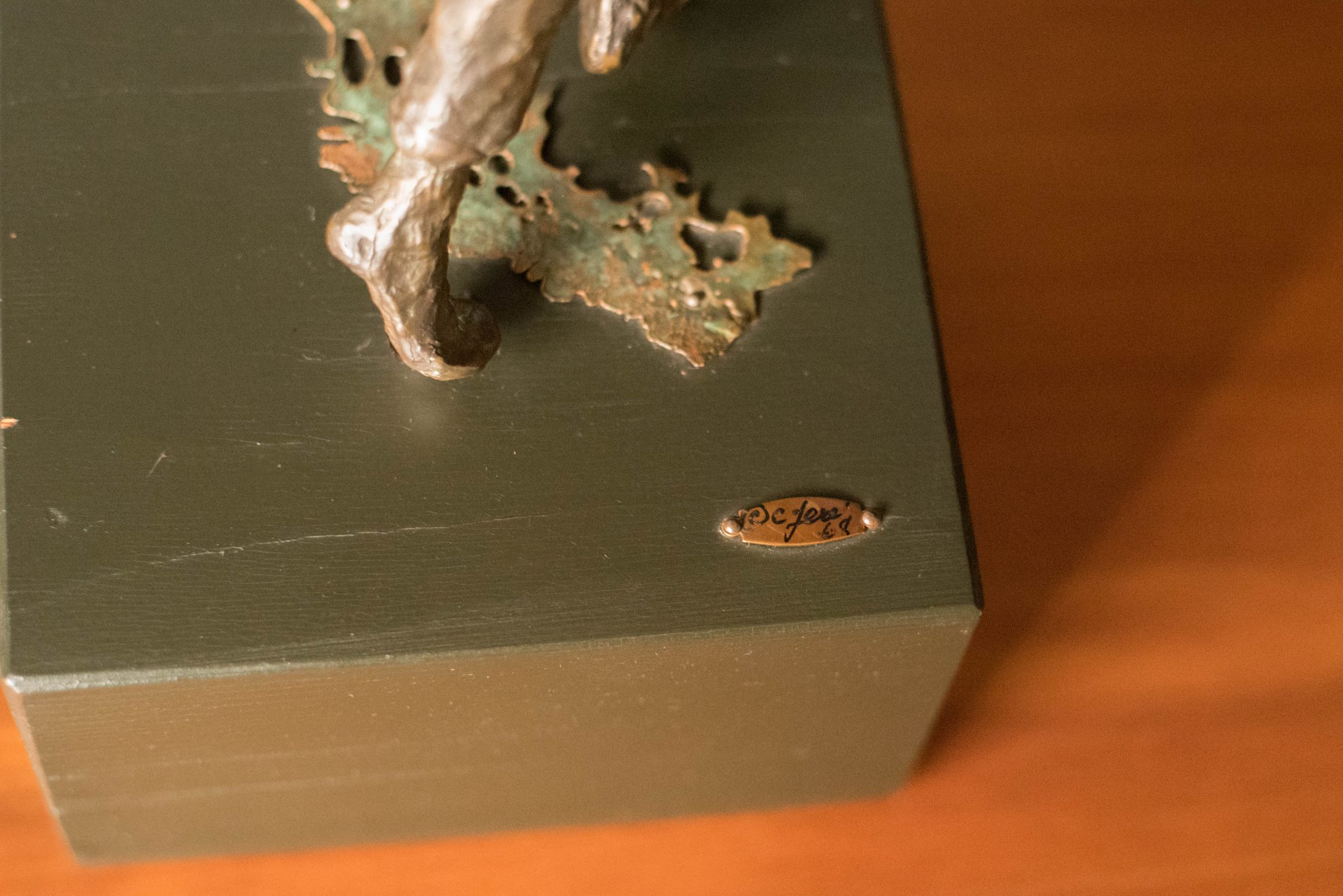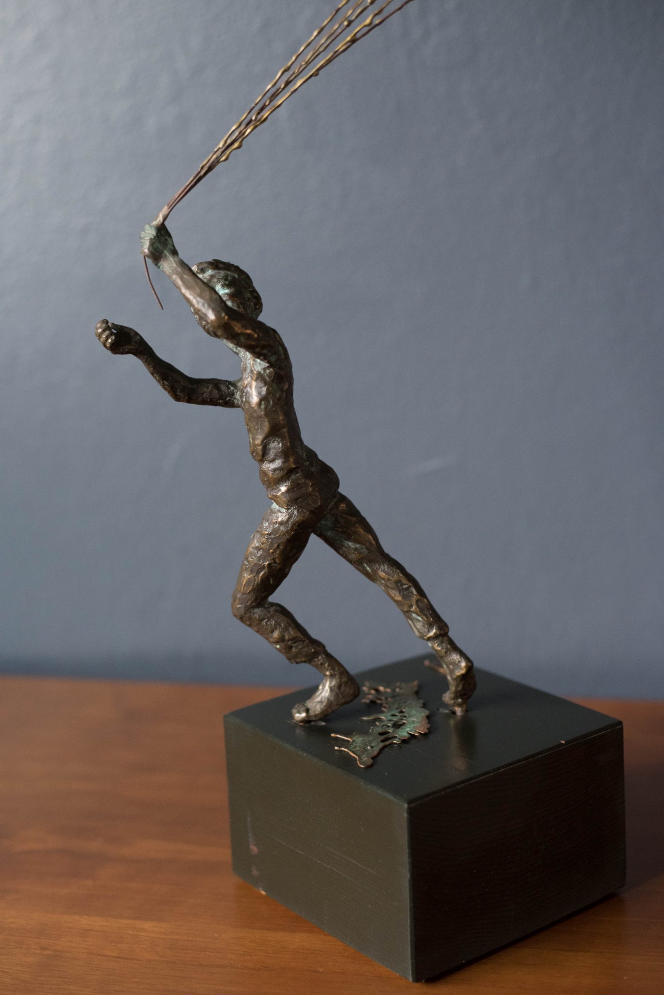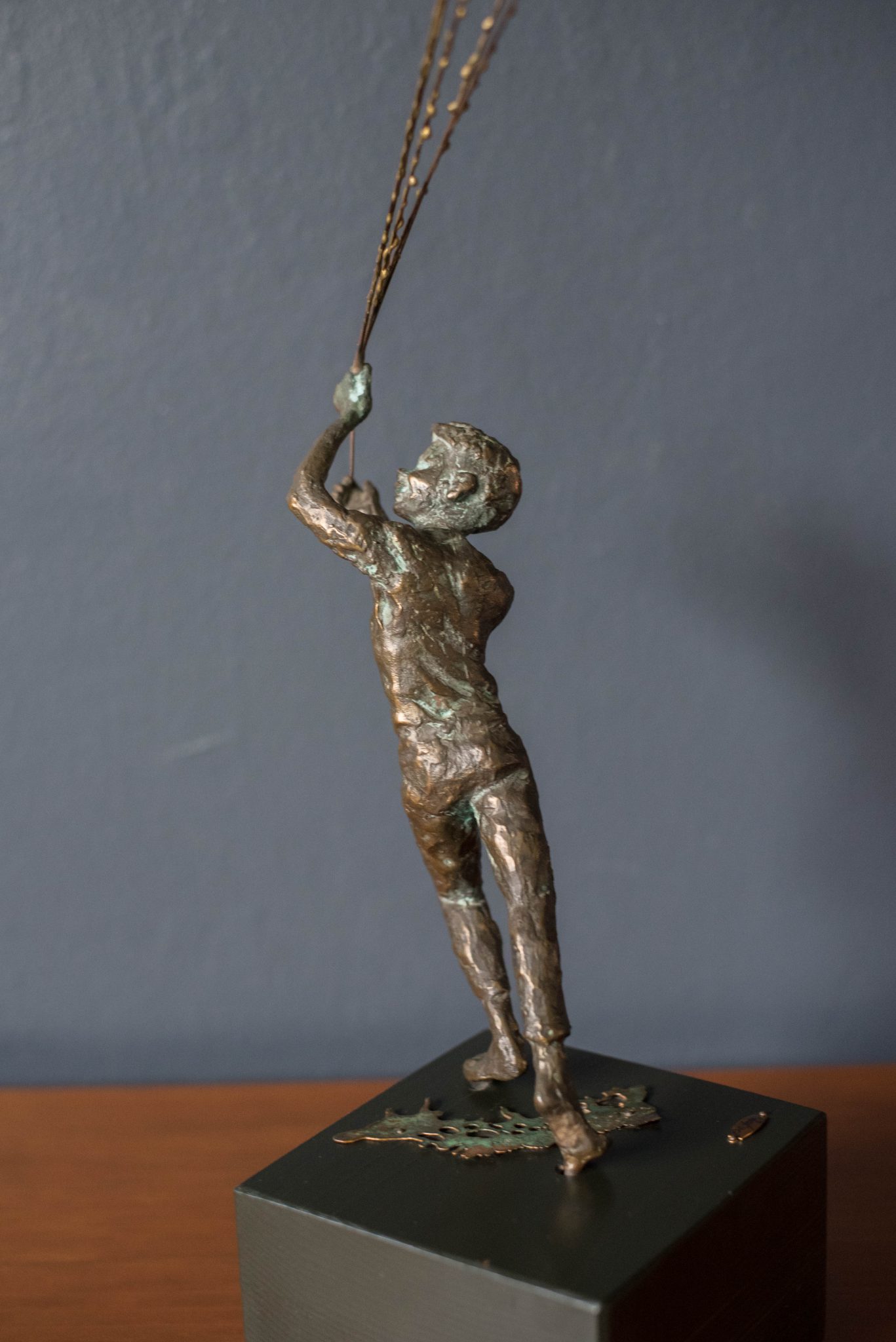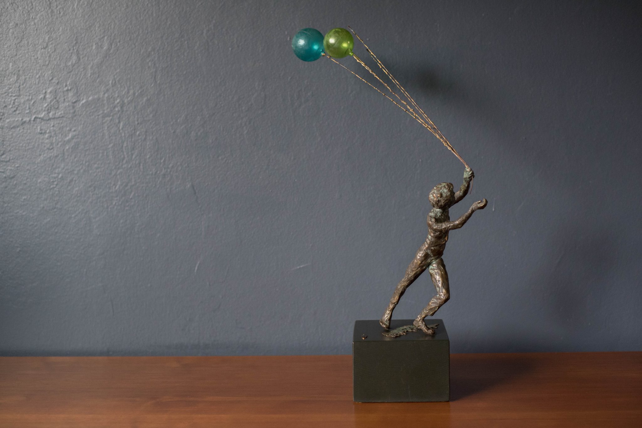 Vintage “Boy and Balloon” sculpture signed by Curtis Jere for Artisan House, circa 1968. This figurative piece depicts a boy holding strings of colored balloons. The boy is made of patinated bronze on a wood base.